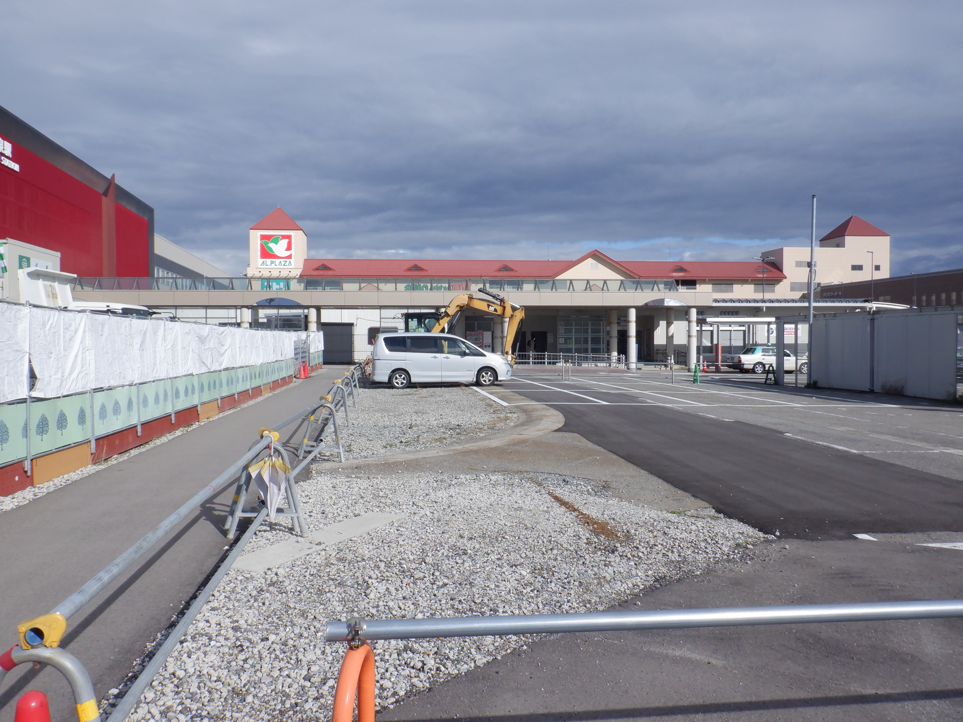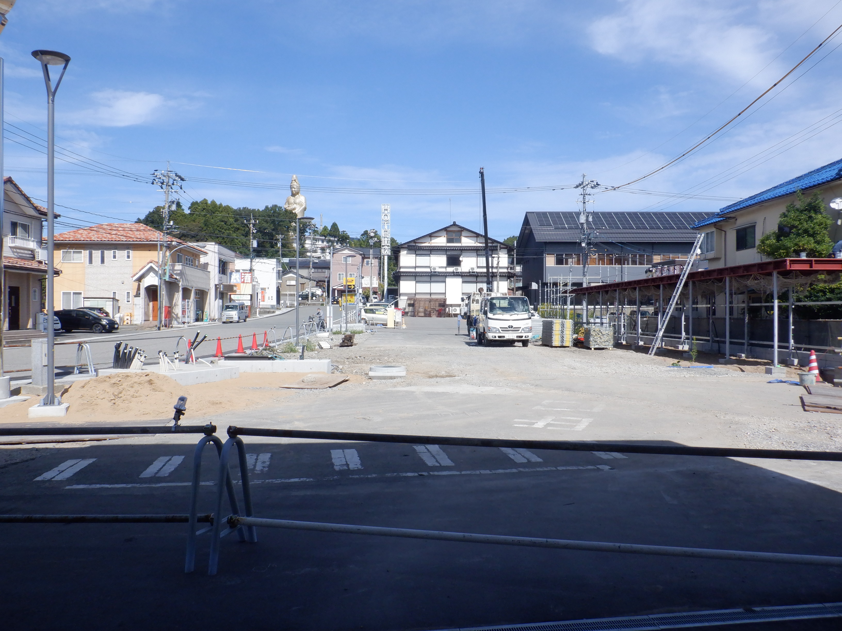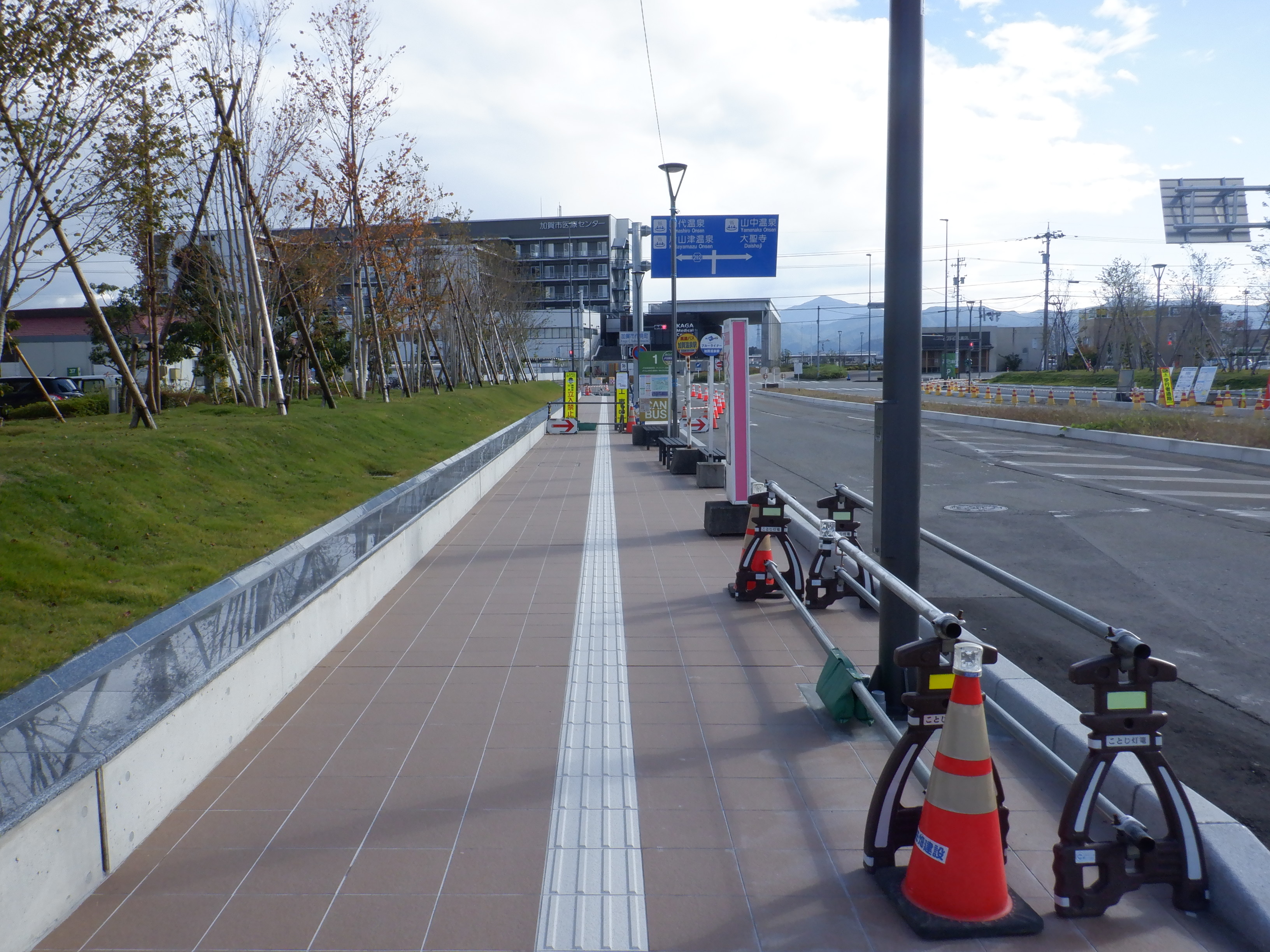 正面付近と、正面の道路のアルプラザ側の歩道が整備されたところ。