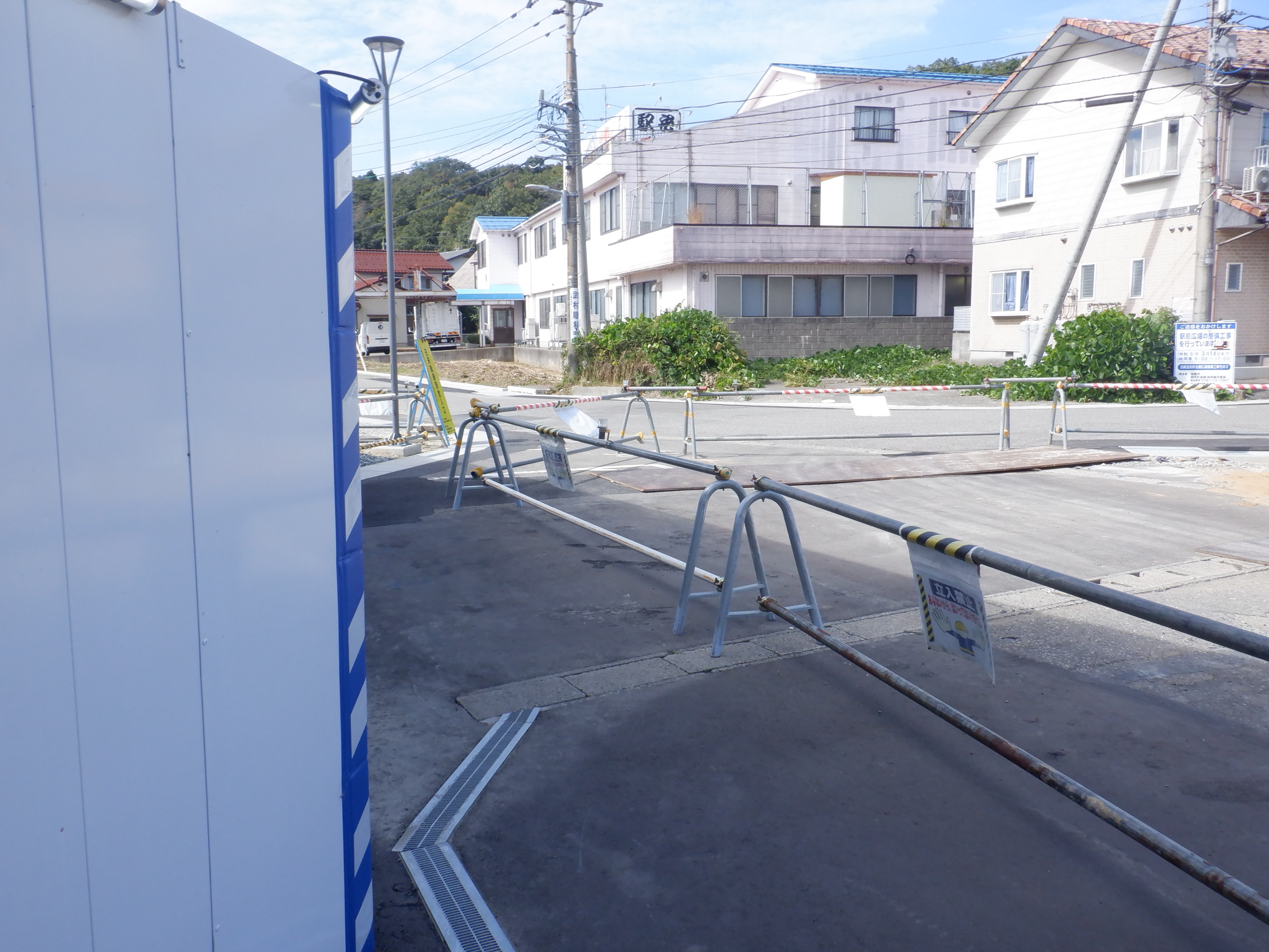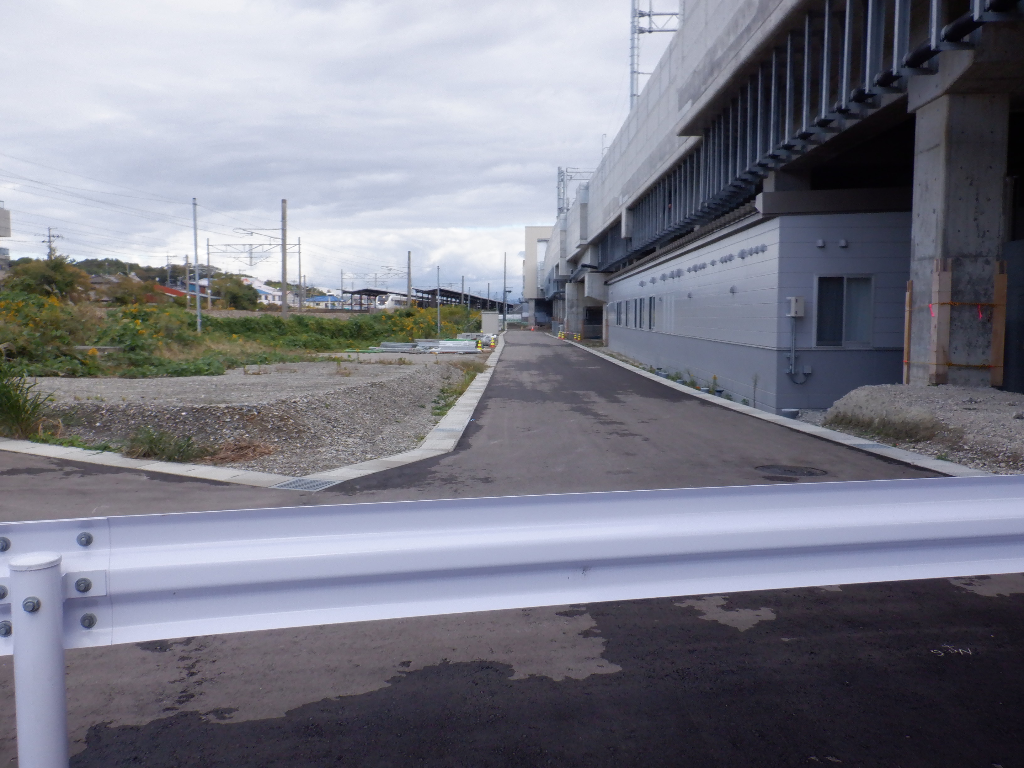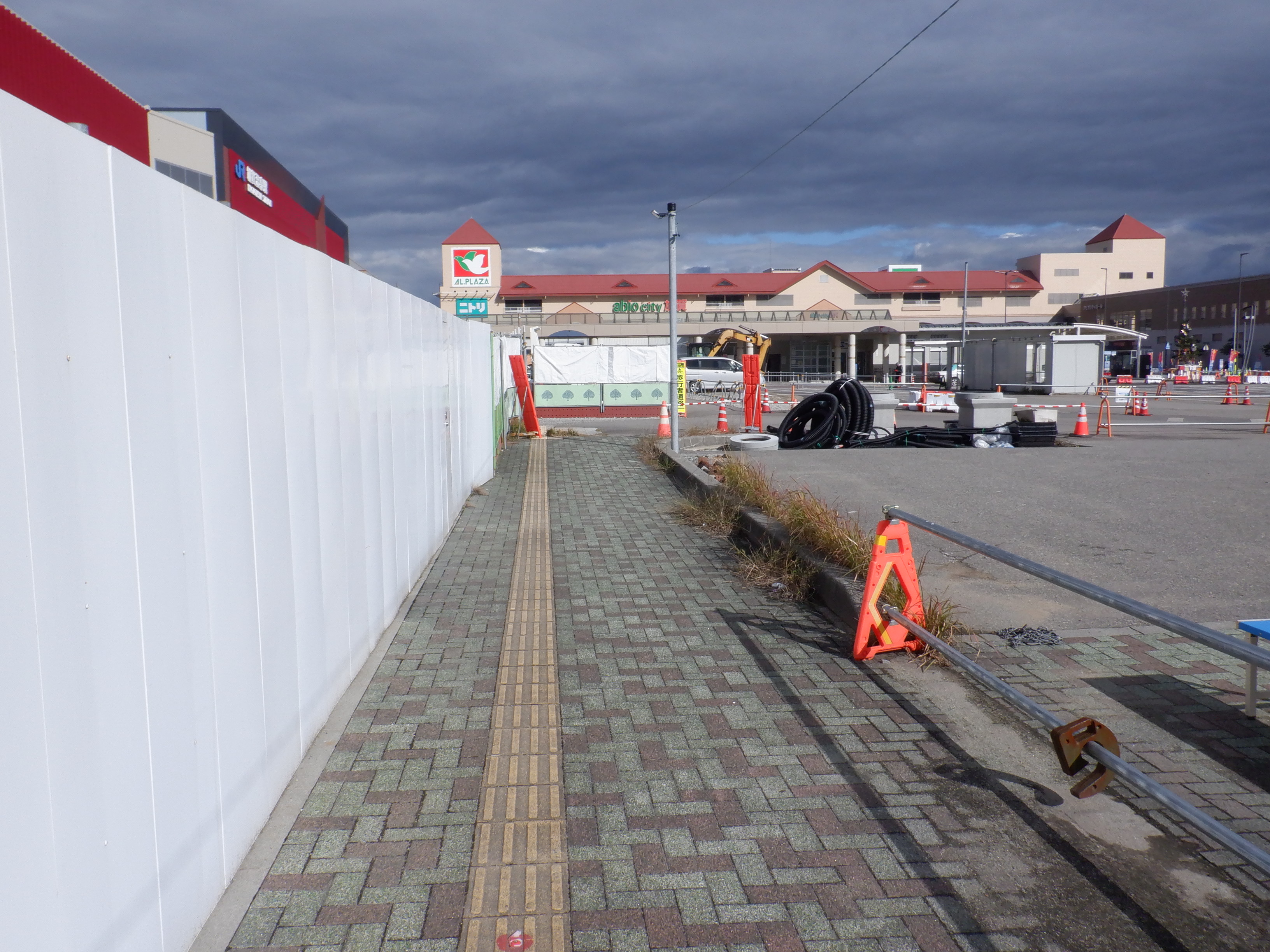 正面付近と、正面の道路のアルプラザ側の歩道が整備されたところ。