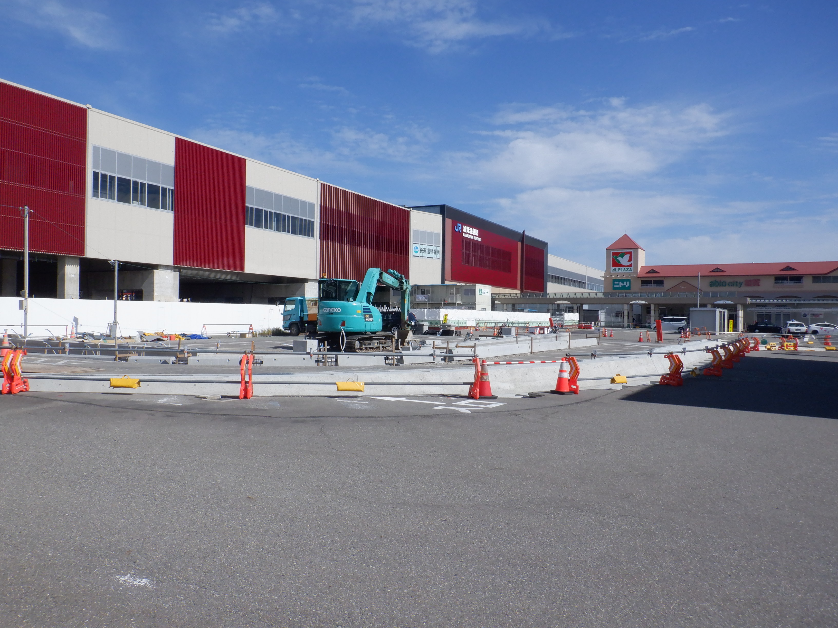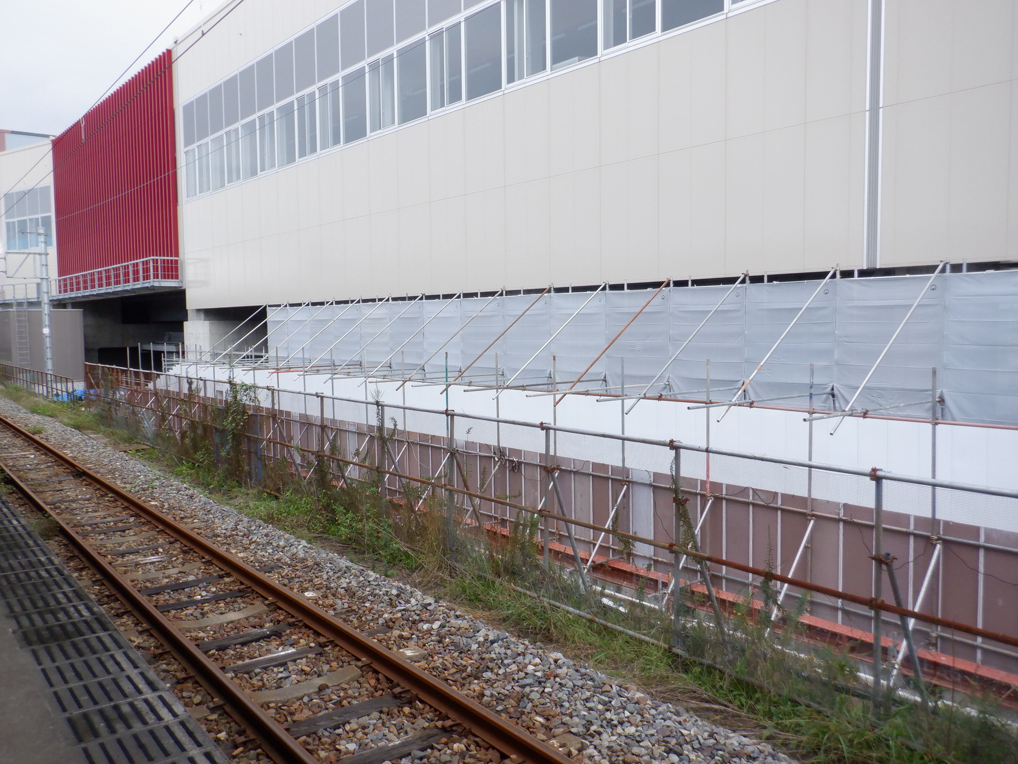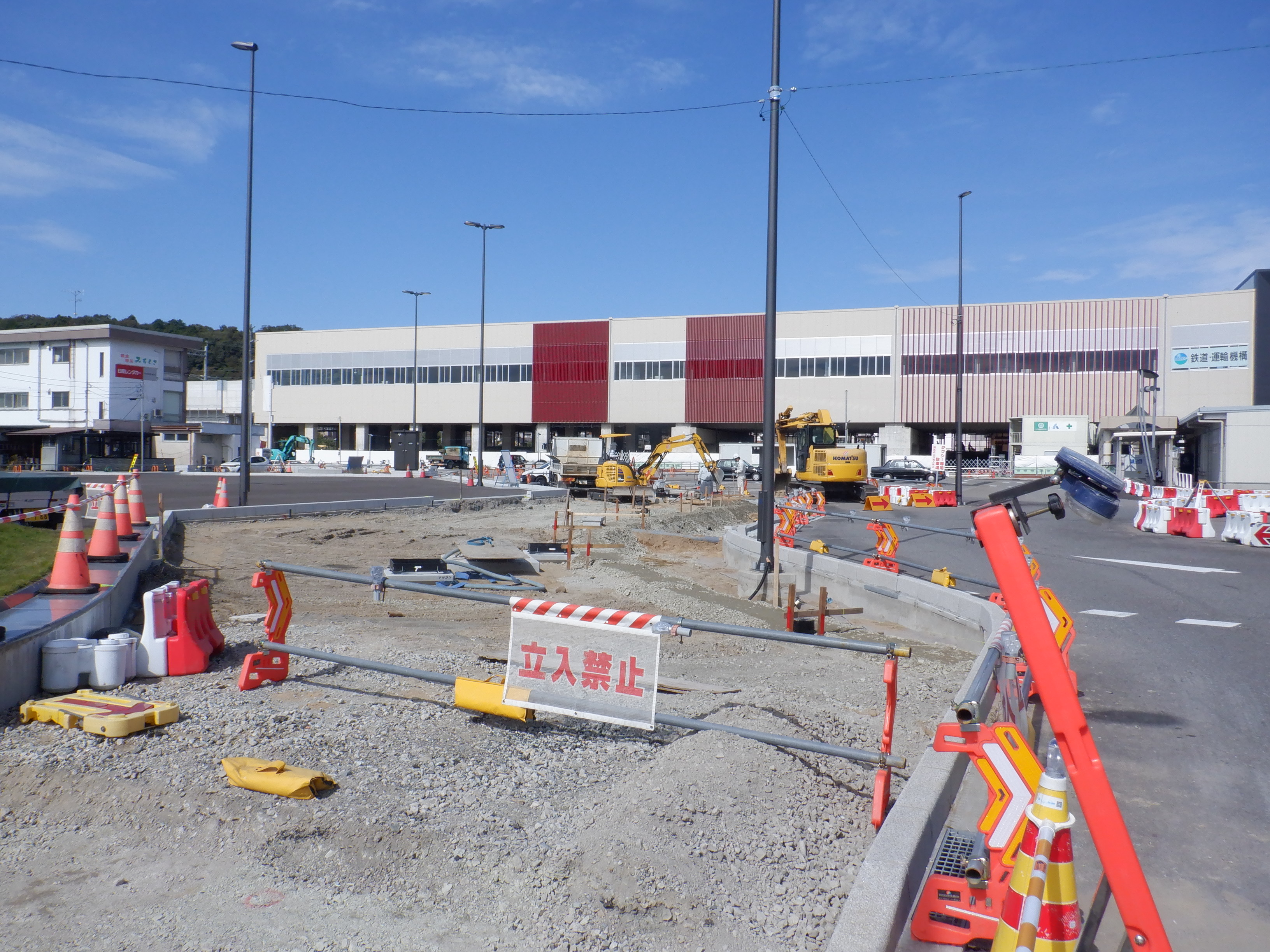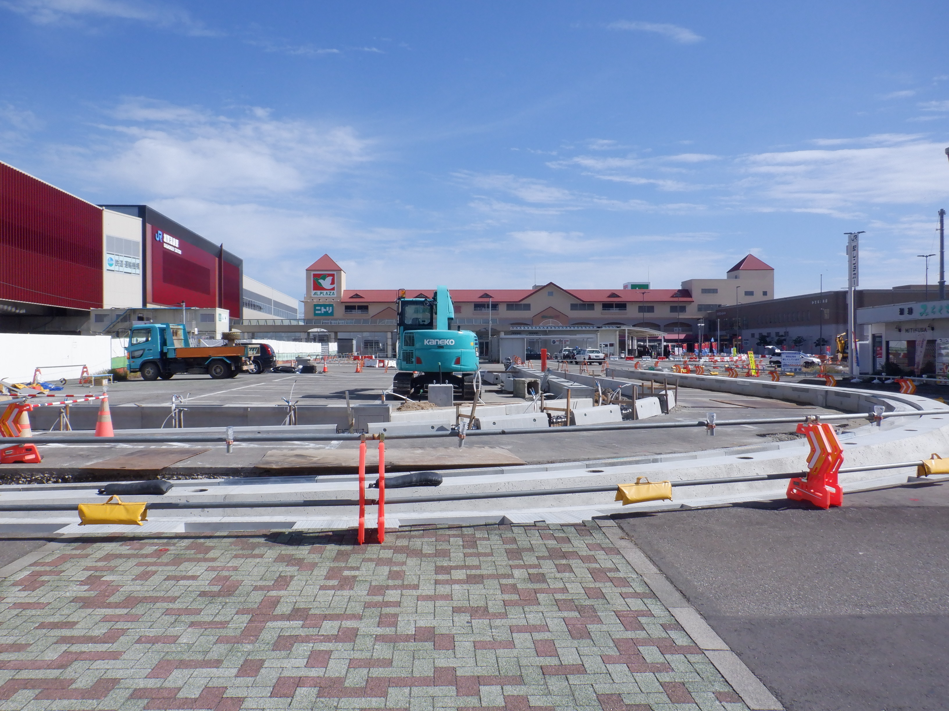 暫定北口を通るのがこの10月いっぱいということが案内されていました。それに向けて、コンビニ・待合室等建設中のそばが少し変化してきています。