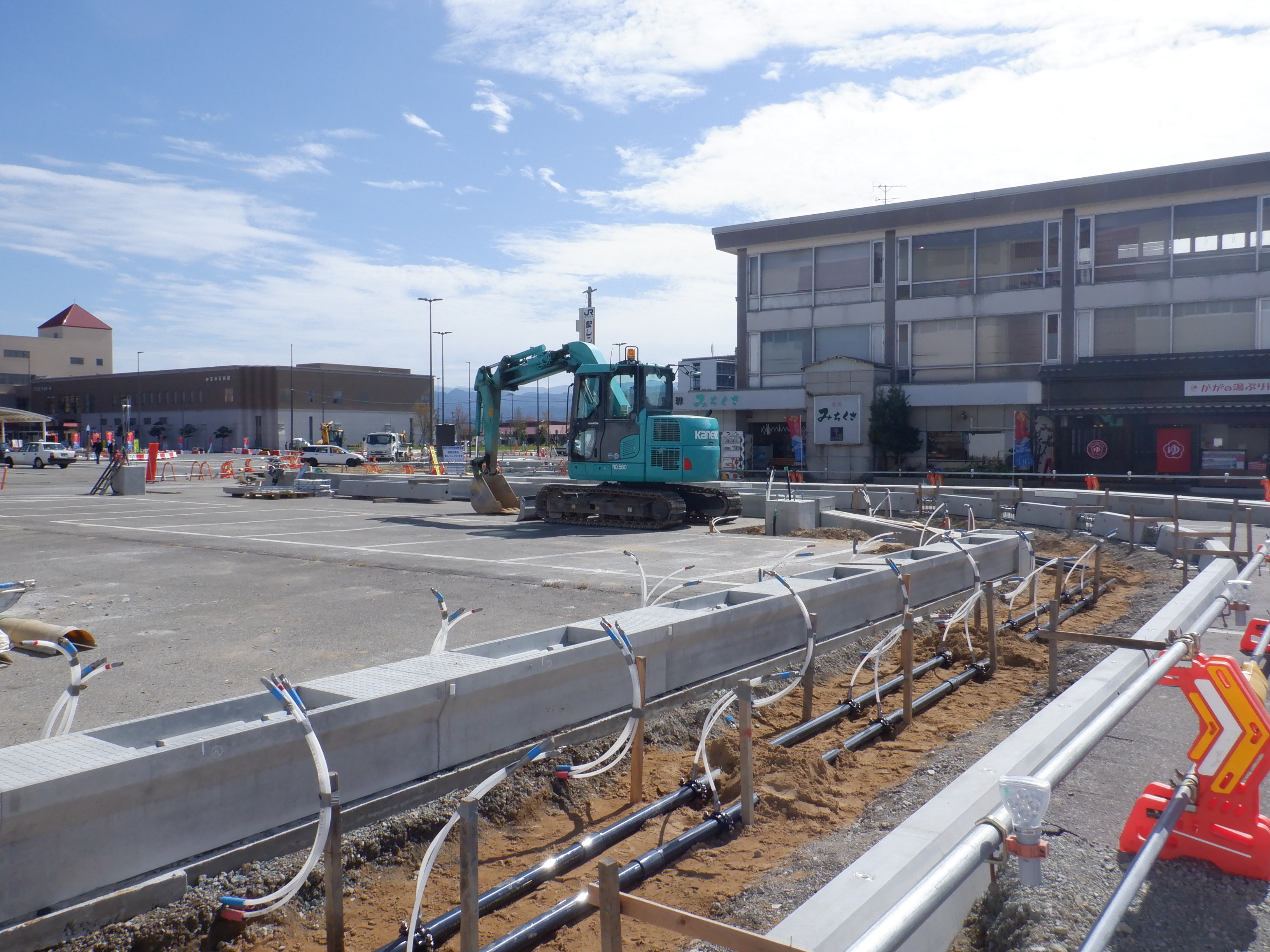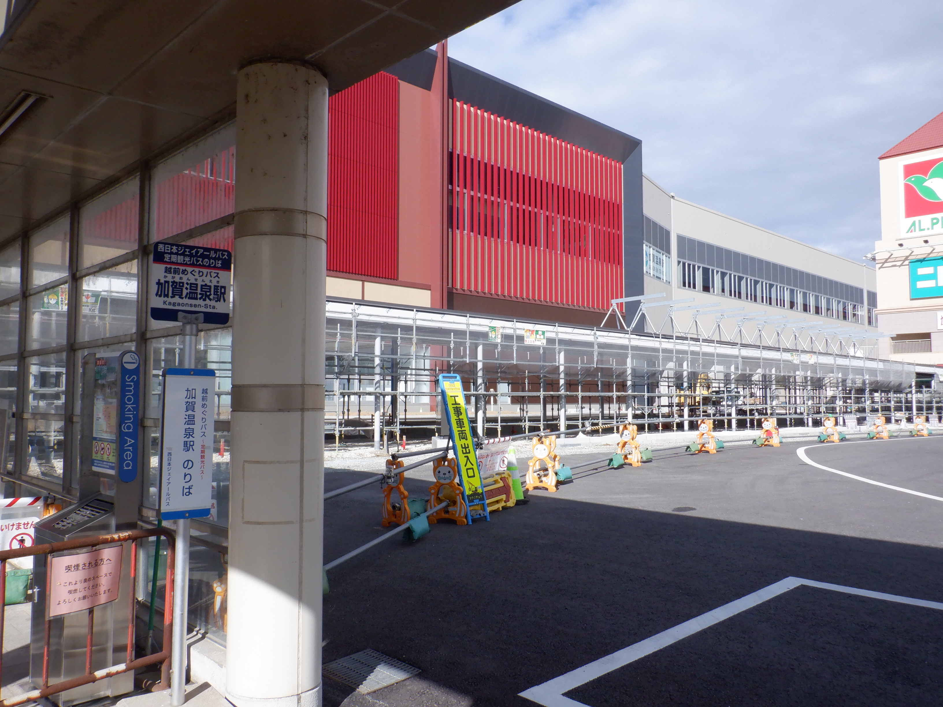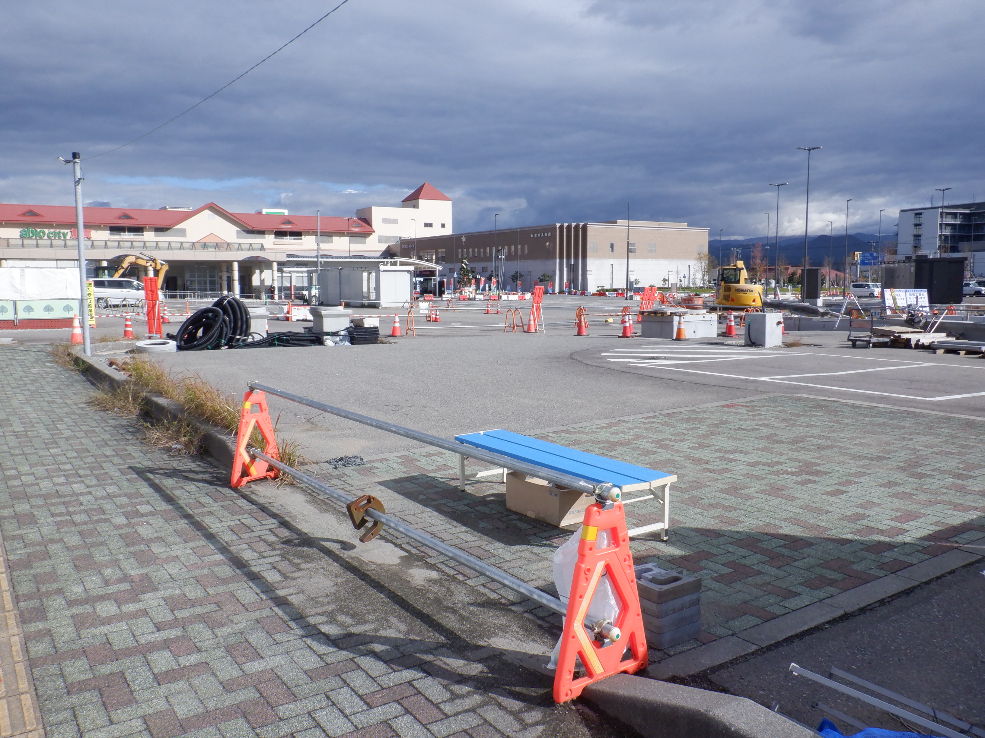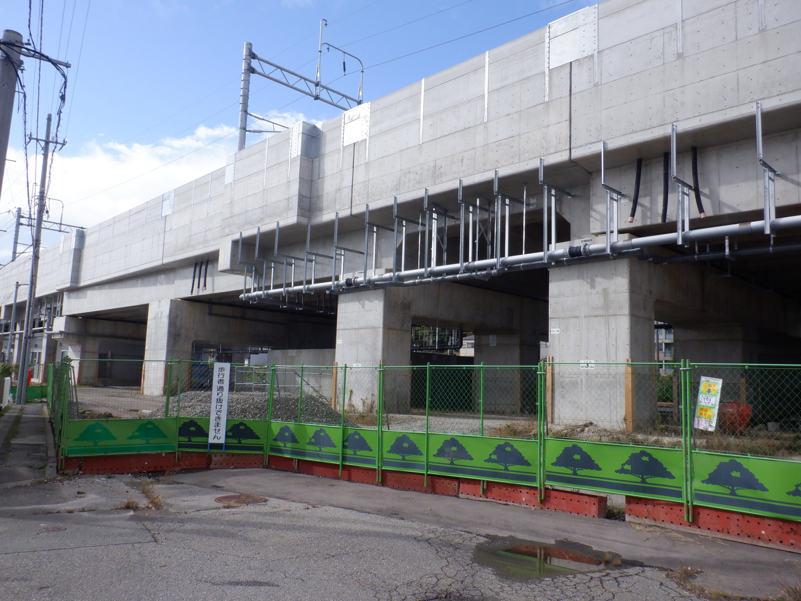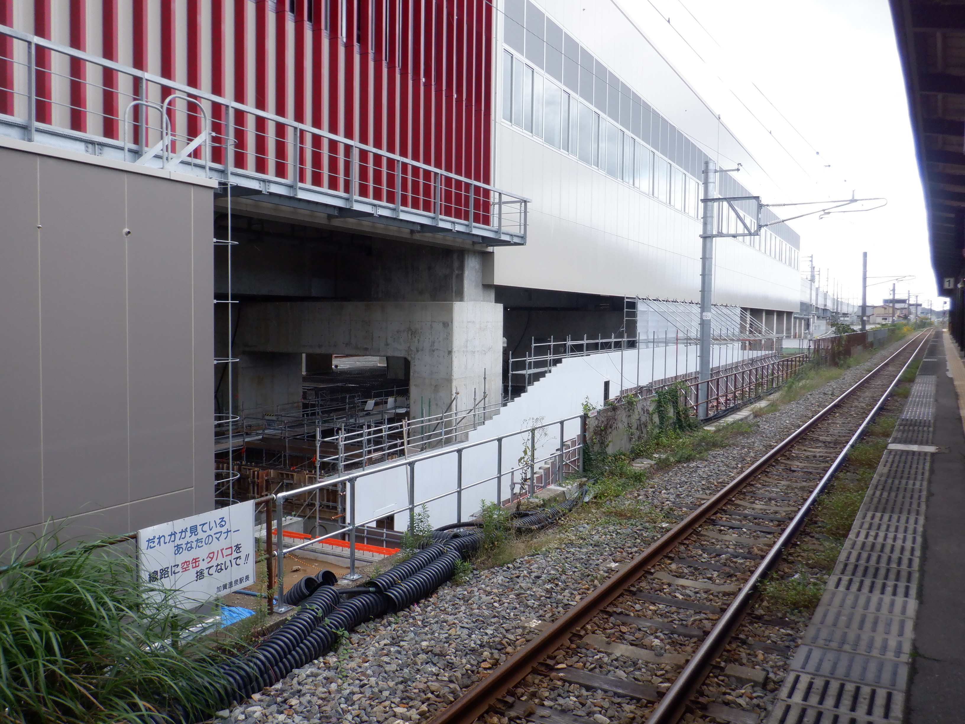 アルプラザ側のシェルター建設中のところと新幹線駅舎。