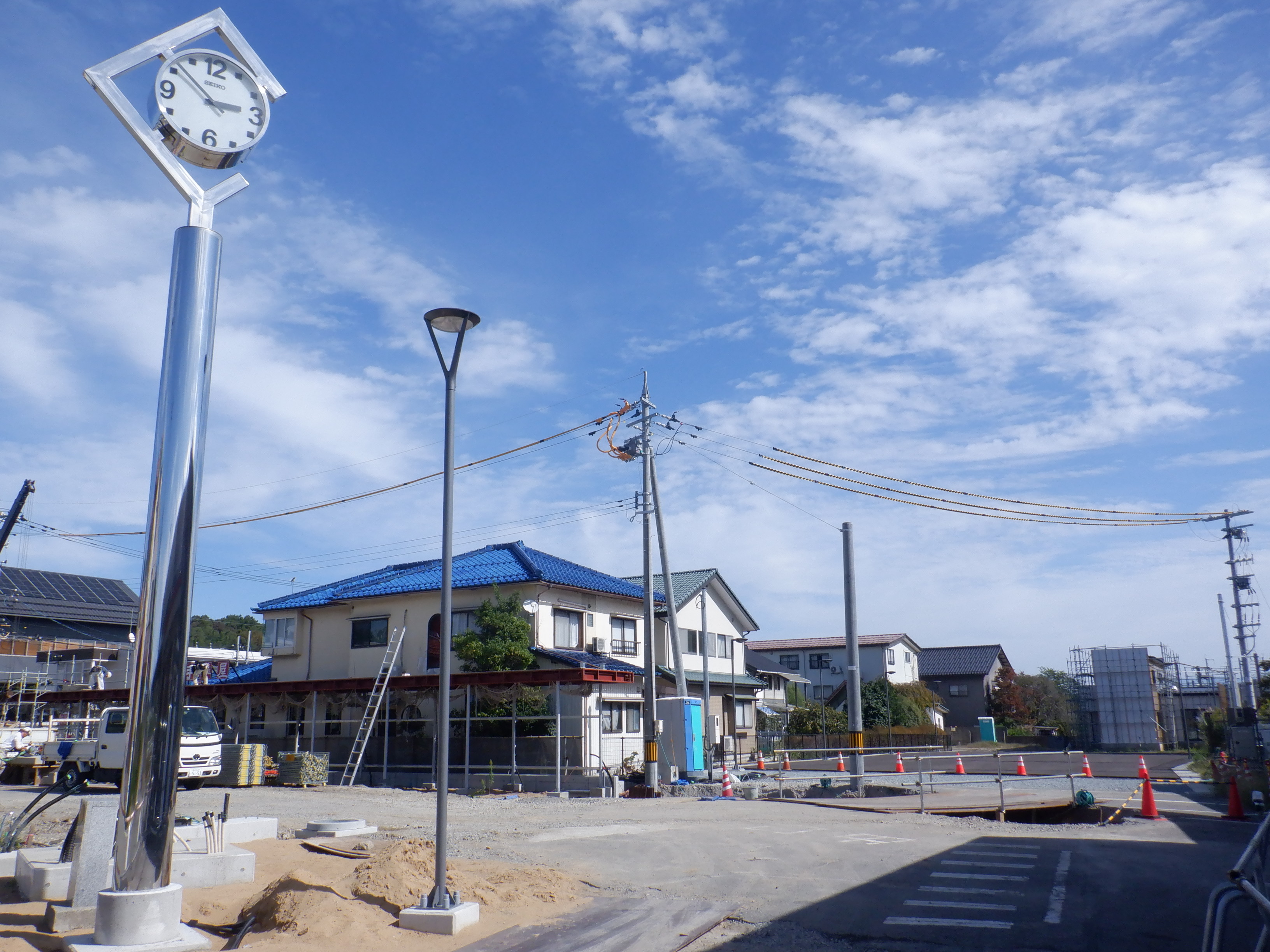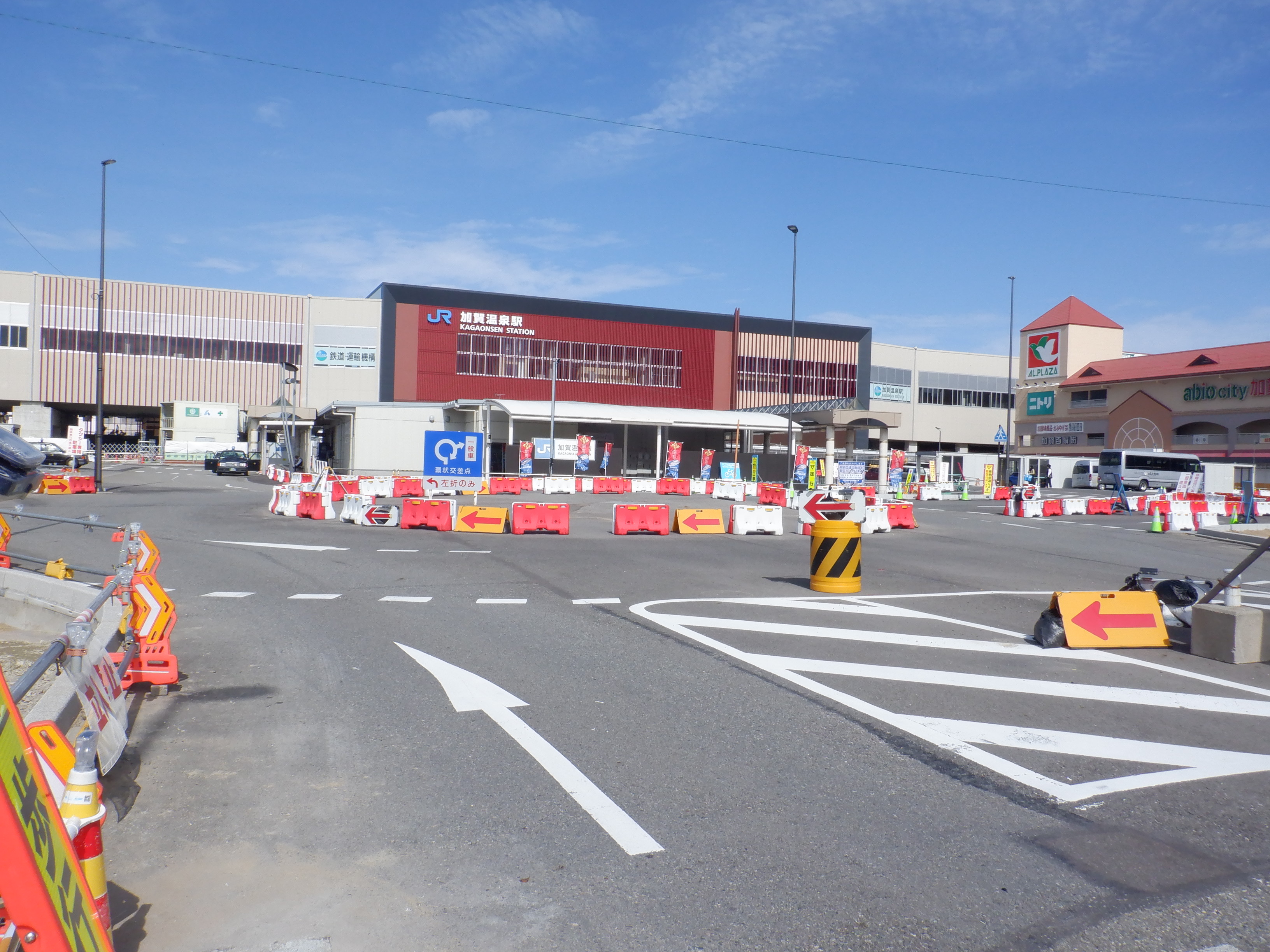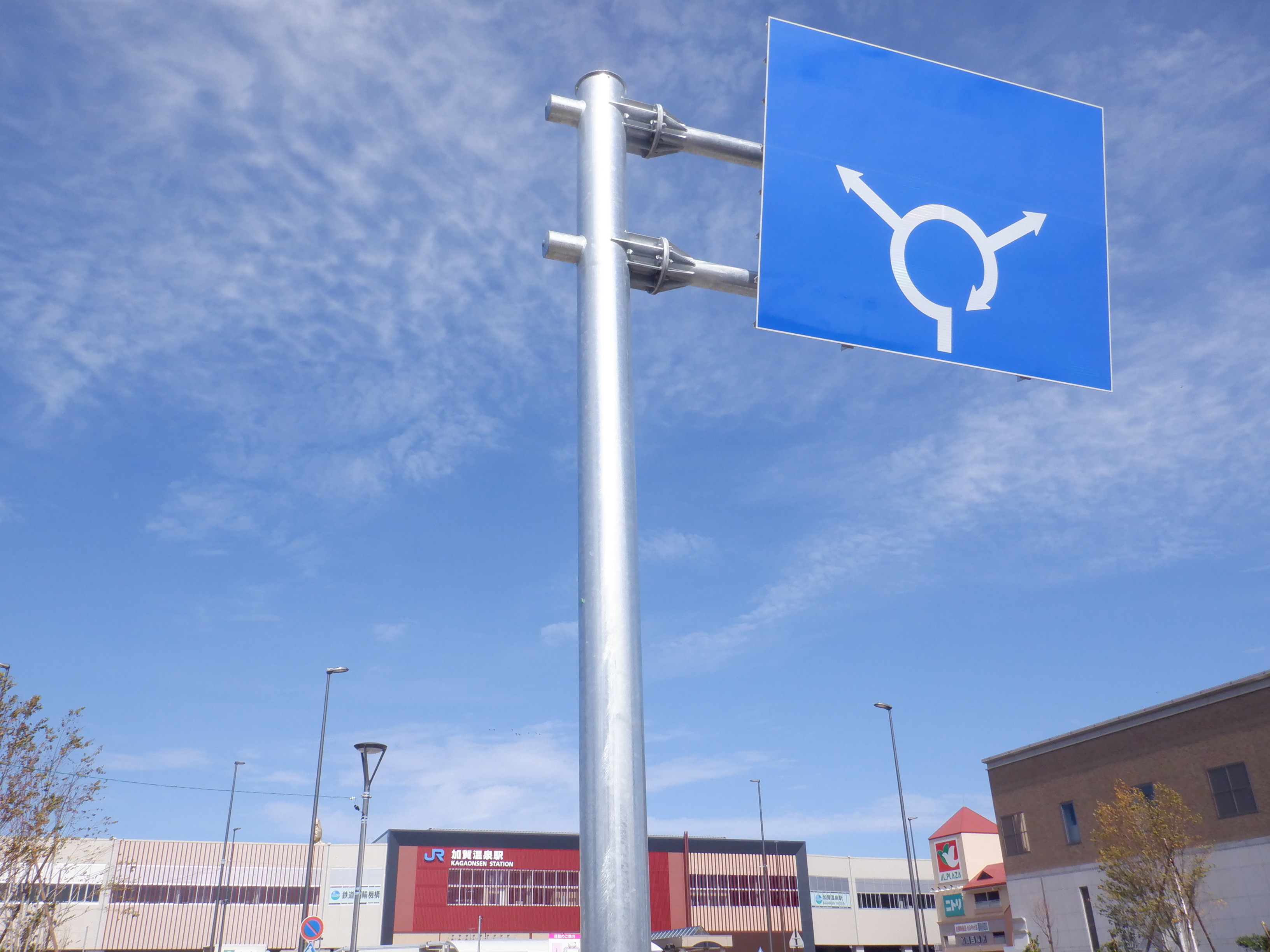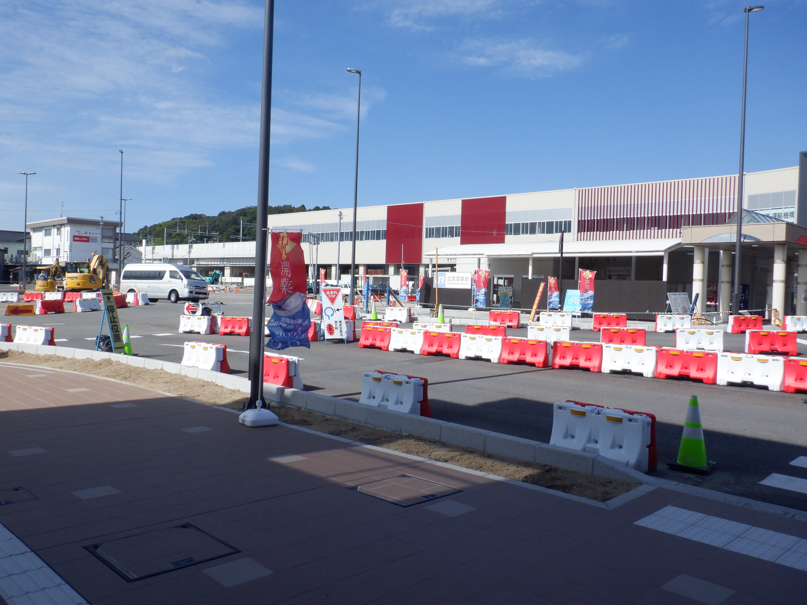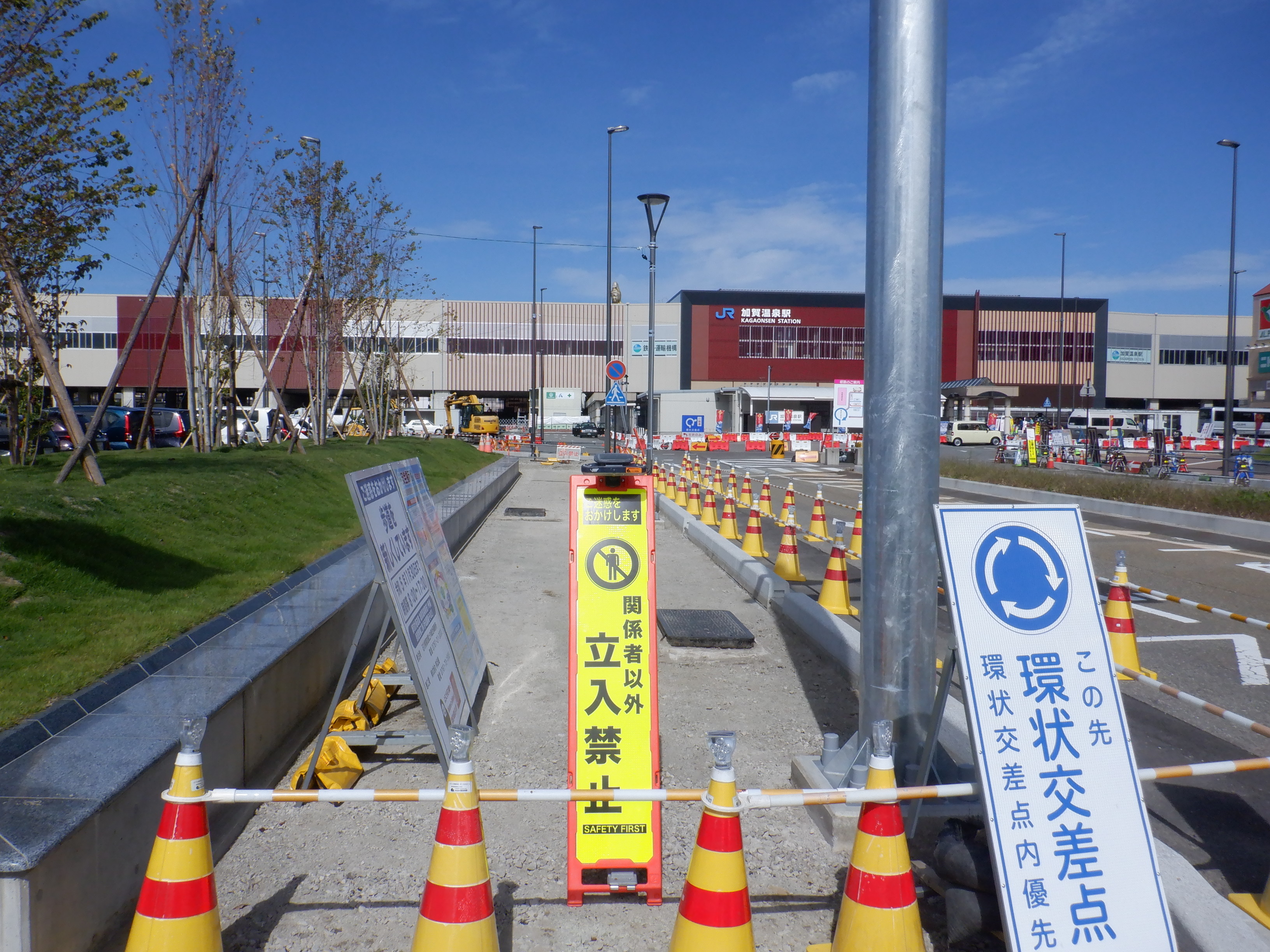 駅正面の道路、駐車場側の歩道工事が始まっています。環状交差点の青看板など。