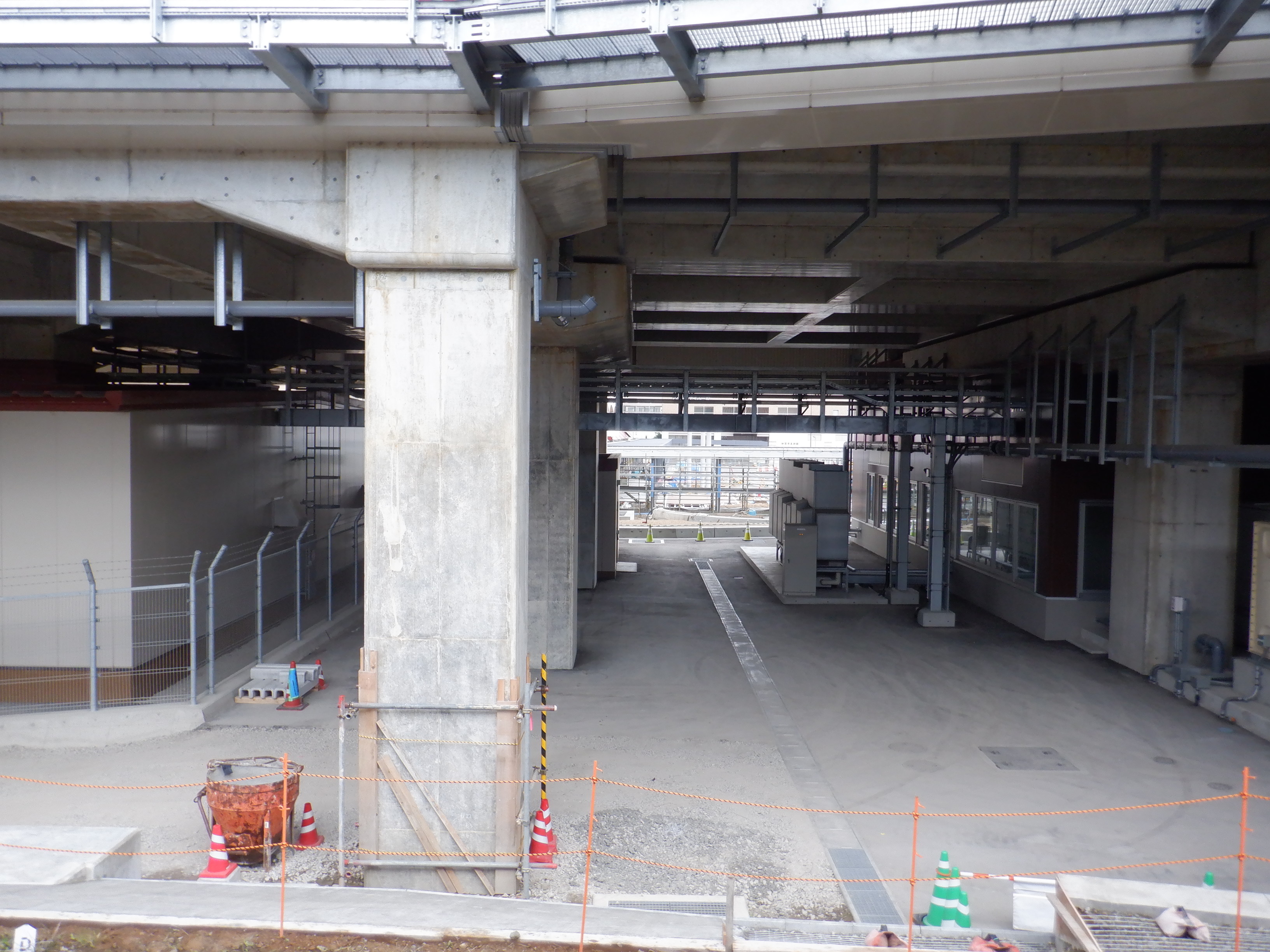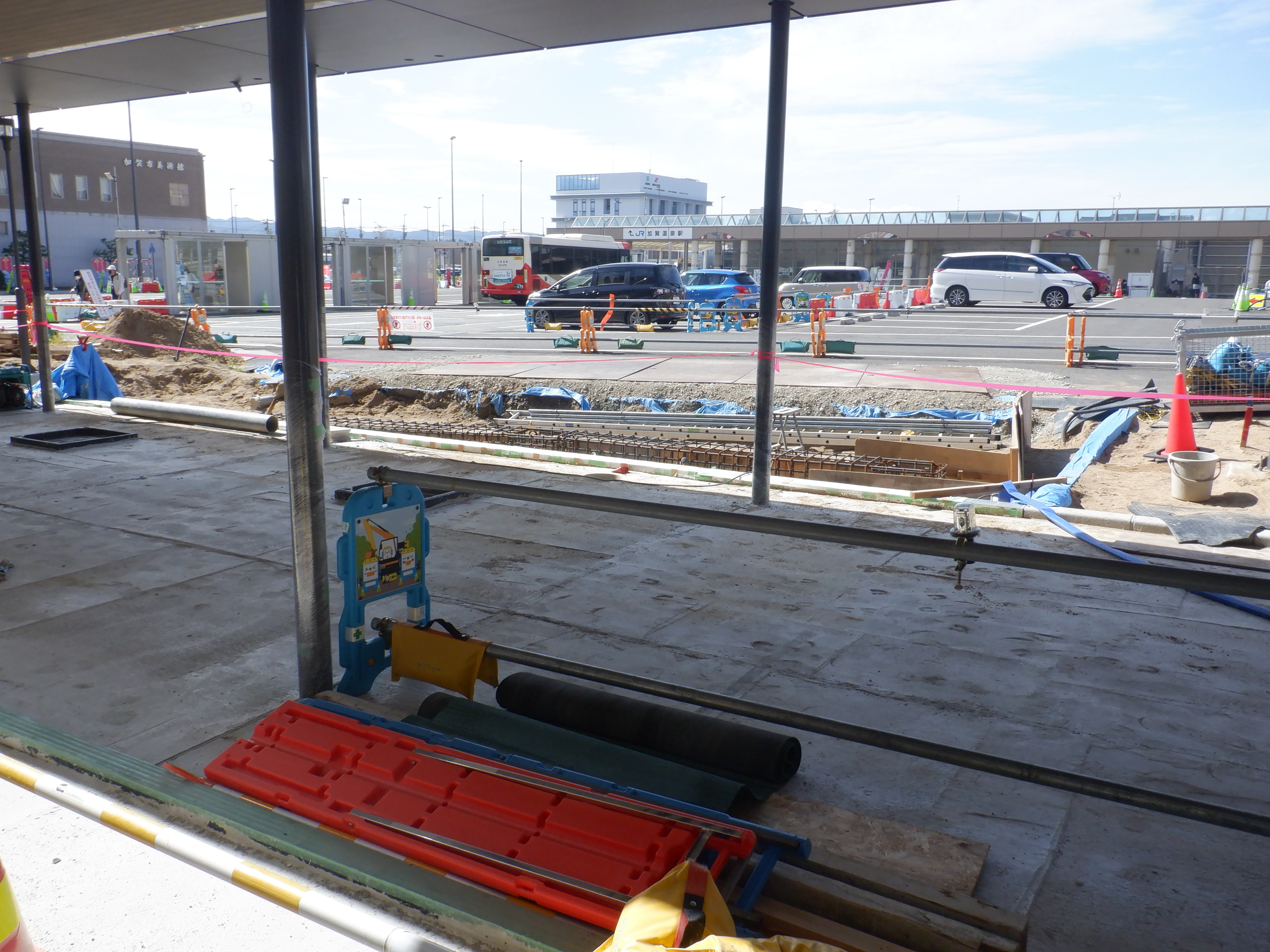 1・2番のりばから見たコンビニ・待合室等建設中のところ、ですが、こちらに迂回する形で北口からの通路が作られるようで、既にその形が見えていました。