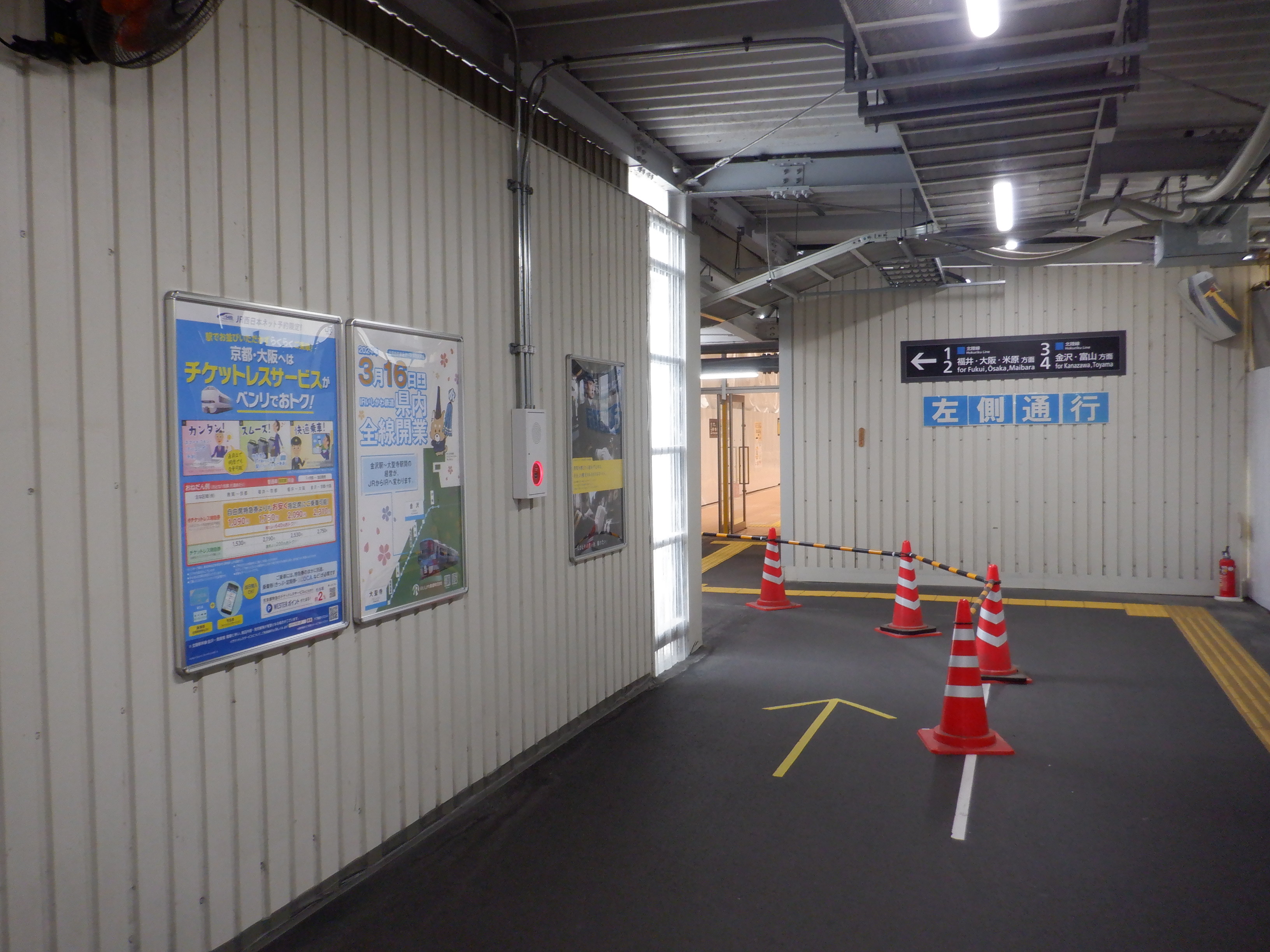 仮設通路のIRいしかわ鉄道県内全線開業のポスター。