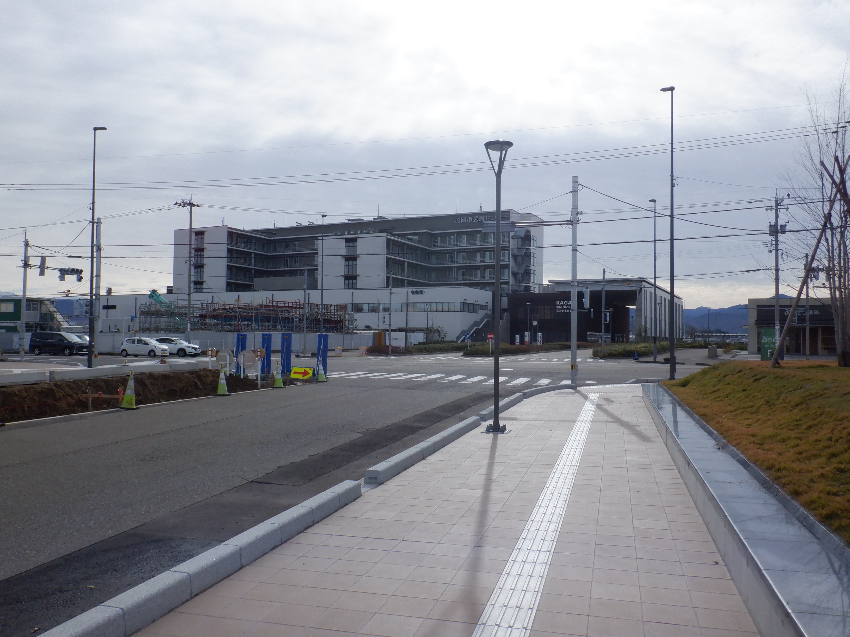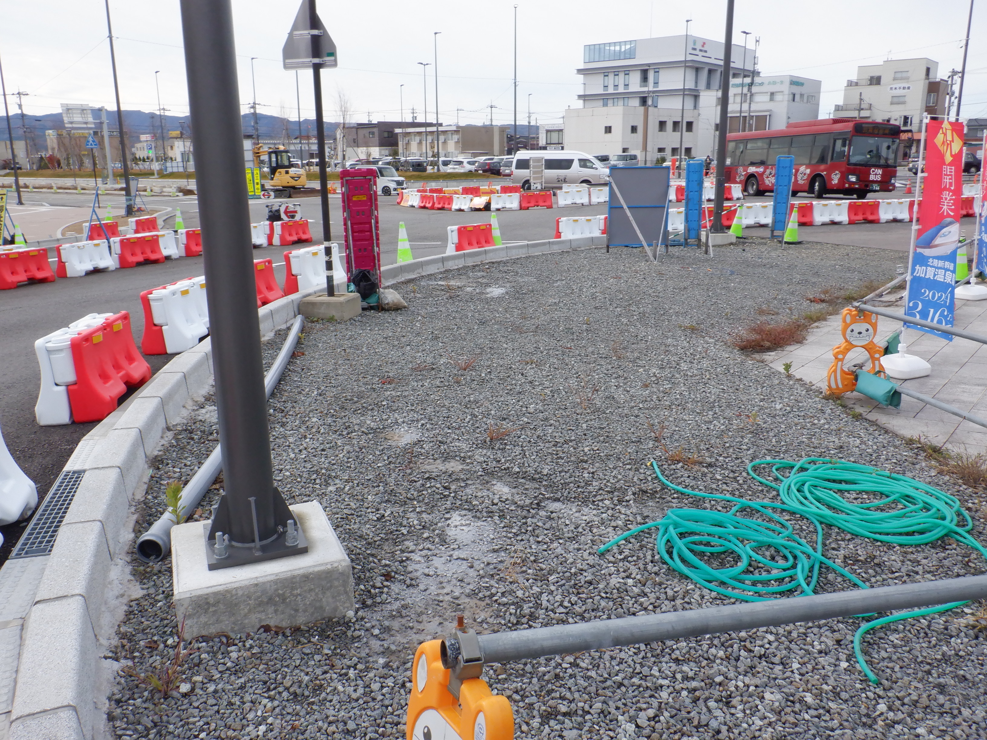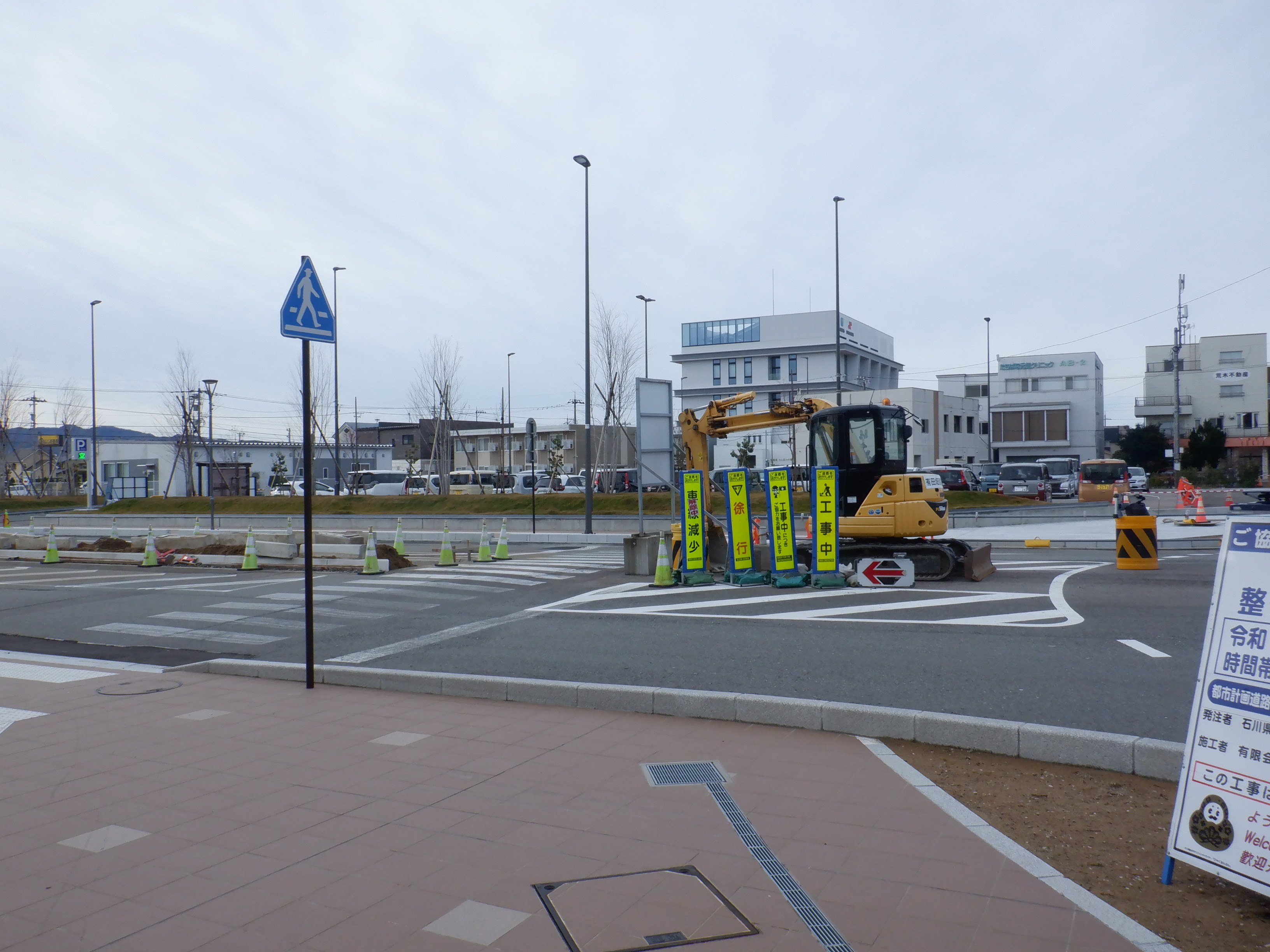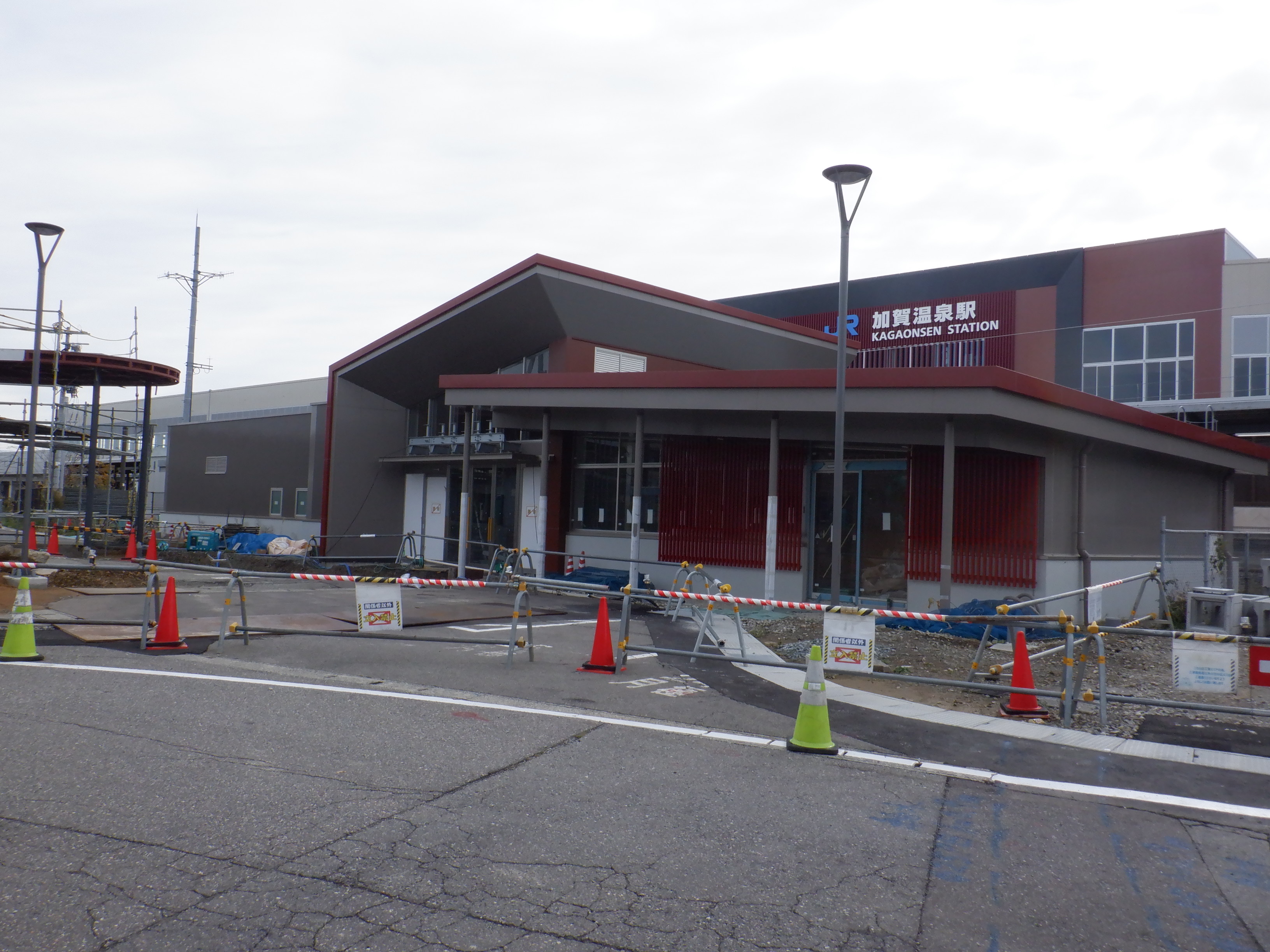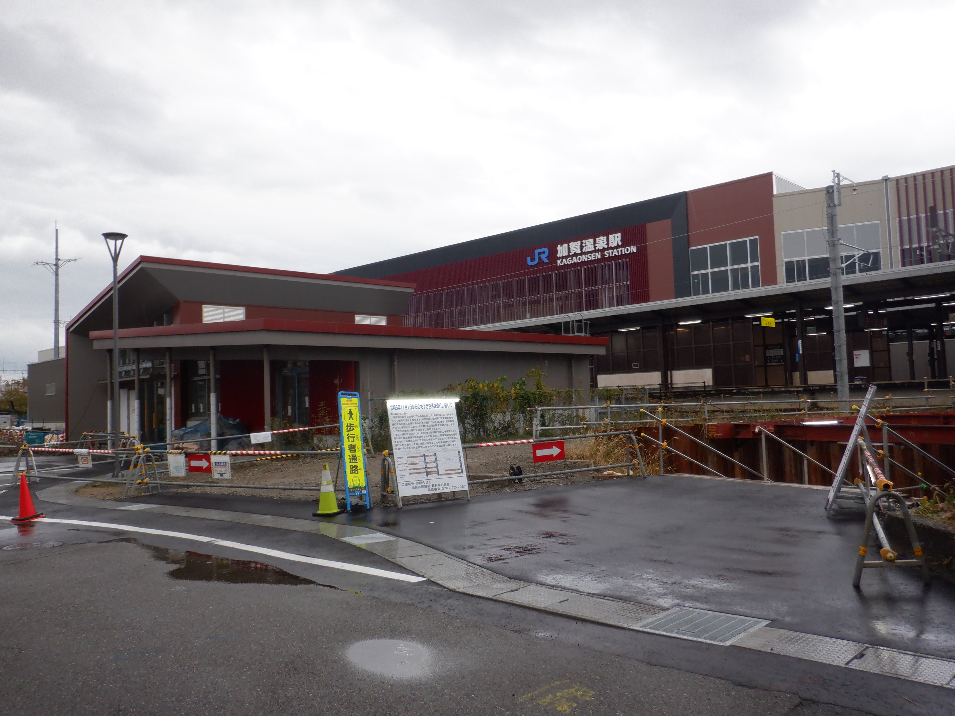 大聖寺駅側。右側にレンタカー屋さん建設中の様子が見えます。