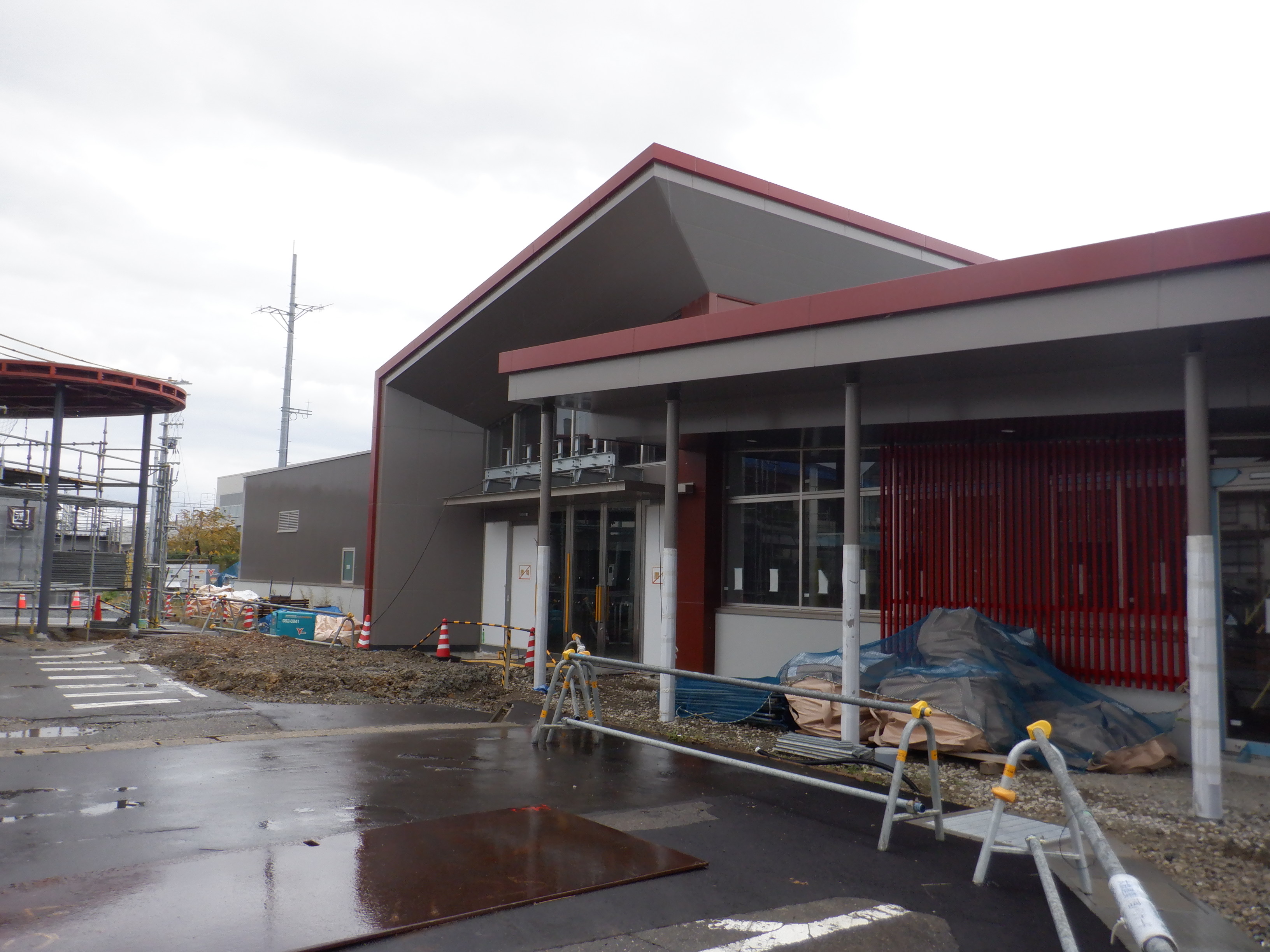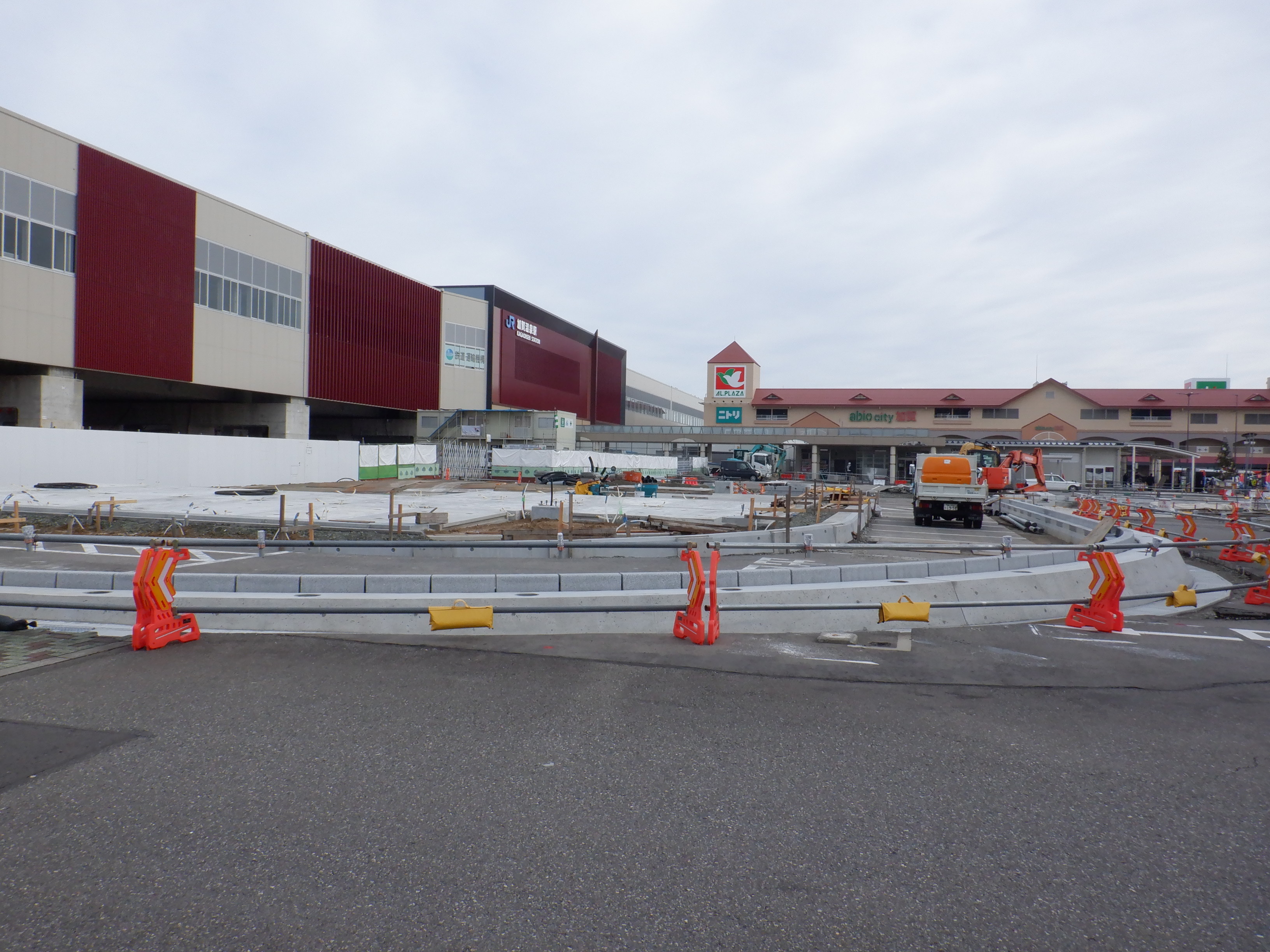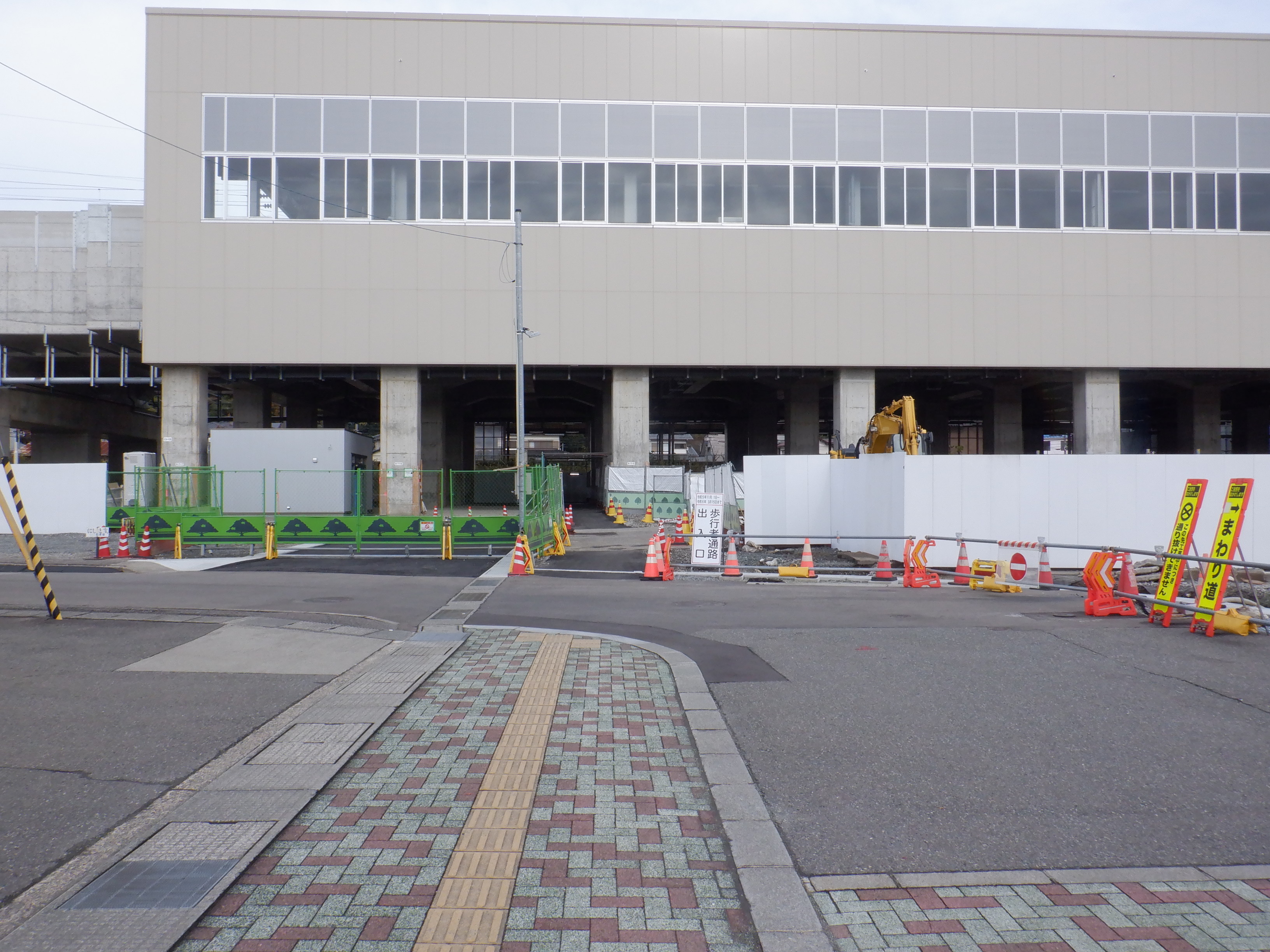 アルプラザ側のシェルター建設中のところと新幹線駅舎。