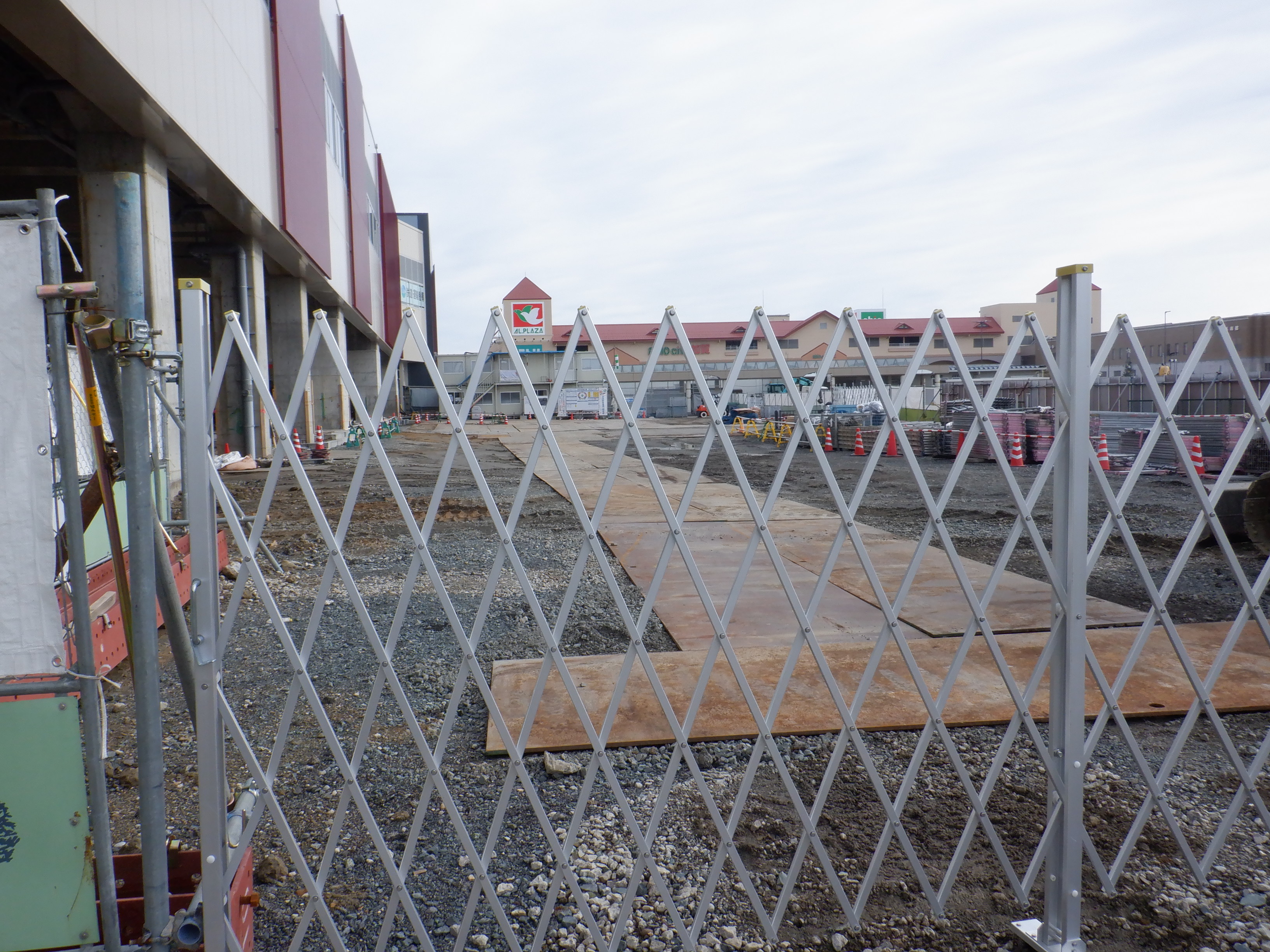 仮設駅舎のアルプラザ側から見たシェルター建設中のところと新幹線駅舎。
