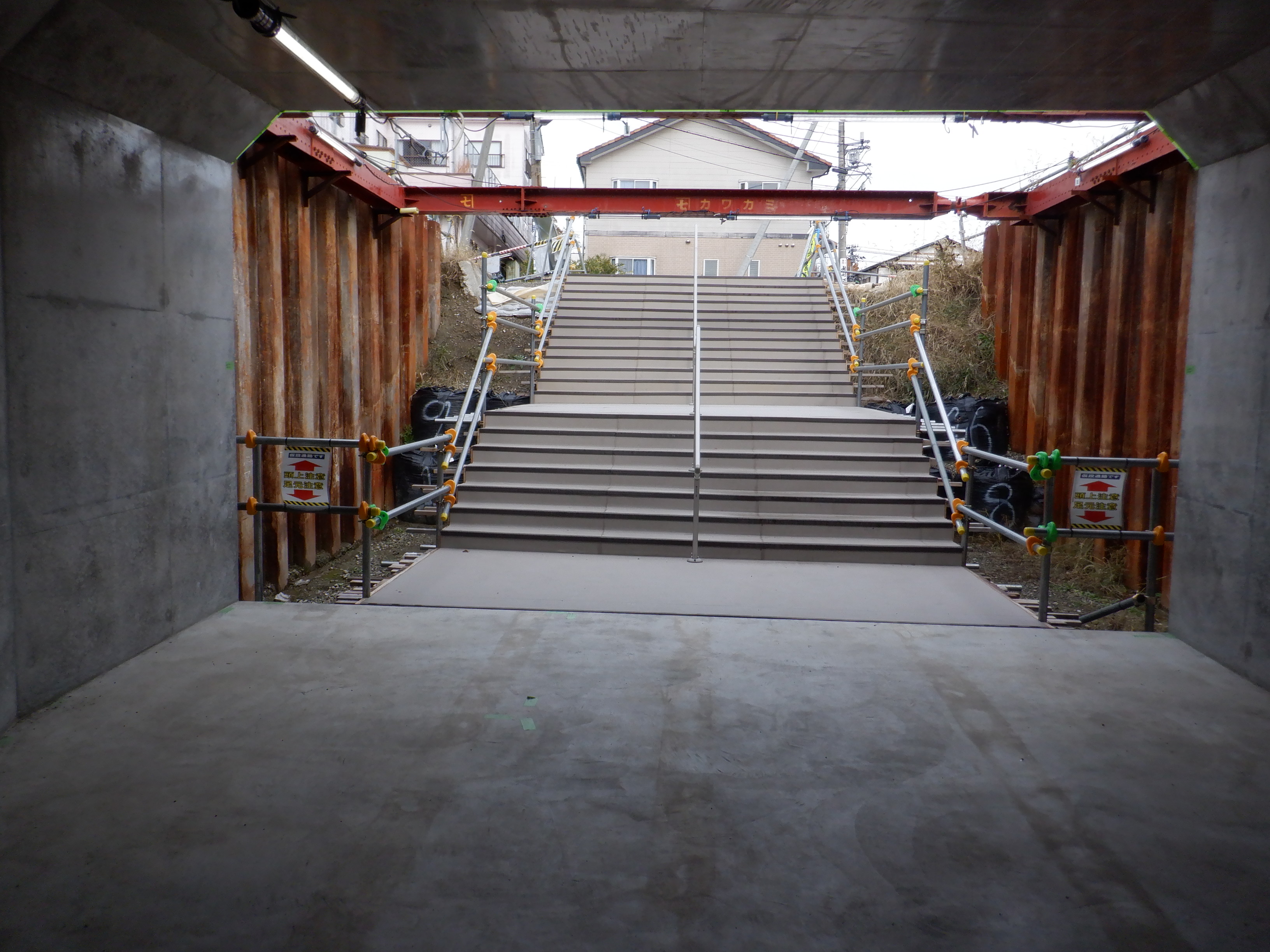 1・2番のりばから見た高架下部都市施設(コンビニ・待合室等)建設中のところの地下道からの入口付近。施設に向かって階段が作られているのが分かります。