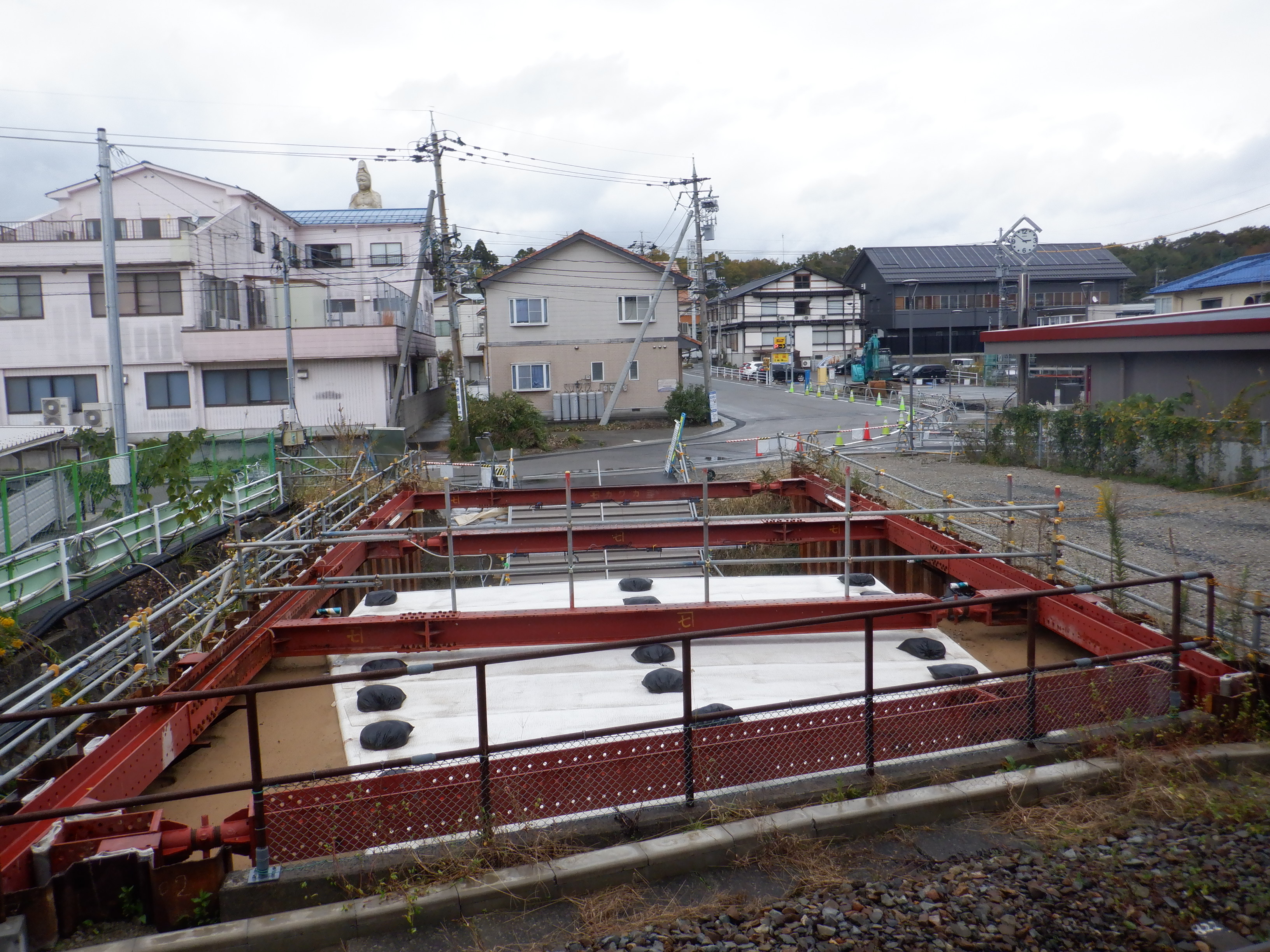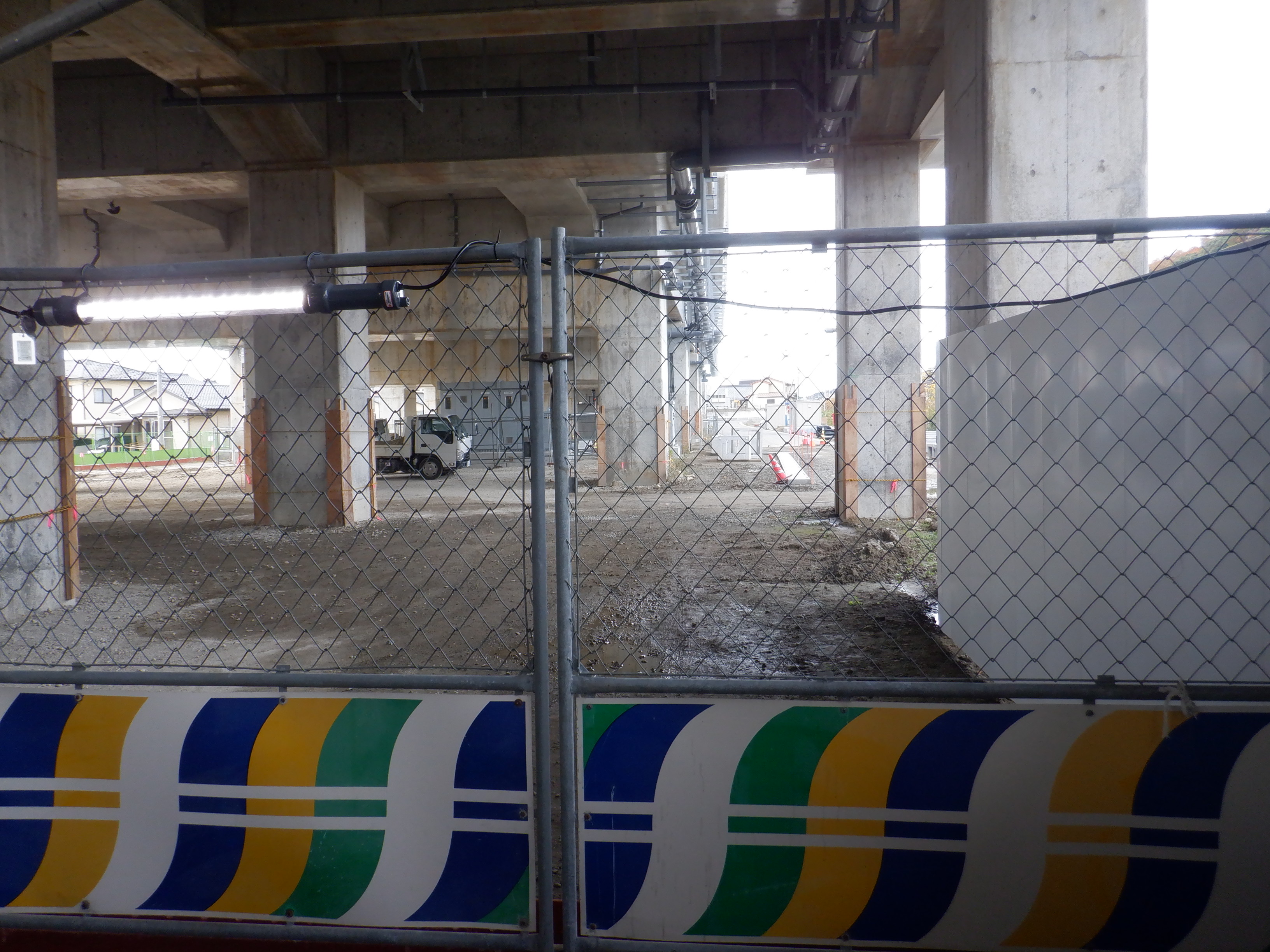迂回路入口から見た高架下部都市施設(コンビニ・待合室等)建設中の様子。