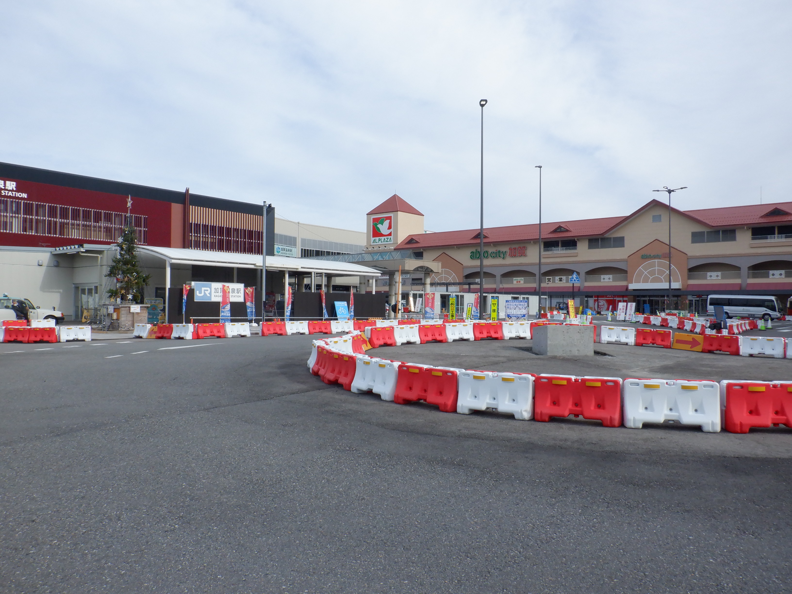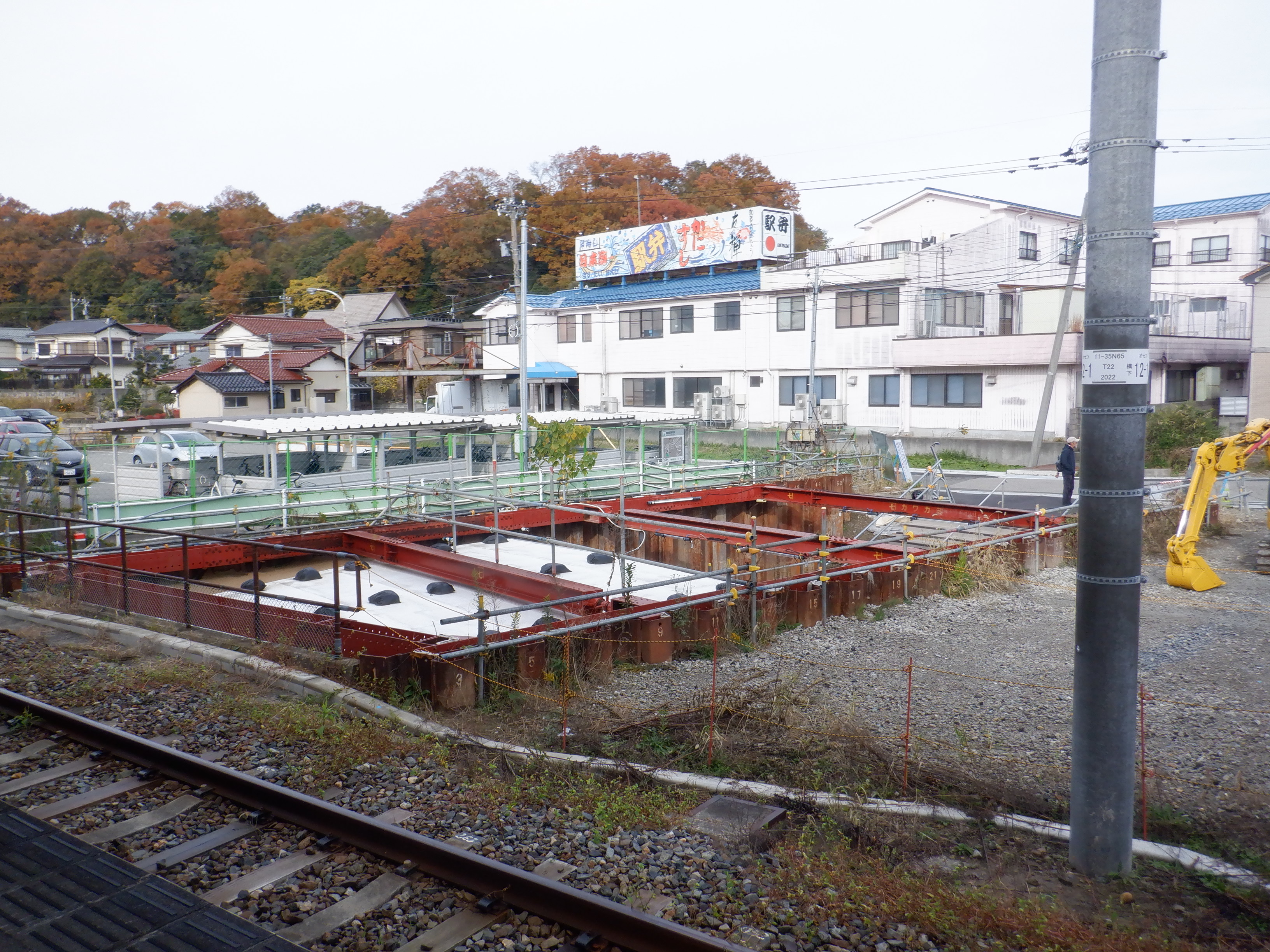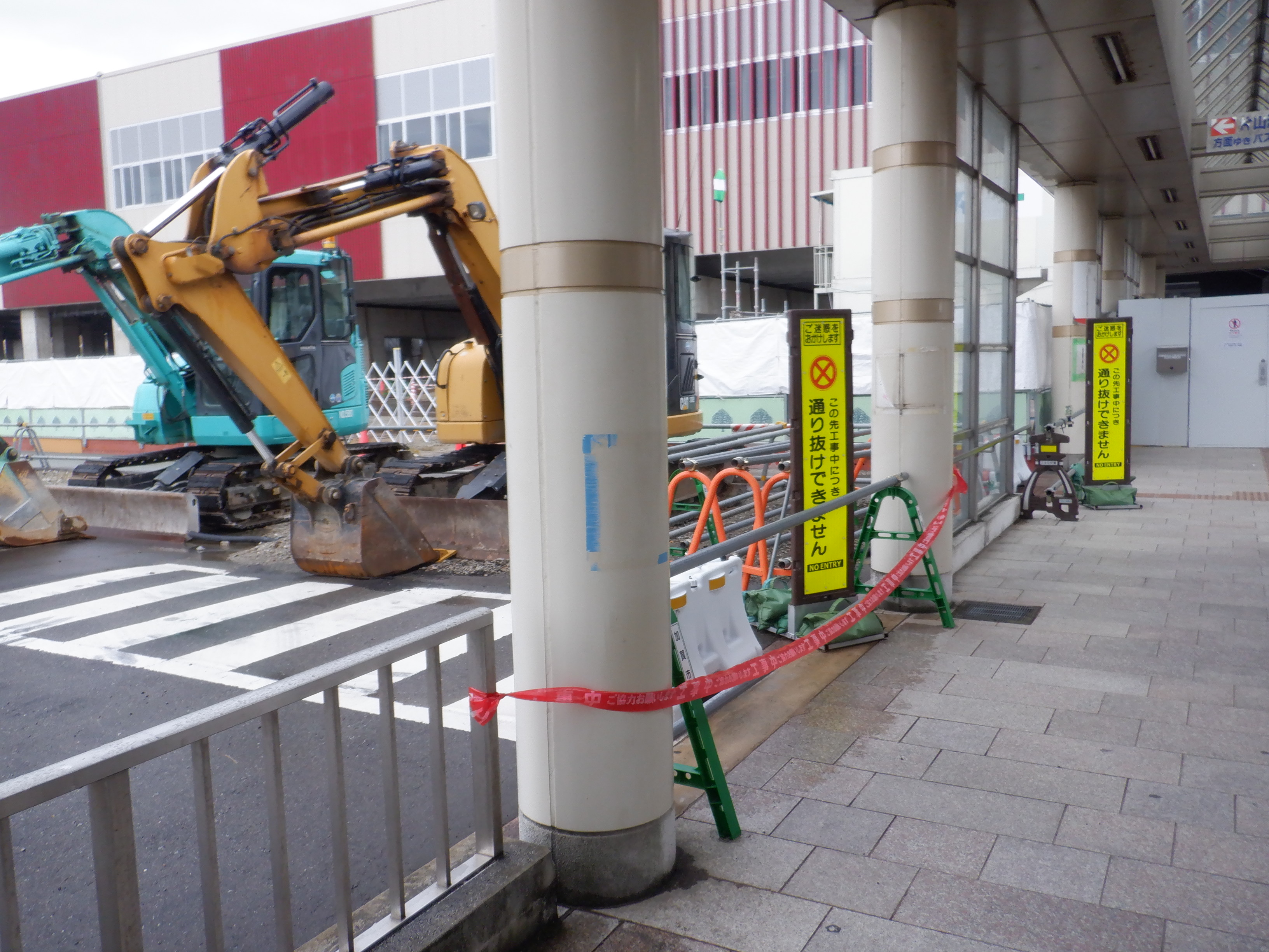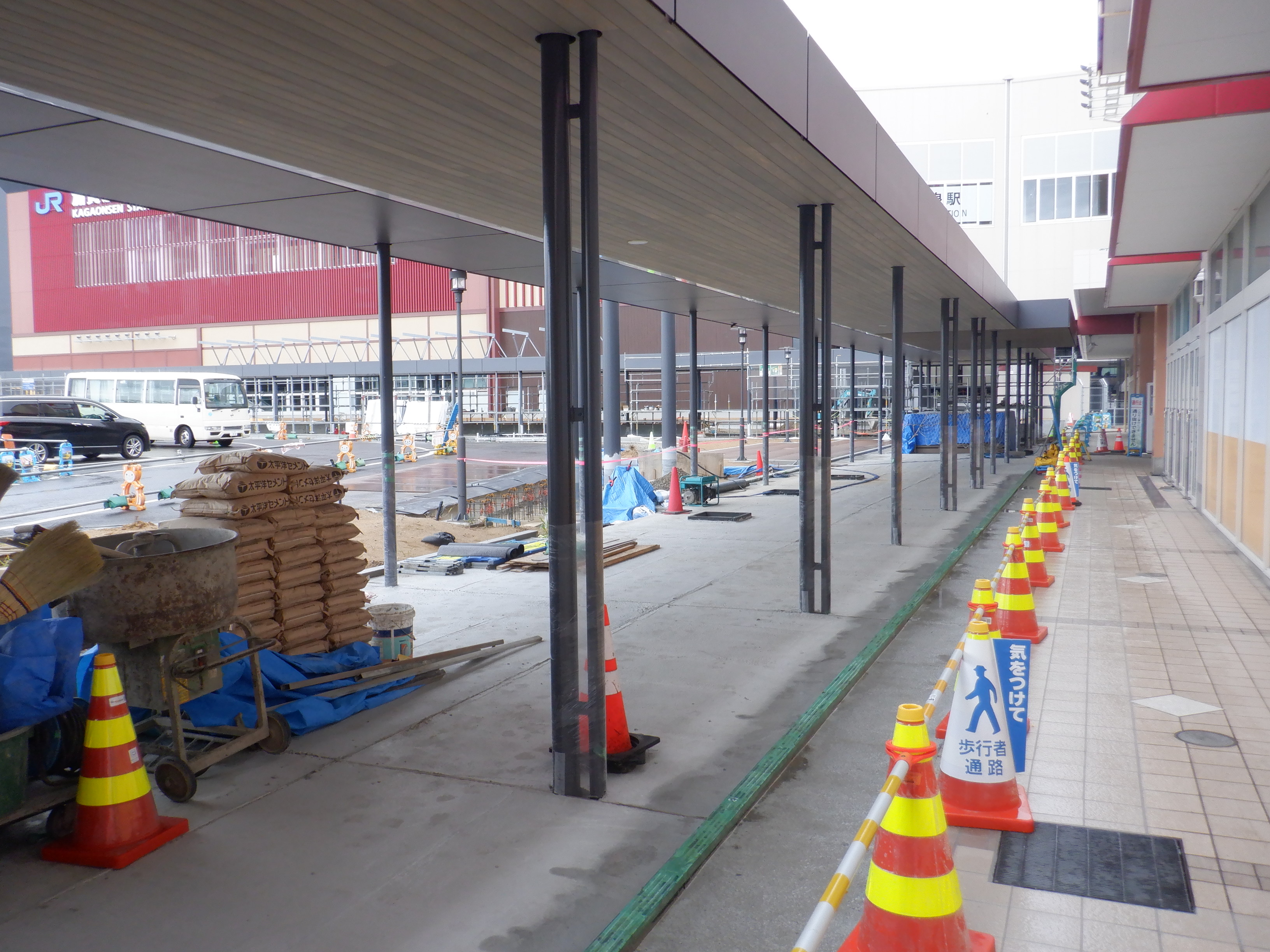 1・2番のりばから見た高架下部都市施設(コンビニ・待合室等)建設中のところと迂回路。