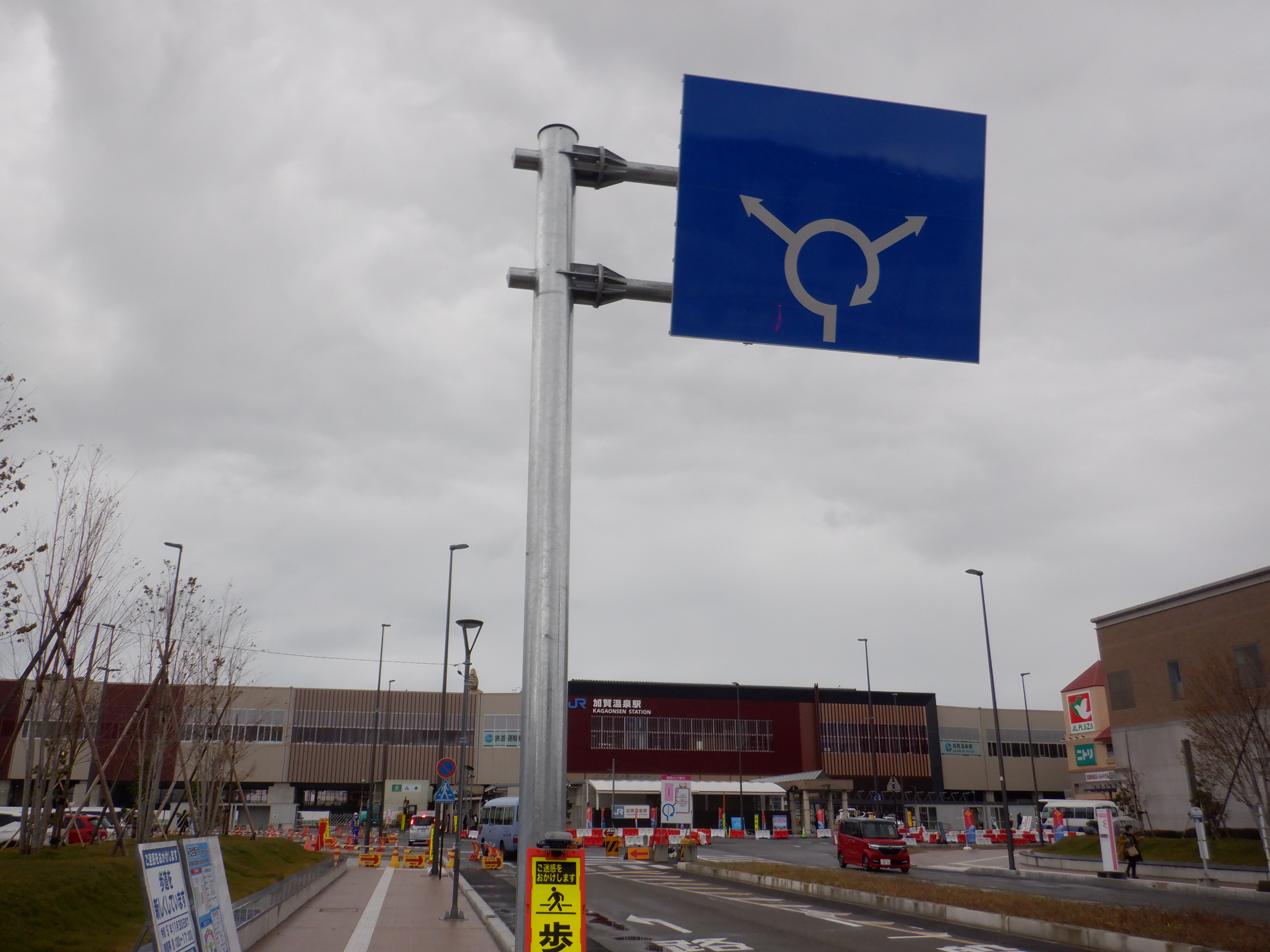 仮設駅舎の駅前の環状交差点。