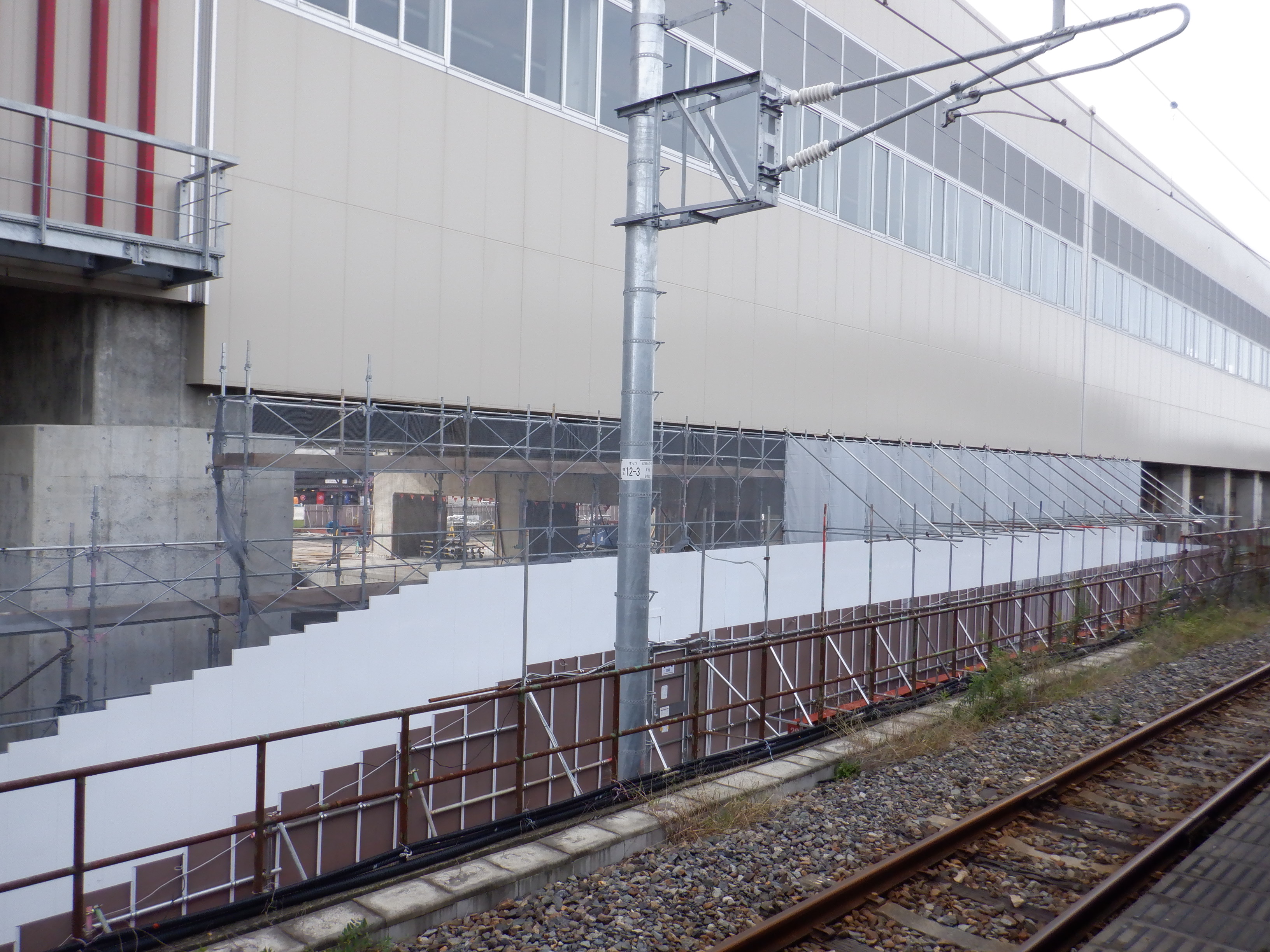 1・2番のりばから見た高架下部都市施設(コンビニ・待合室等)建設中のところと仮設通路。