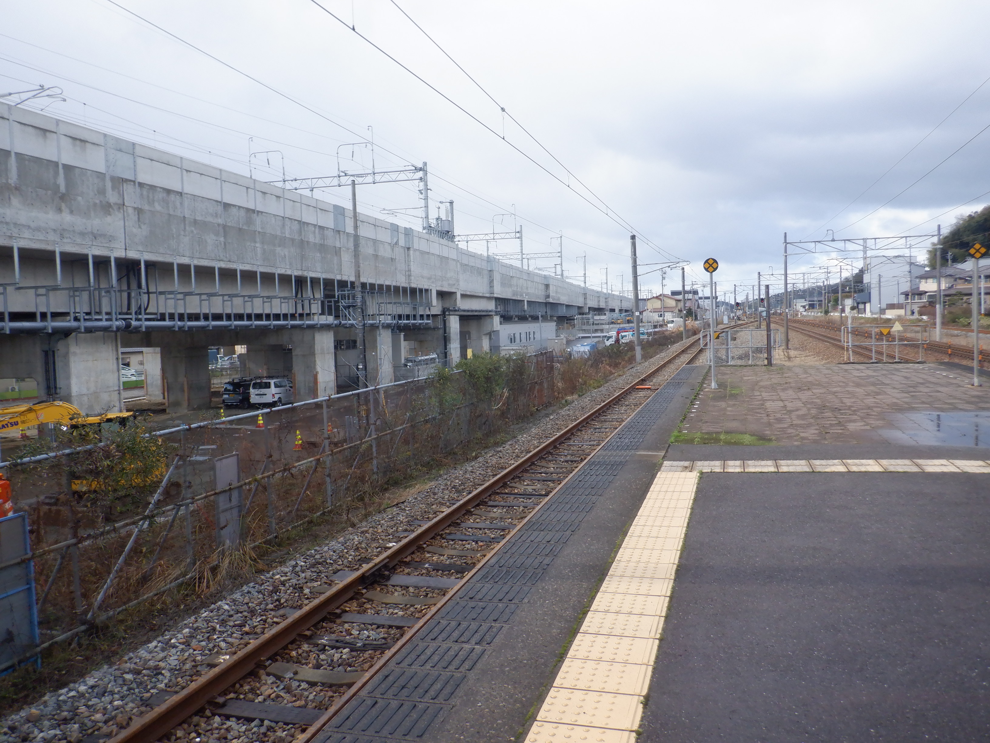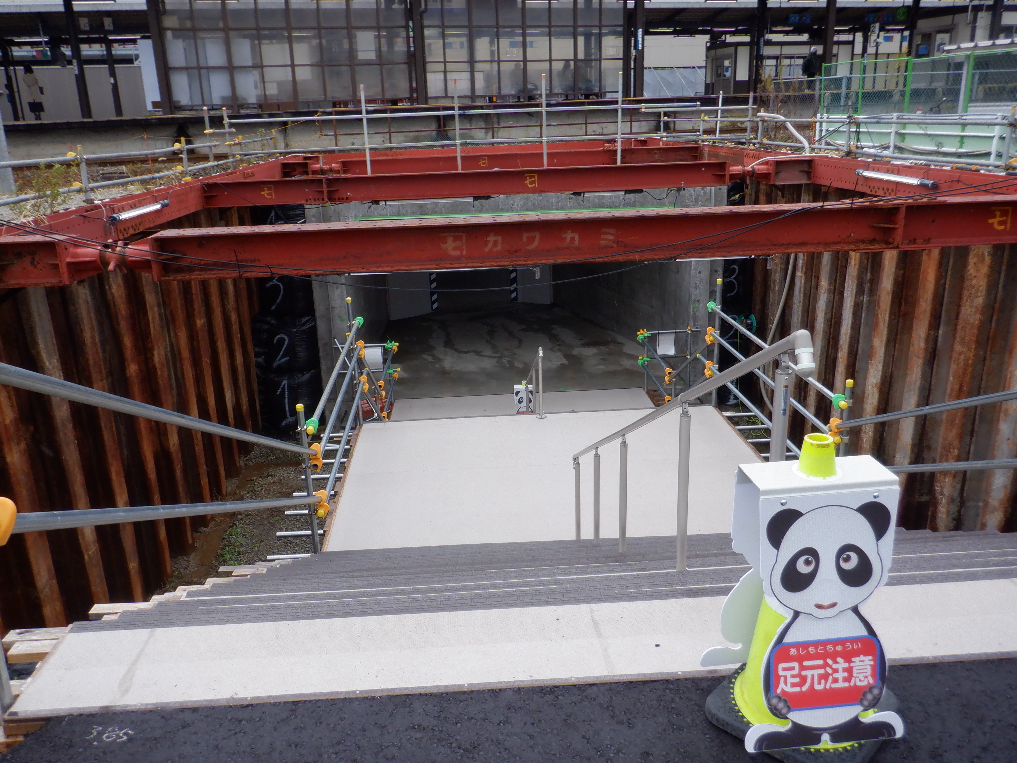 3・4番のりばから見た仮設地下道出入口と在来線駅舎となるもの。