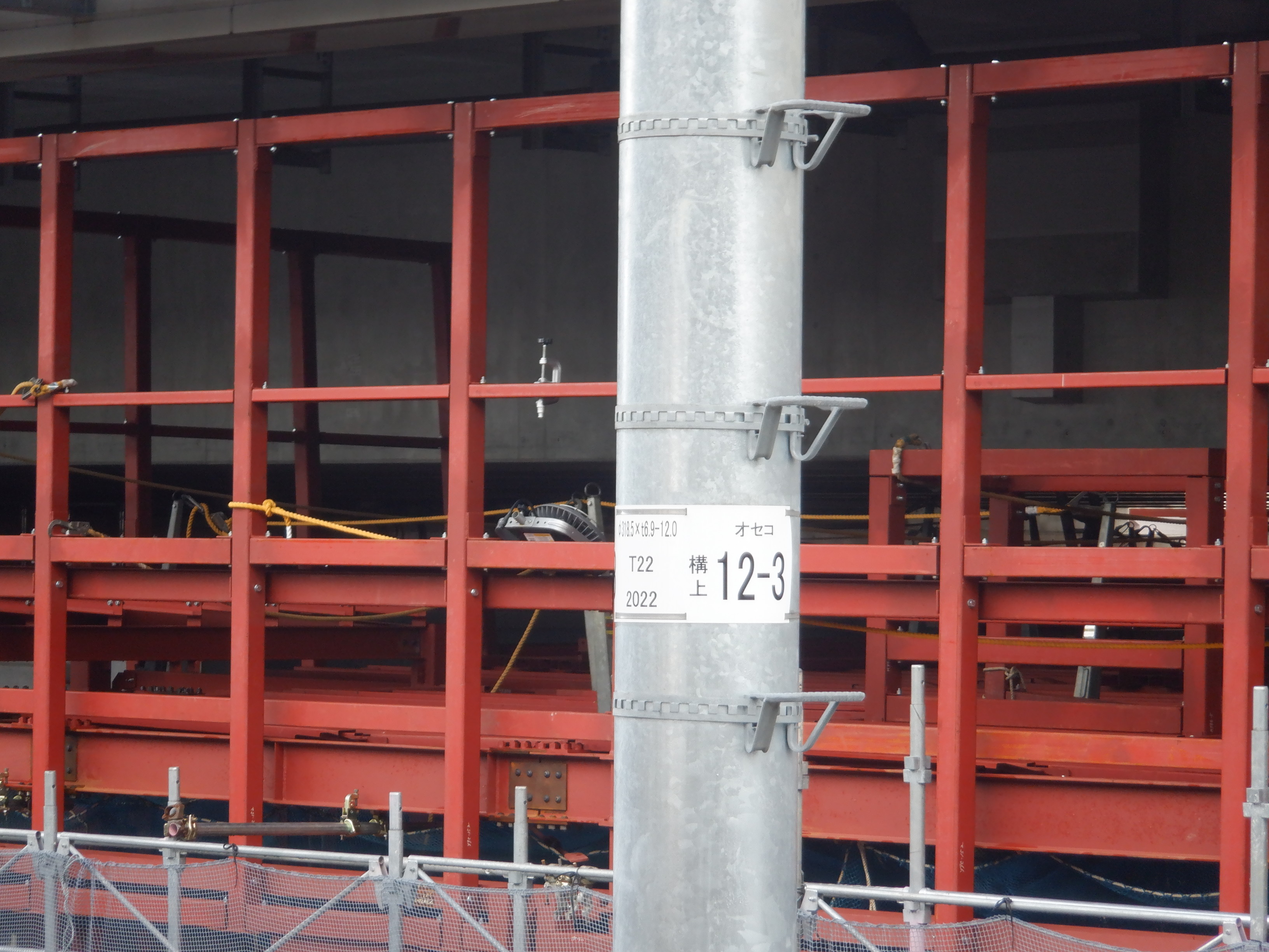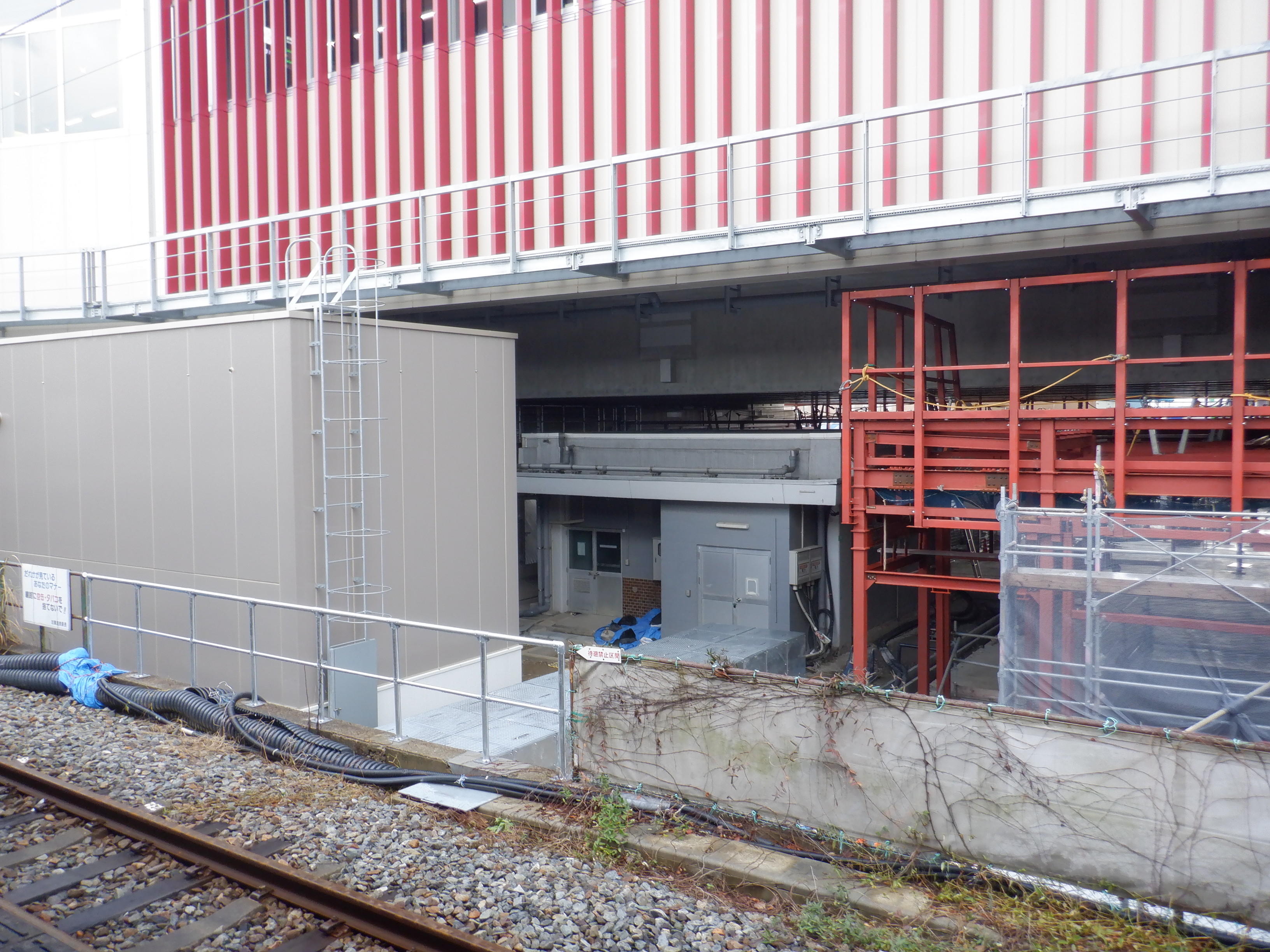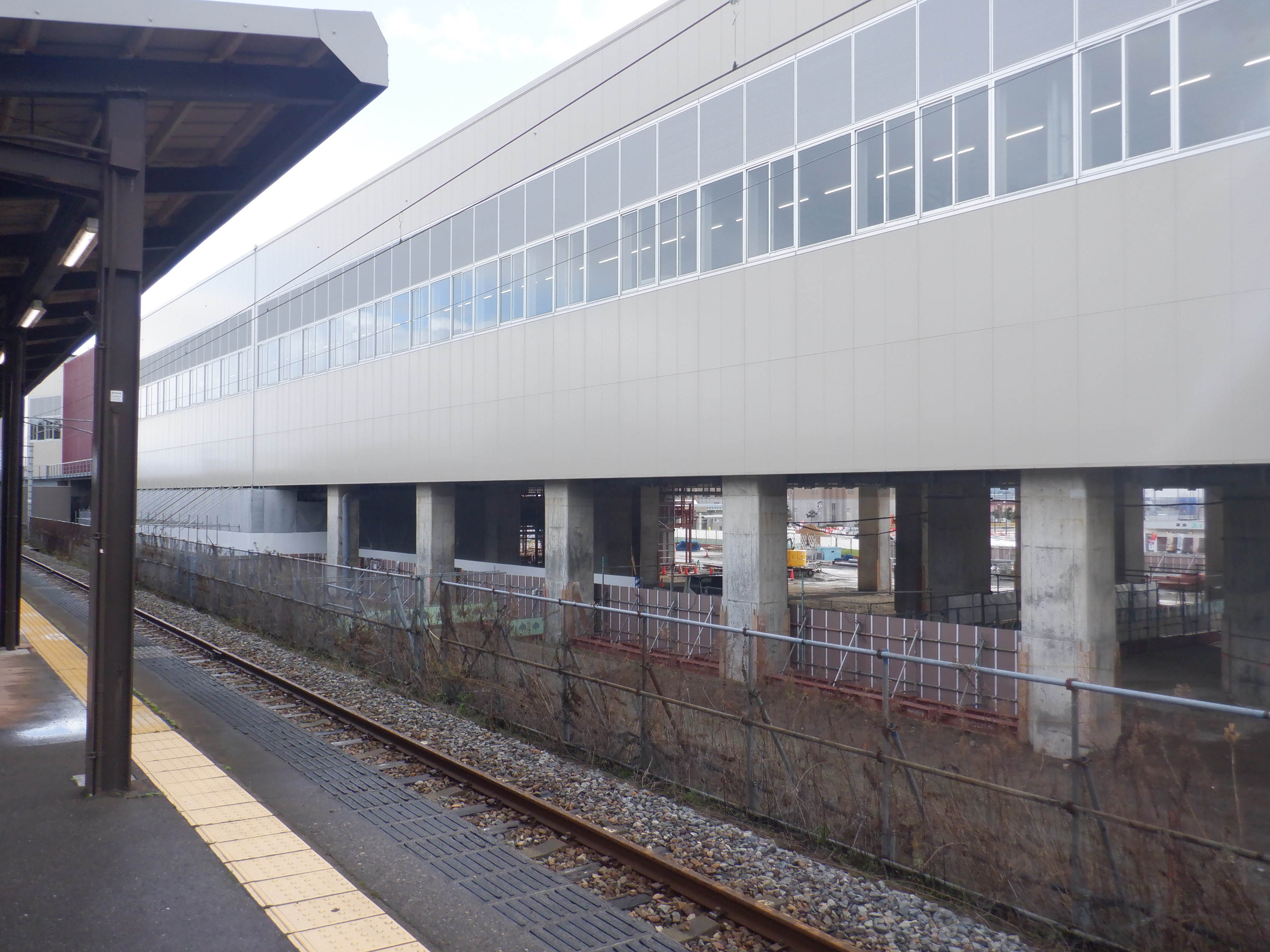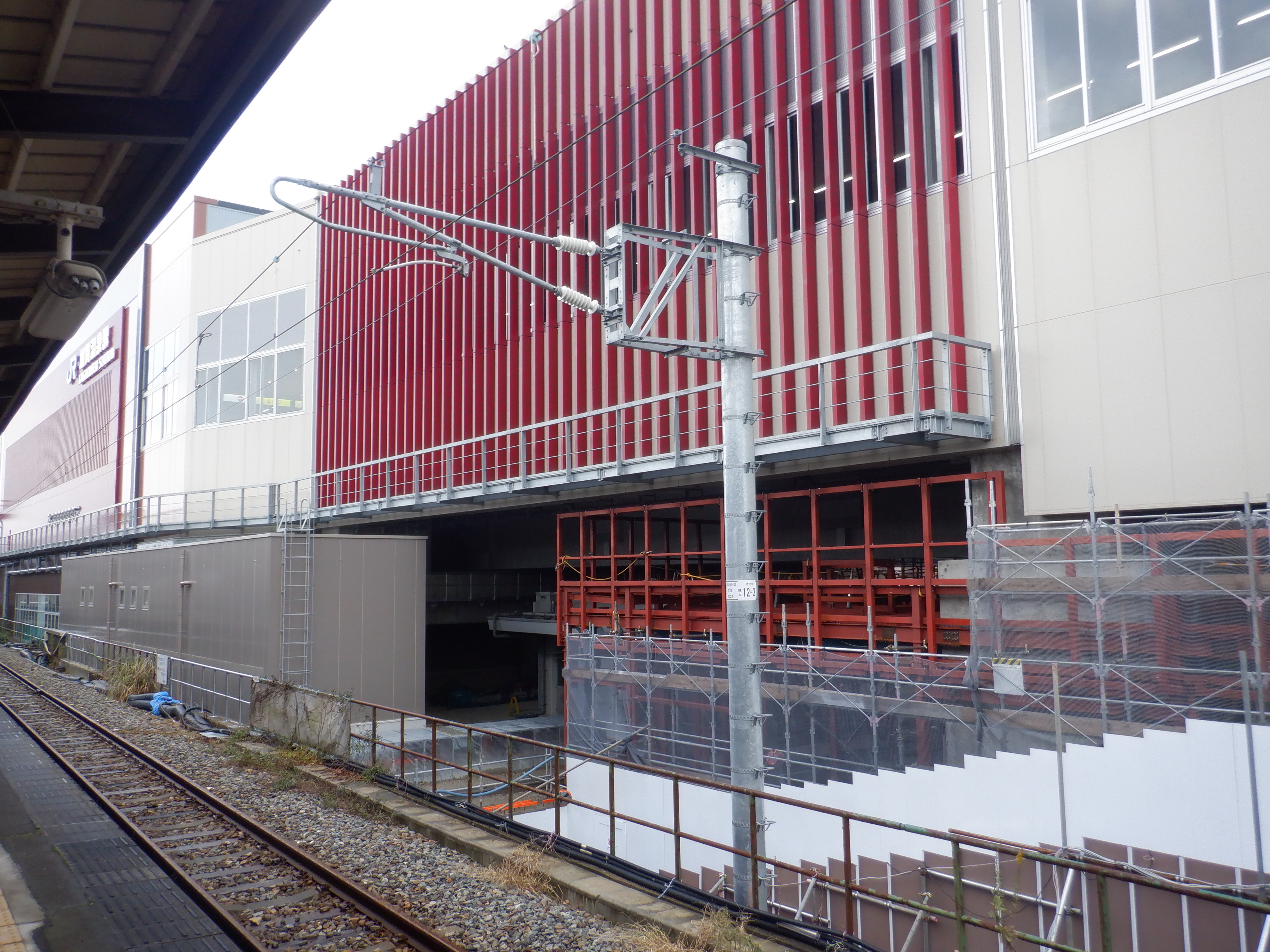 1・2番のりばから見た高架下部都市施設(コンビニ・待合室等)建設中の様子。また、架線柱の「オセコ」(電略+コ)の表示。