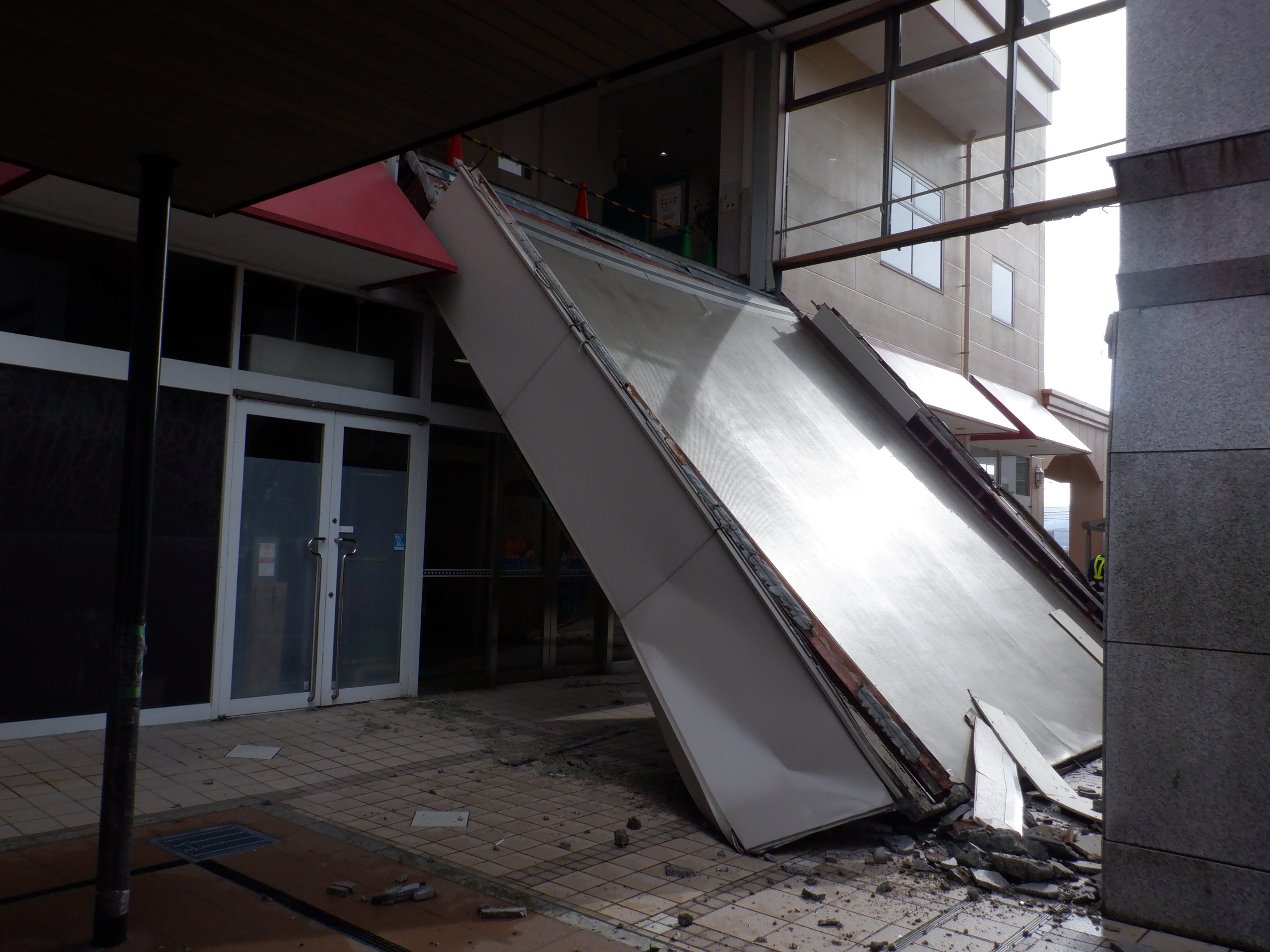 元日の能登半島地震により、アルプラザとアビオシティホールを結んでいた通路が落下しました。(構造上、そのようになっていたようです。)実はこの場所から毎回「アビオシティホールの前から」の画像の内1枚を撮っていました。