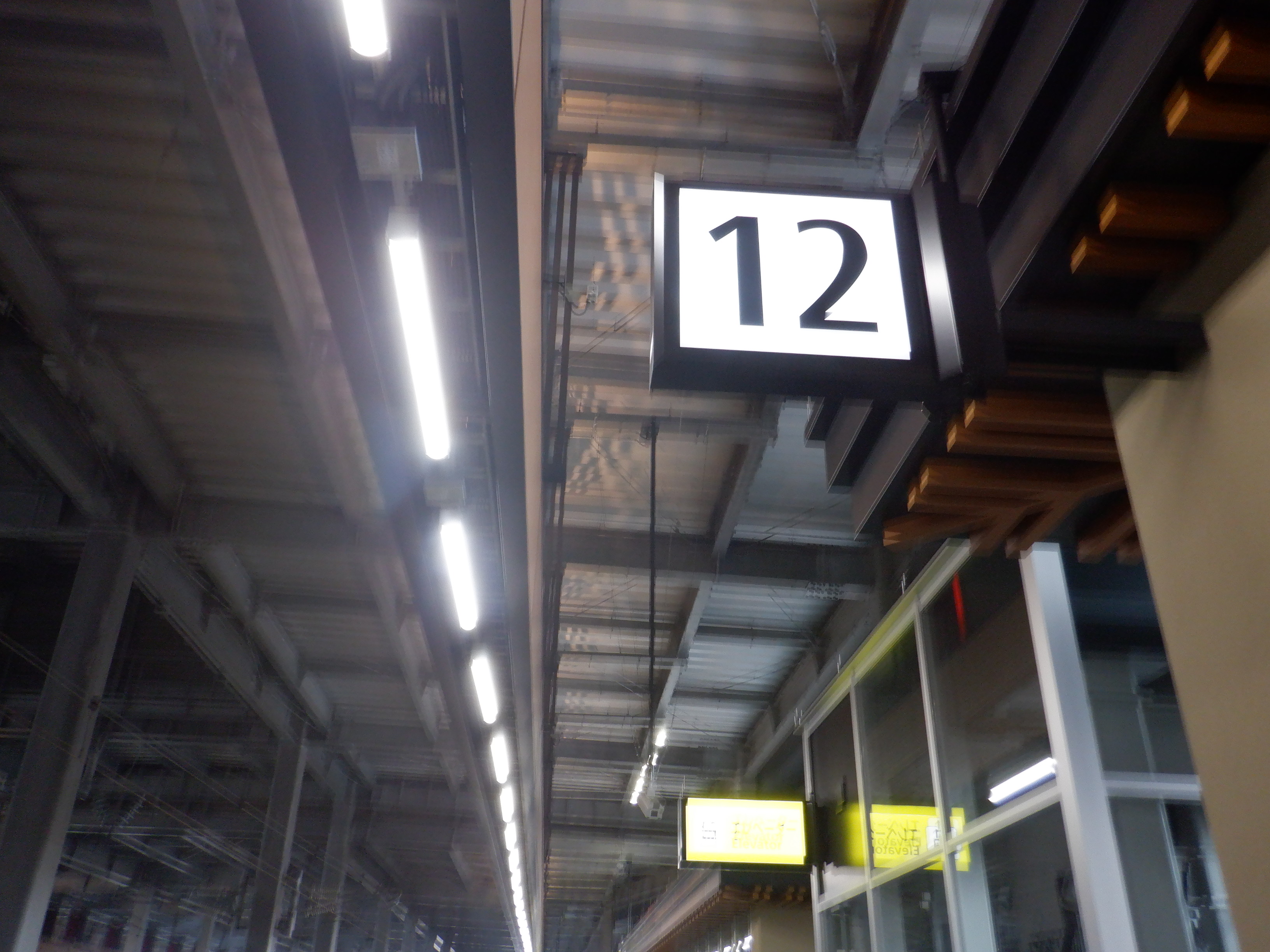12番のりばの駅名標とその付近から見上げたところ、駅名標の裏面。