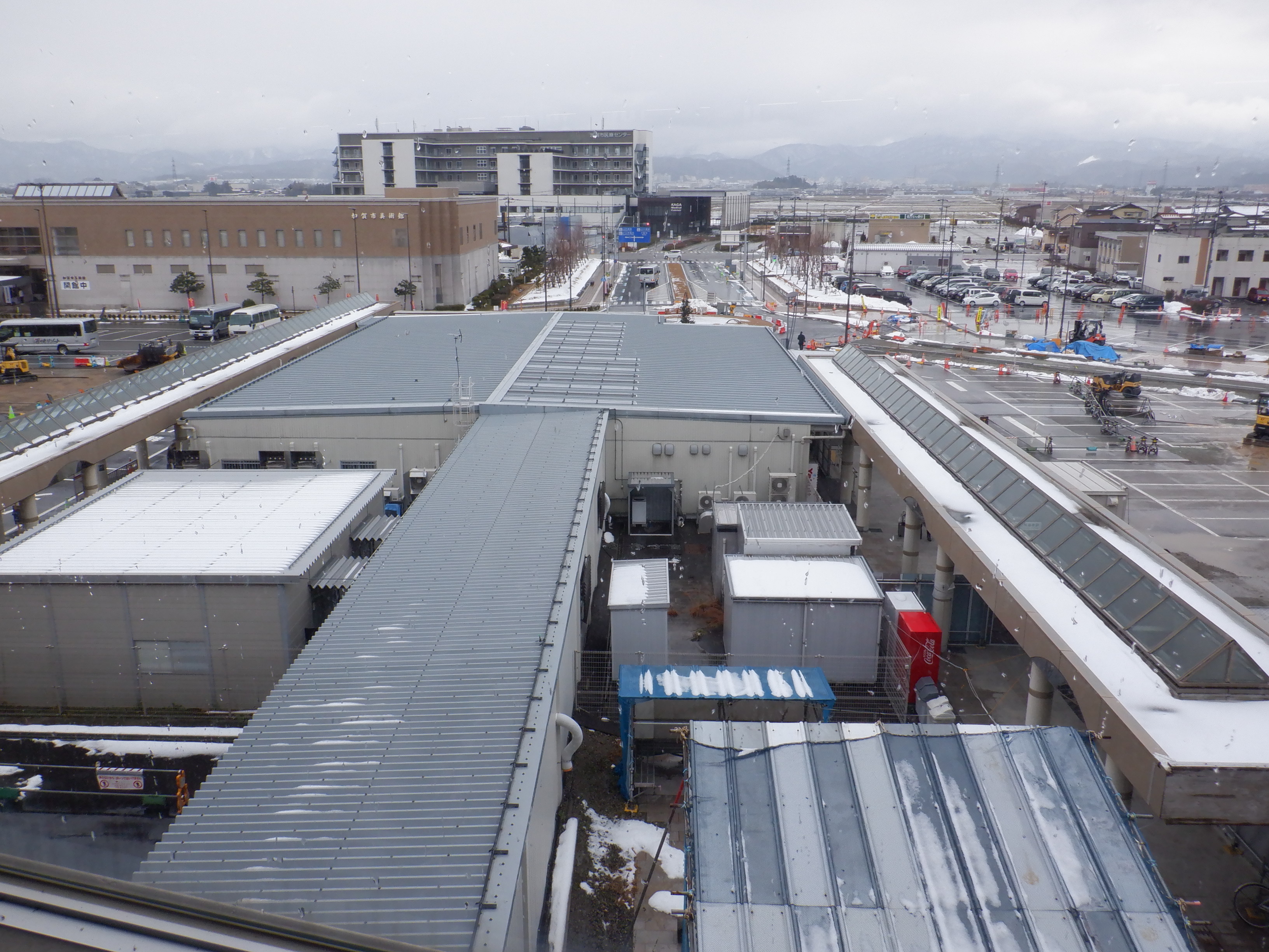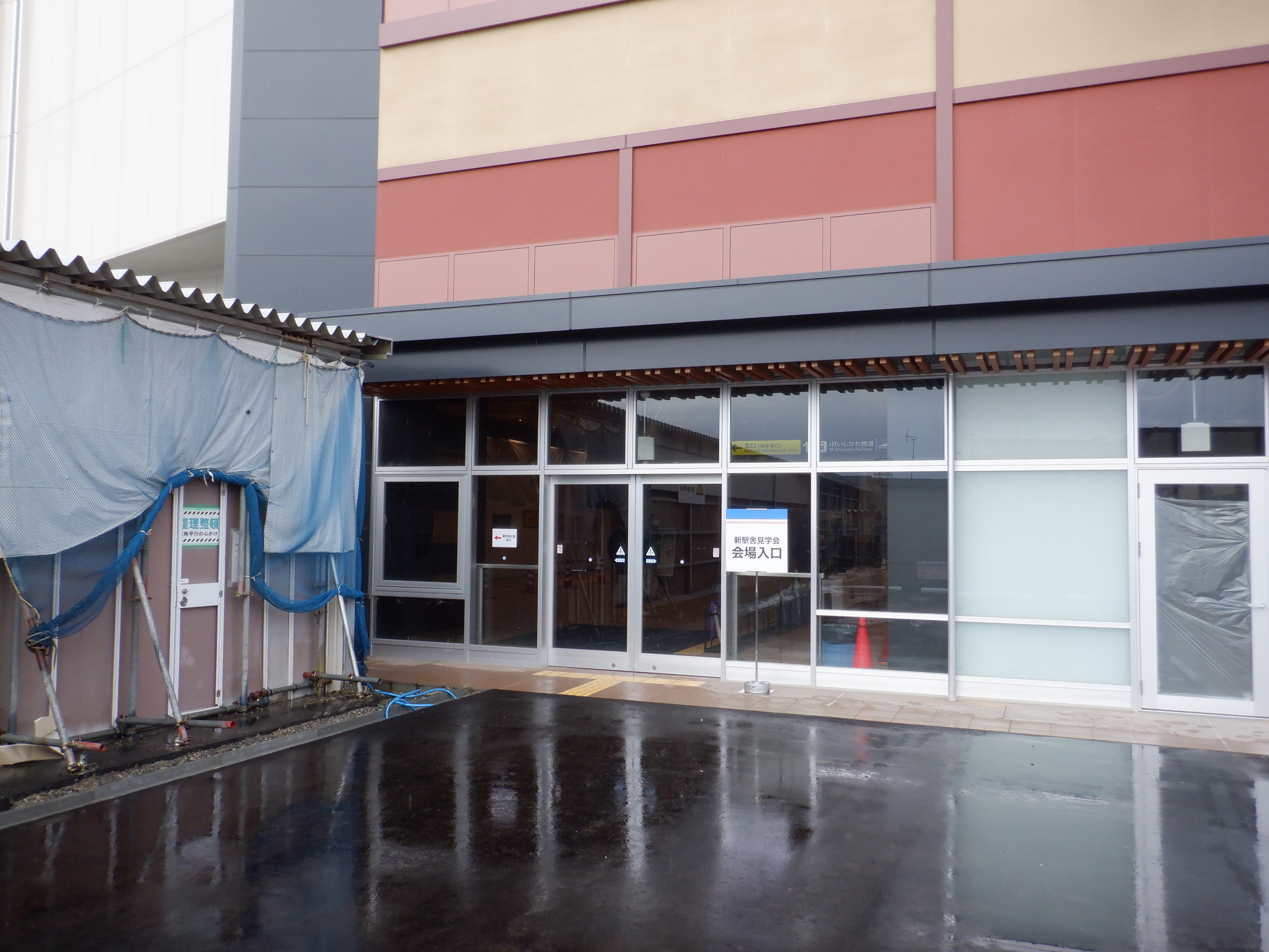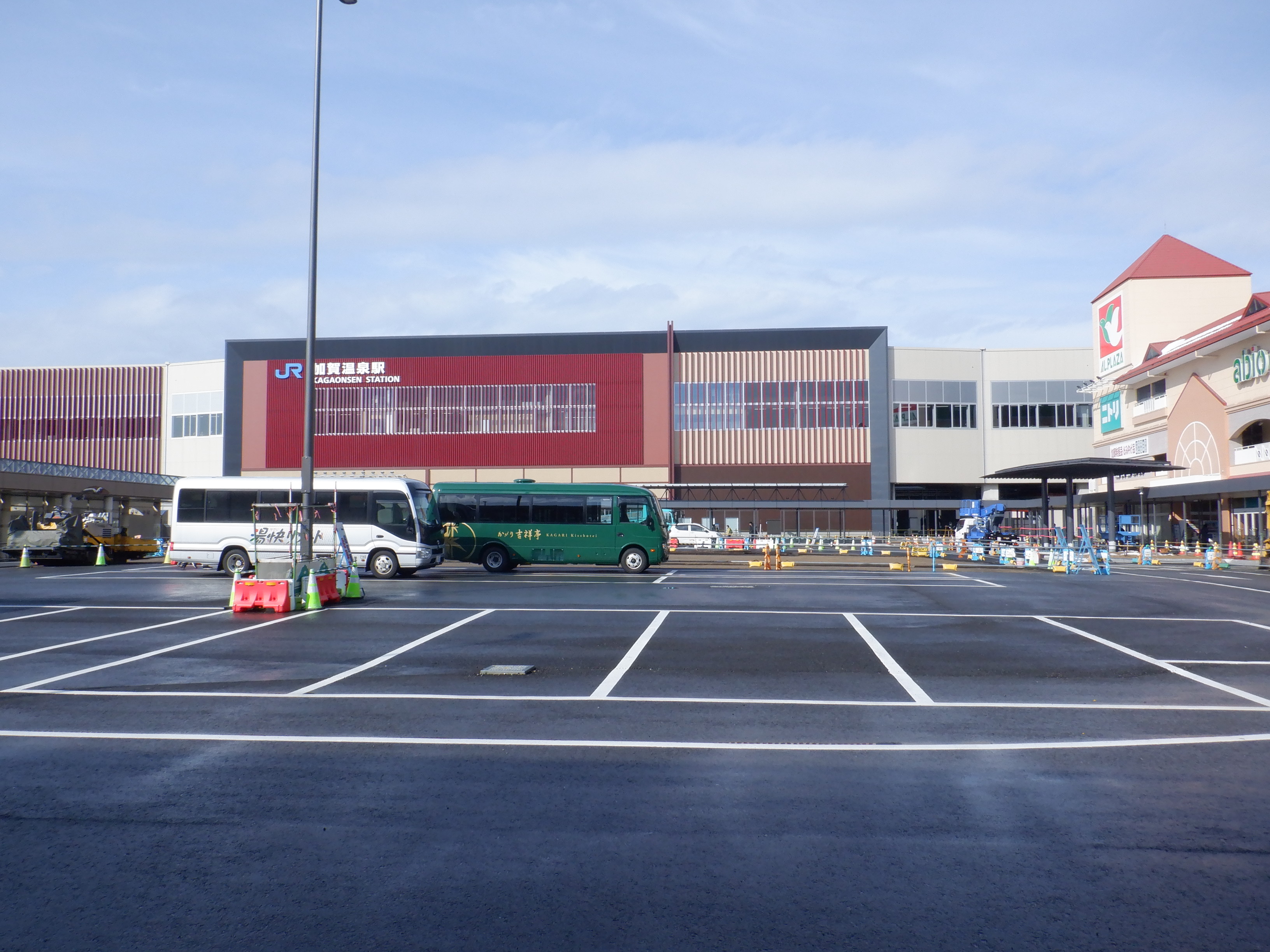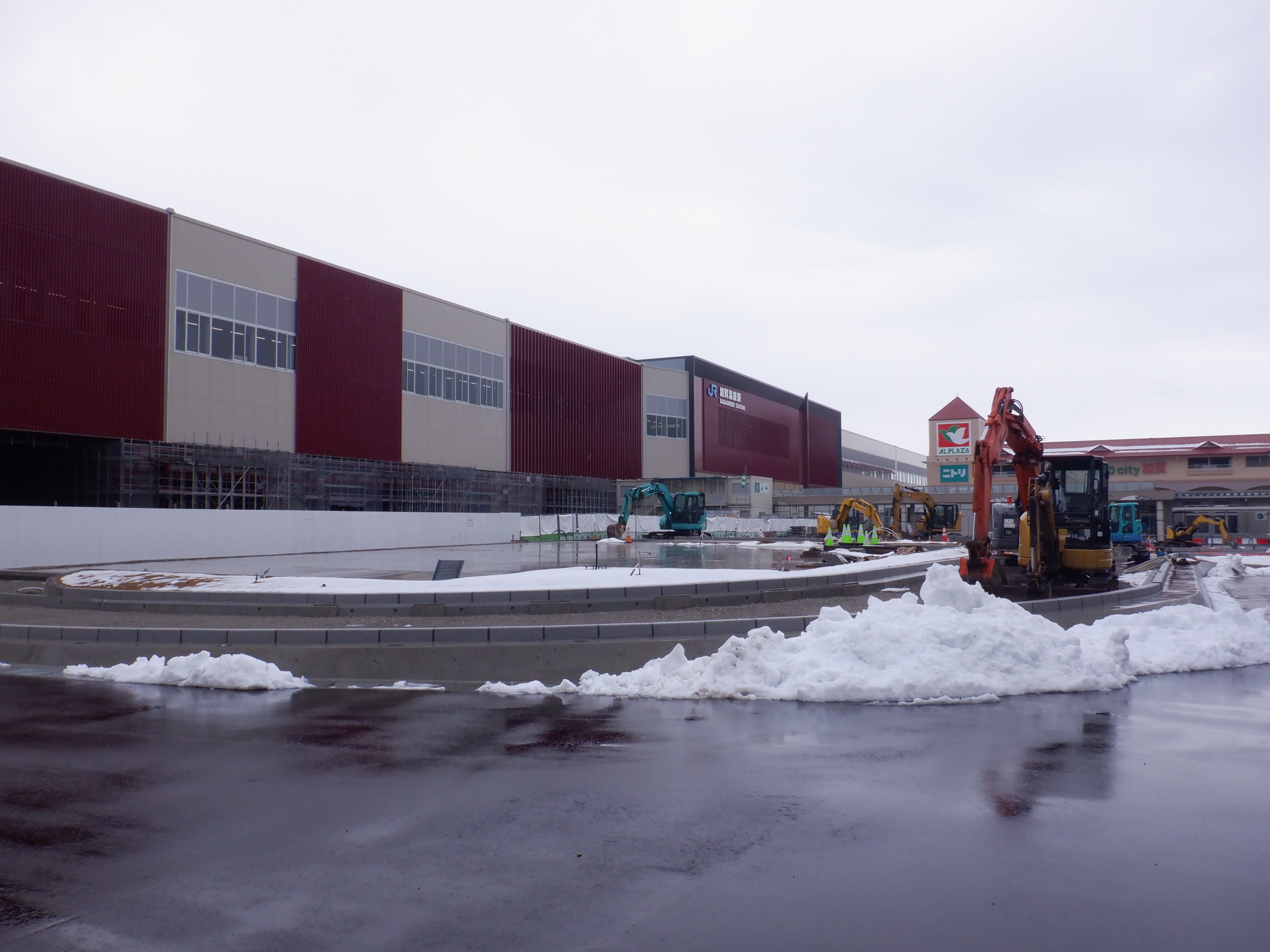 アルプラザ側から見た仮設駅舎等。