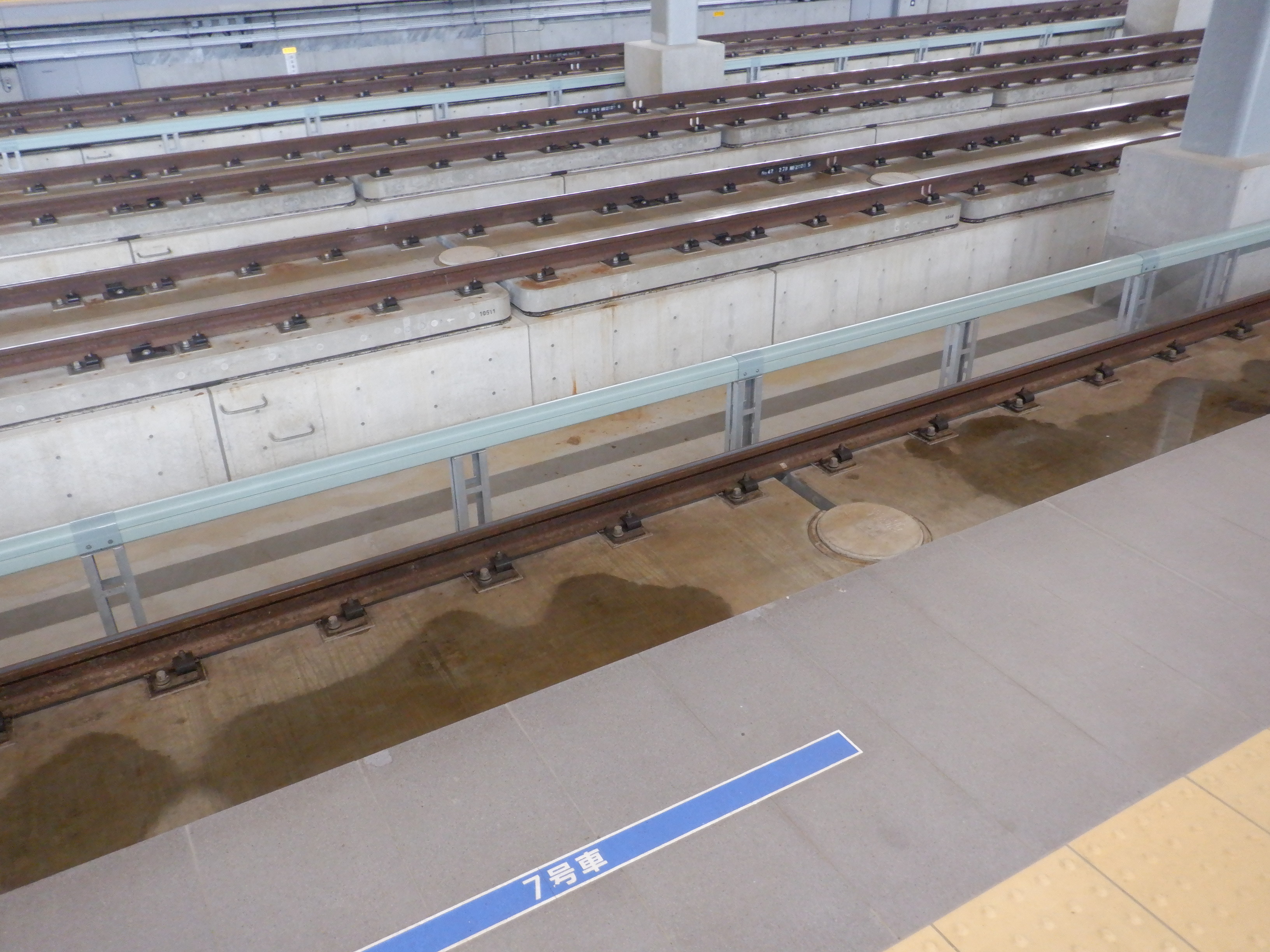 ホームドアの線路側、7号車の表示。
