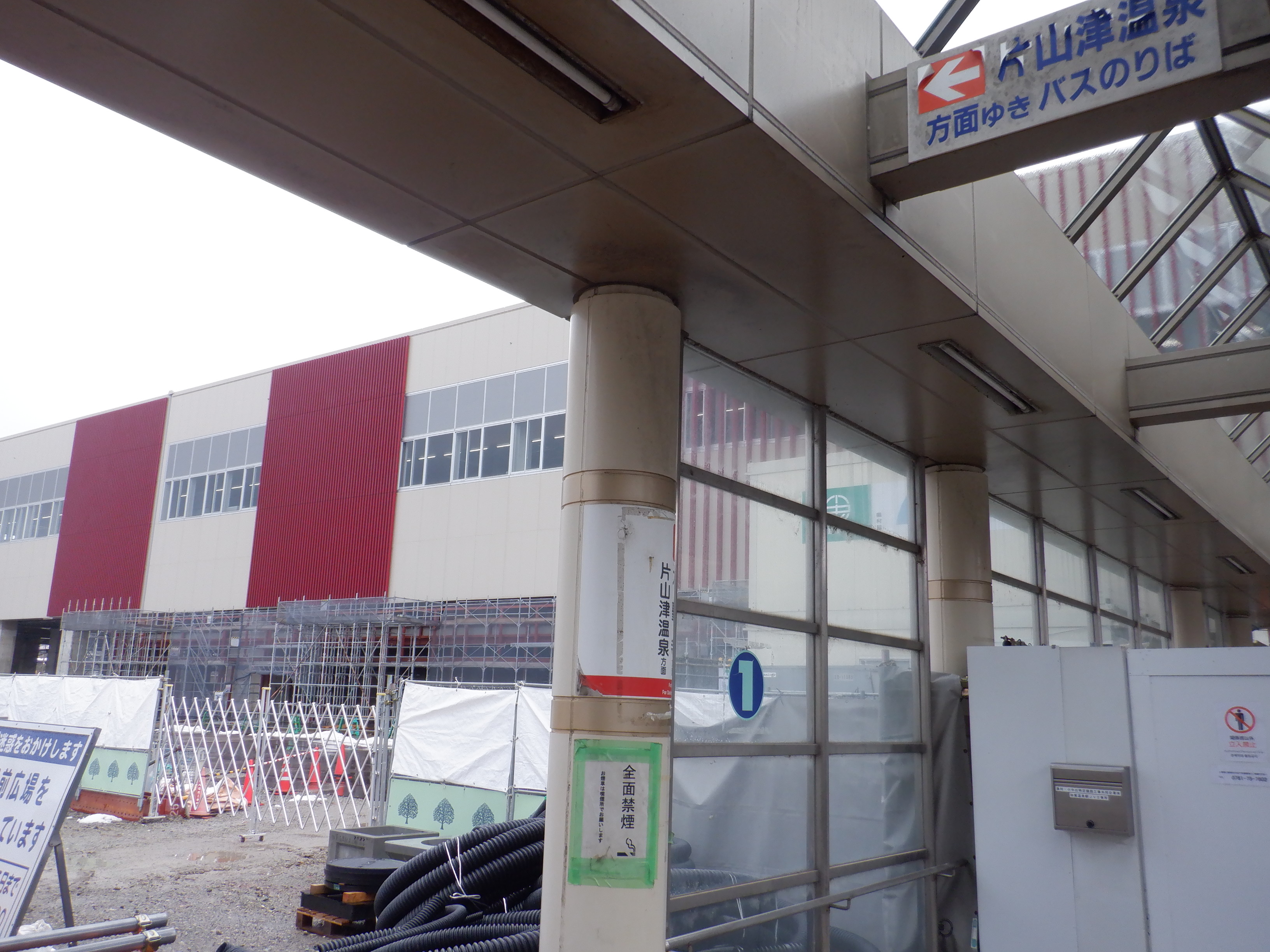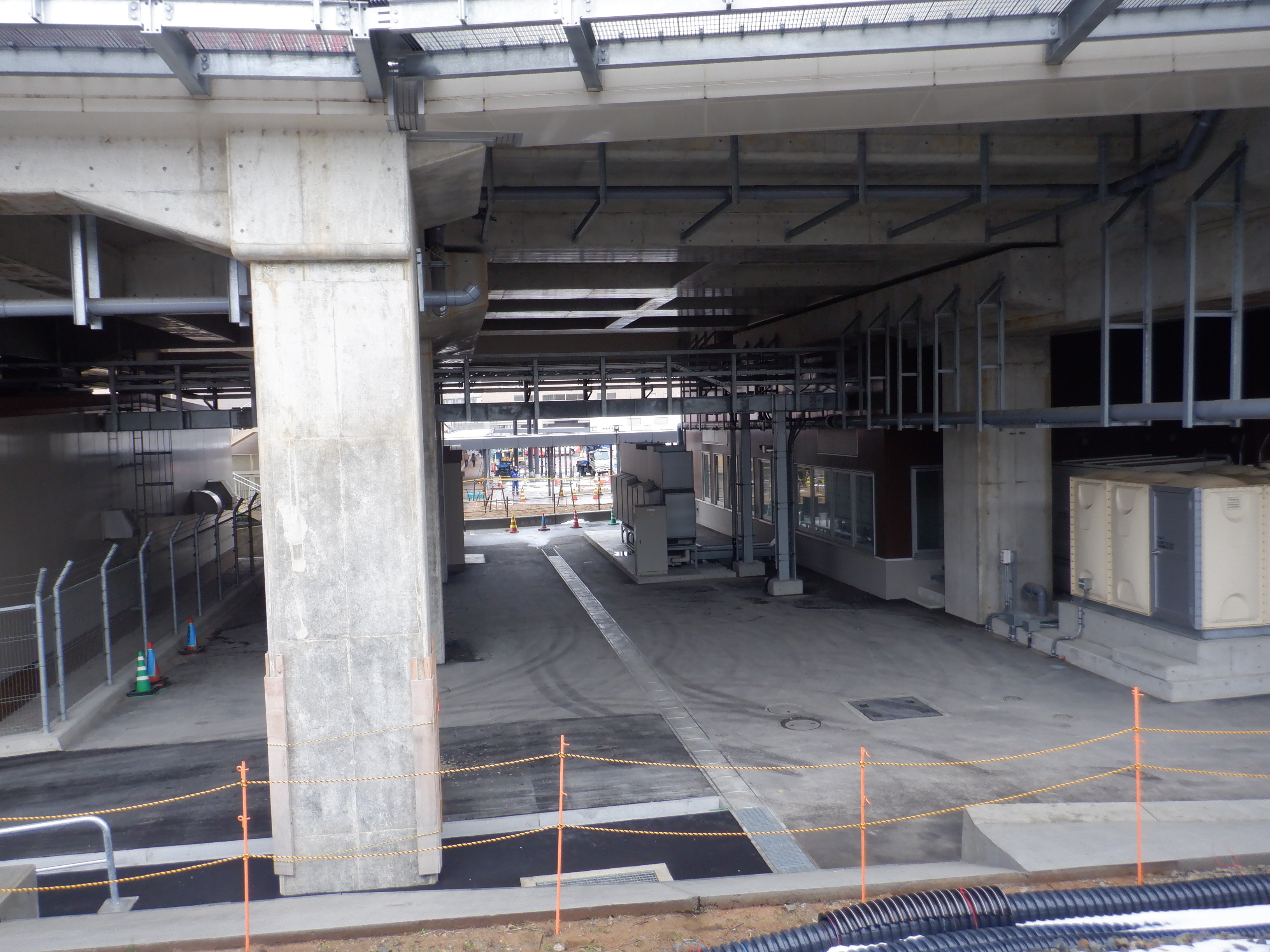1・2番のりばから見た高架下部都市施設(コンビニ・待合室等)建設中の様子。