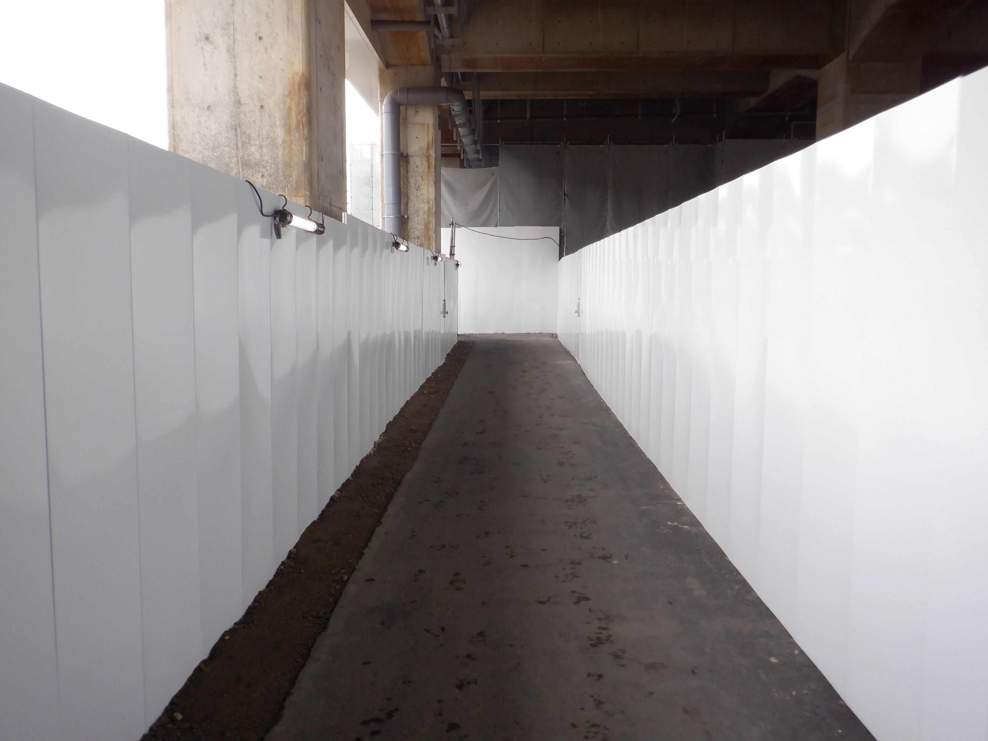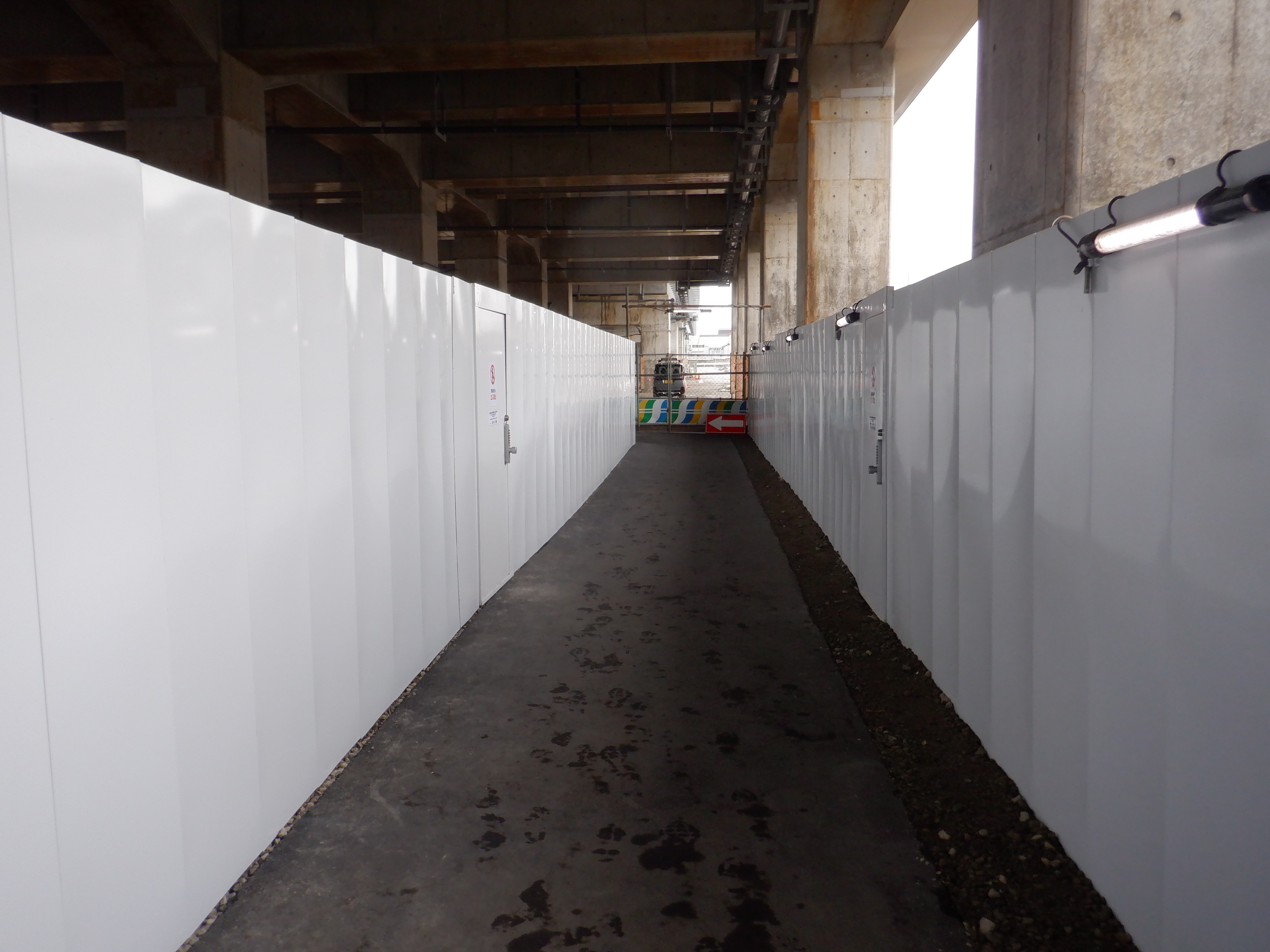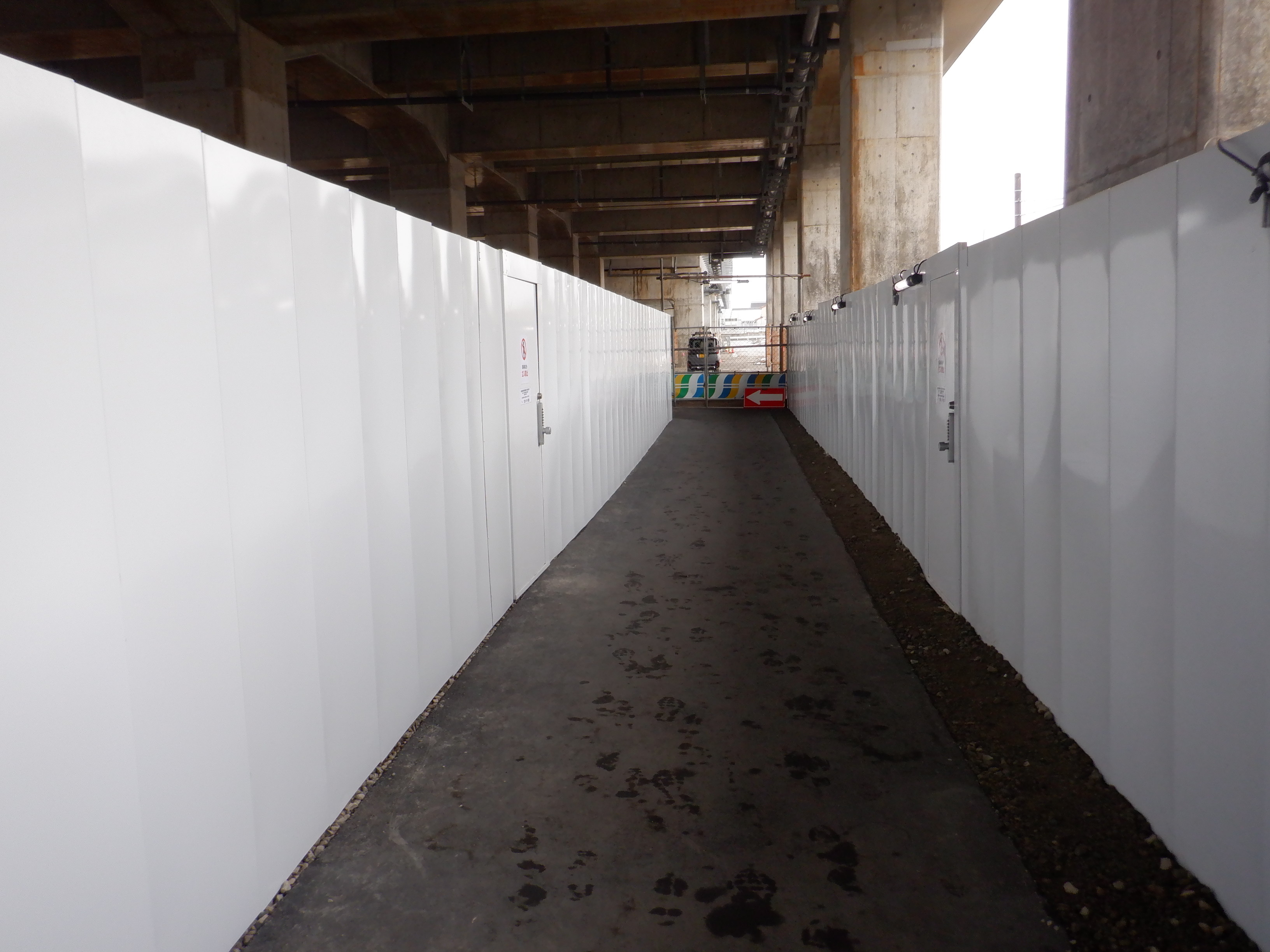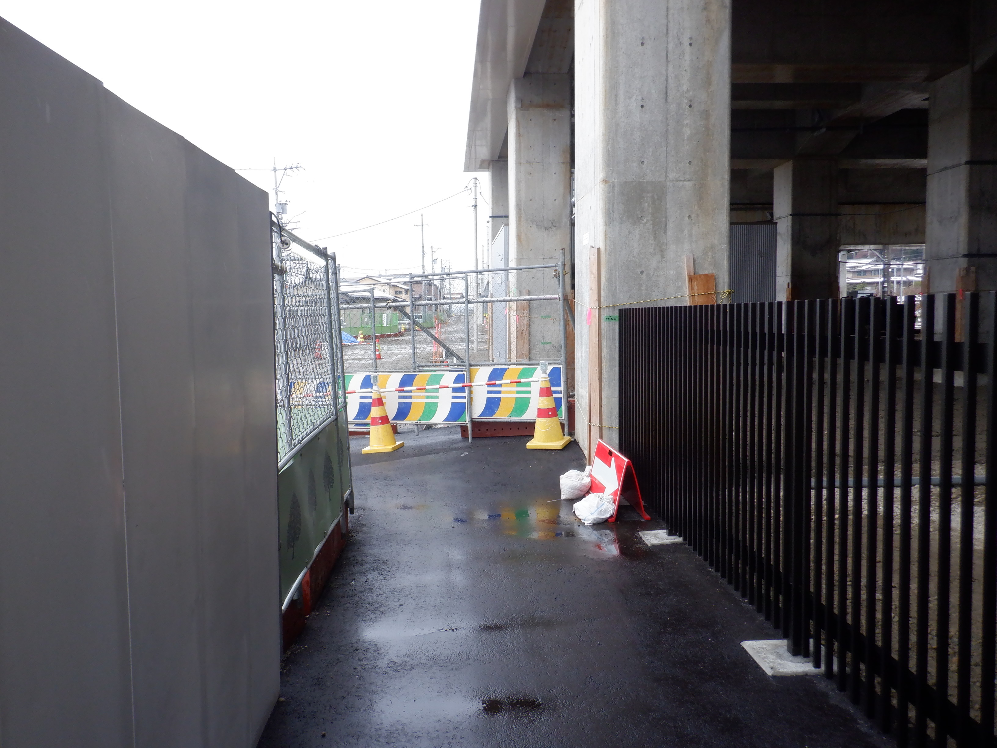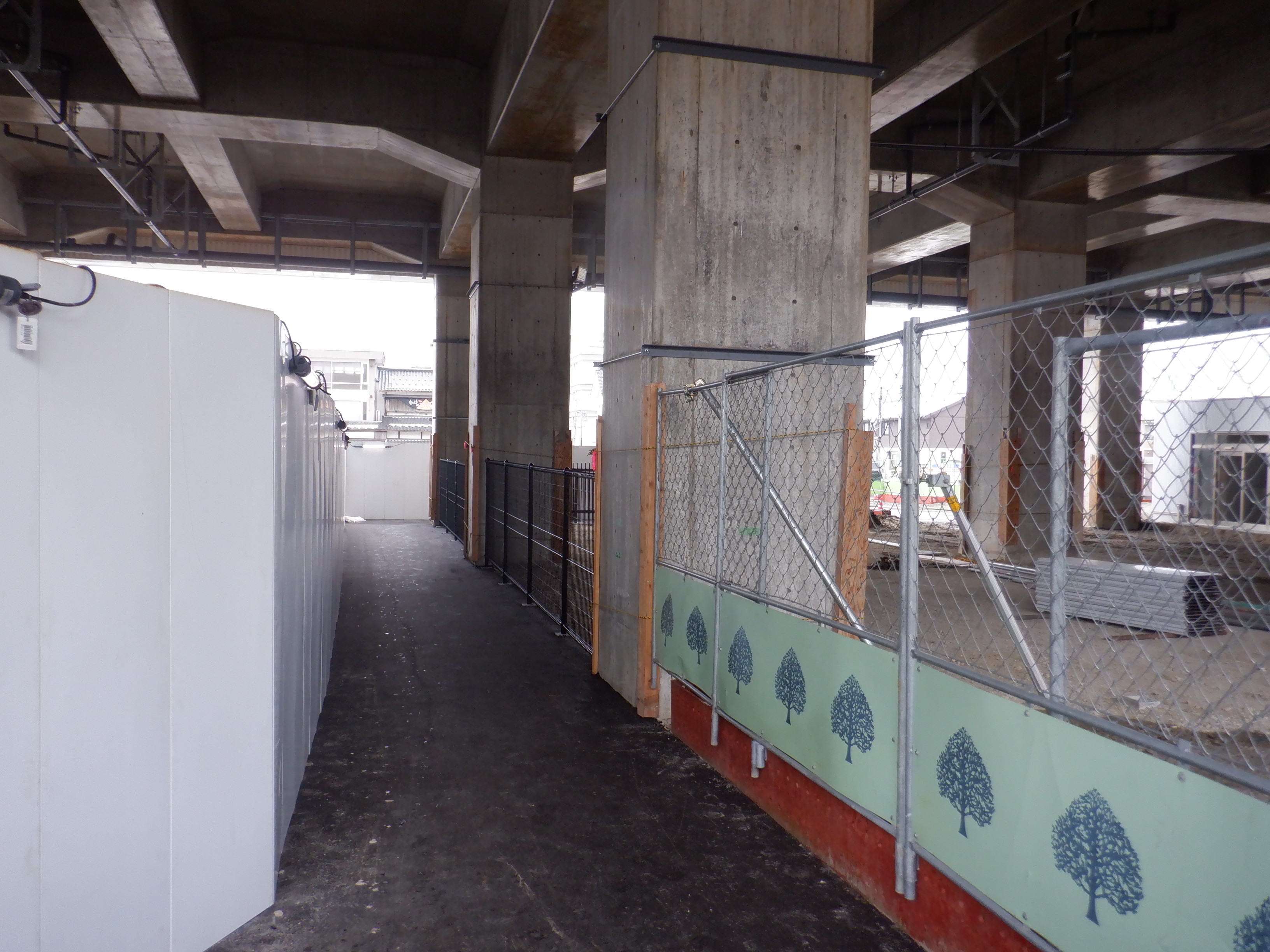 北口への迂回通路から見た高架下部都市施設(コンビニ・待合室等)建設中の様子。