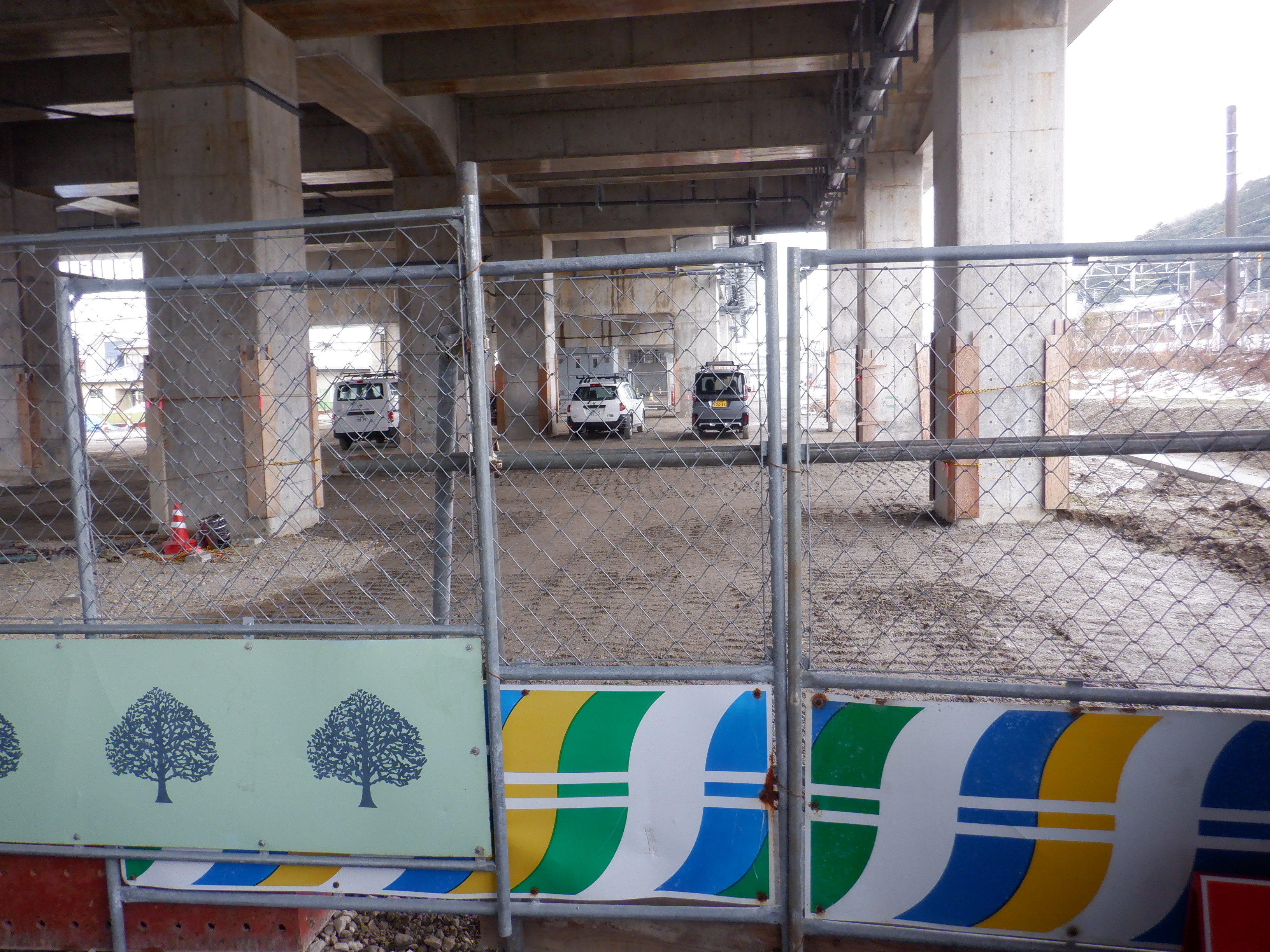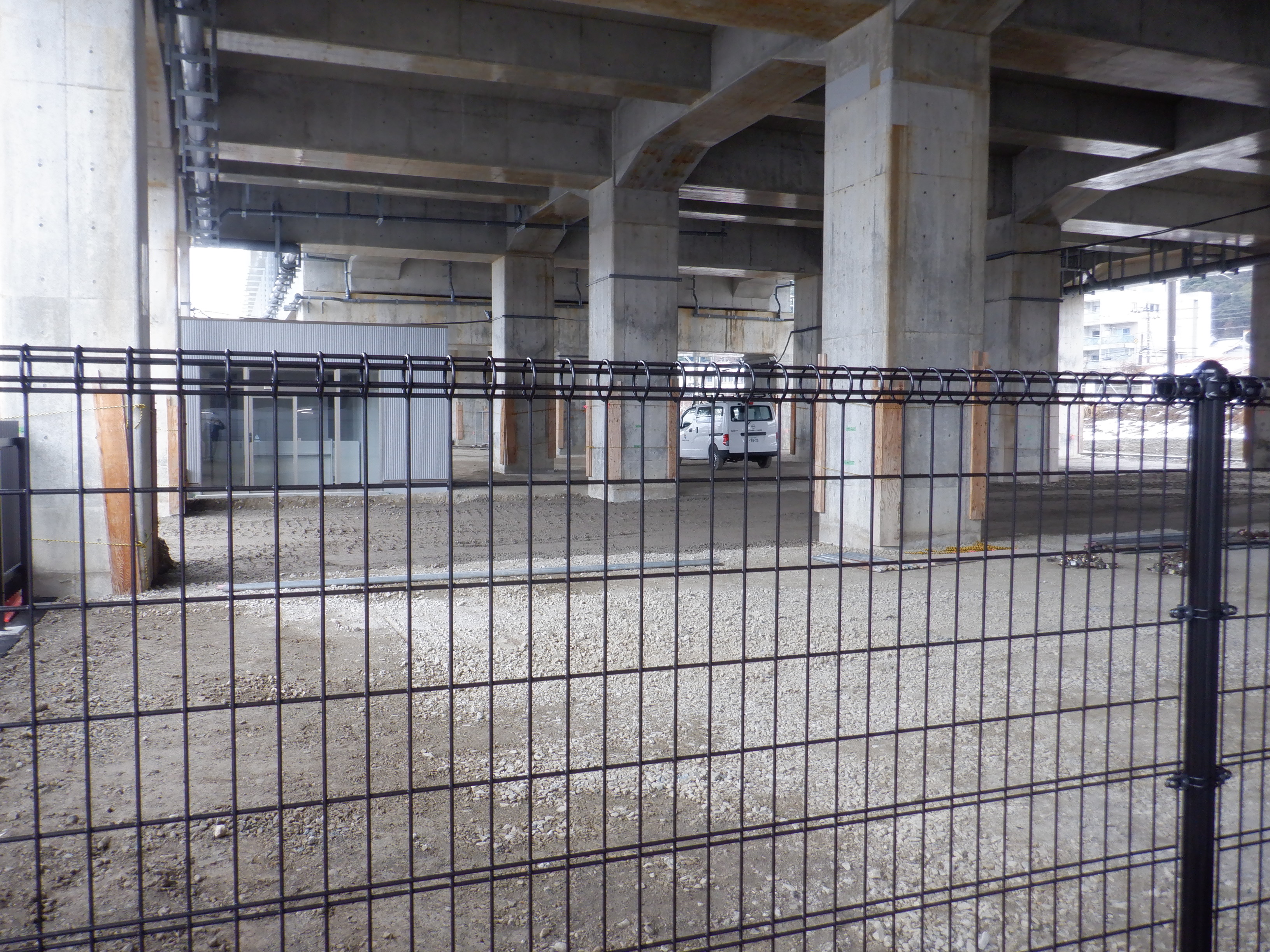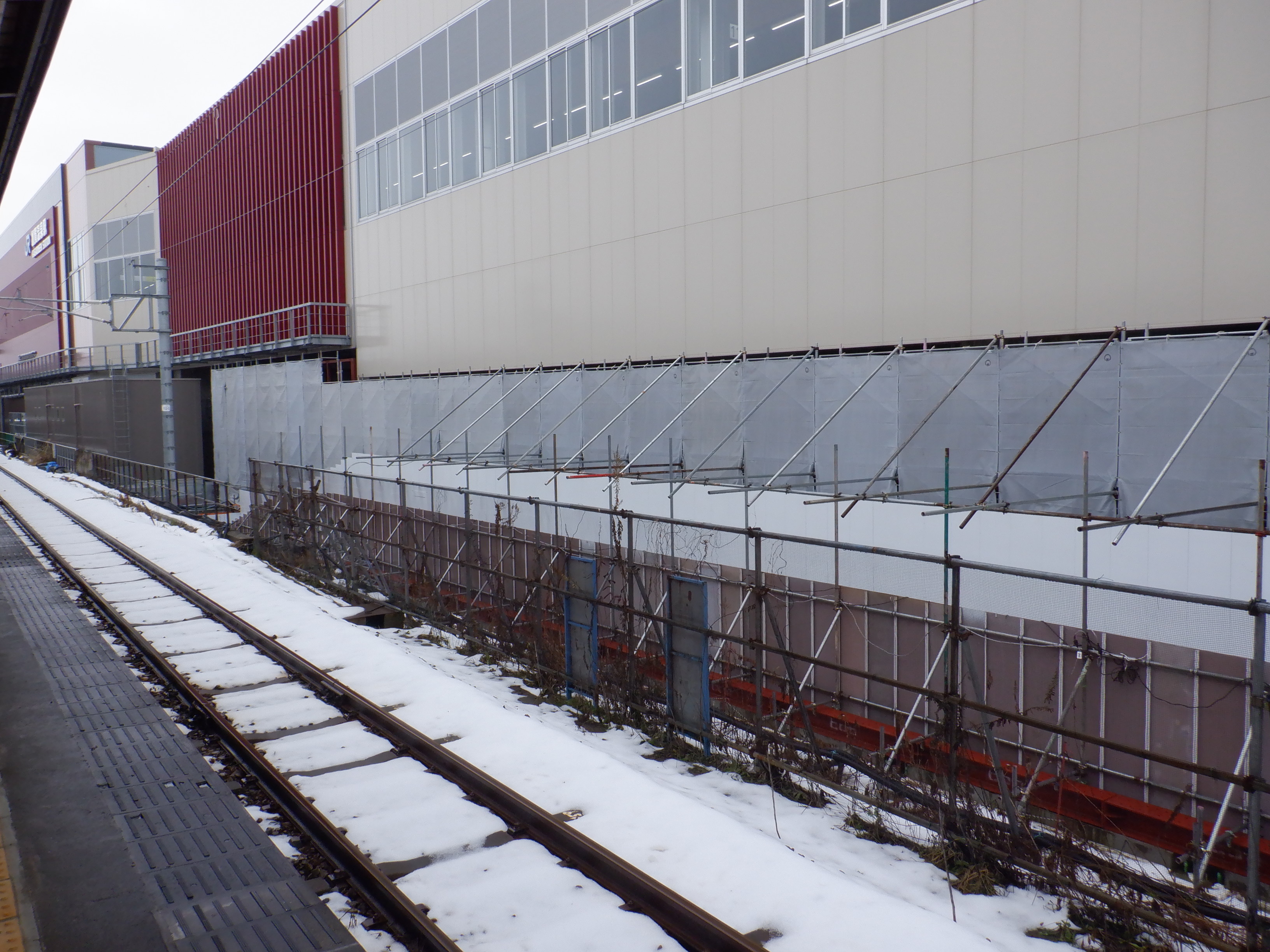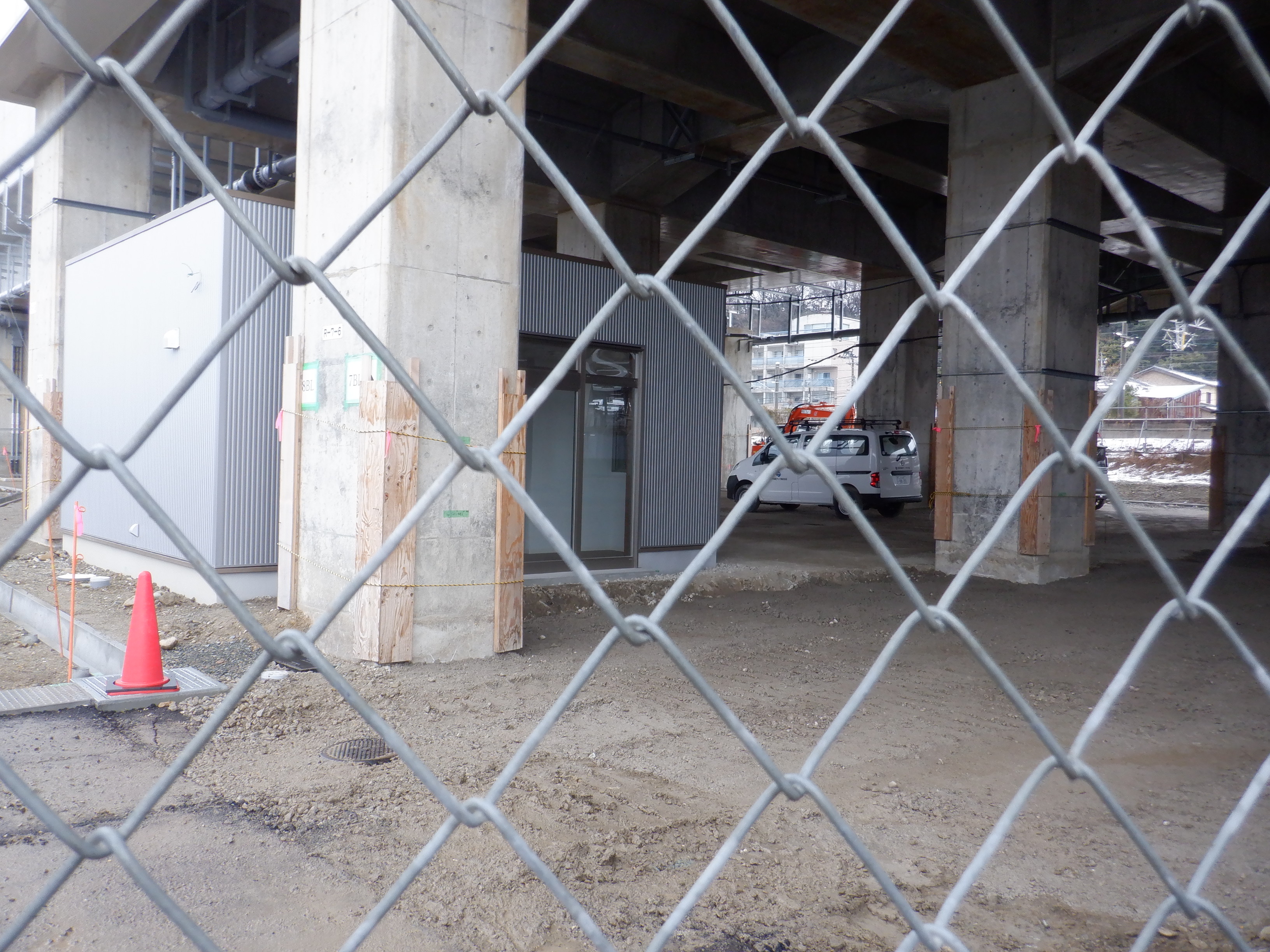 北口への迂回通路から見た高架下部都市施設(コンビニ・待合室等)建設中の様子。
