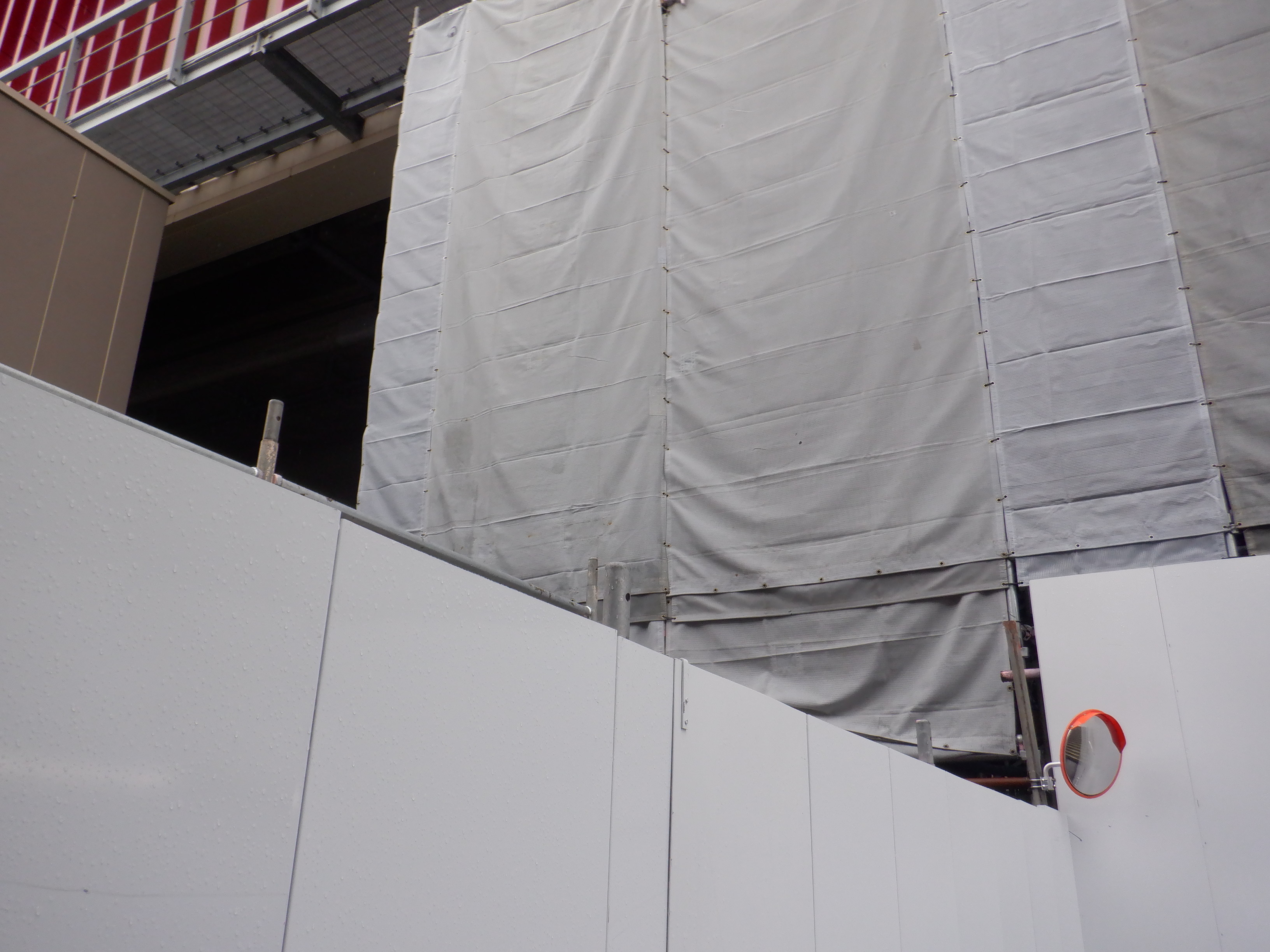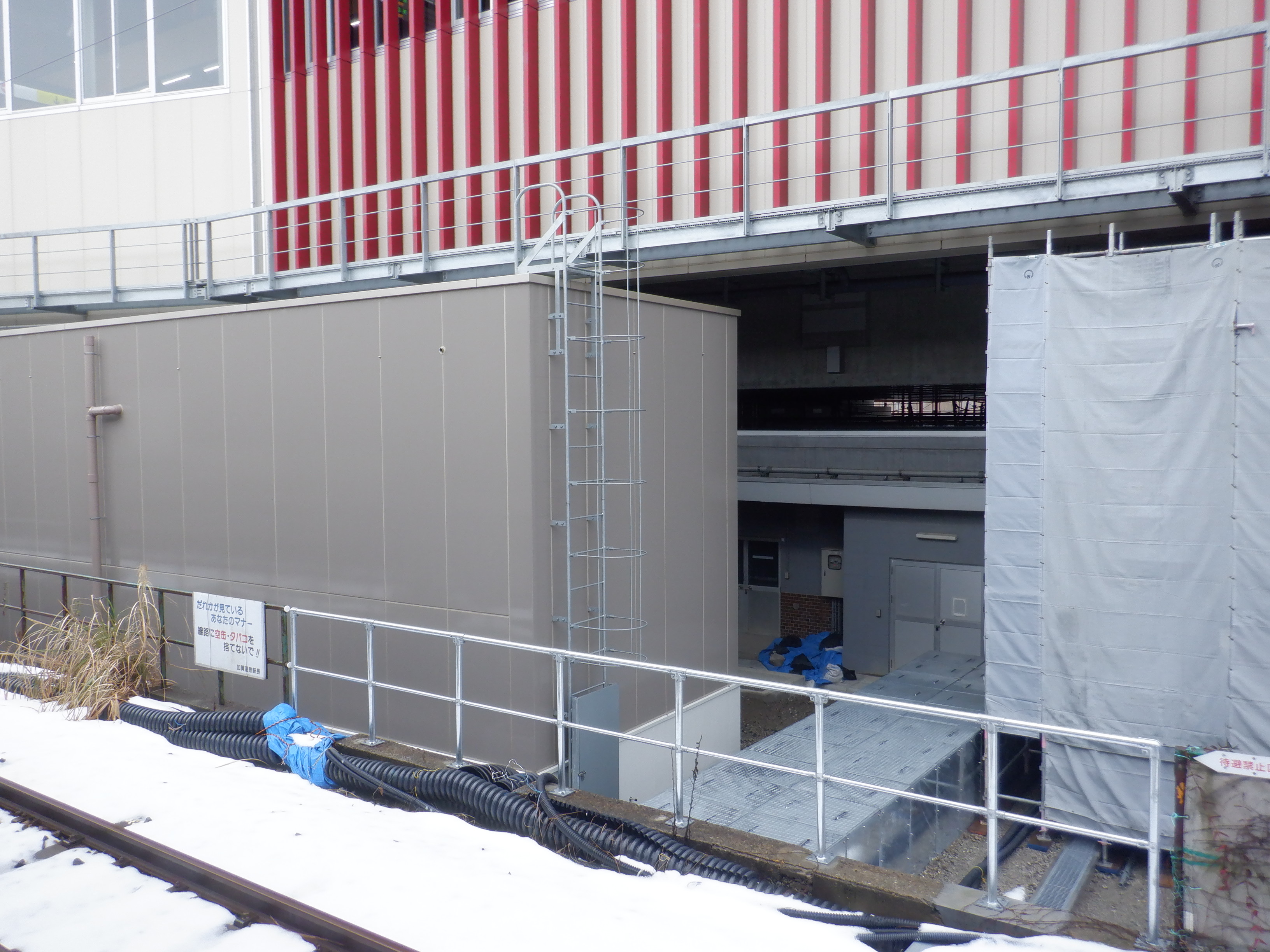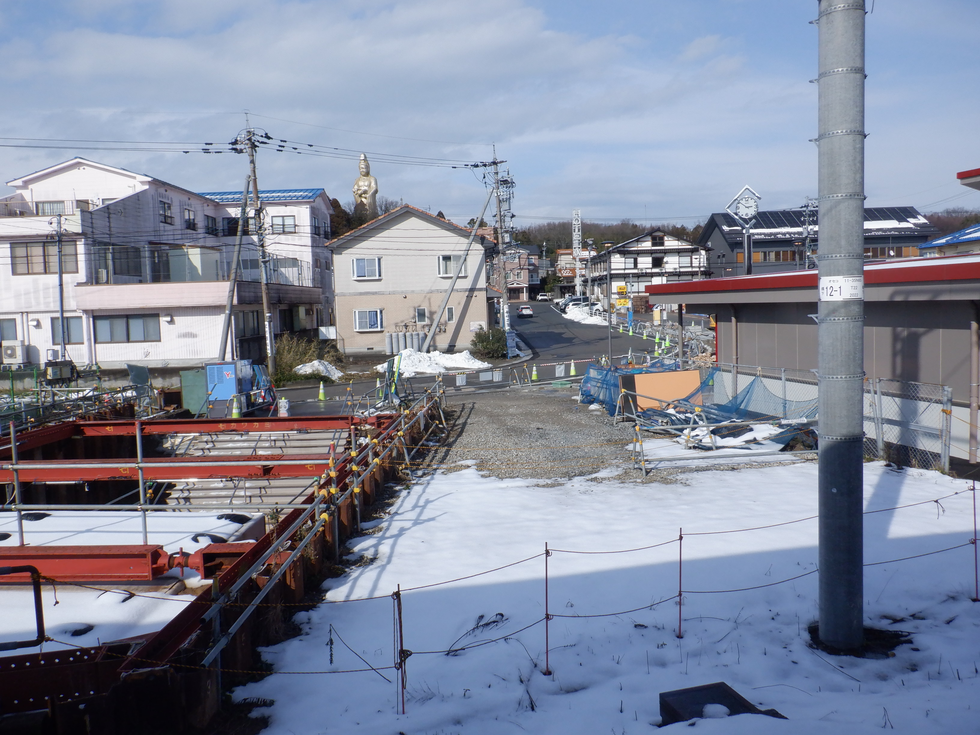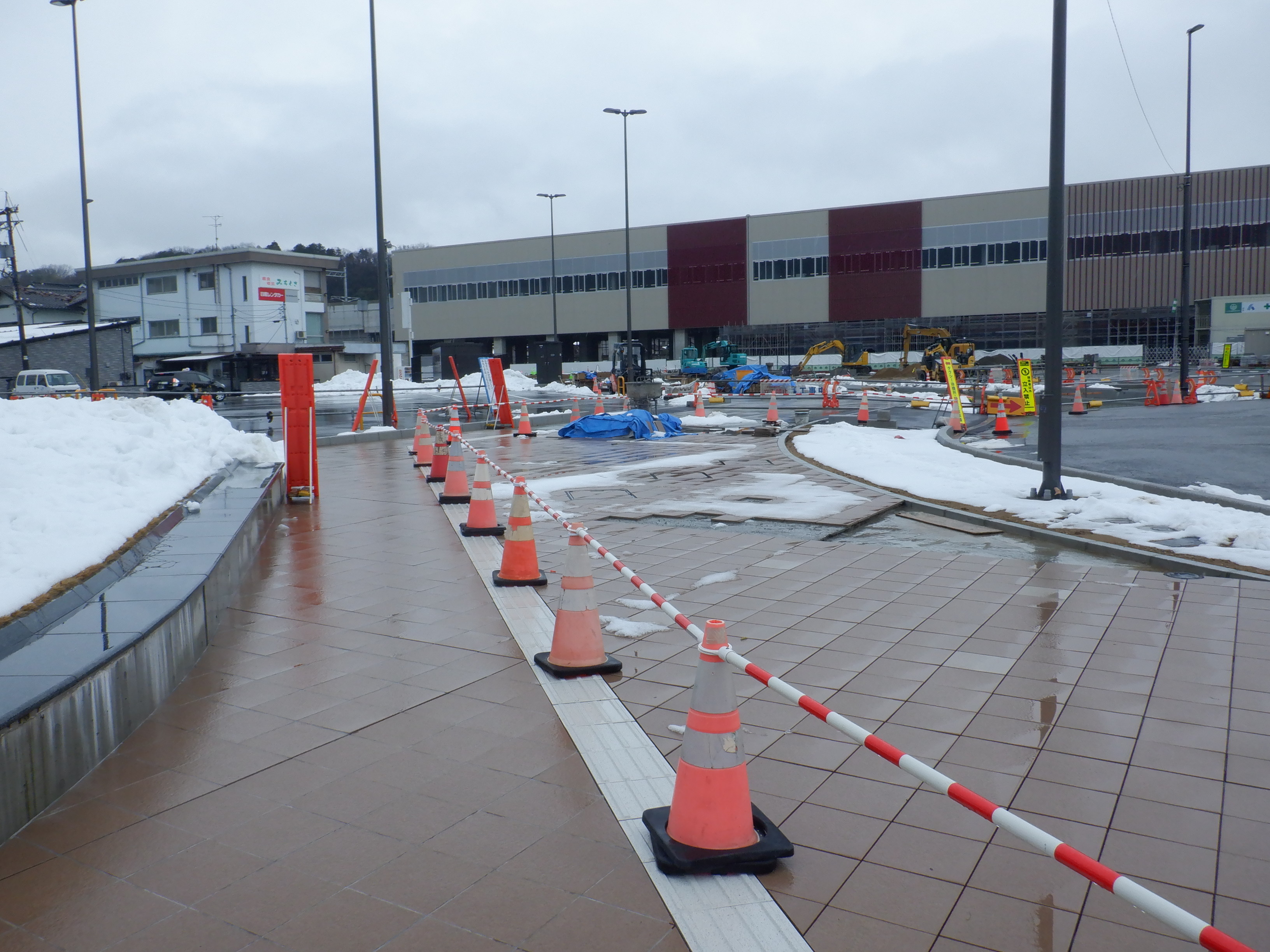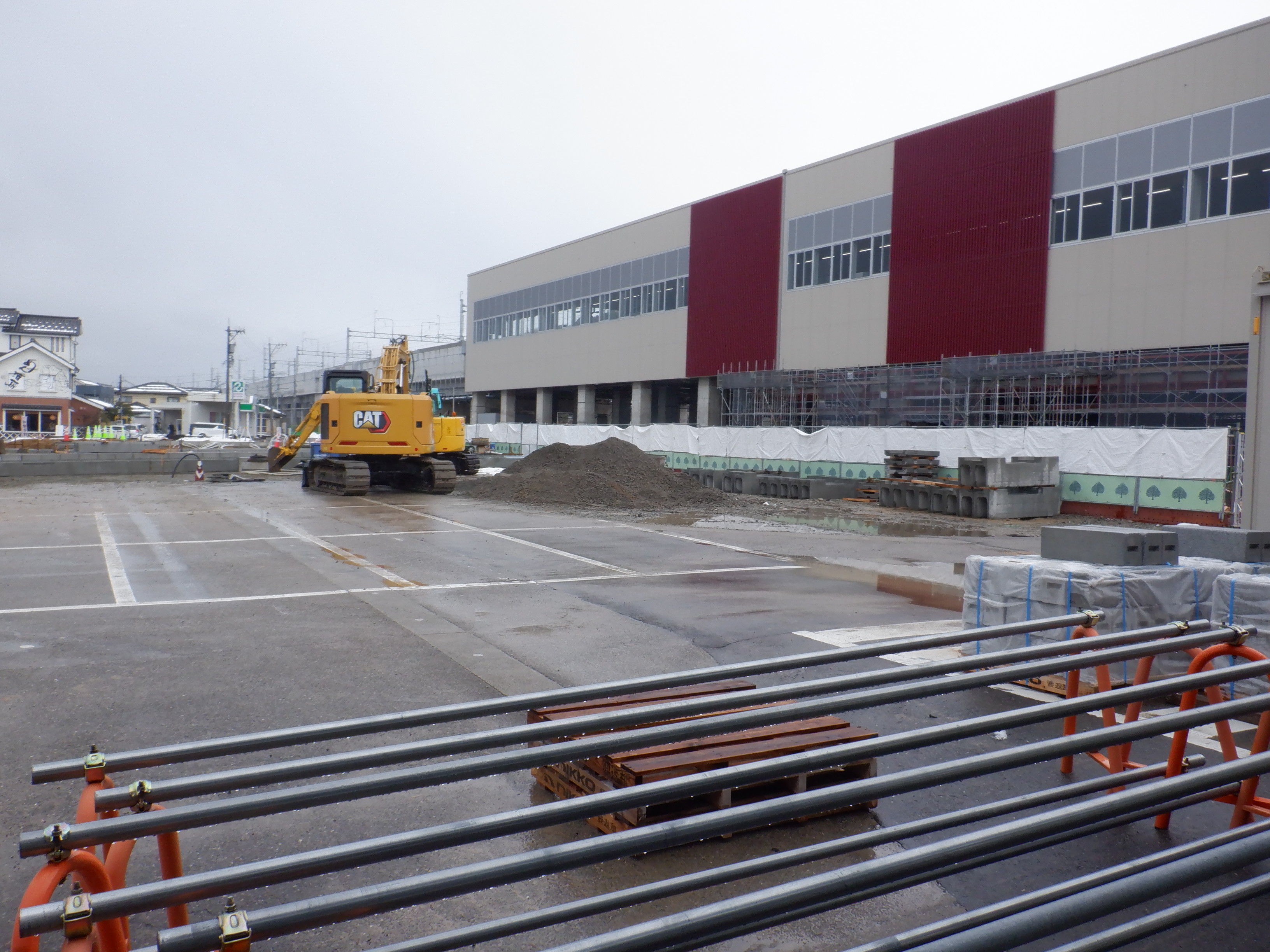 北口への迂回通路から見た高架下部都市施設(コンビニ・待合室等)建設中の様子。