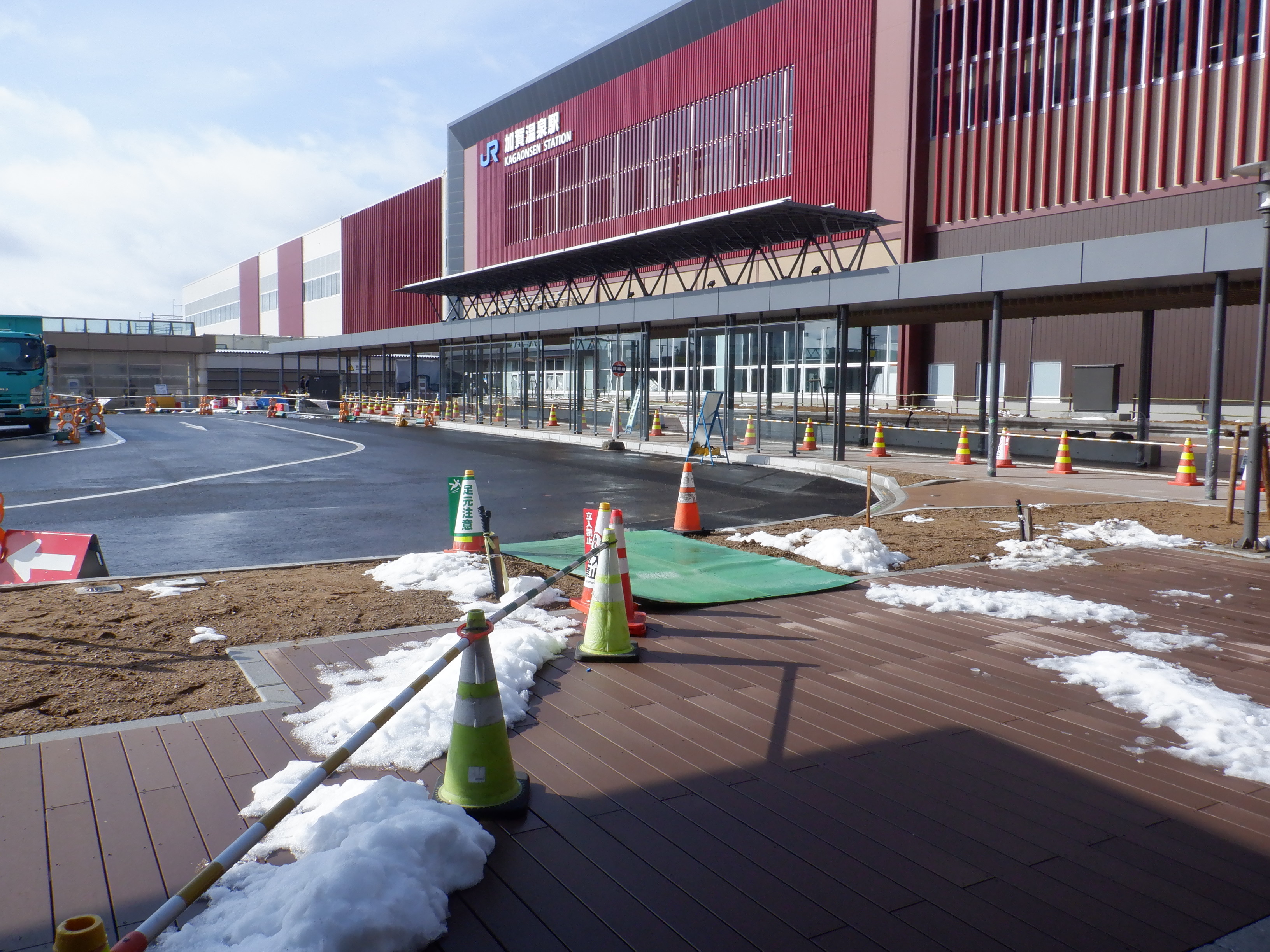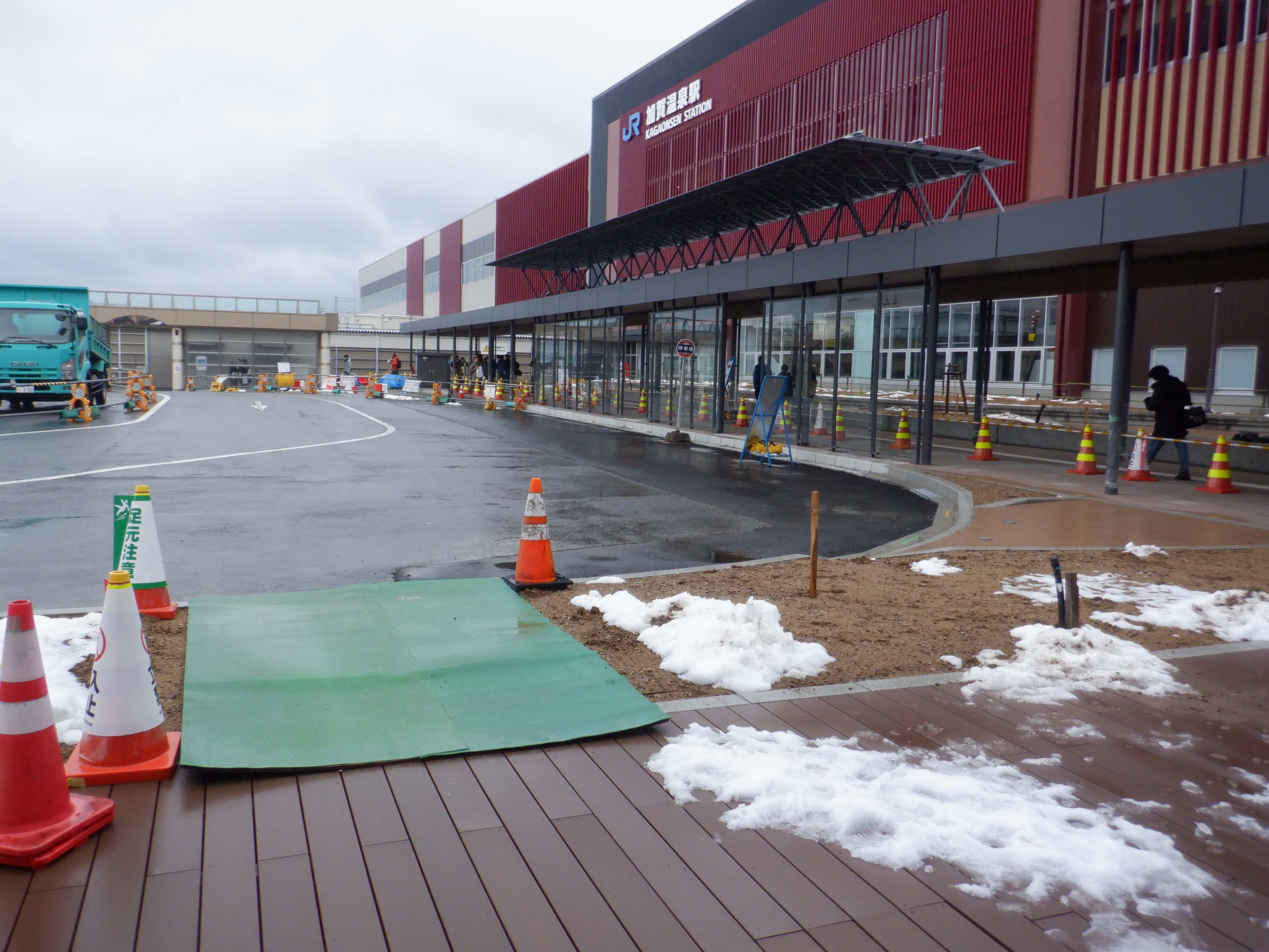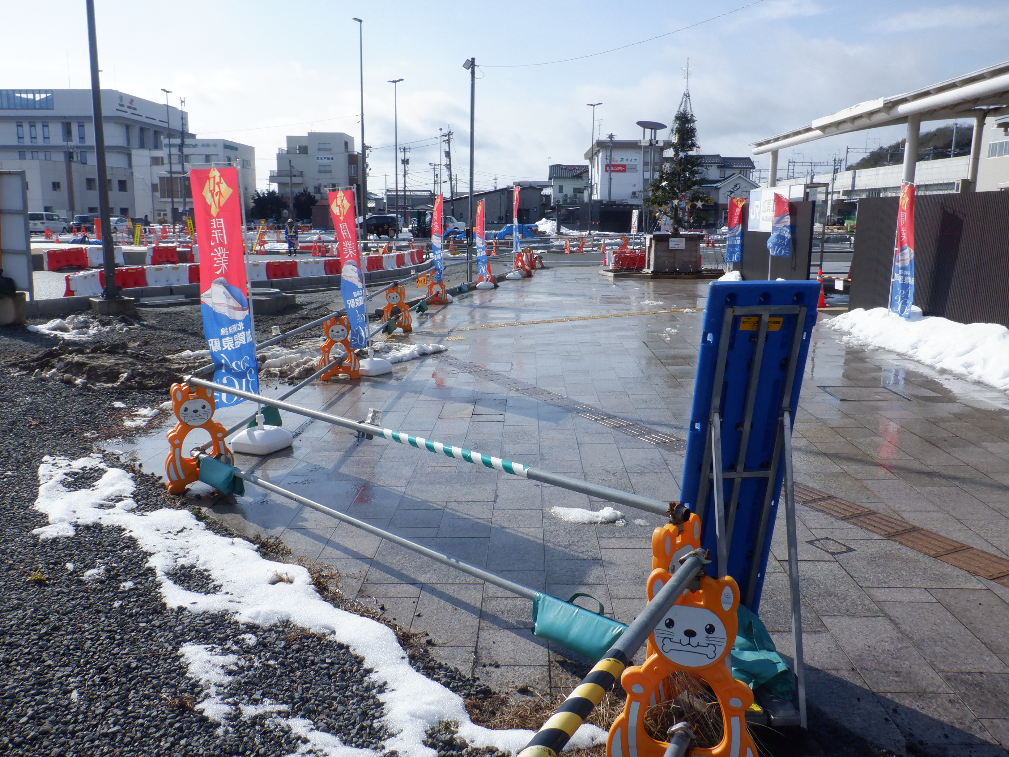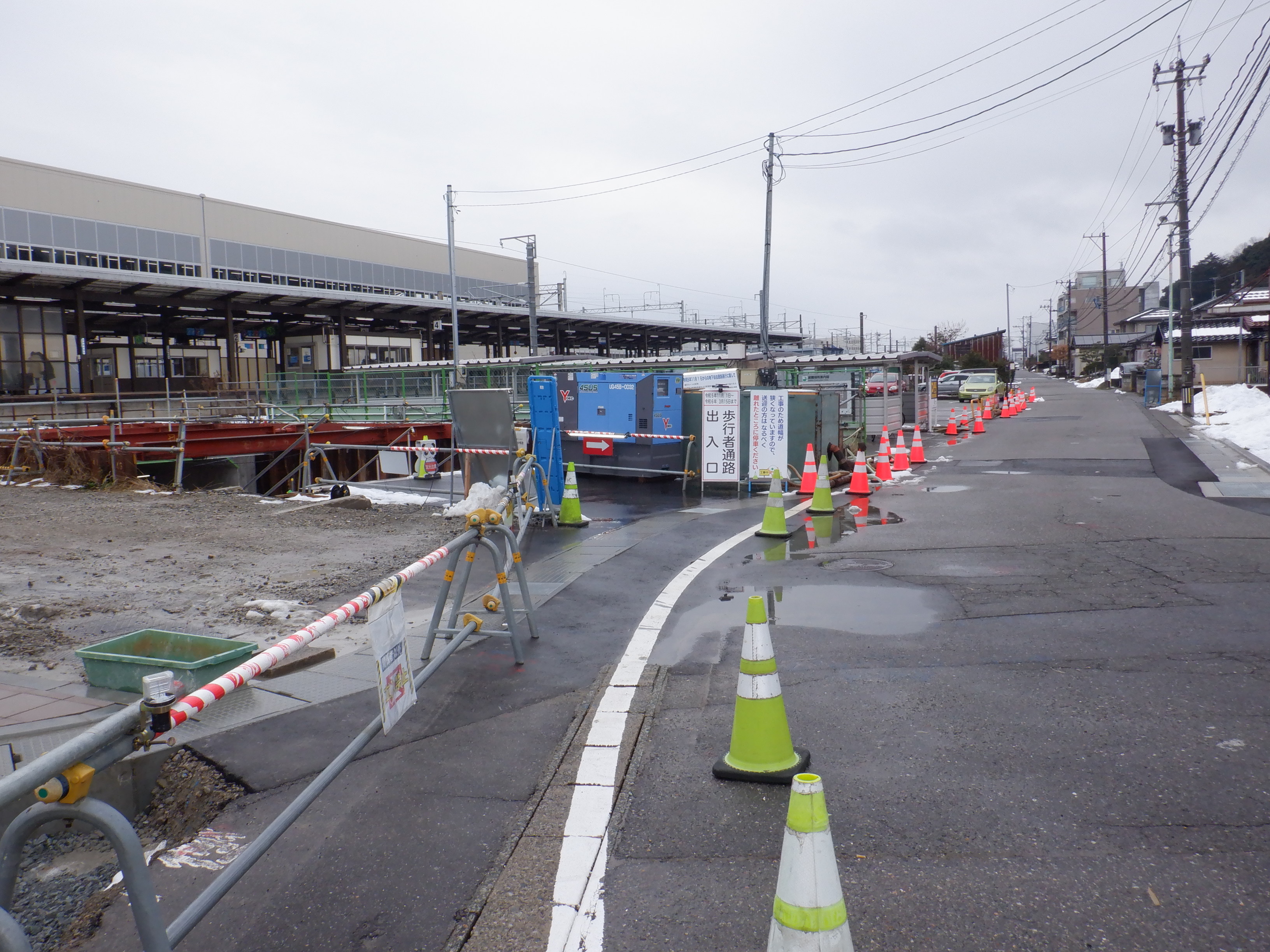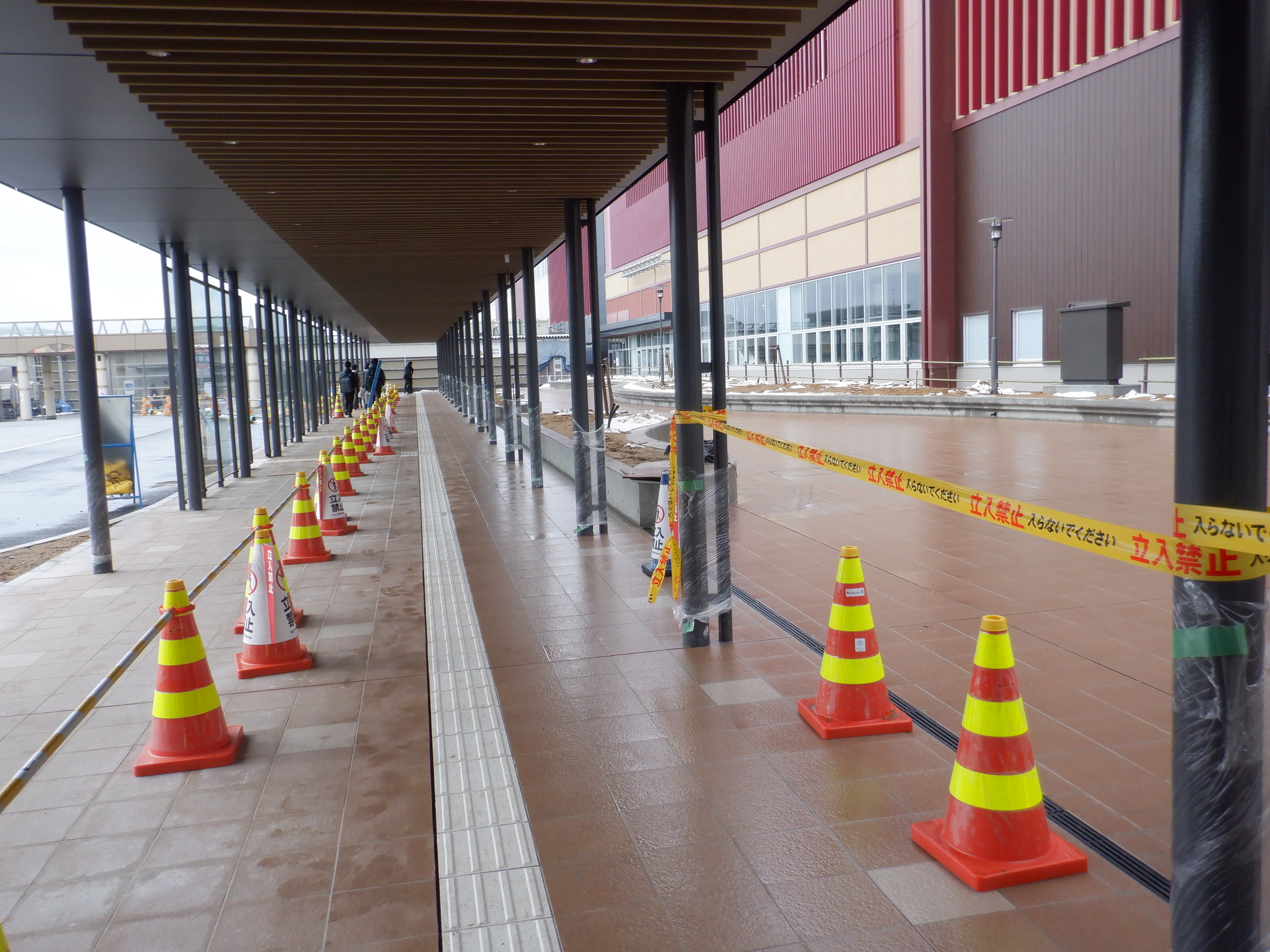 仮設駅舎とアルプラザの間。今回は歩道の下ではなく歩道の上が通路となりました。