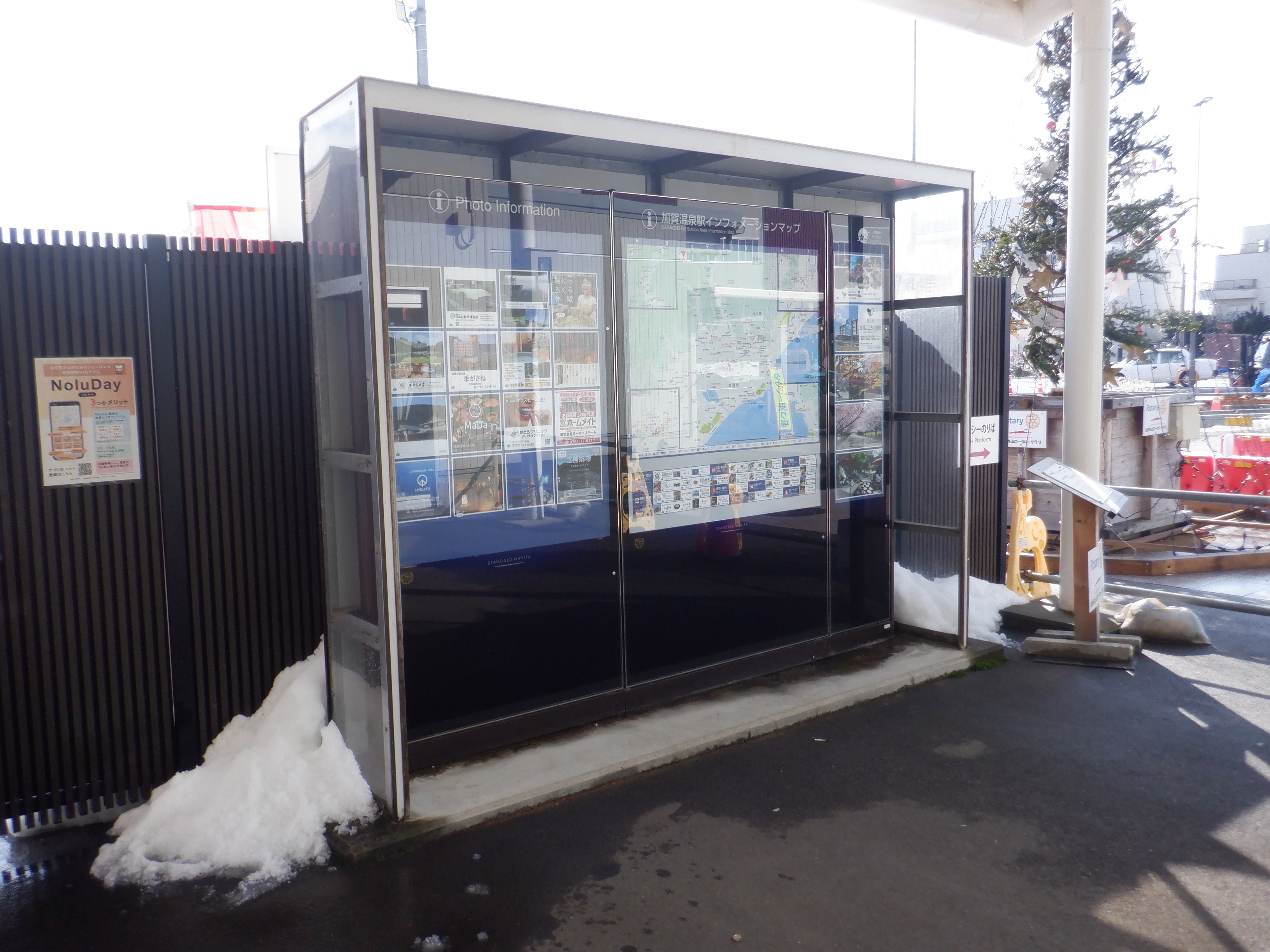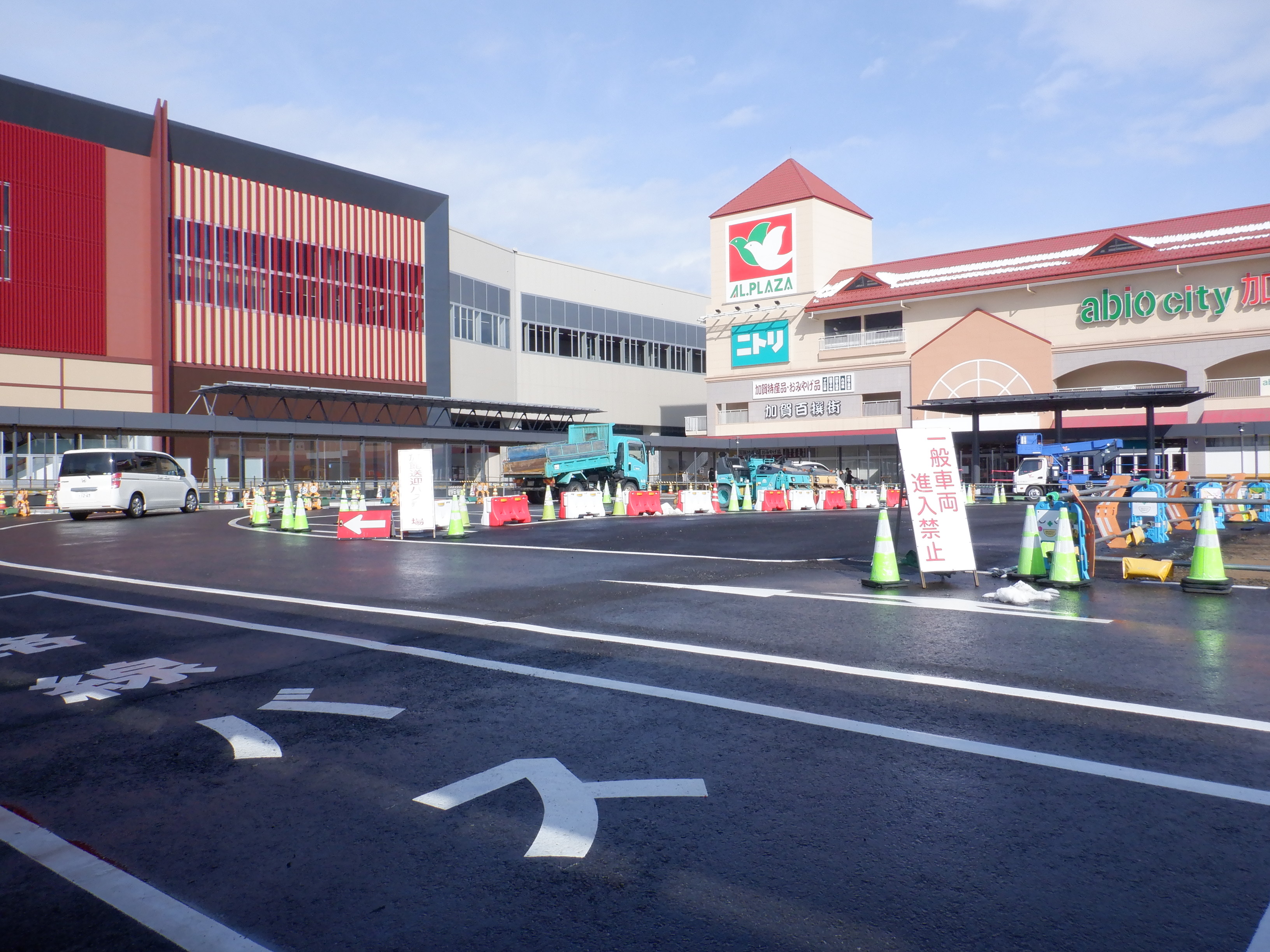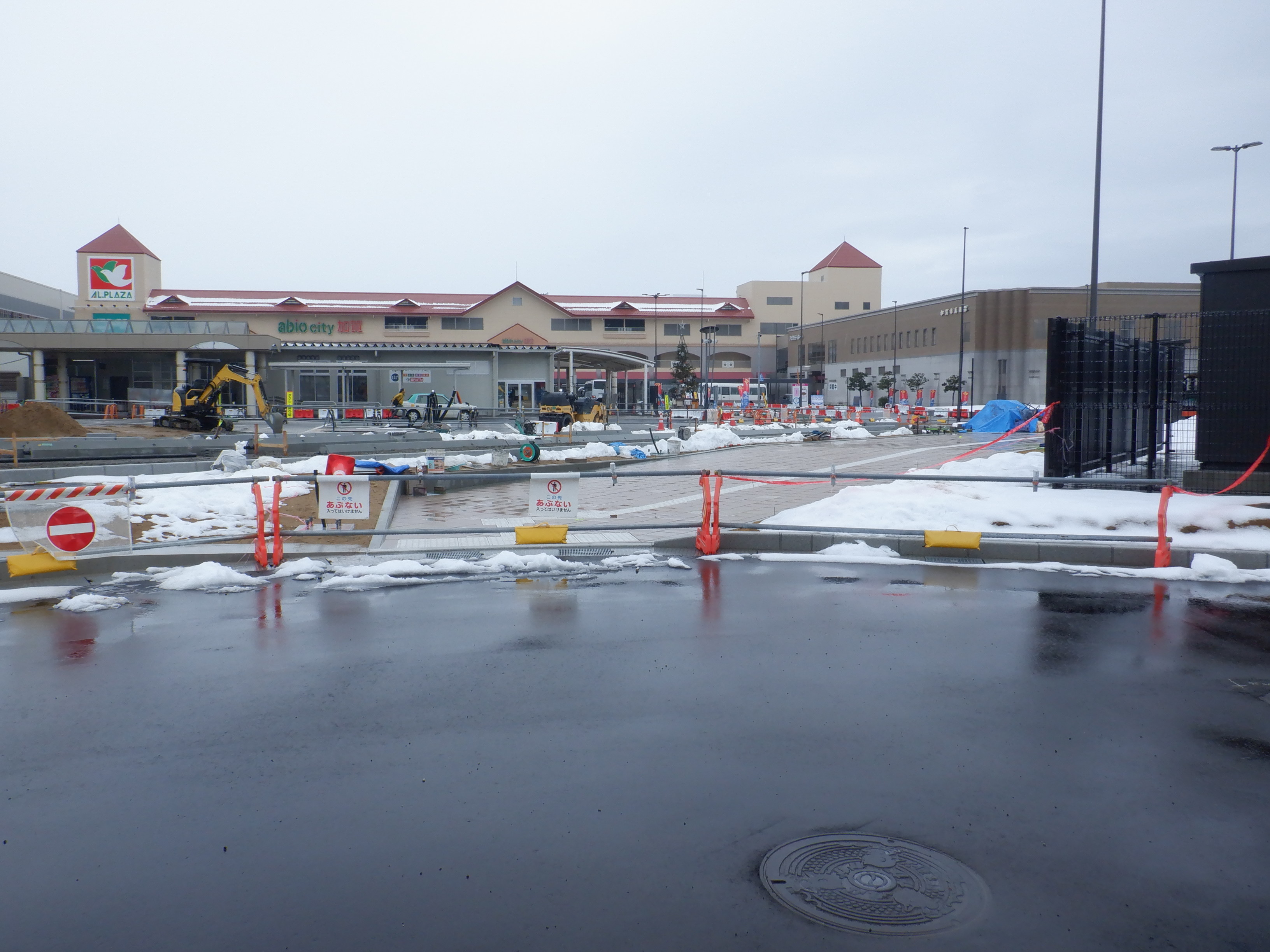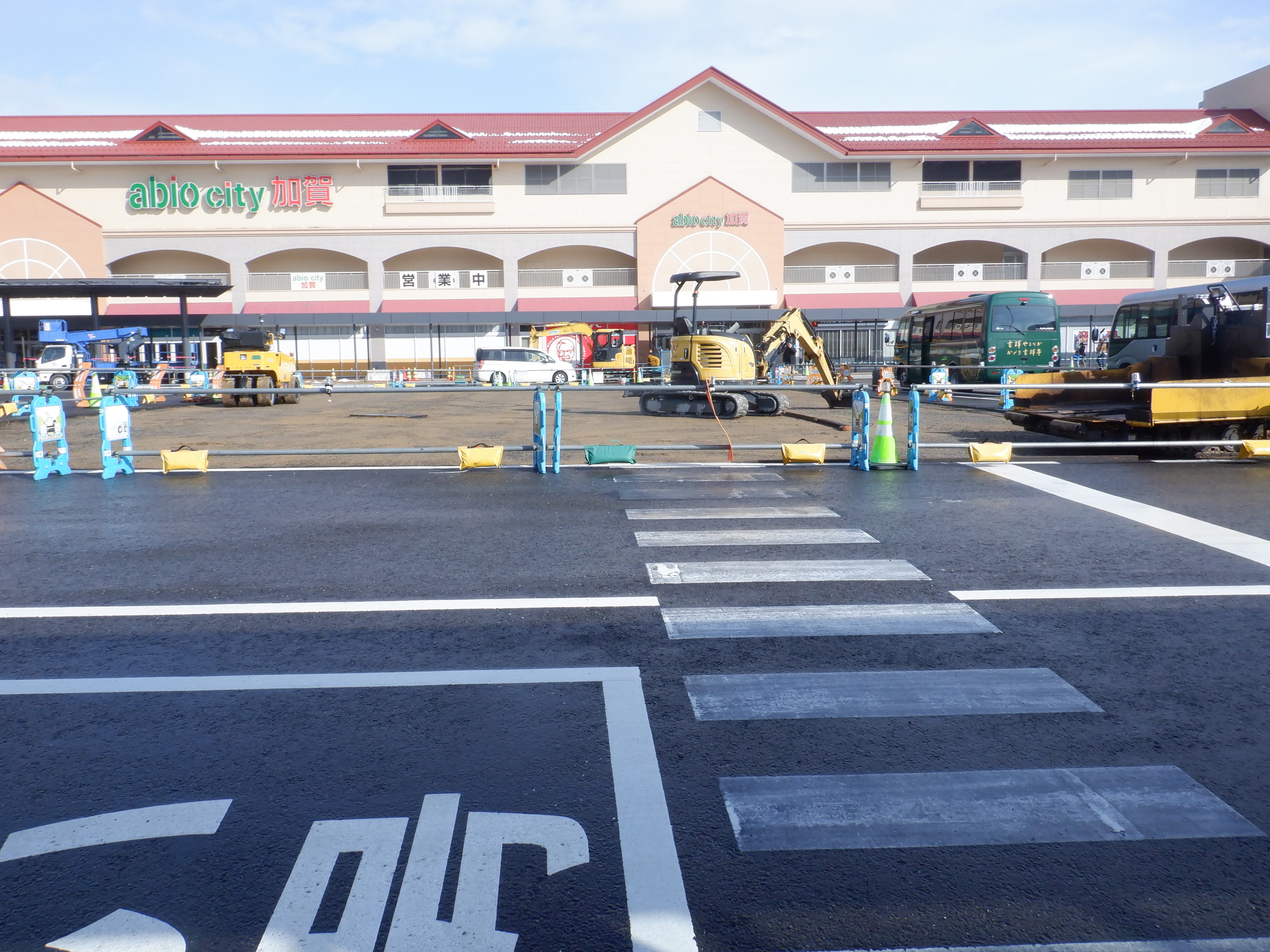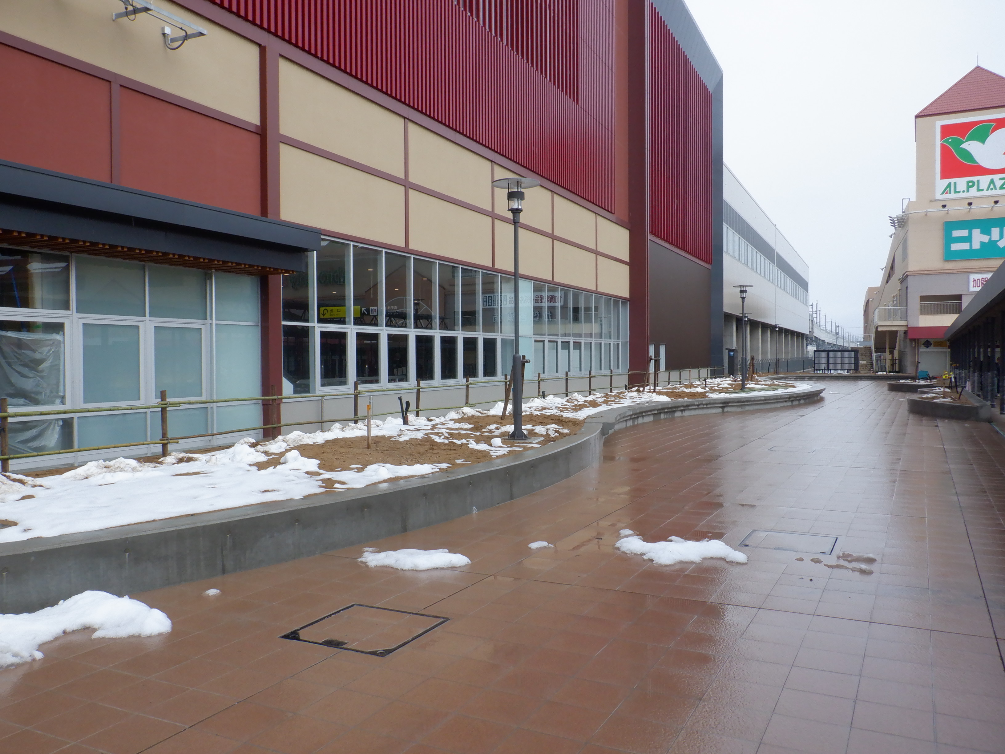 仮設駅舎とアルプラザの間。今回は歩道の下ではなく歩道の上が通路となりました。