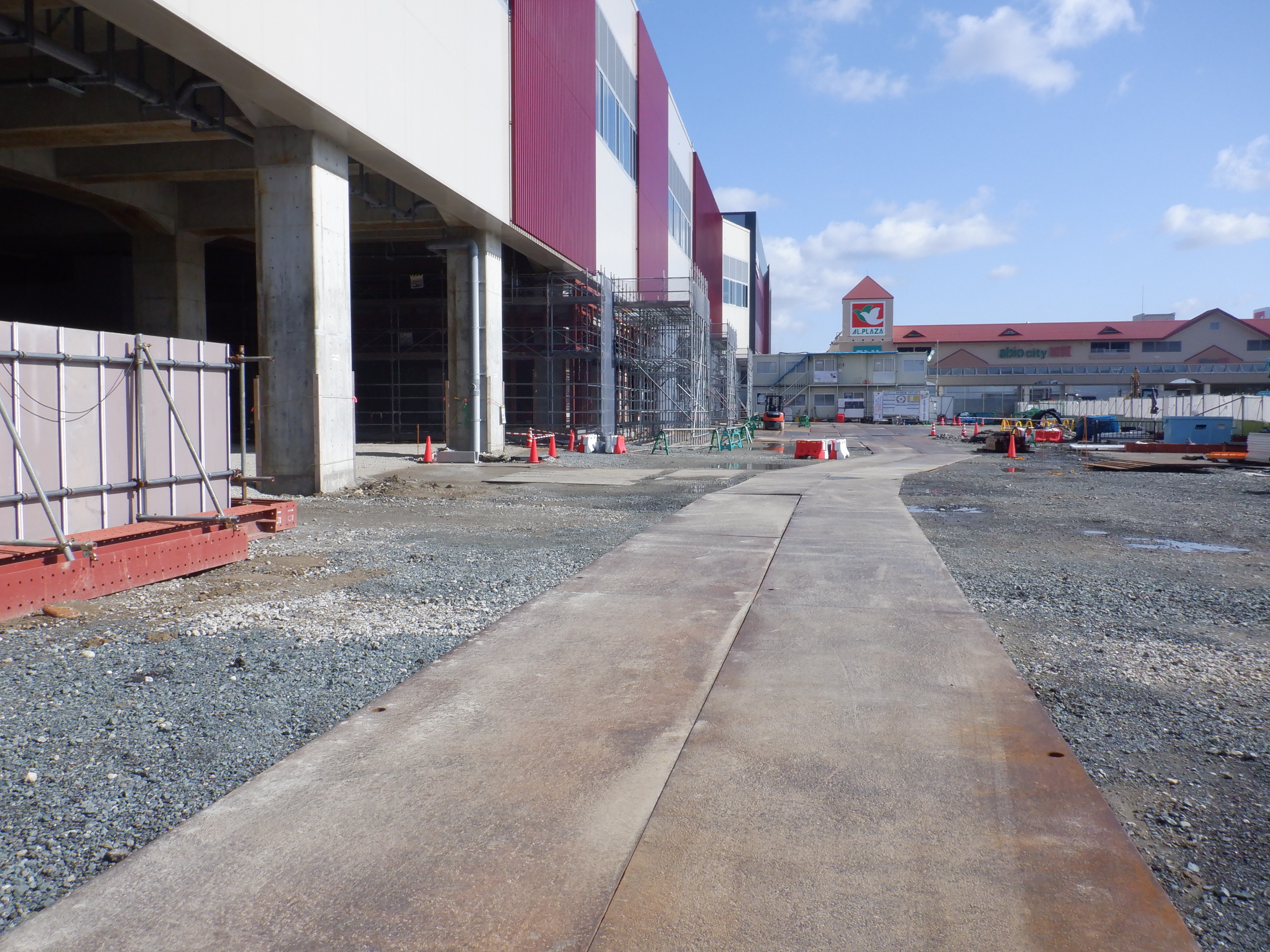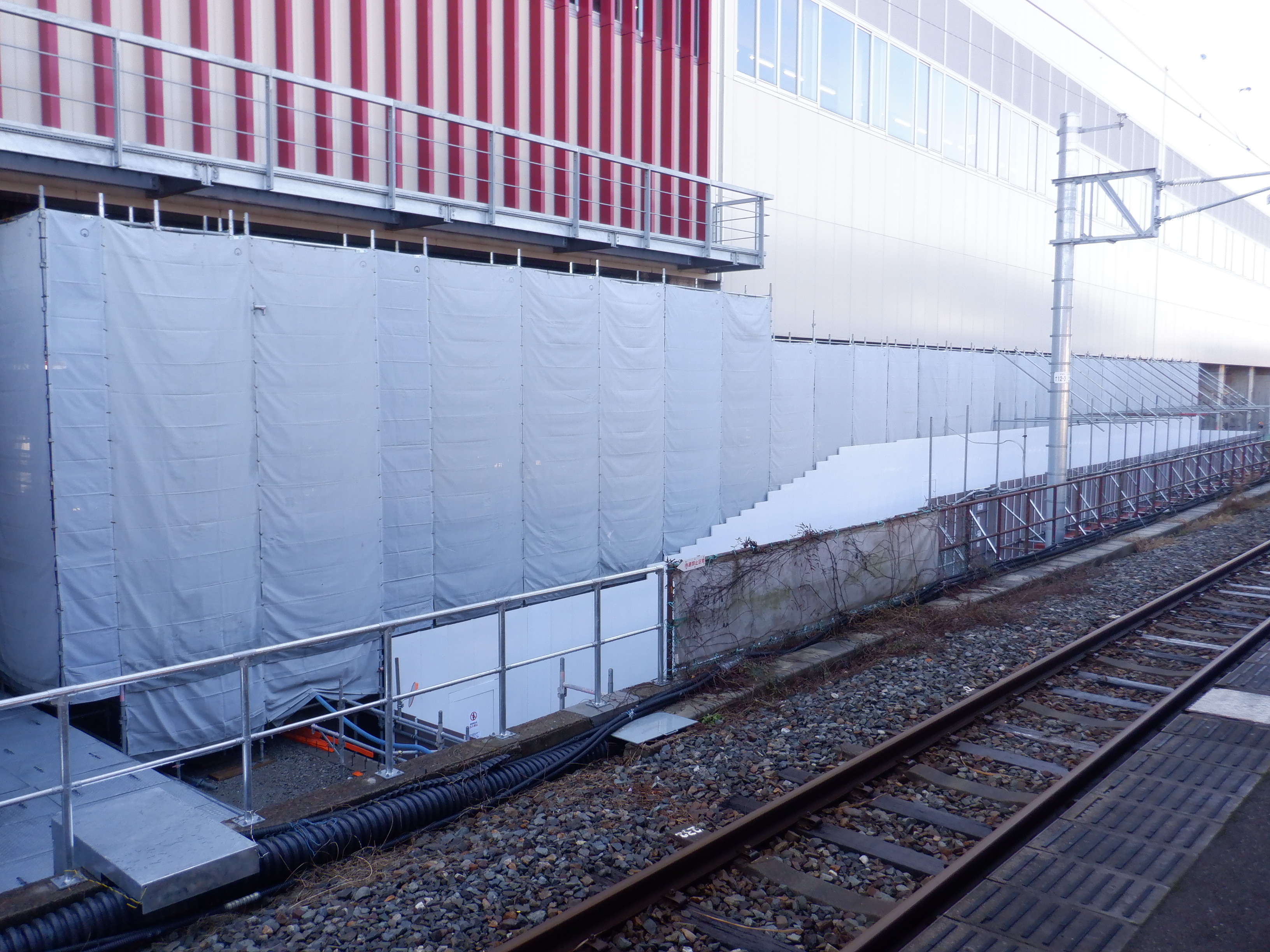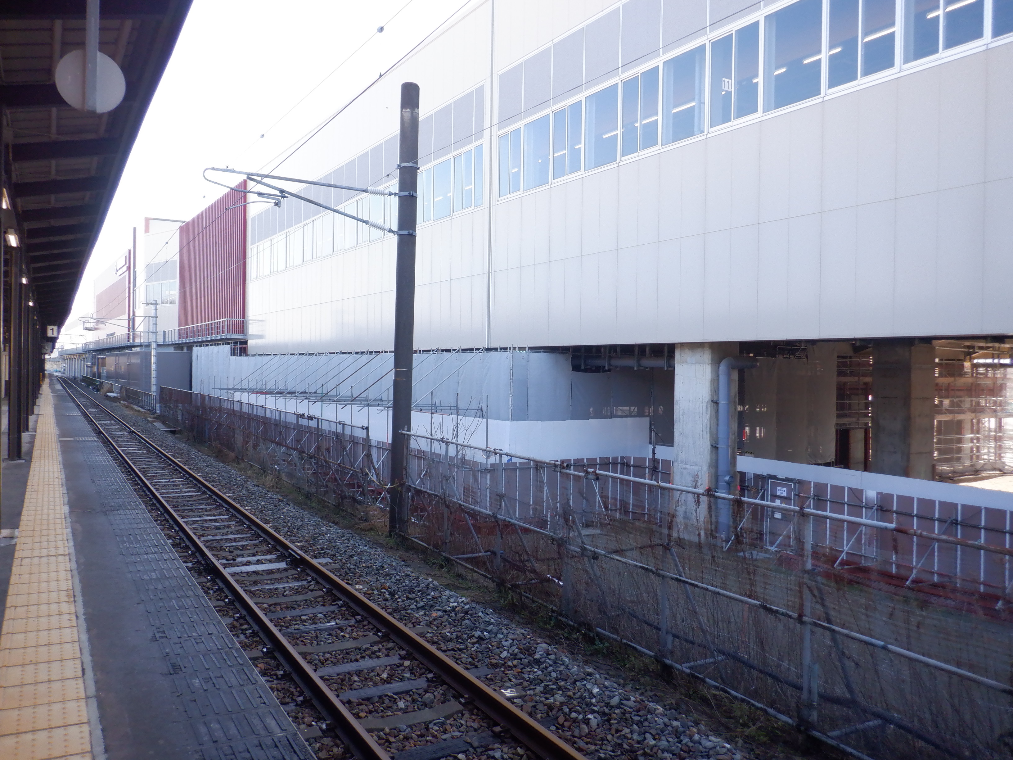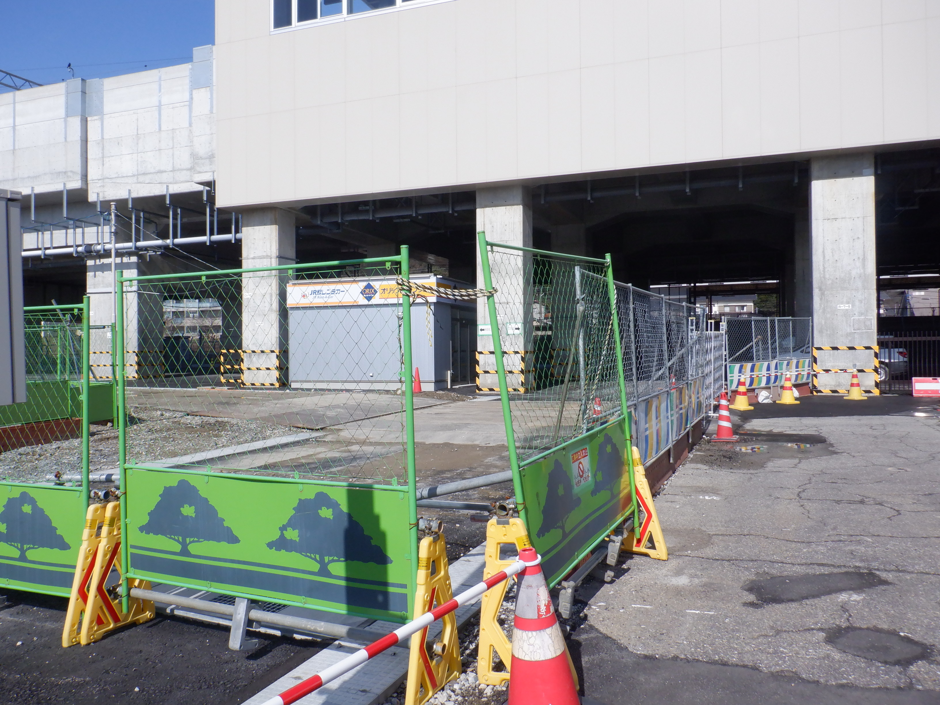 ホームの看板類は特に変化はありませんが、近距離券売機が撤去されるなど変化が出てきました。仮設駅舎とアルプラザの間の通路の整備が進んでいます。