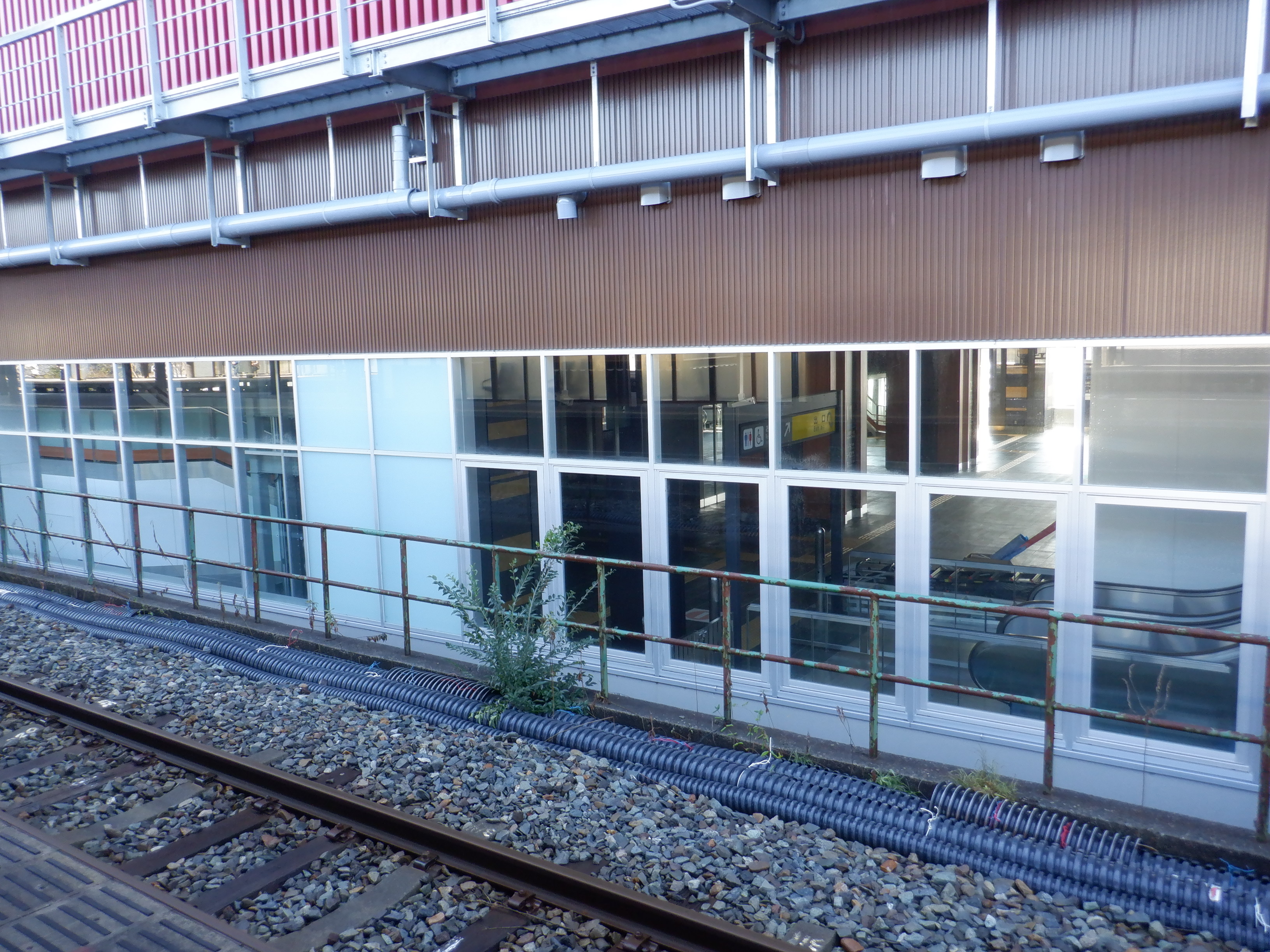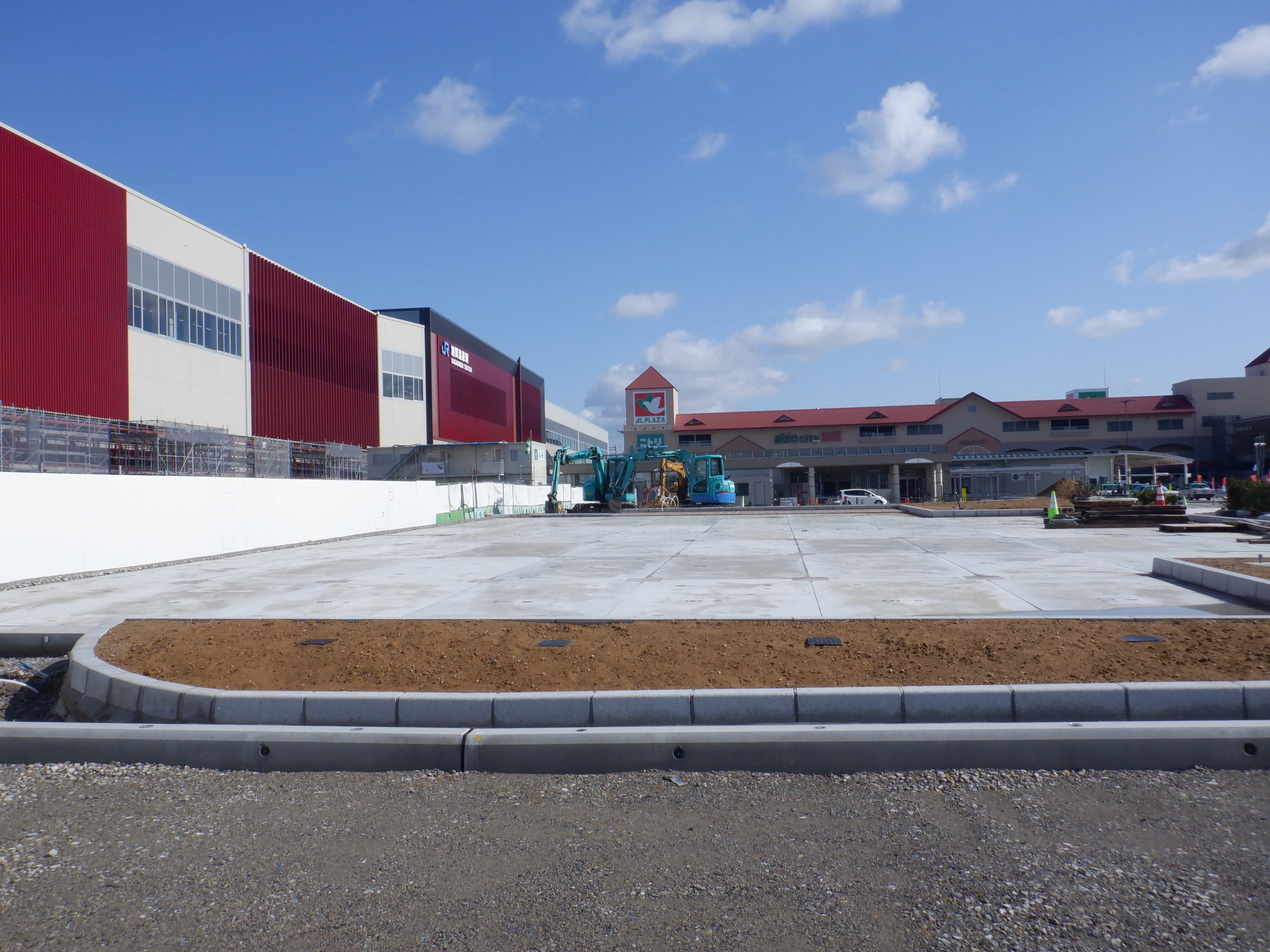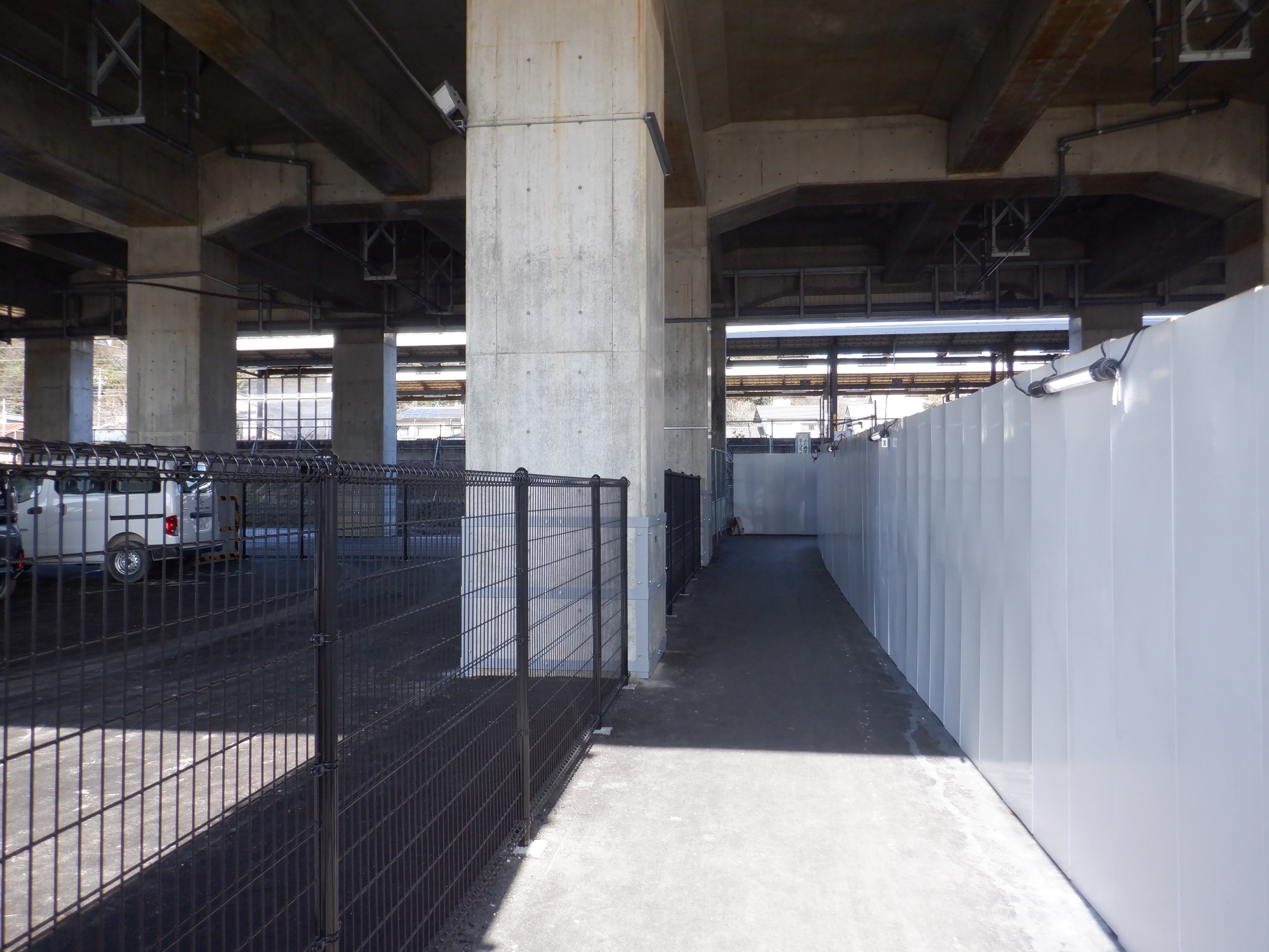 ホームの看板類は特に変化はありませんが、近距離券売機が撤去されるなど変化が出てきました。仮設駅舎とアルプラザの間の通路の整備が進んでいます。