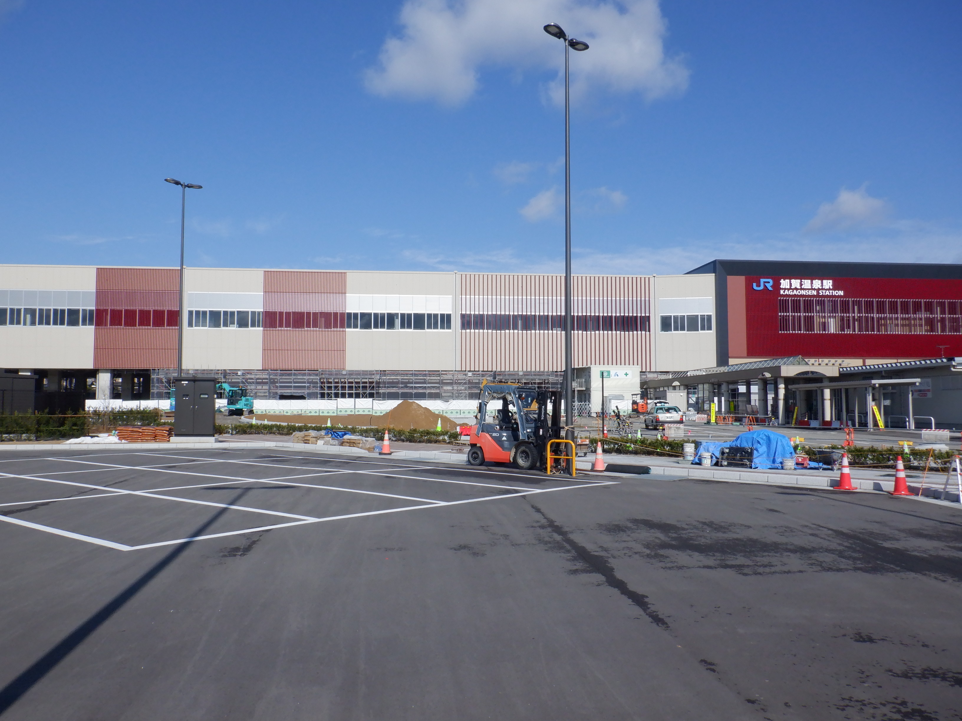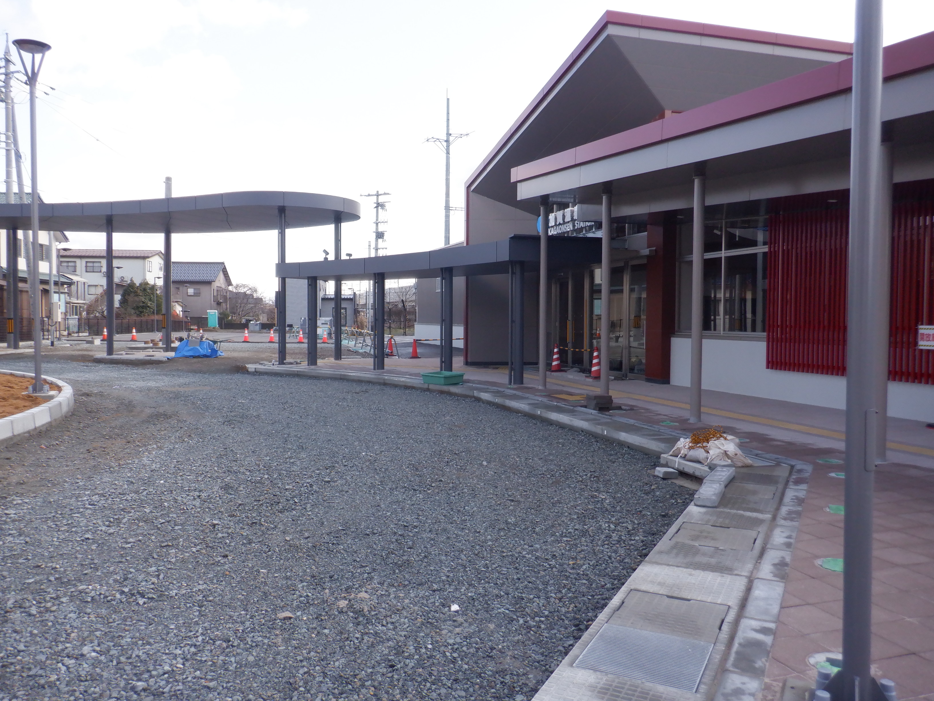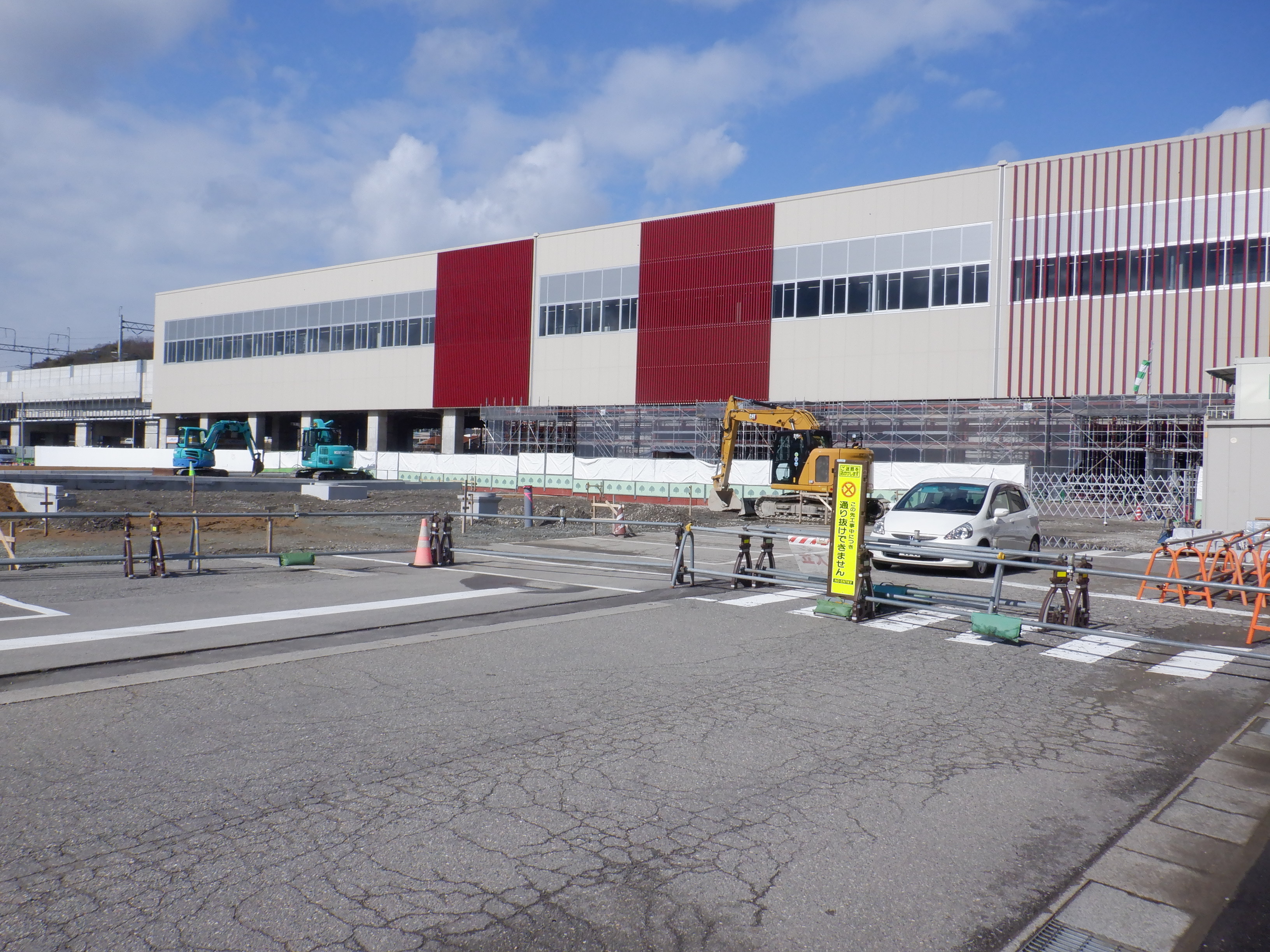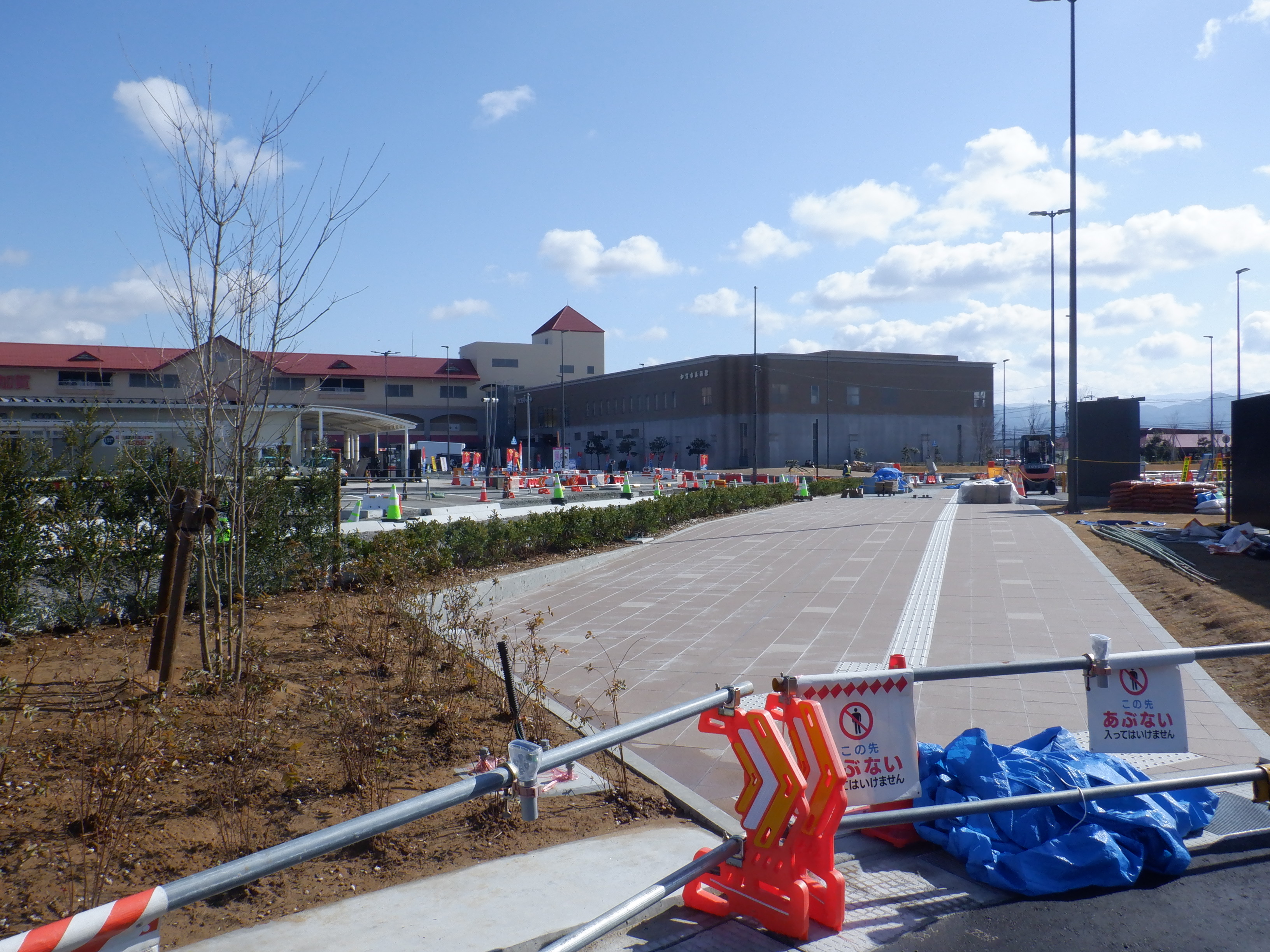 ホームの看板類は特に変化はありませんが、近距離券売機が撤去されるなど変化が出てきました。仮設駅舎とアルプラザの間の通路の整備が進んでいます。