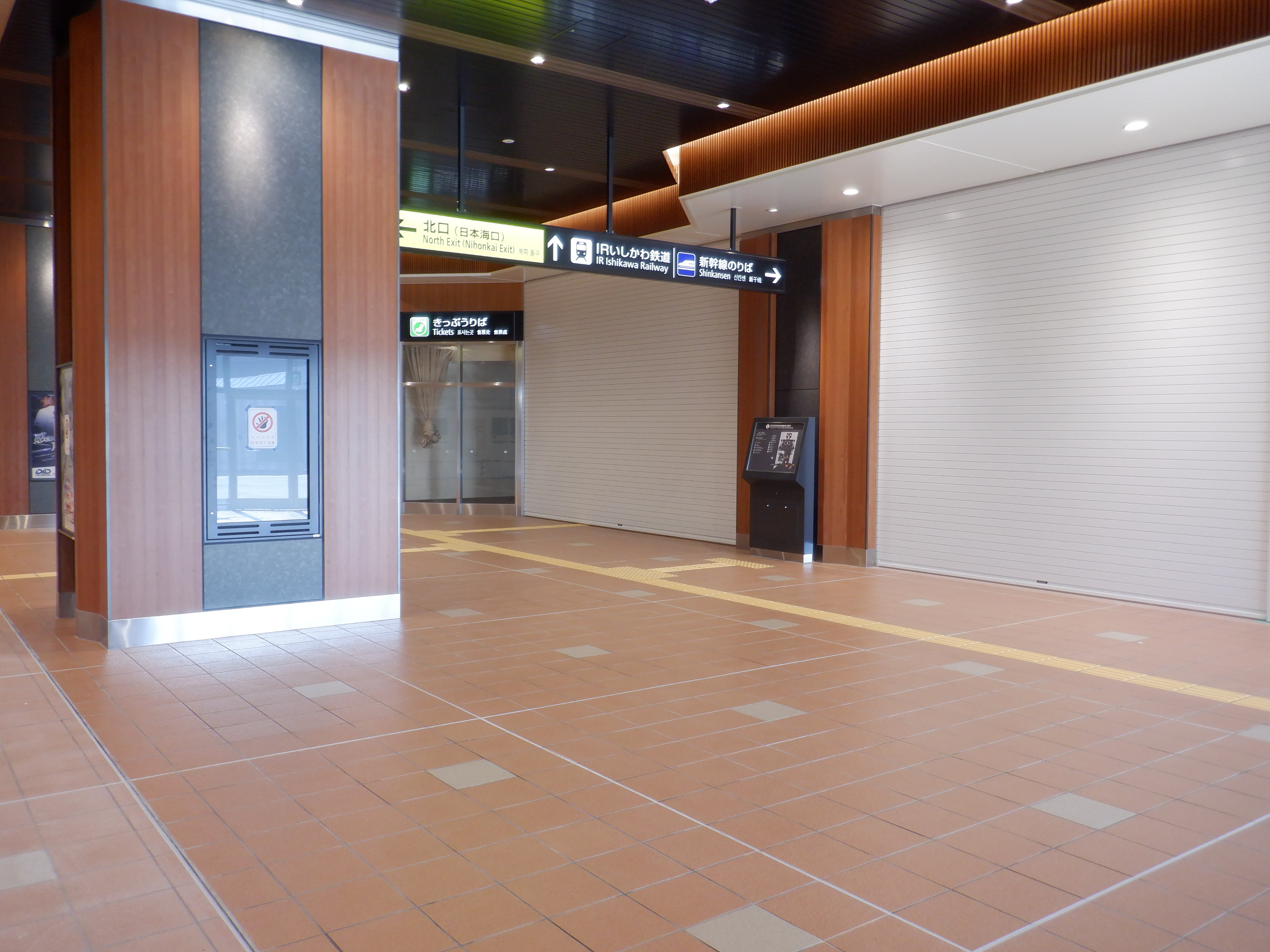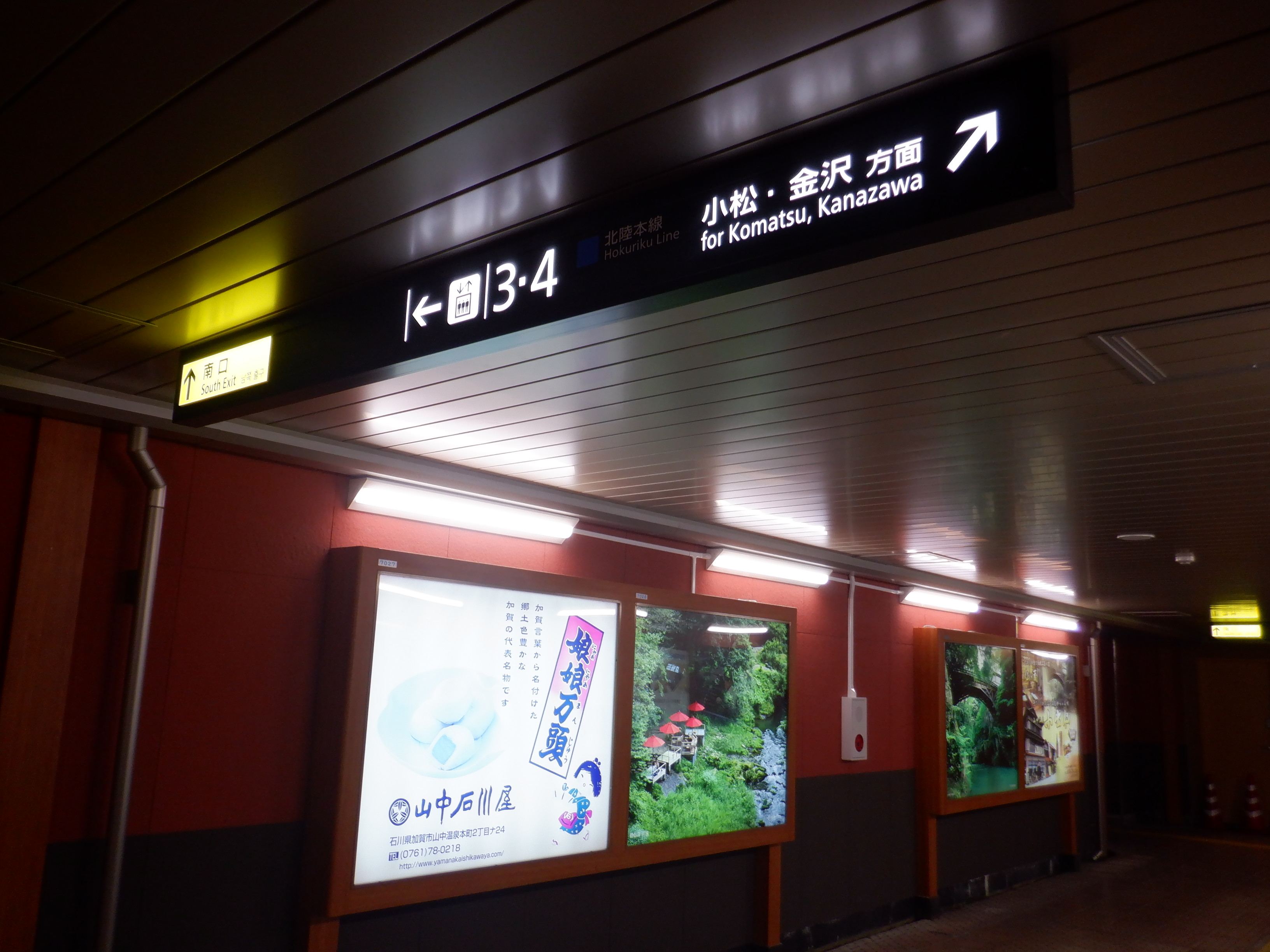 地下道の案内。1・2番のりば出口側はIRいしかわ鉄道の表示は再び隠されています。