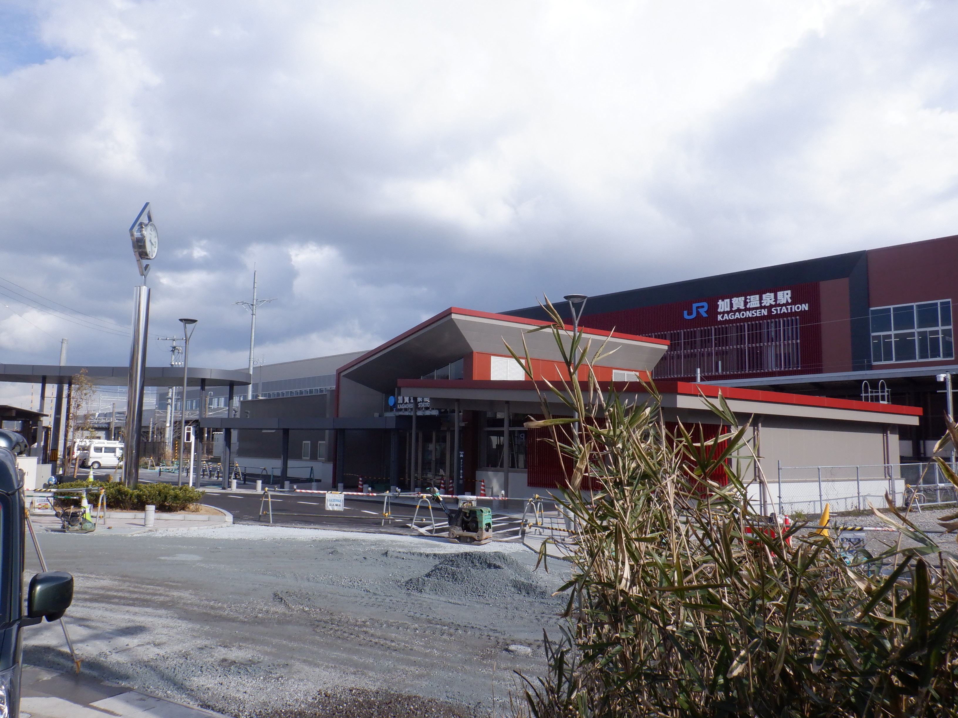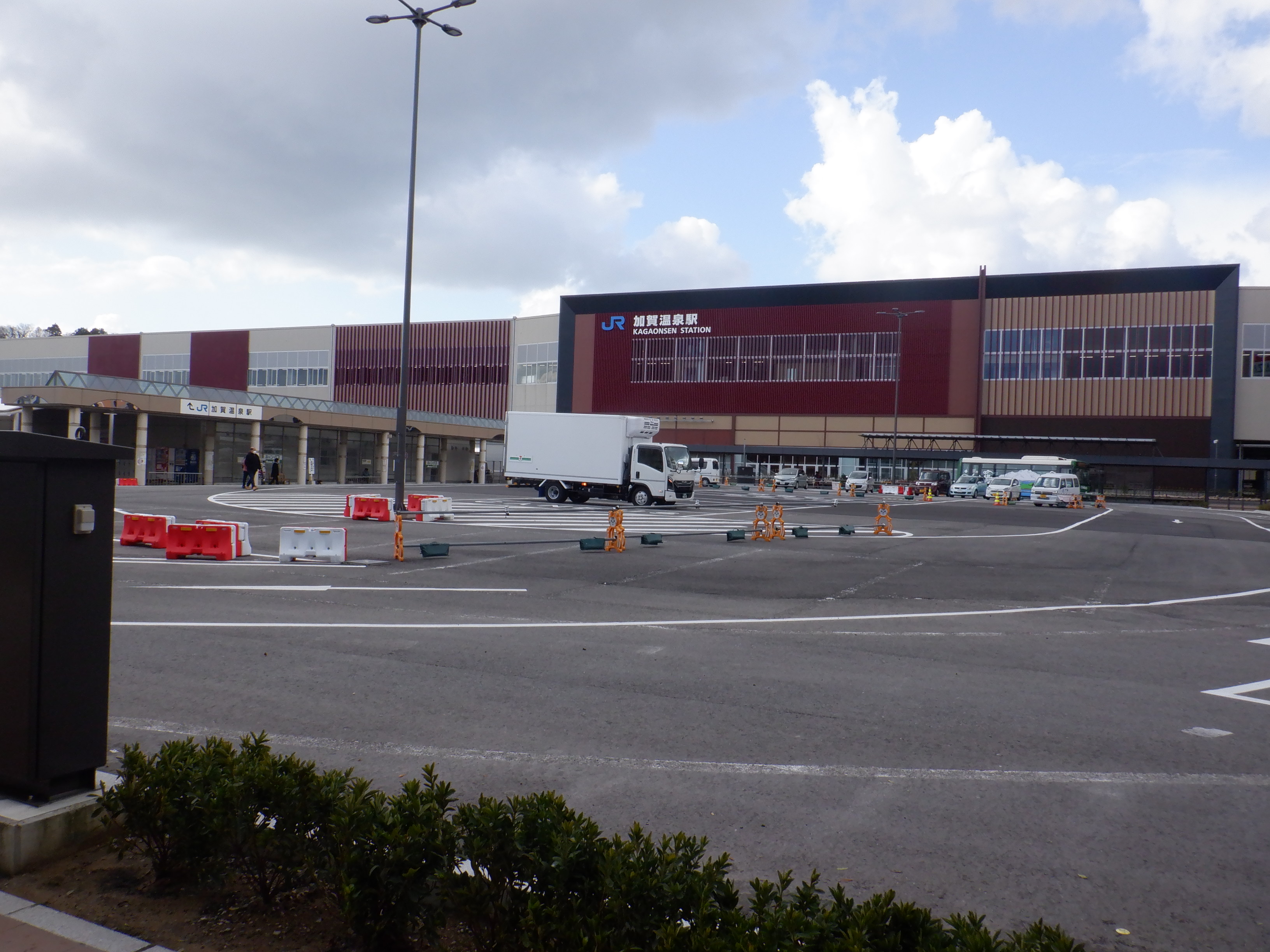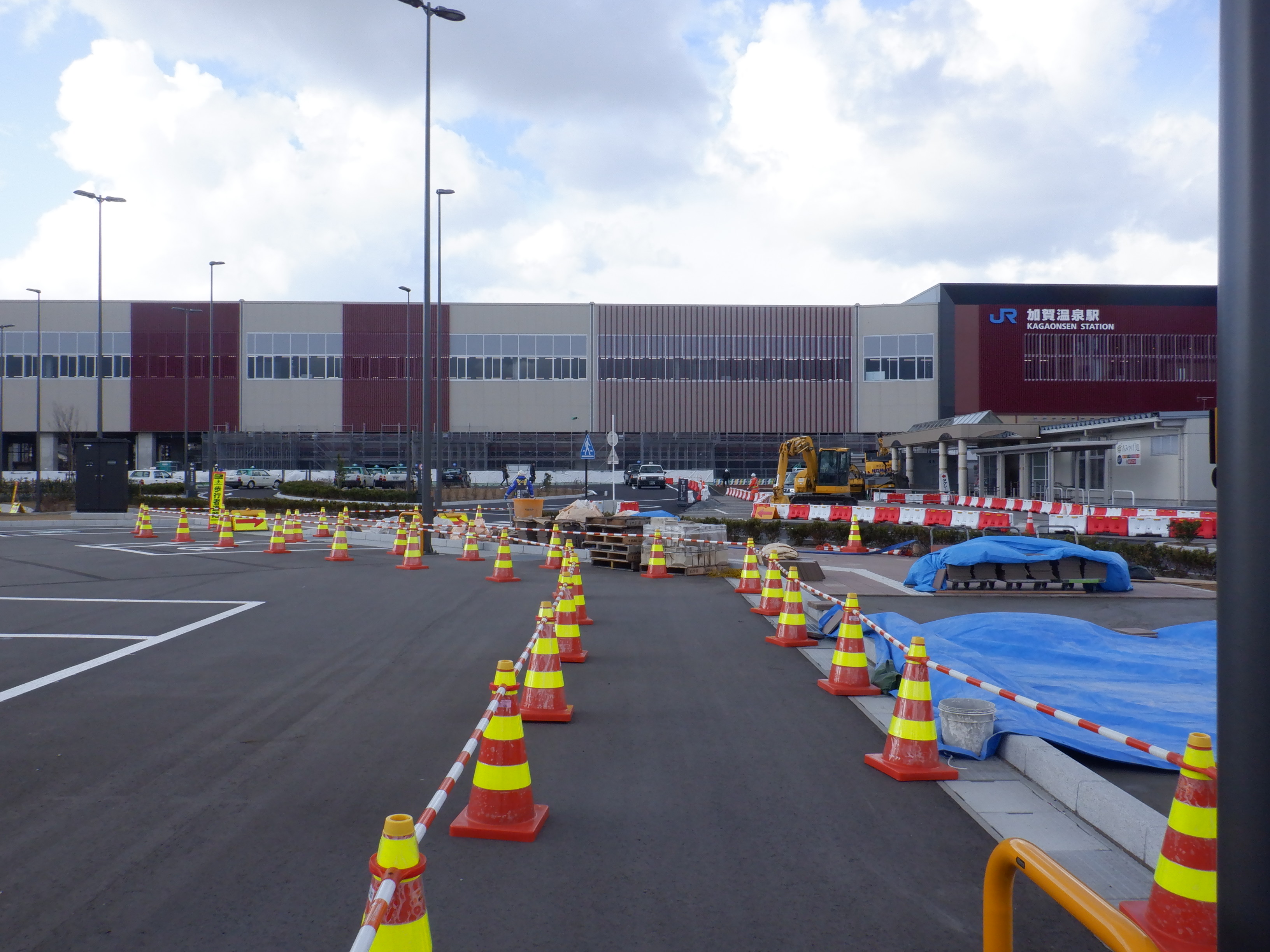 IRいしかわ鉄道への移管・新幹線開業まで1週間となりました。ホームの駅名標等は新しいものに差し替えられた後、JRとしても継続して使用する体制になっています。北口の駅前広場も工事が続いていました。この駅については、移管後・新幹線開業後もまだまだ工事が続きます。
