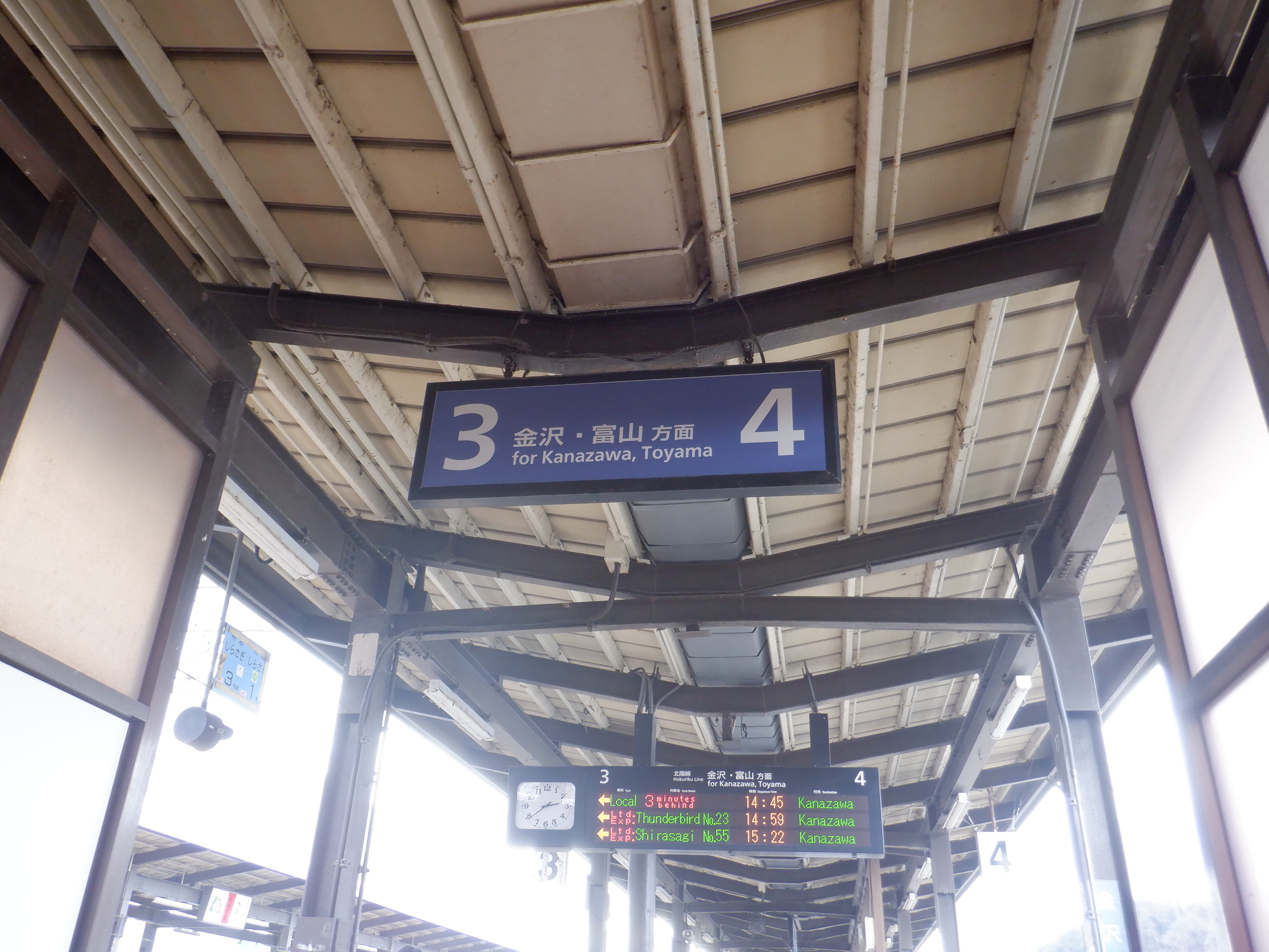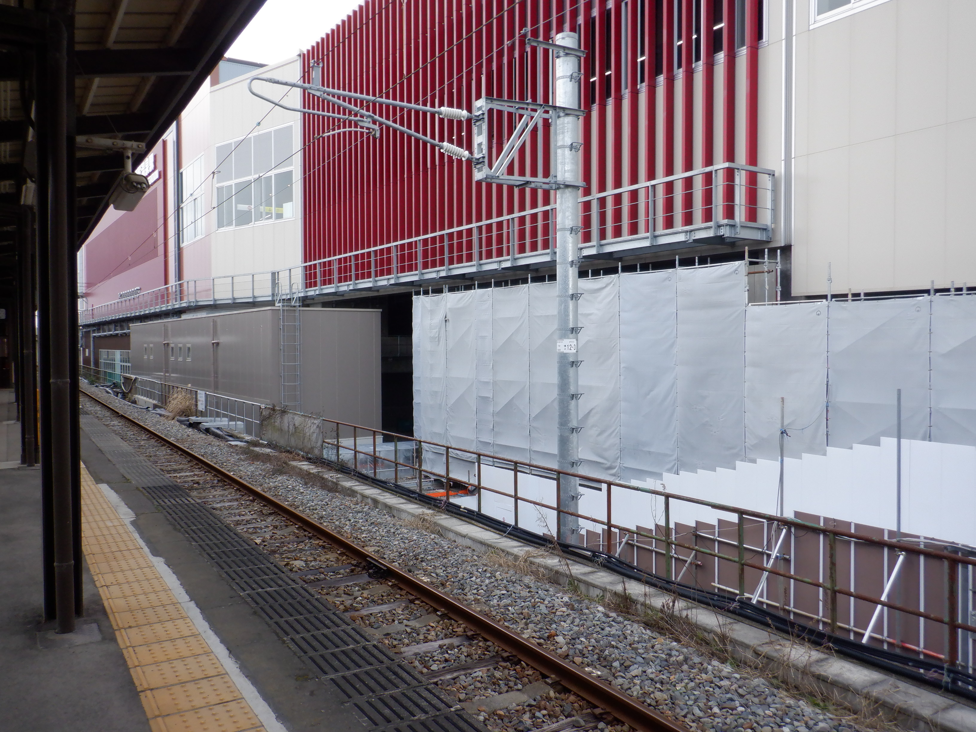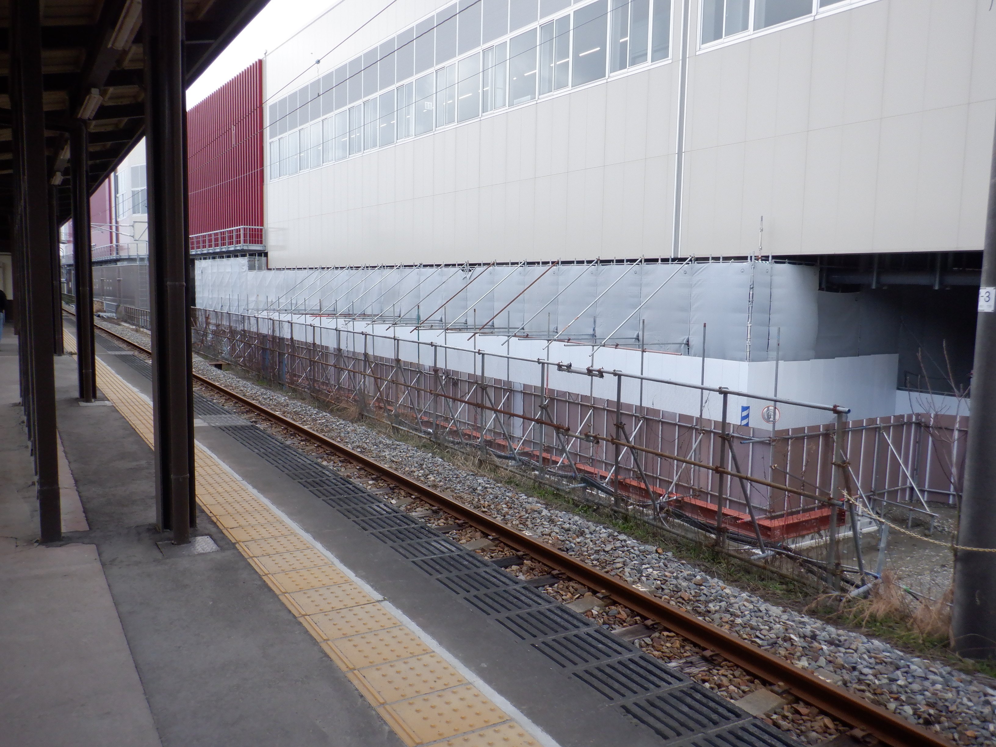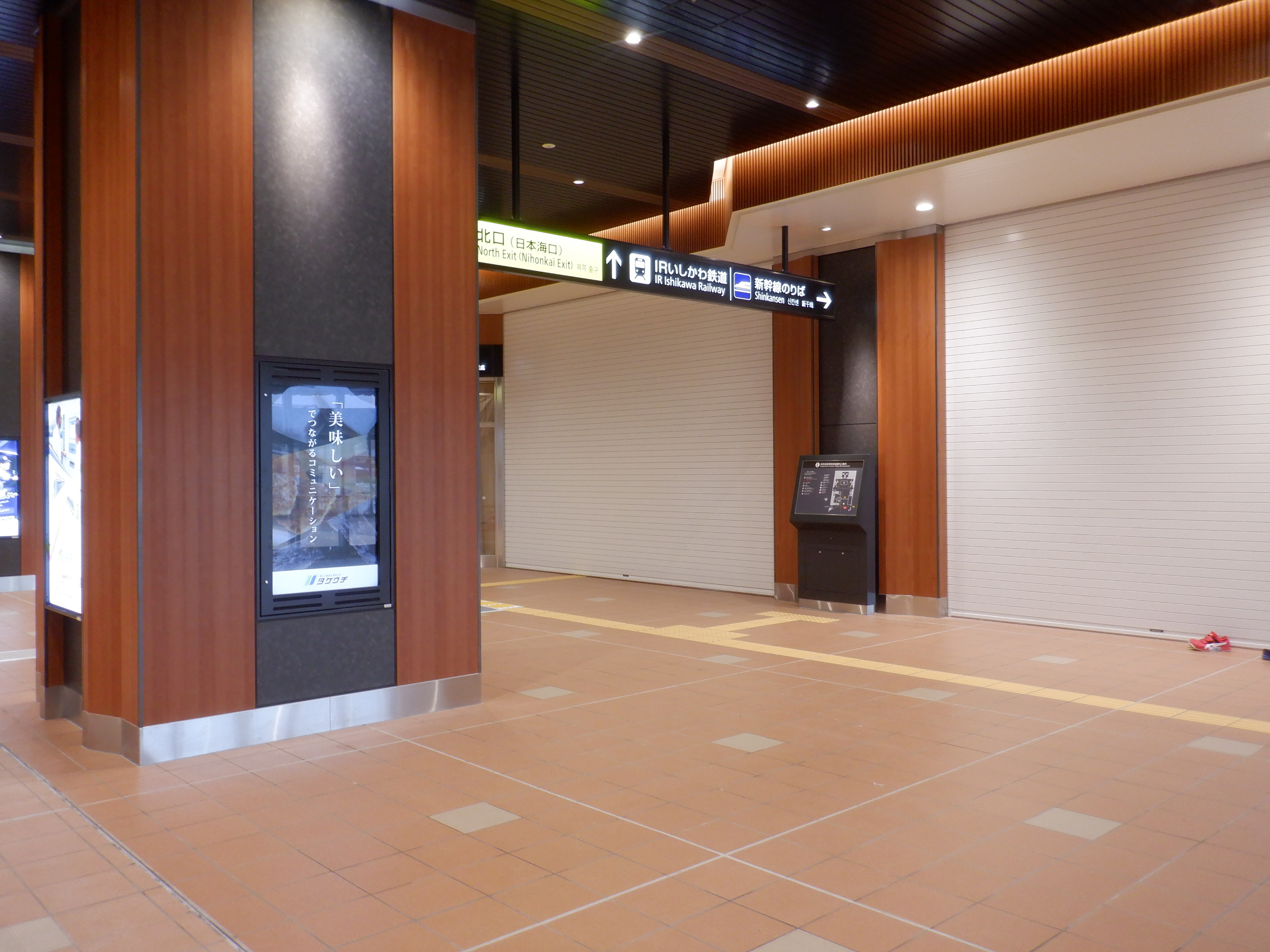 IRいしかわ鉄道への移管・新幹線開業まで1週間となりました。ホームの駅名標等は新しいものに差し替えられた後、JRとしても継続して使用する体制になっています。北口の駅前広場も工事が続いていました。この駅については、移管後・新幹線開業後もまだまだ工事が続きます。