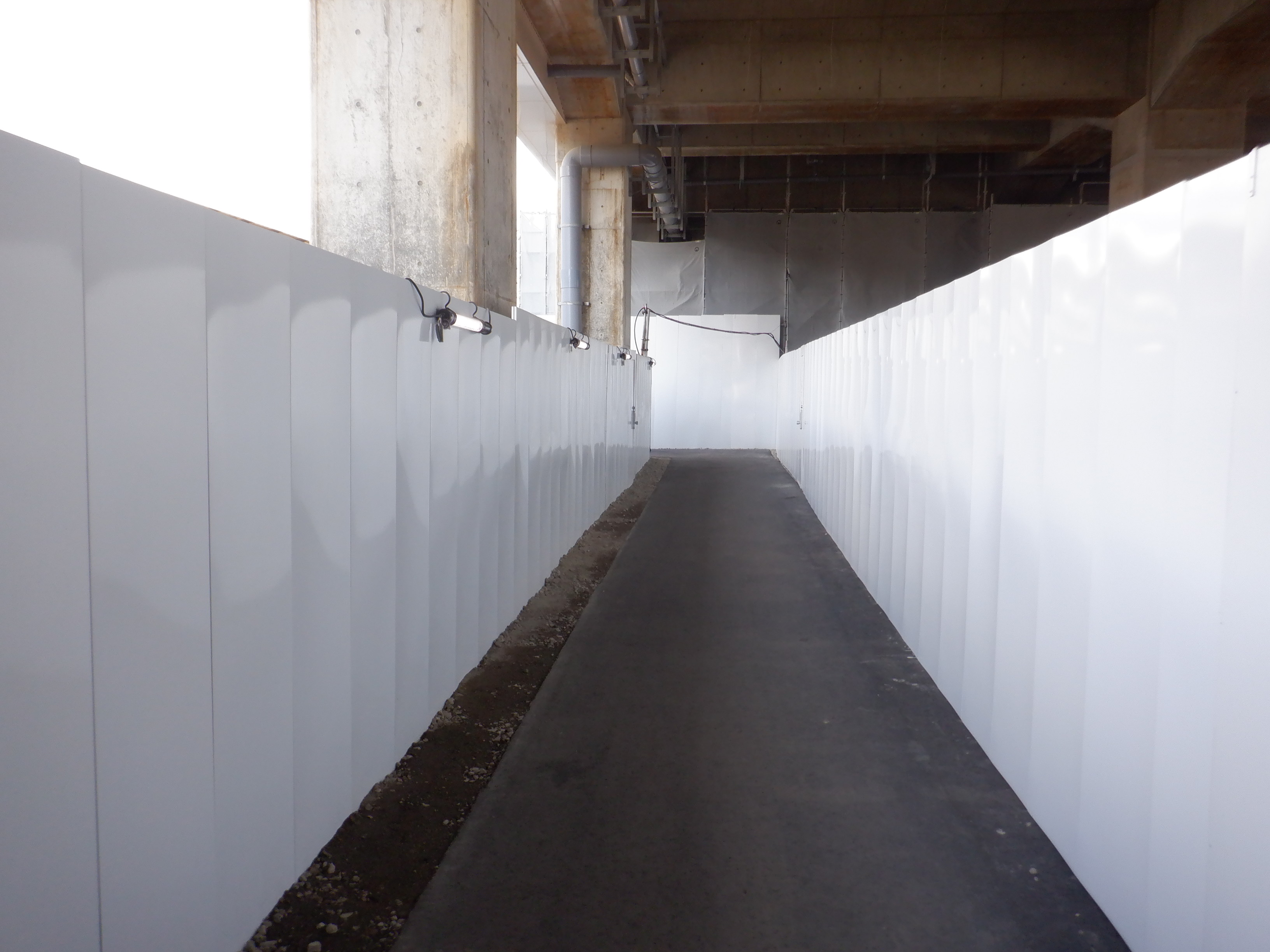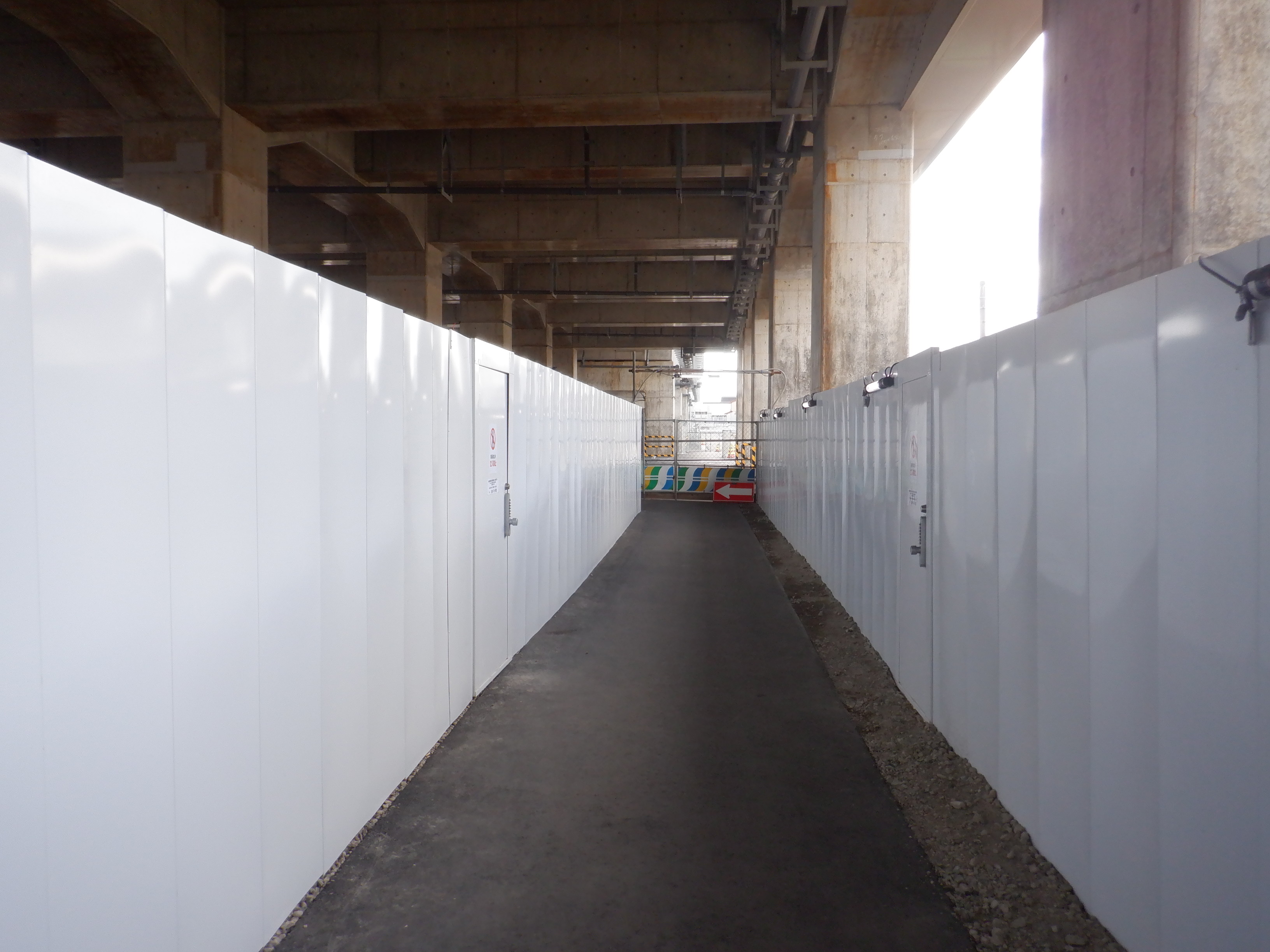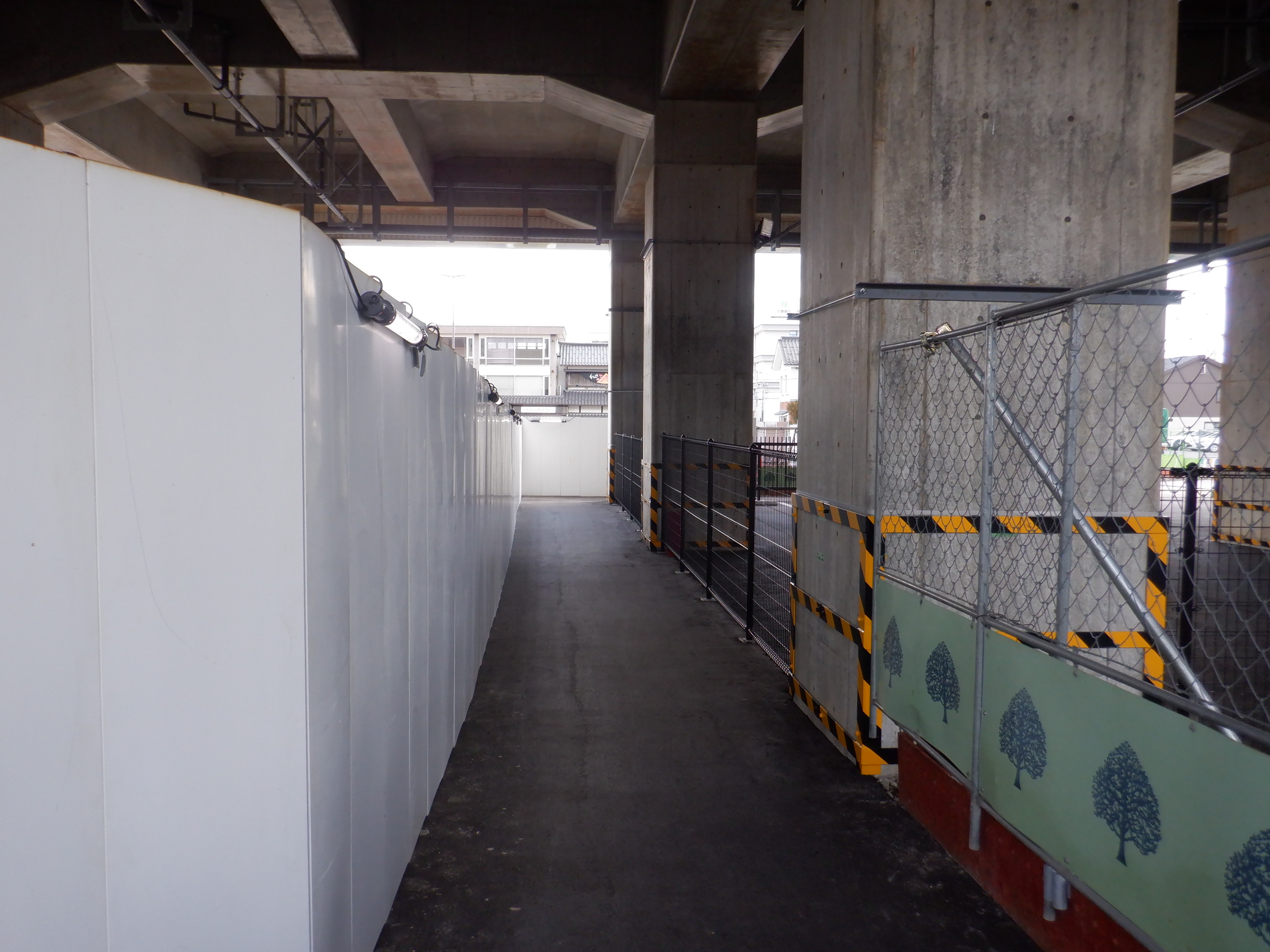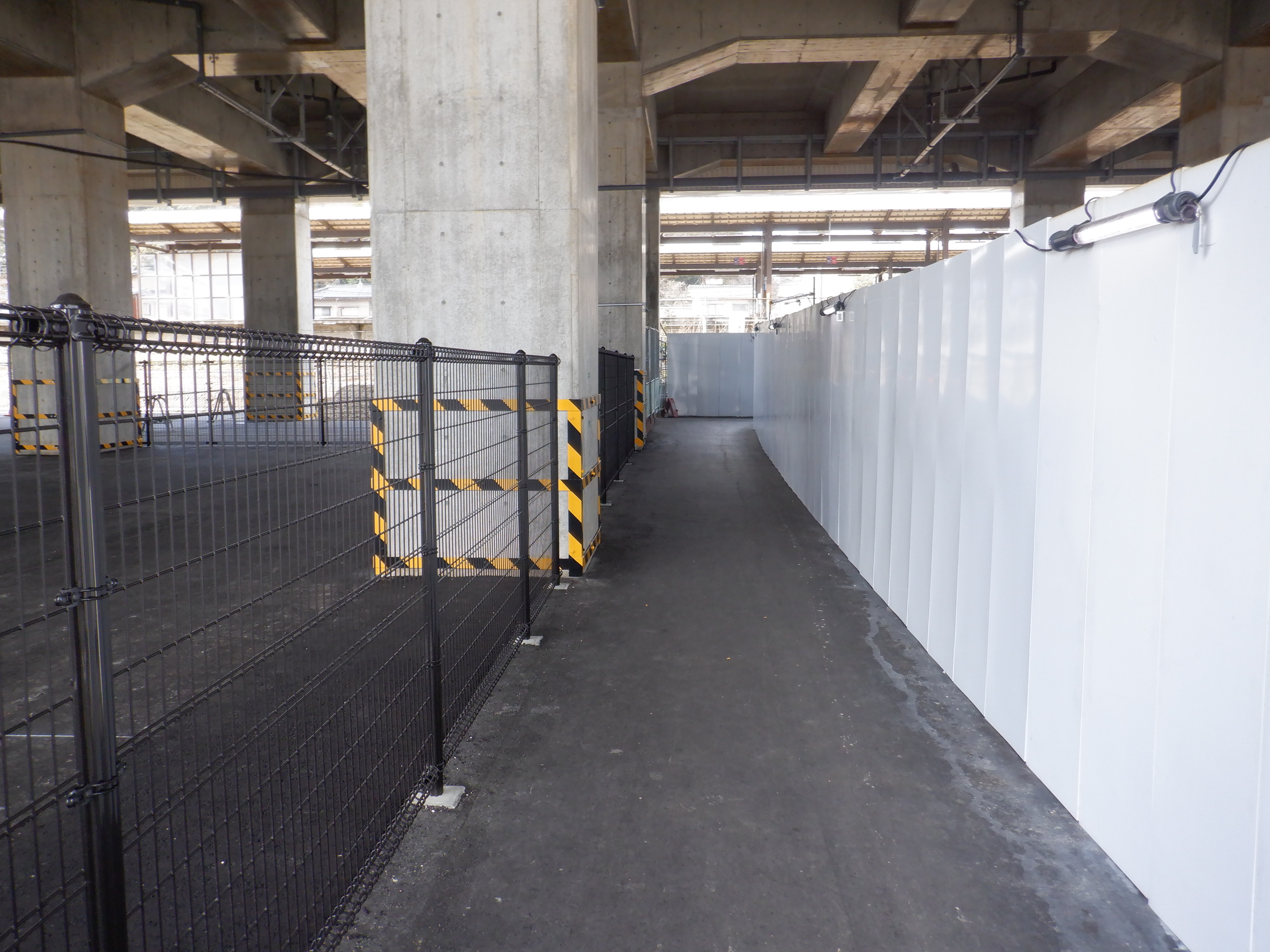 迂回通路から見た高架下部都市施設(コンビニ・待合室等)建設中の様子。