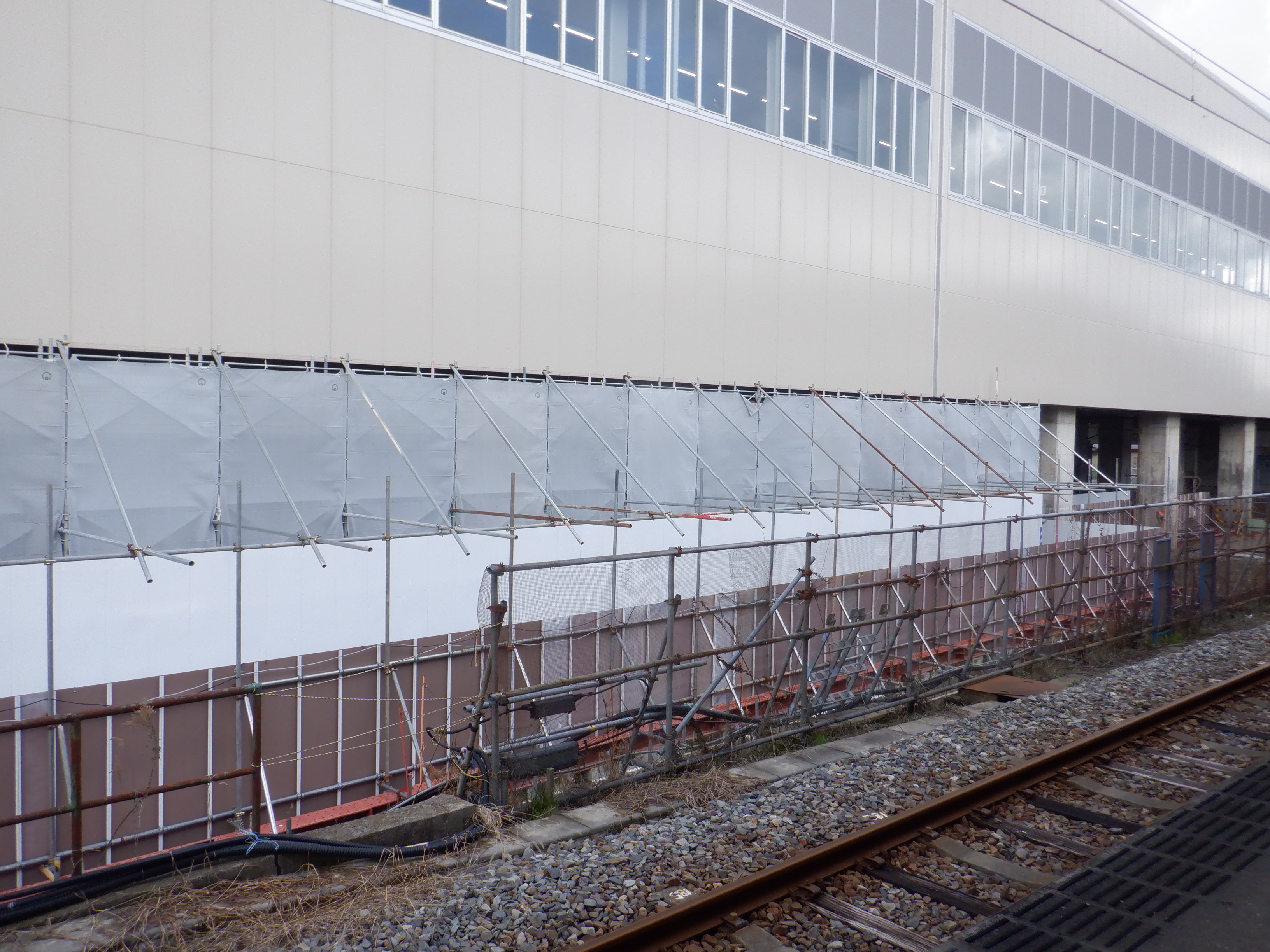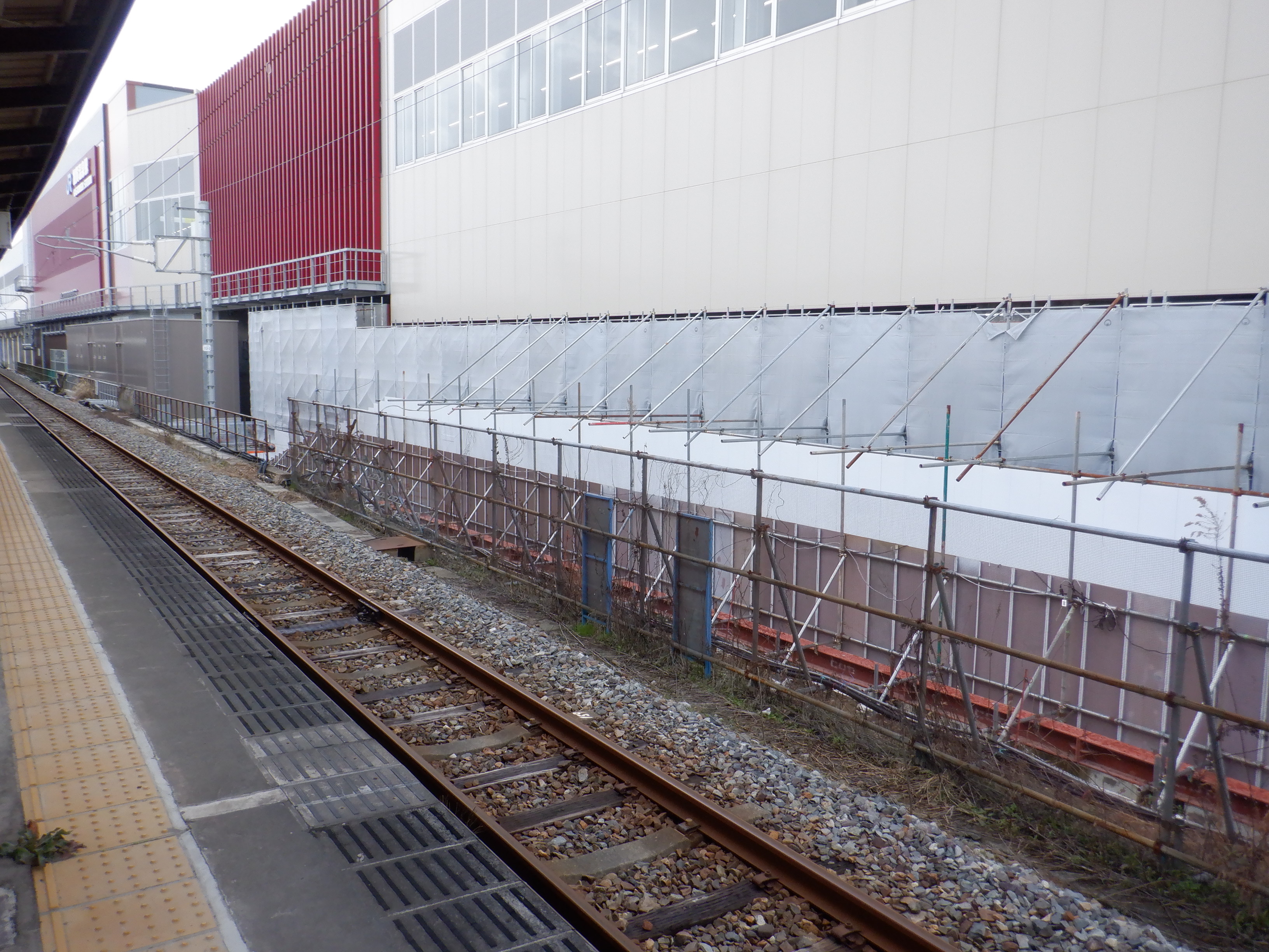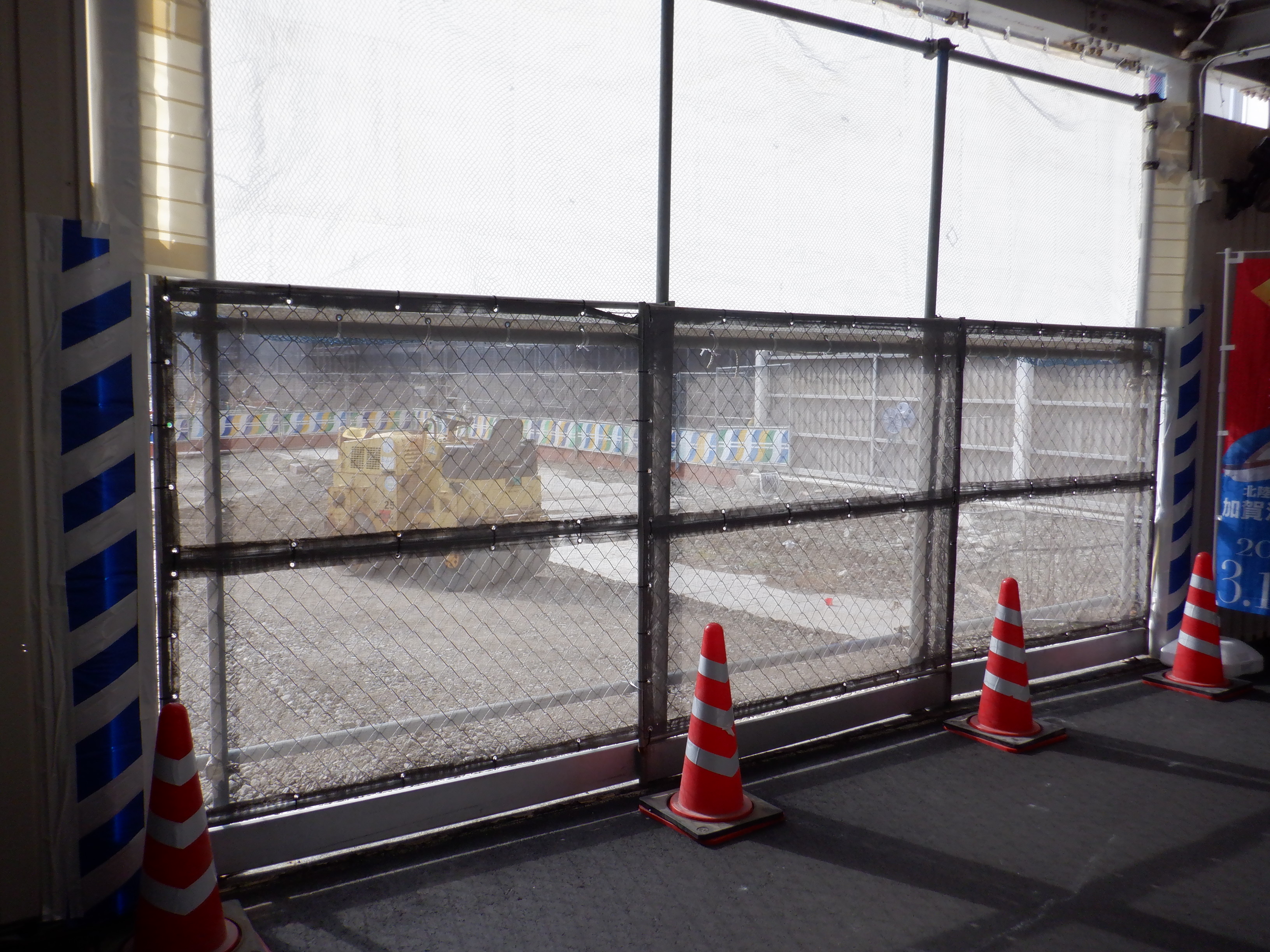 迂回通路から見た高架下部都市施設(コンビニ・待合室等)建設中の様子。