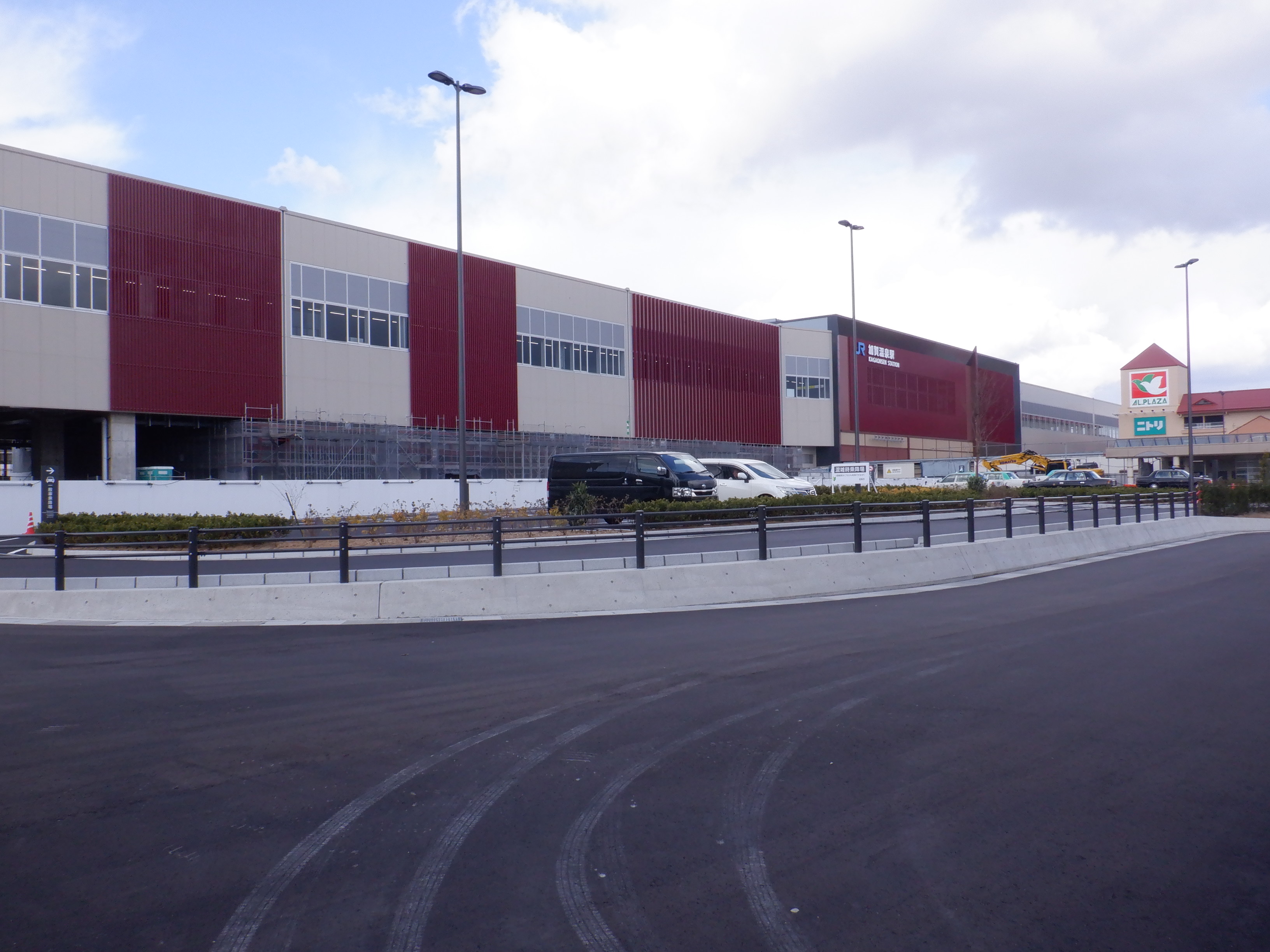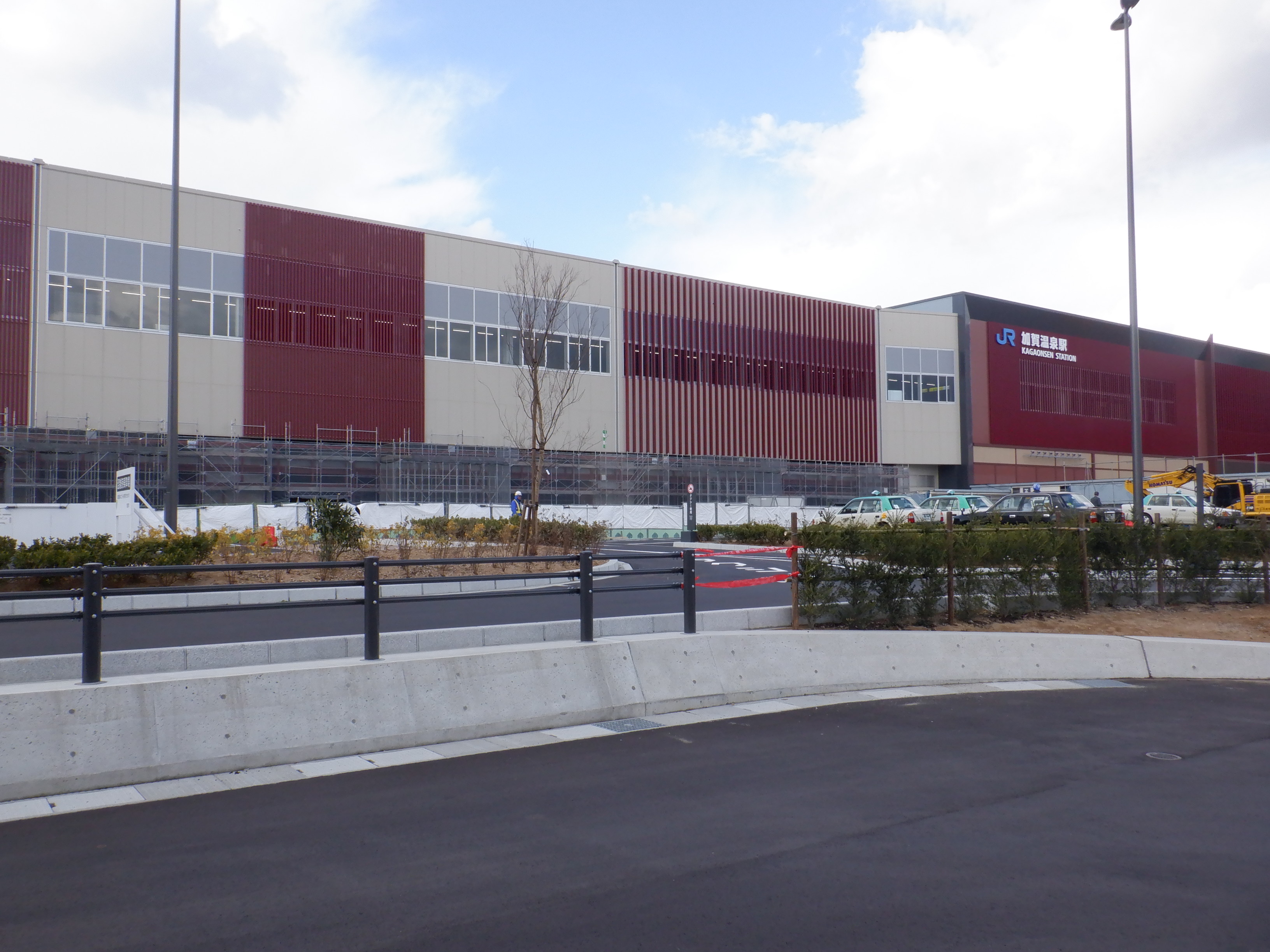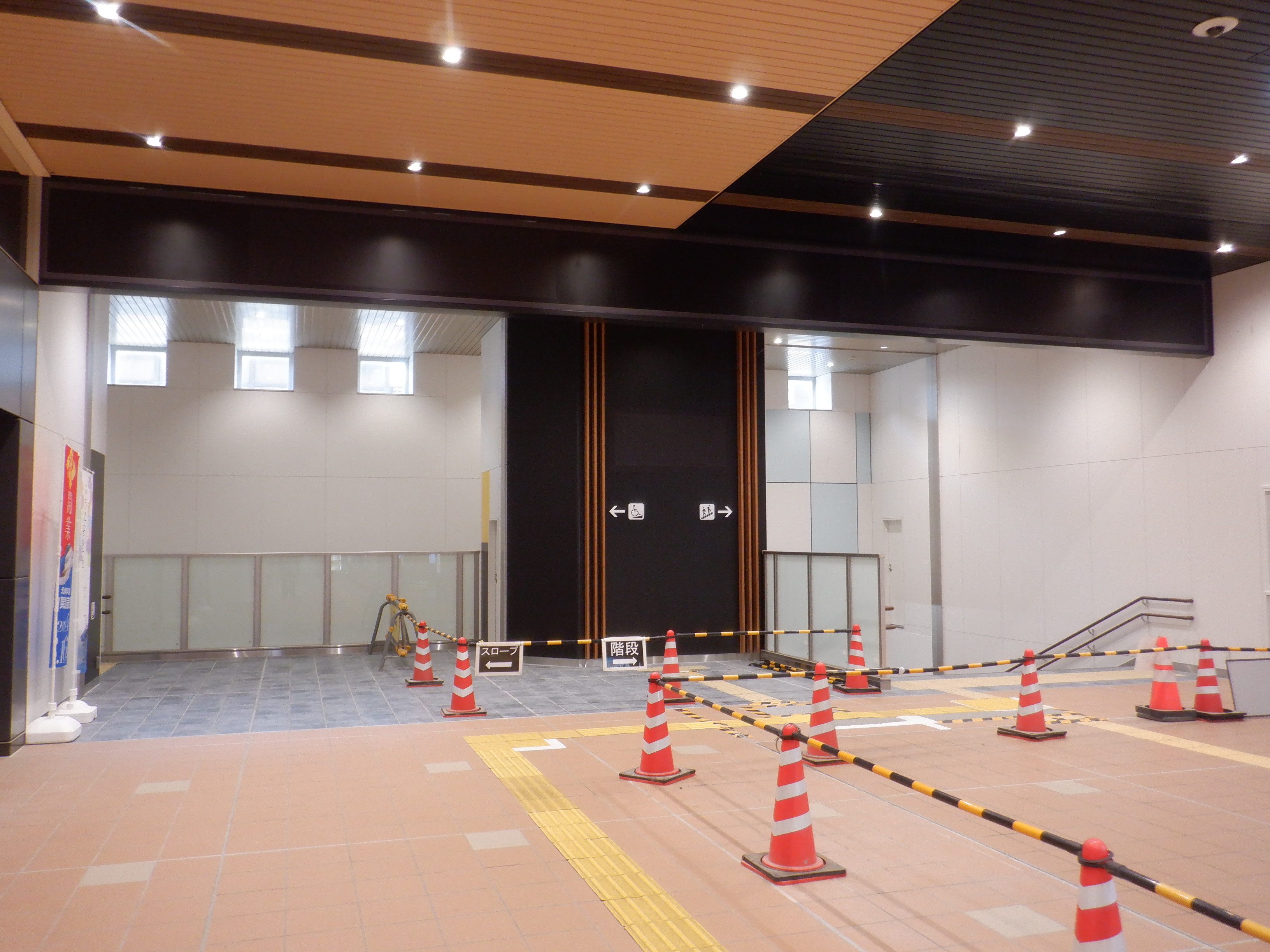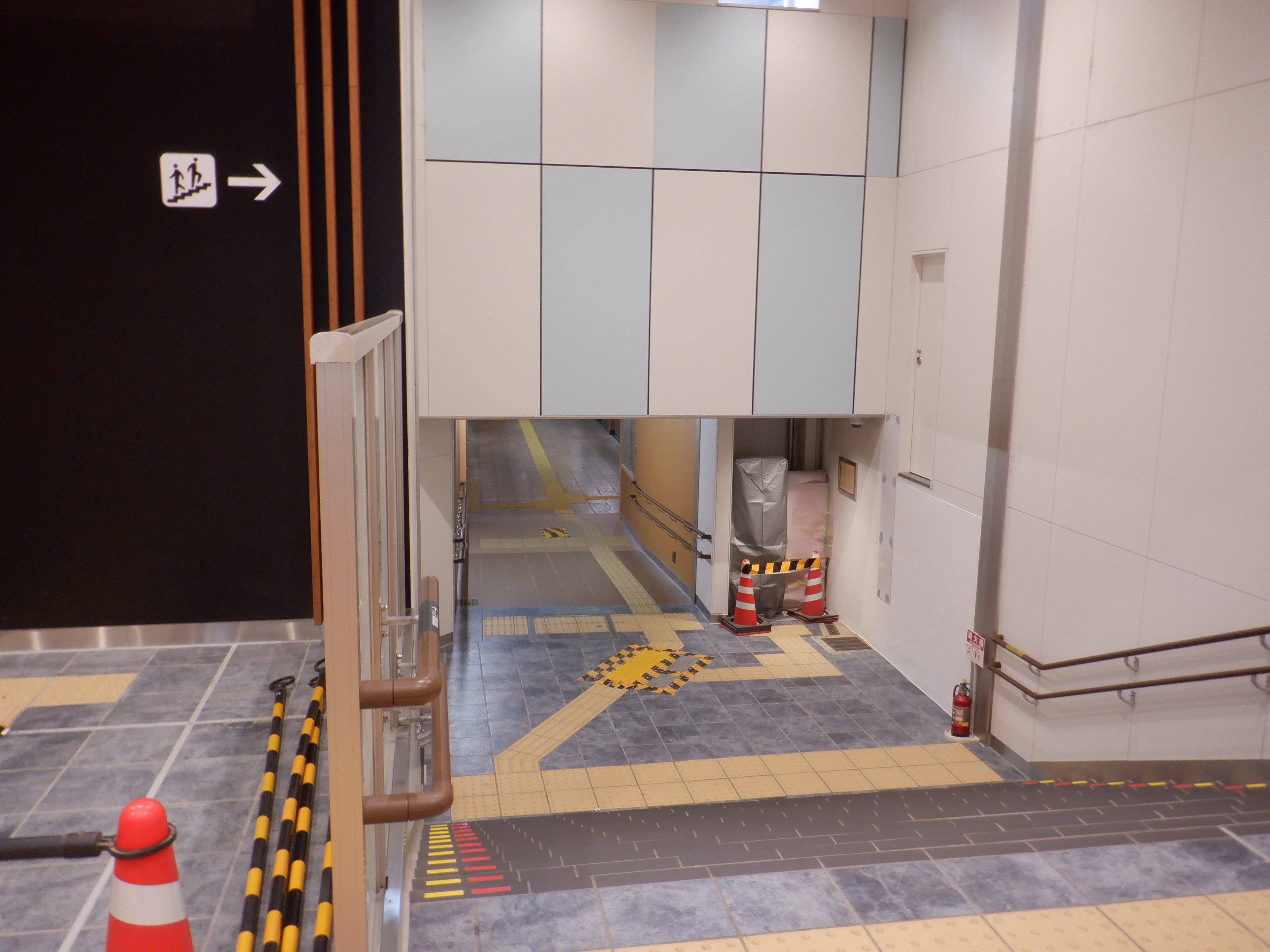 仮設通路の壁が一部撤去され、開業時はここの部分は駅出口付近の通路となるようです。