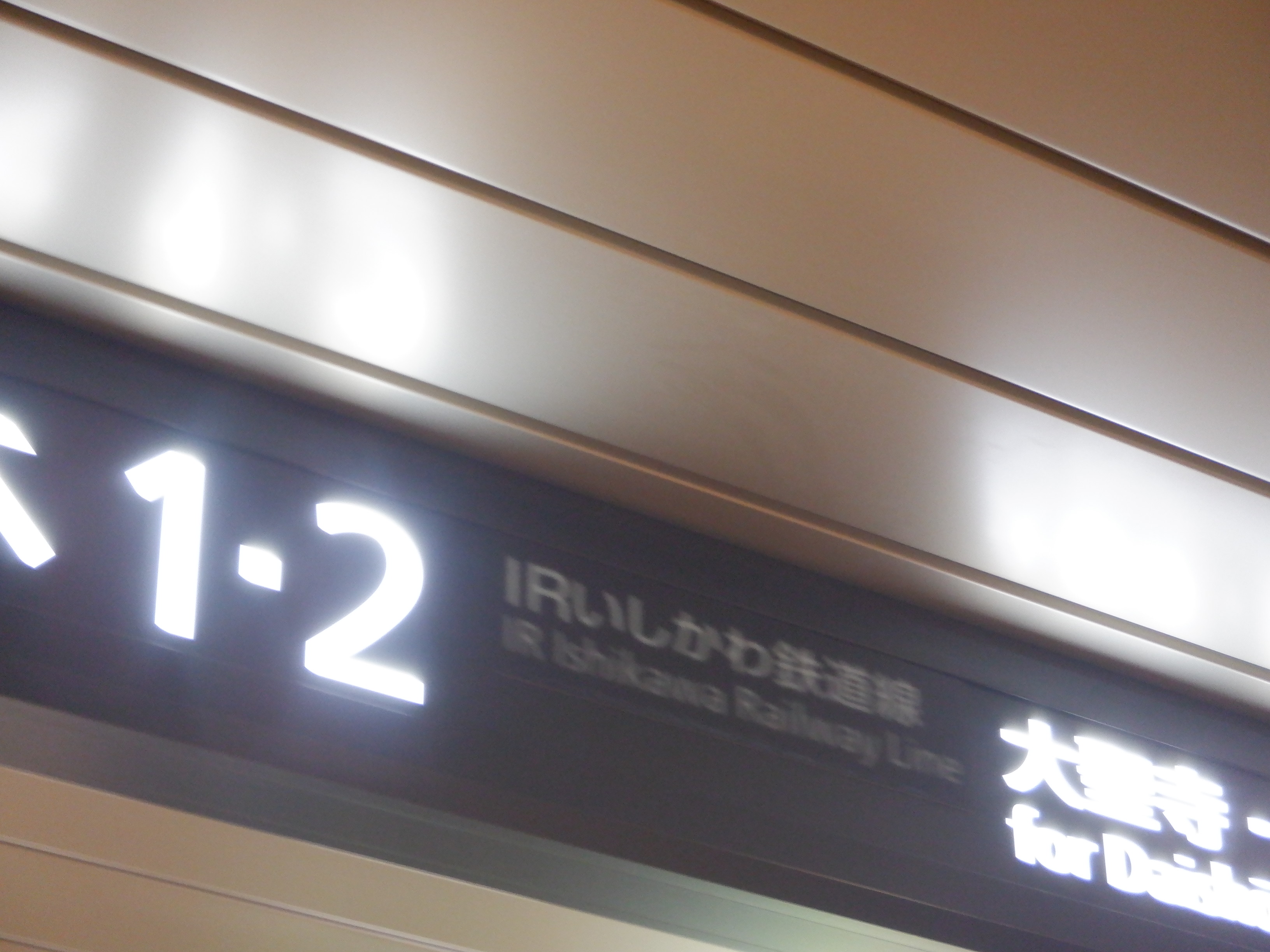 1・2番のりば階段とエスカレーターの間にある建植式の駅名標はIRいしかわ鉄道の駅名標となりましたが、IRのロゴは隠されています。