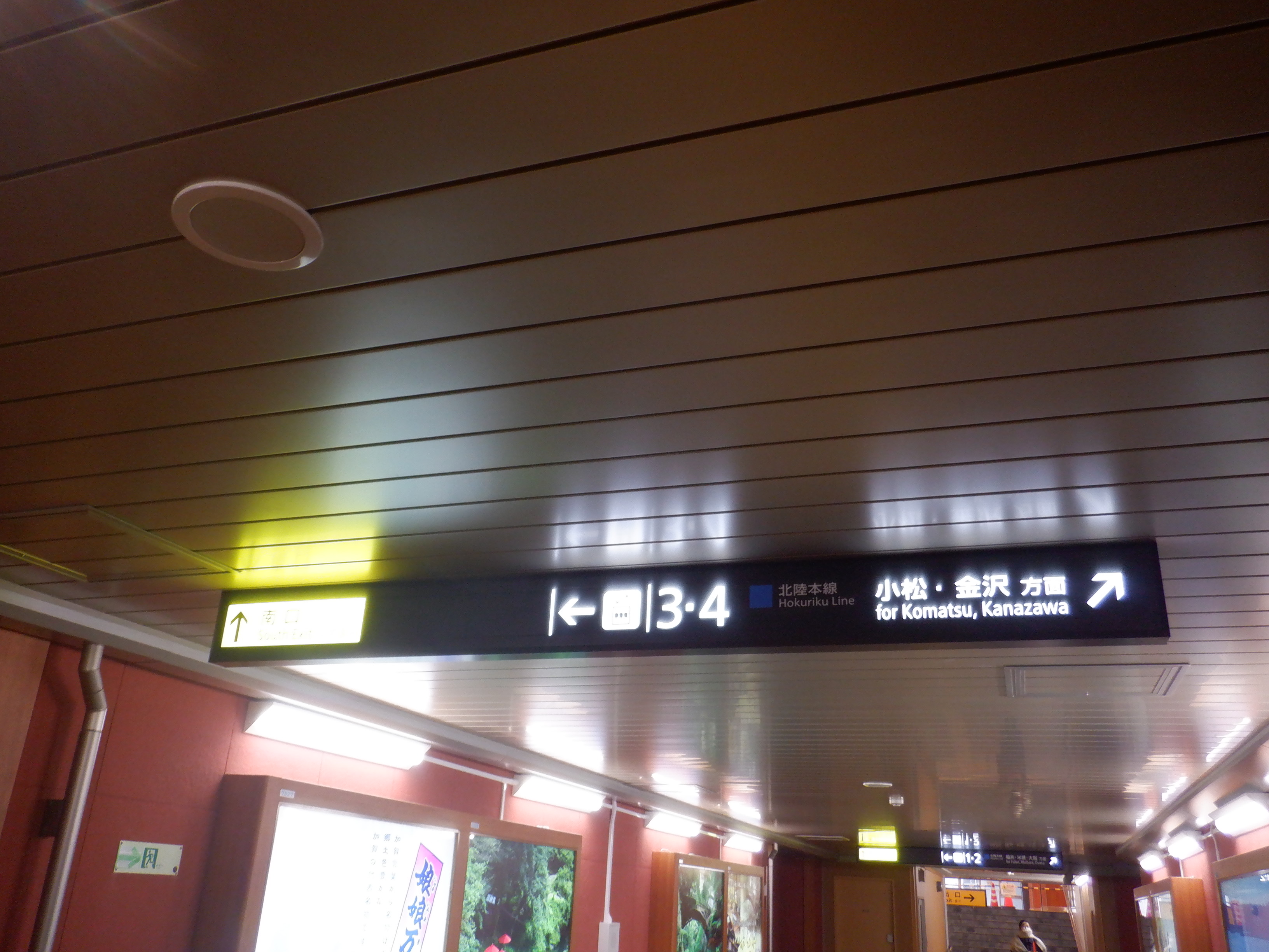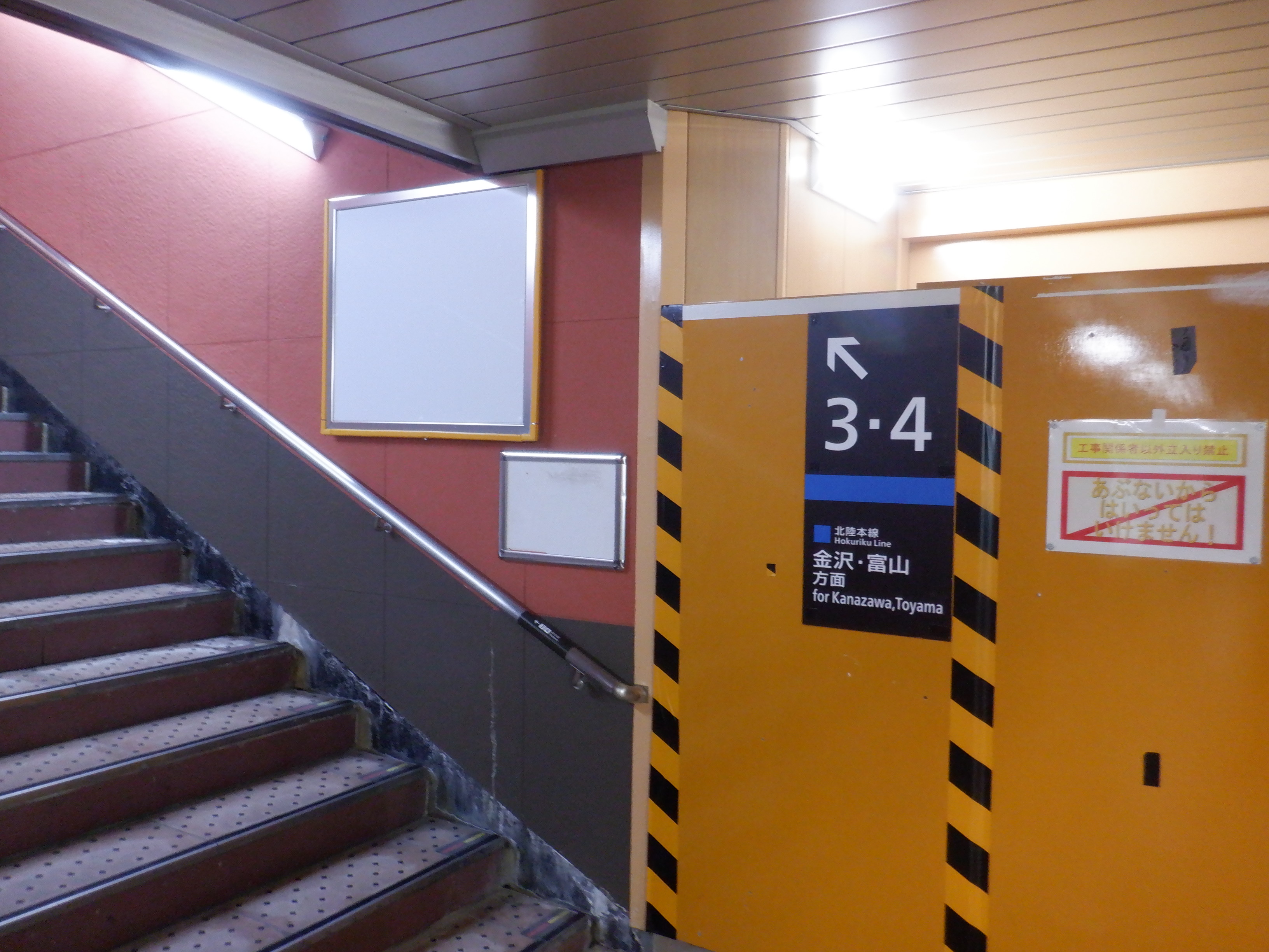 3・4番のりばの階段とエスカレーターの間の建植式駅名標。こちらもIRいしかわ鉄道のものになり、ロゴが隠されています。