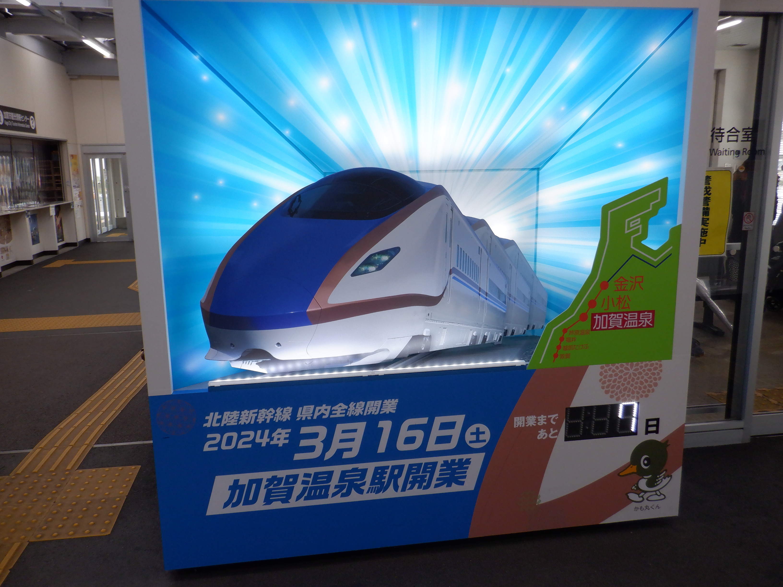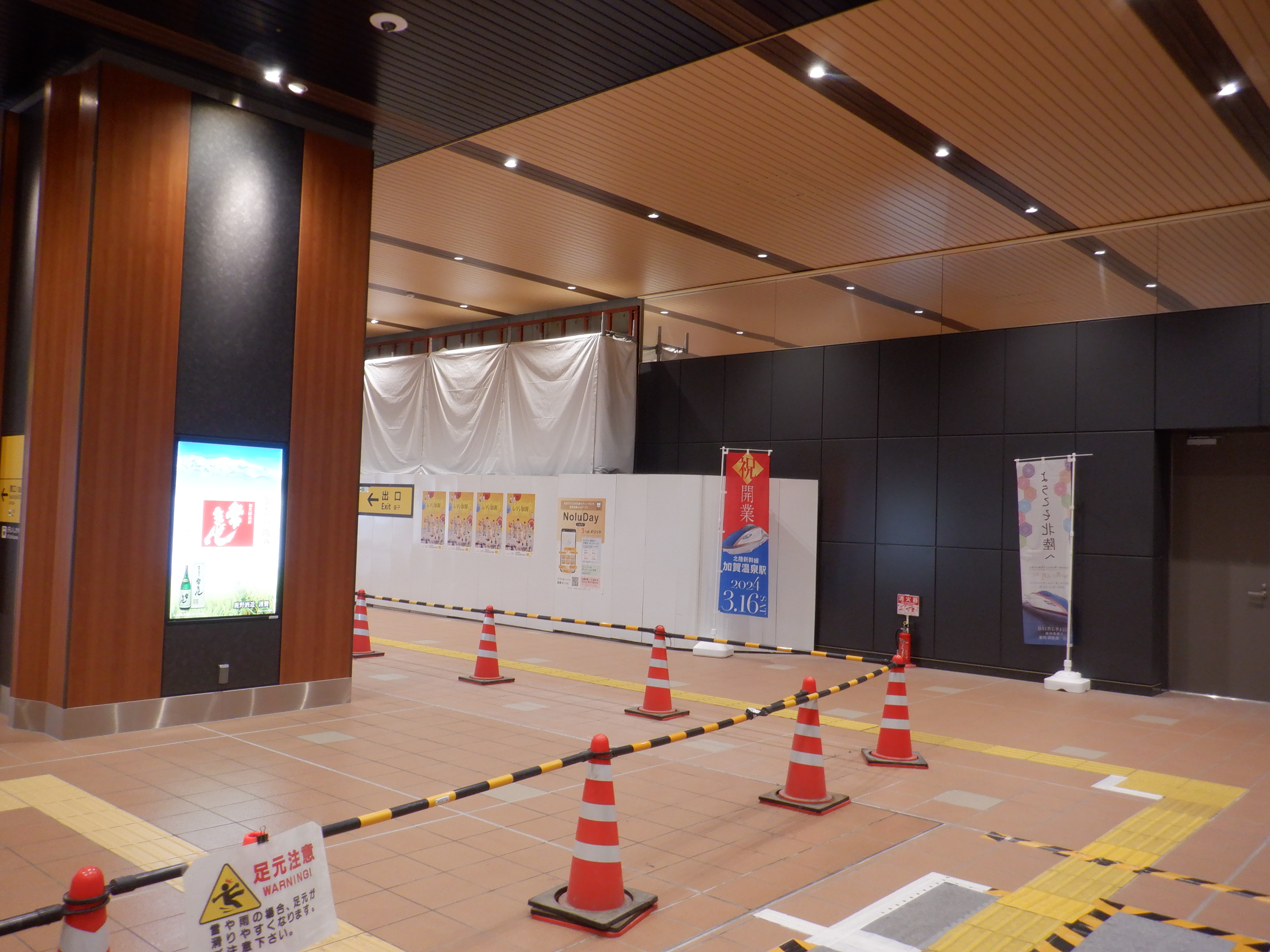 仮設駅舎内のコンビニはこの翌日をもって閉店となりました。この後、高架下部都市施設(コンビニ・待合室等)である「ゆのまち加賀」が開業する2024年12月まで駅構内にコンビニ等がなくなります。(新幹線改札横のカフェ等が開業します)