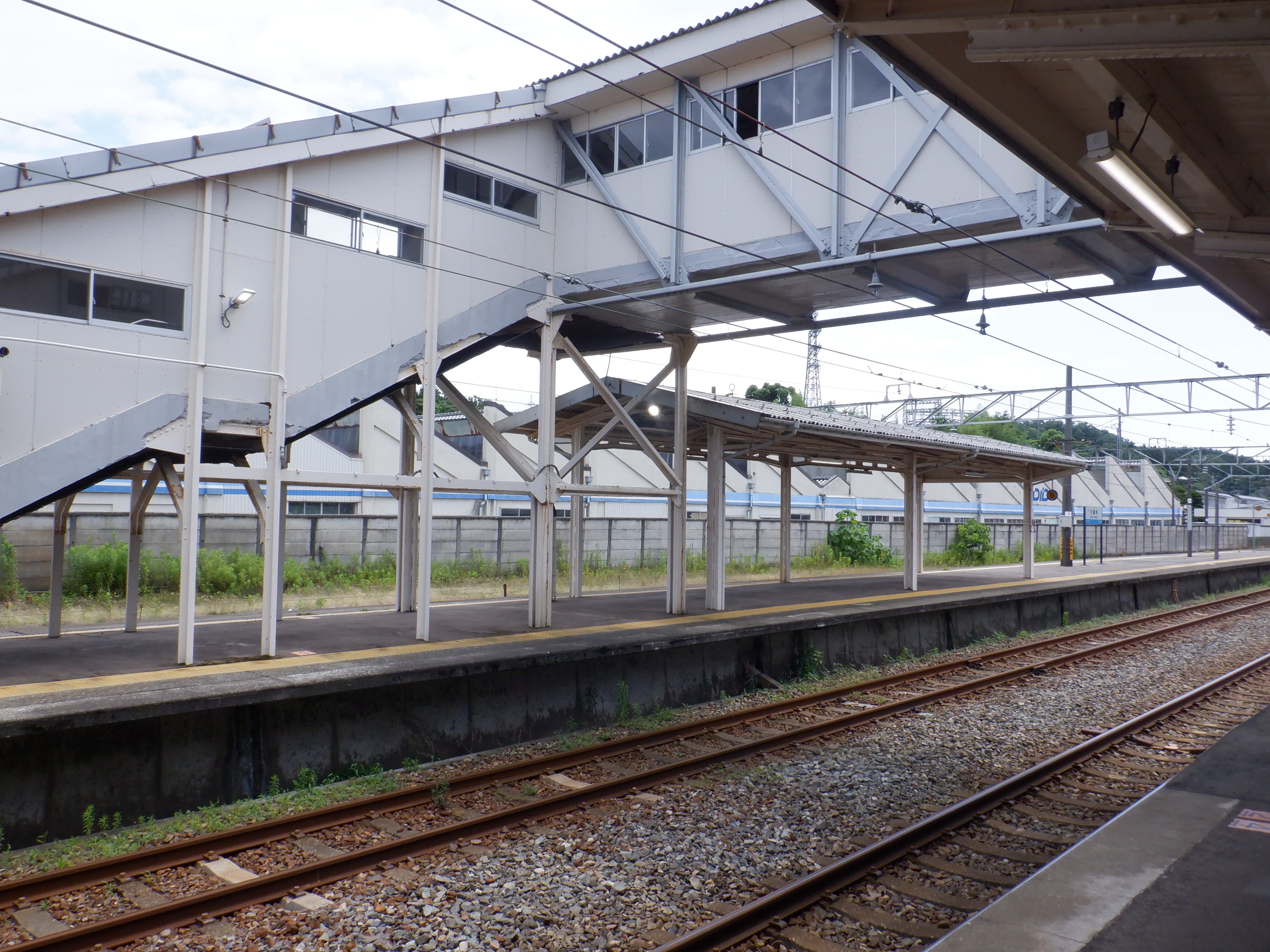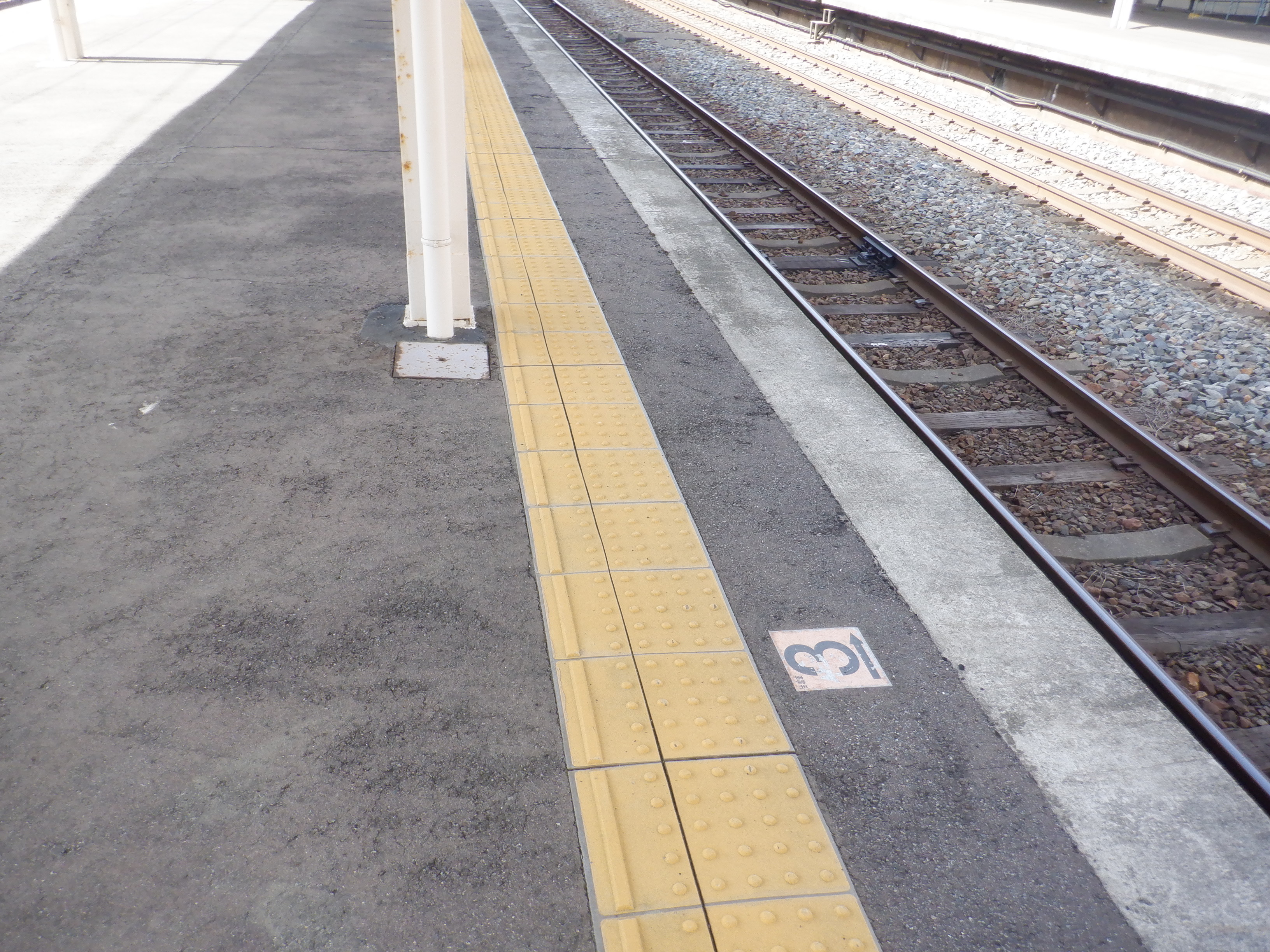 跨線橋前の上屋支柱に少し古レールの刻印が見えます。