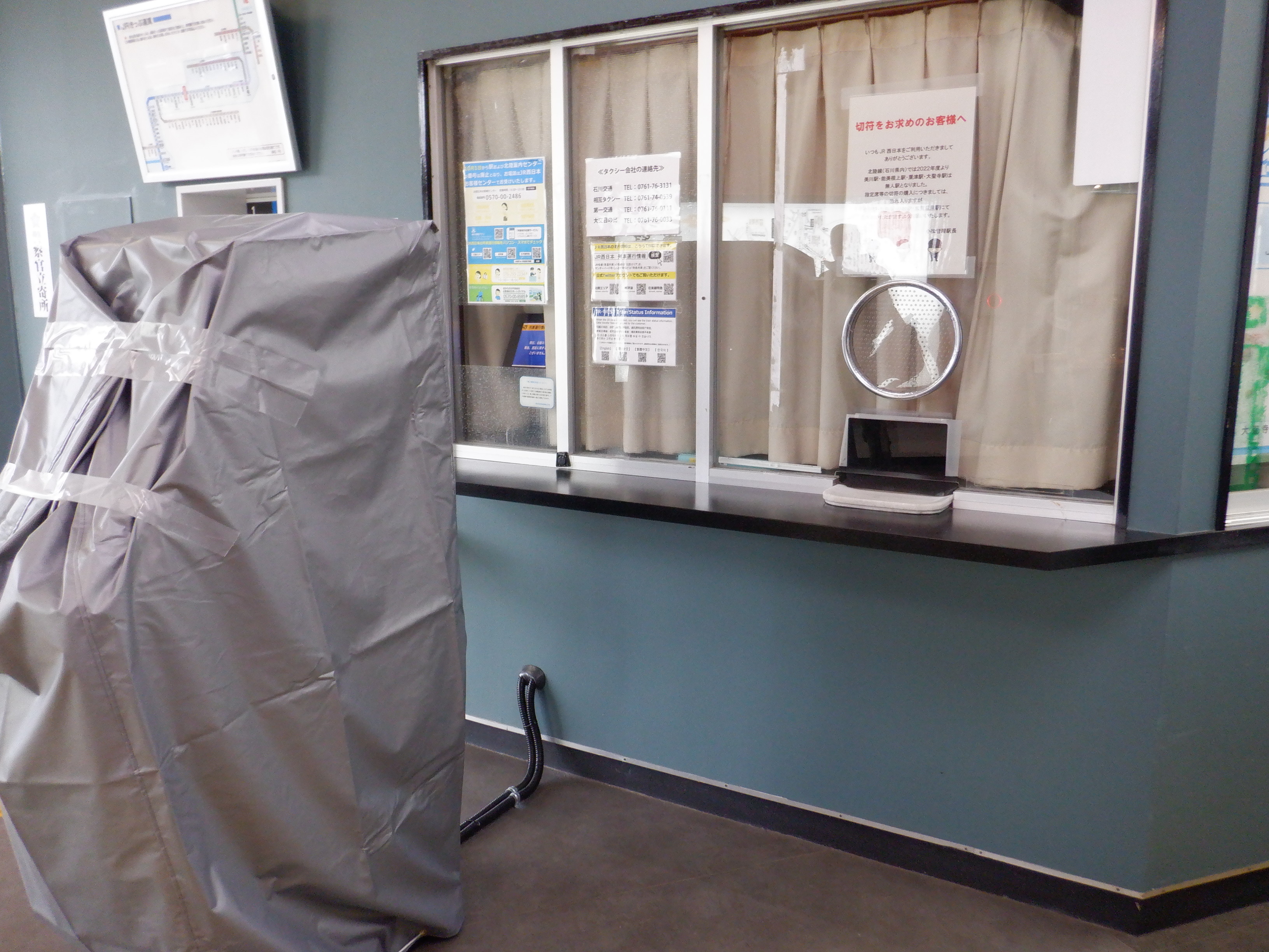 従来の券売機の前に新しい券売機がカバーを被った状態で置かれていました。