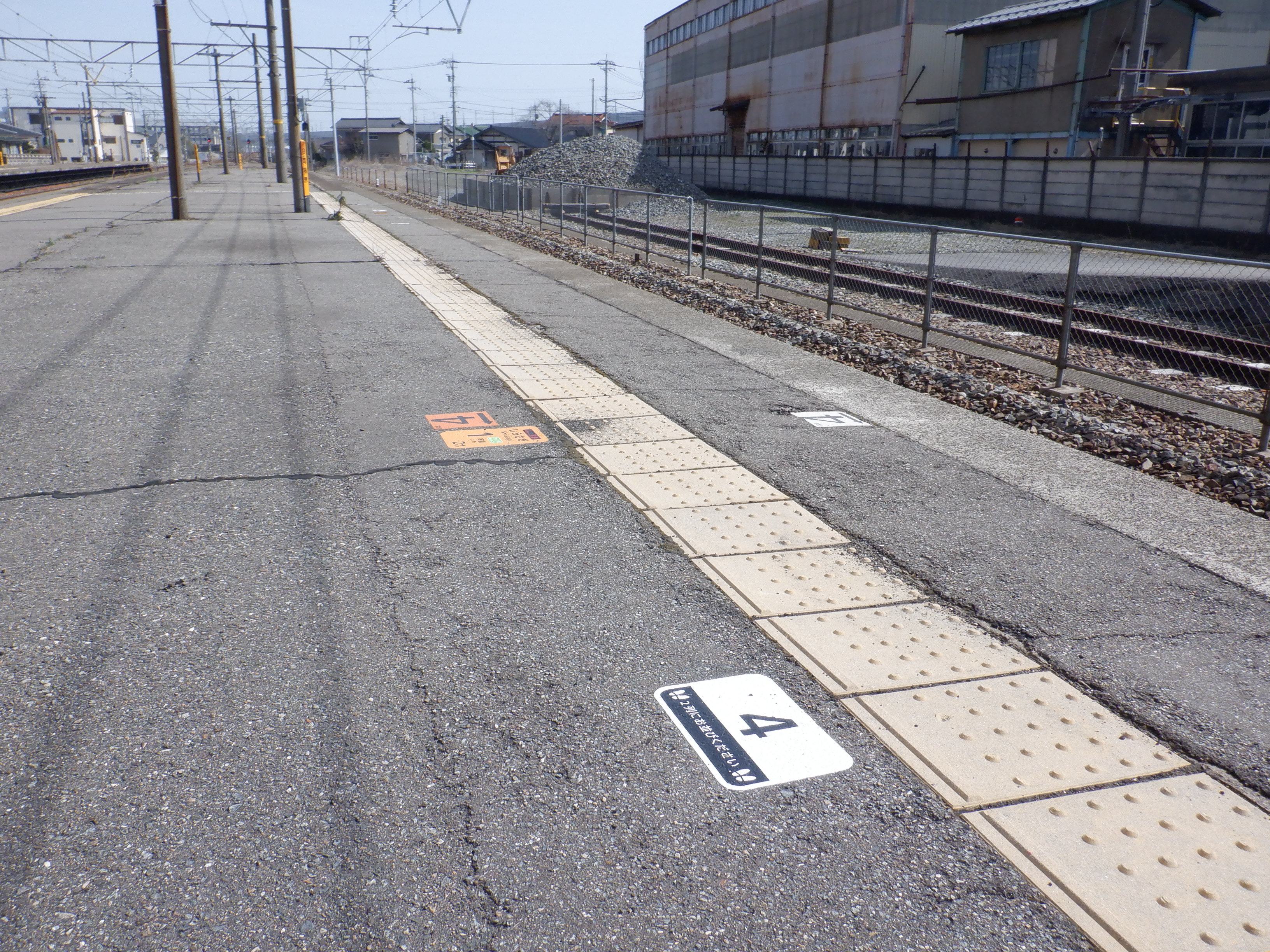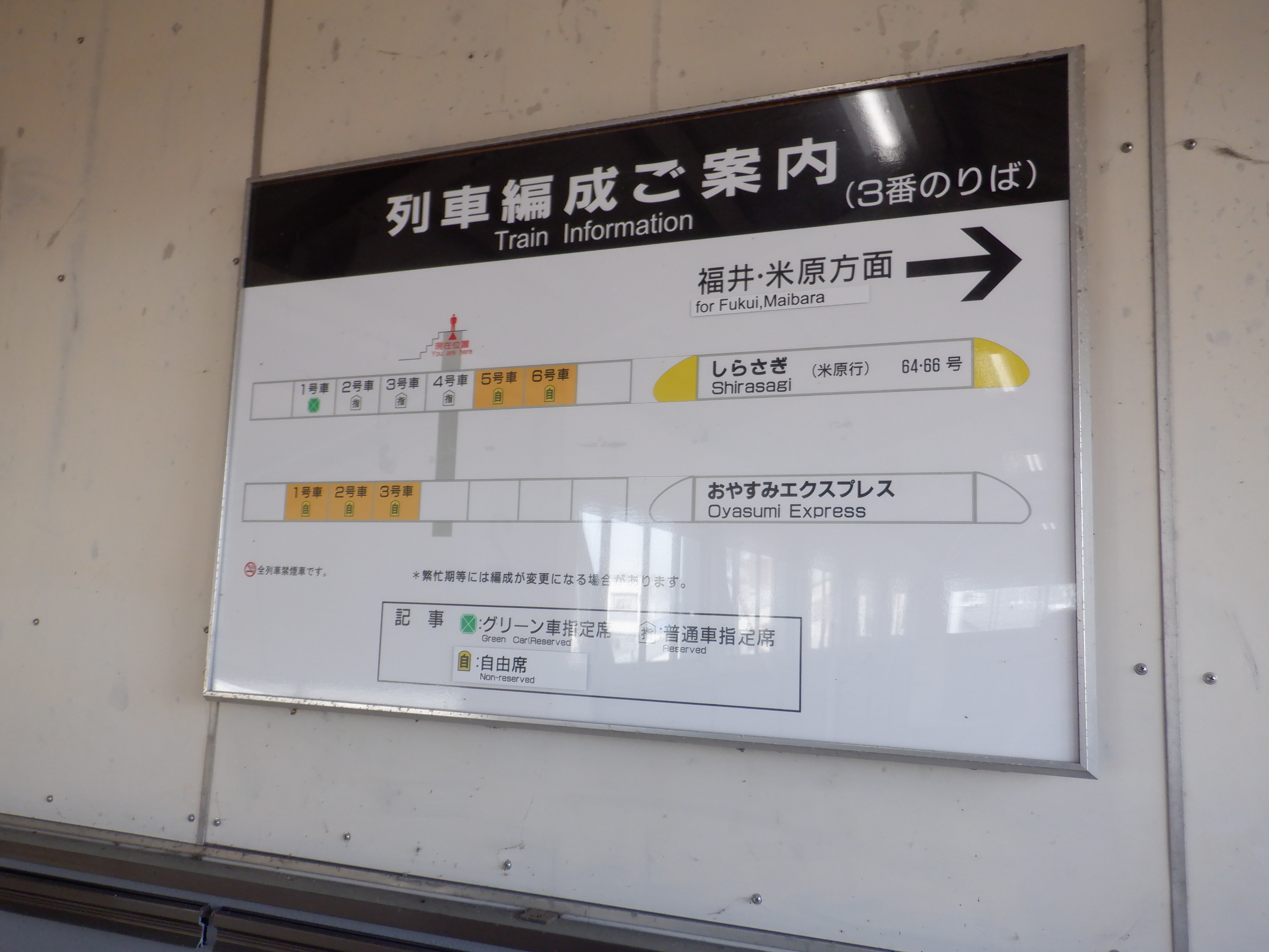 3番のりばの4両編成最後尾・乗車位置案内4としらさぎの乗車位置案内。