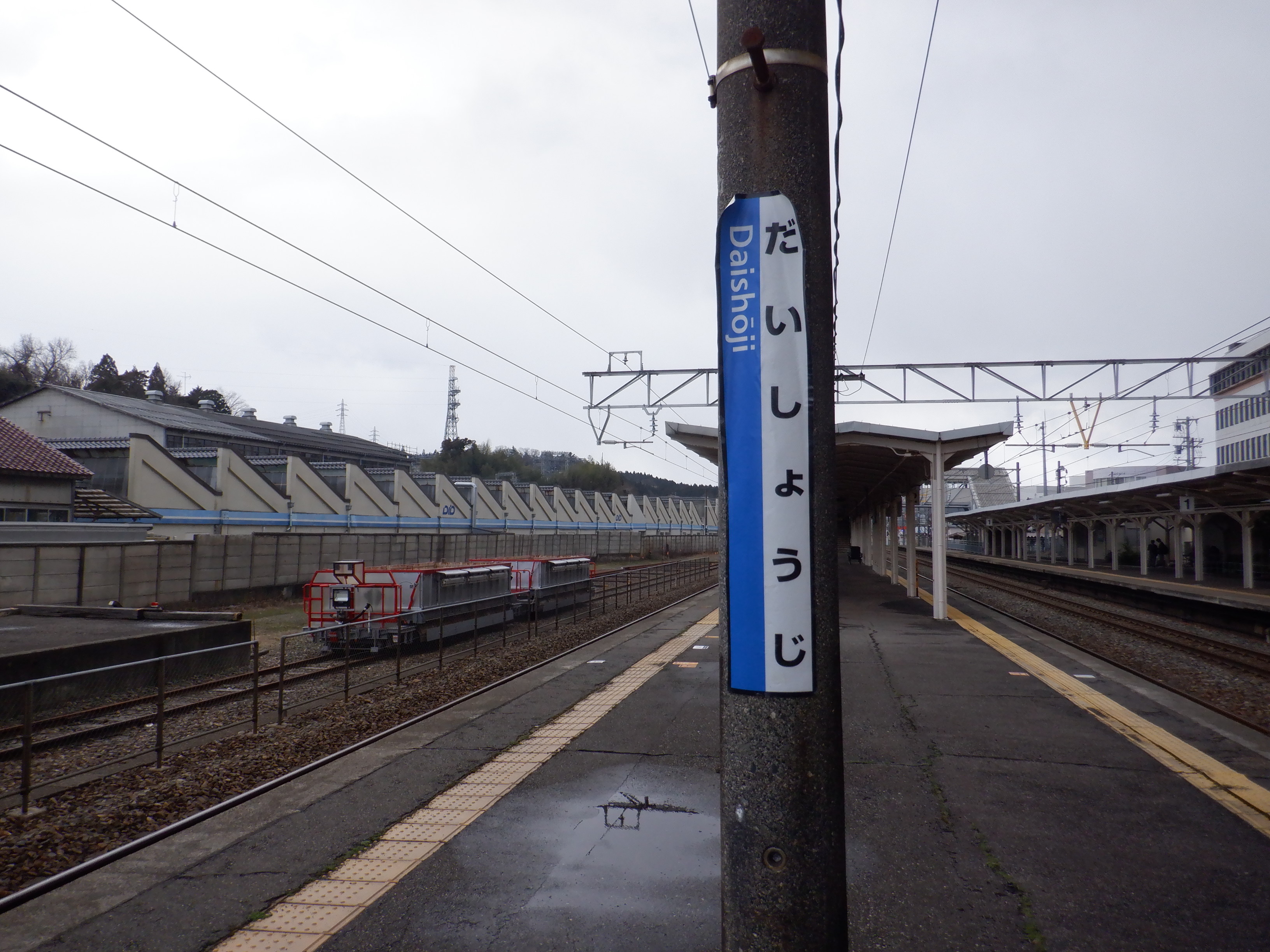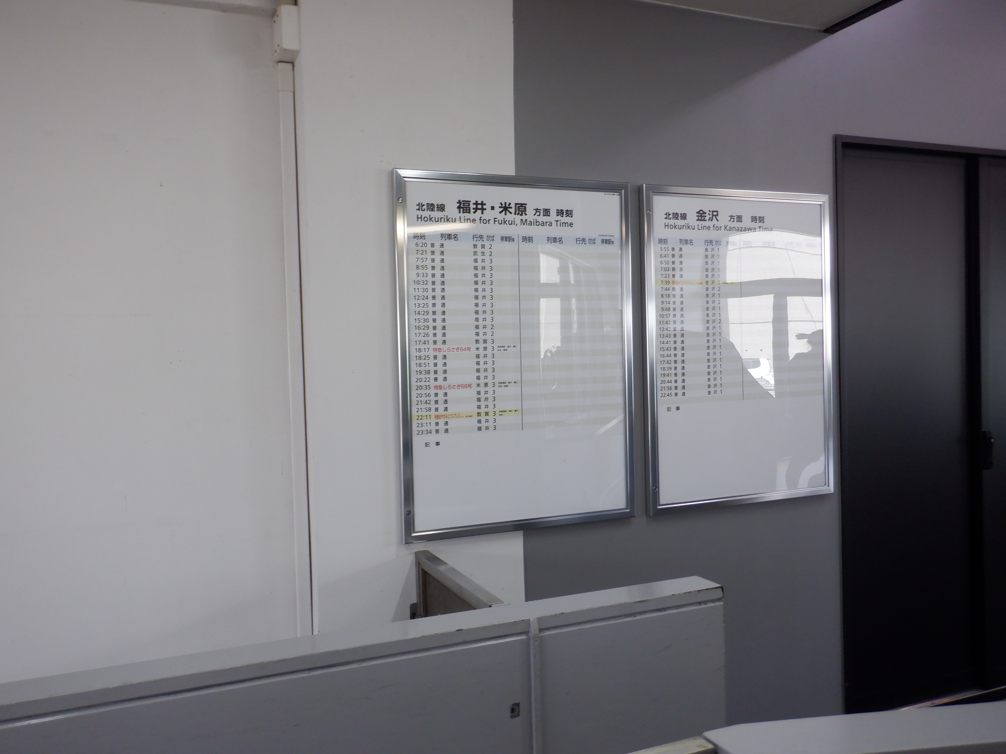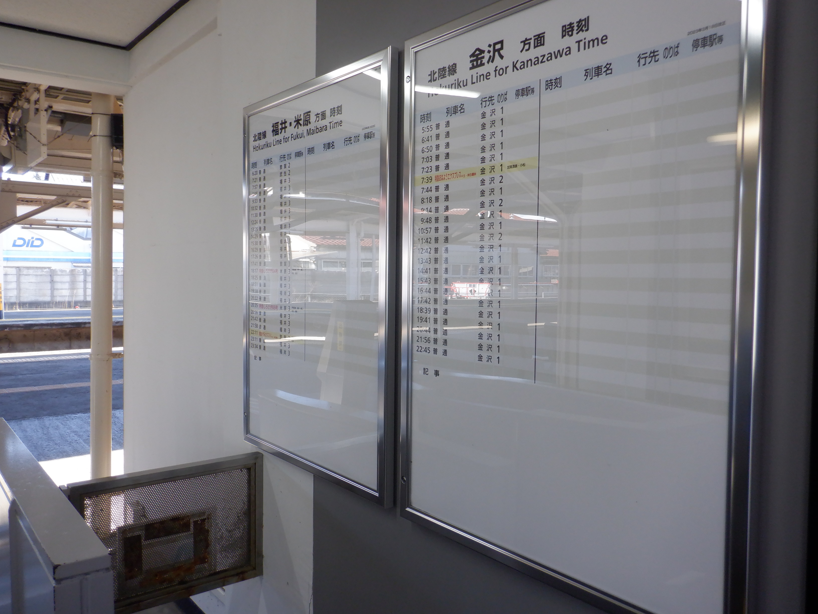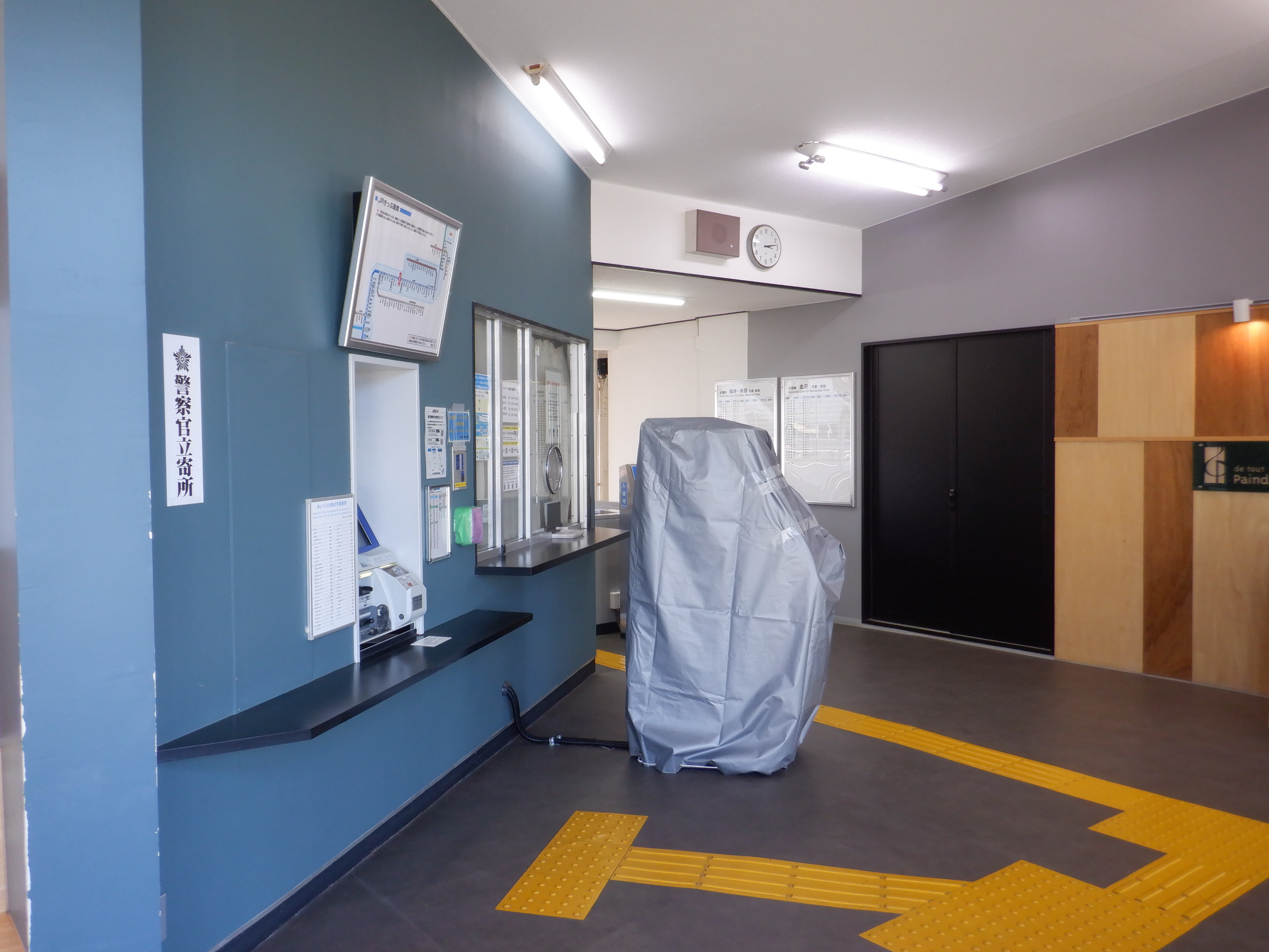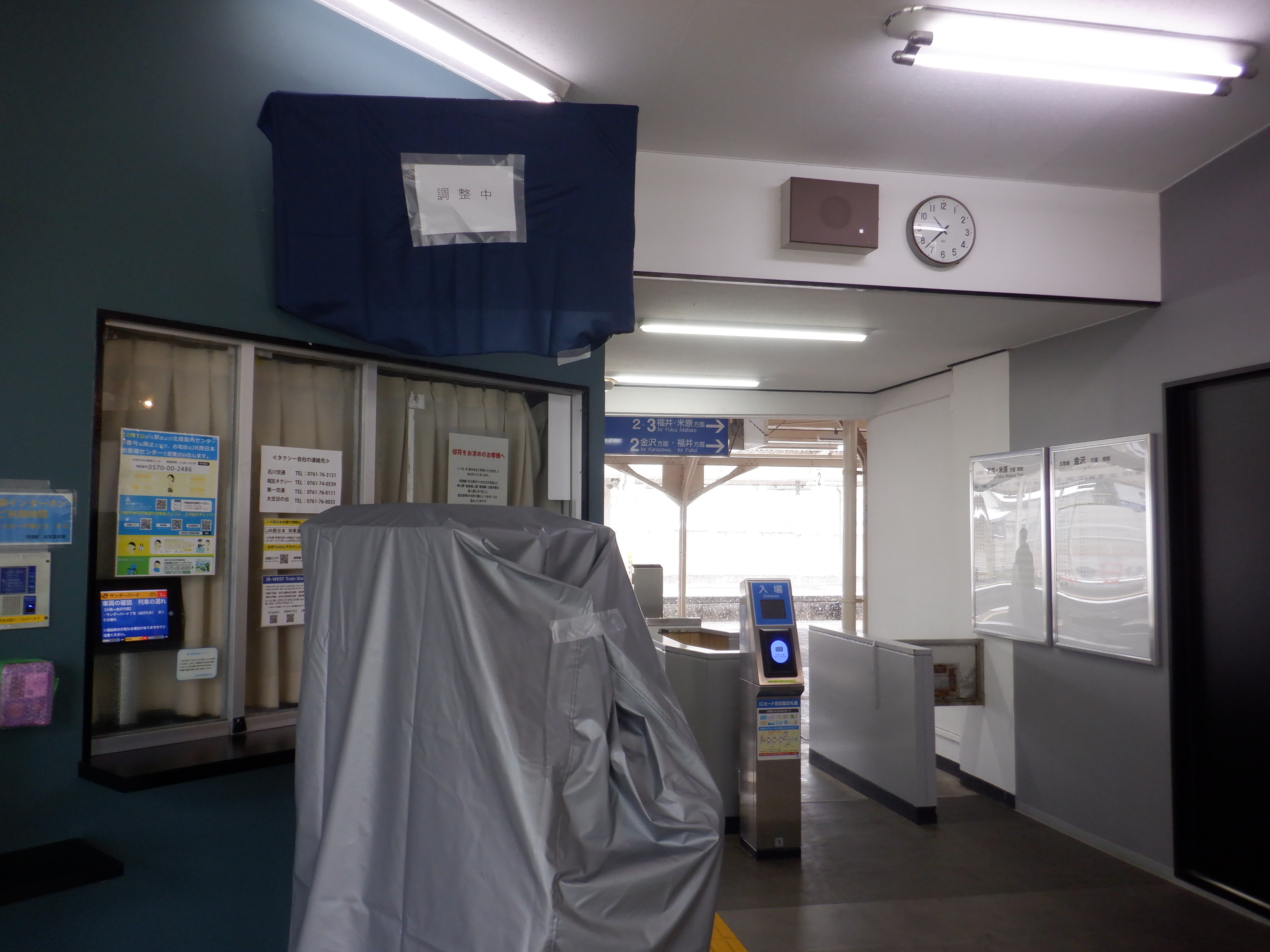 駅名標が新しくなってIR/ハピラインのロゴが隠されたもの、JRものにIR/ハピラインのロゴが貼られ隠されたものになりました。また、階段や改札口のところの案内も新しいものの上に仮のものが貼られています。駅舎入口の時計跡にIRのロゴが貼られるようです。