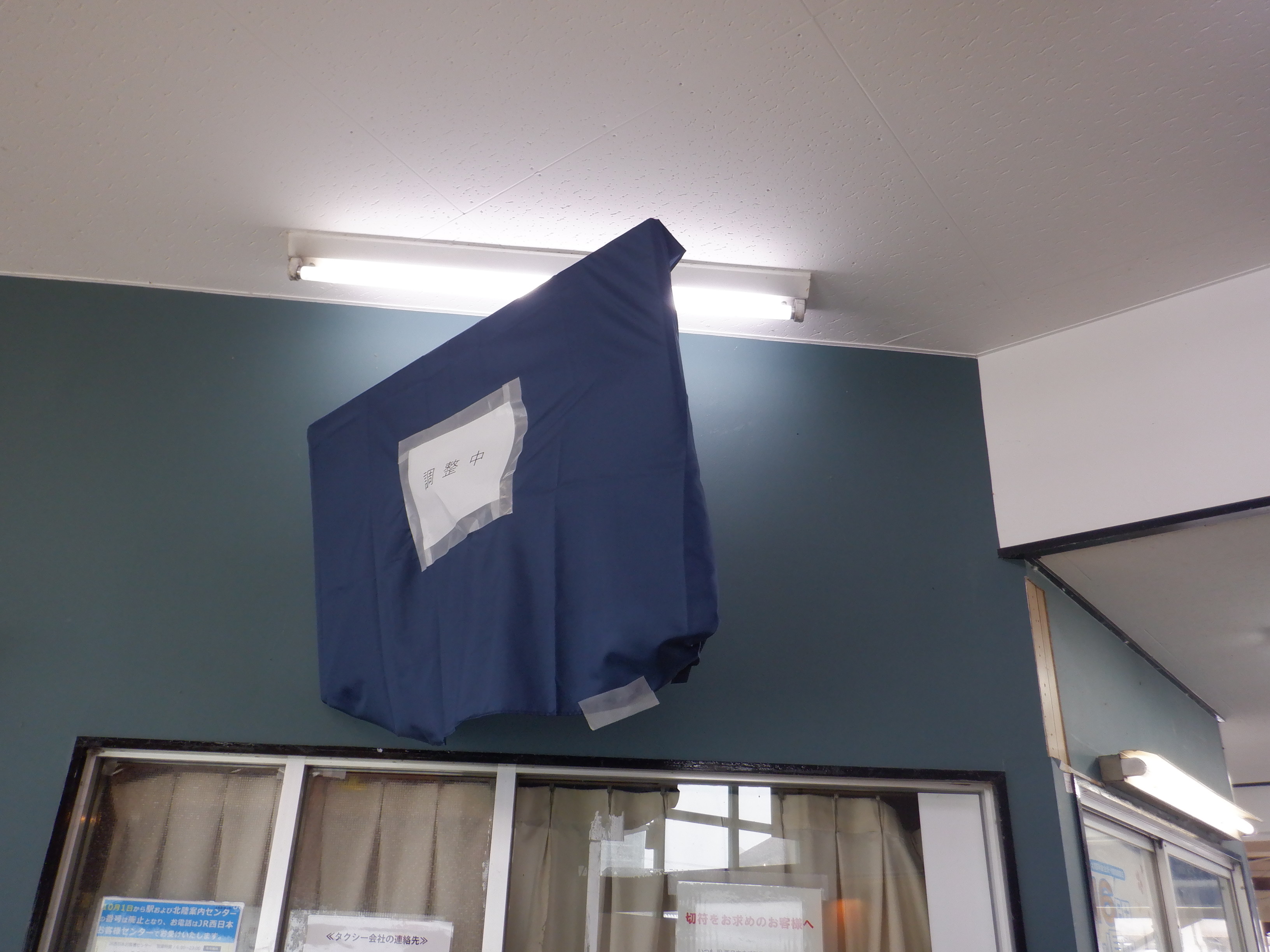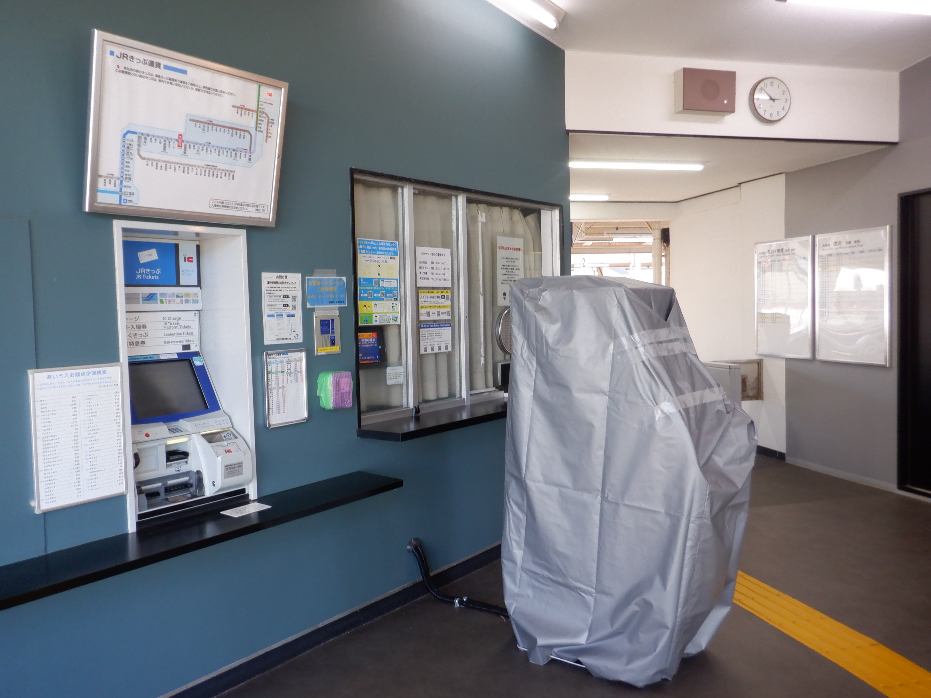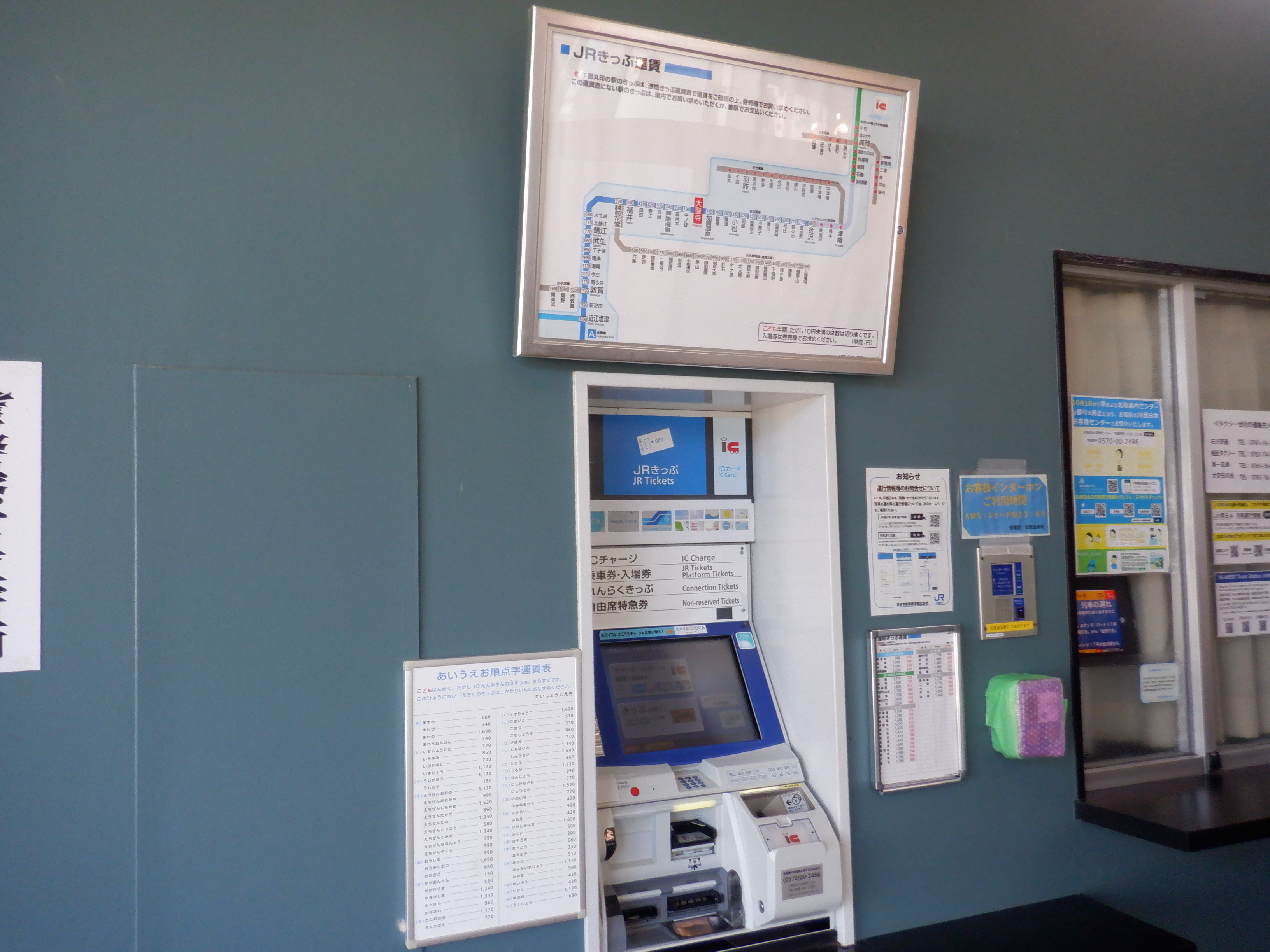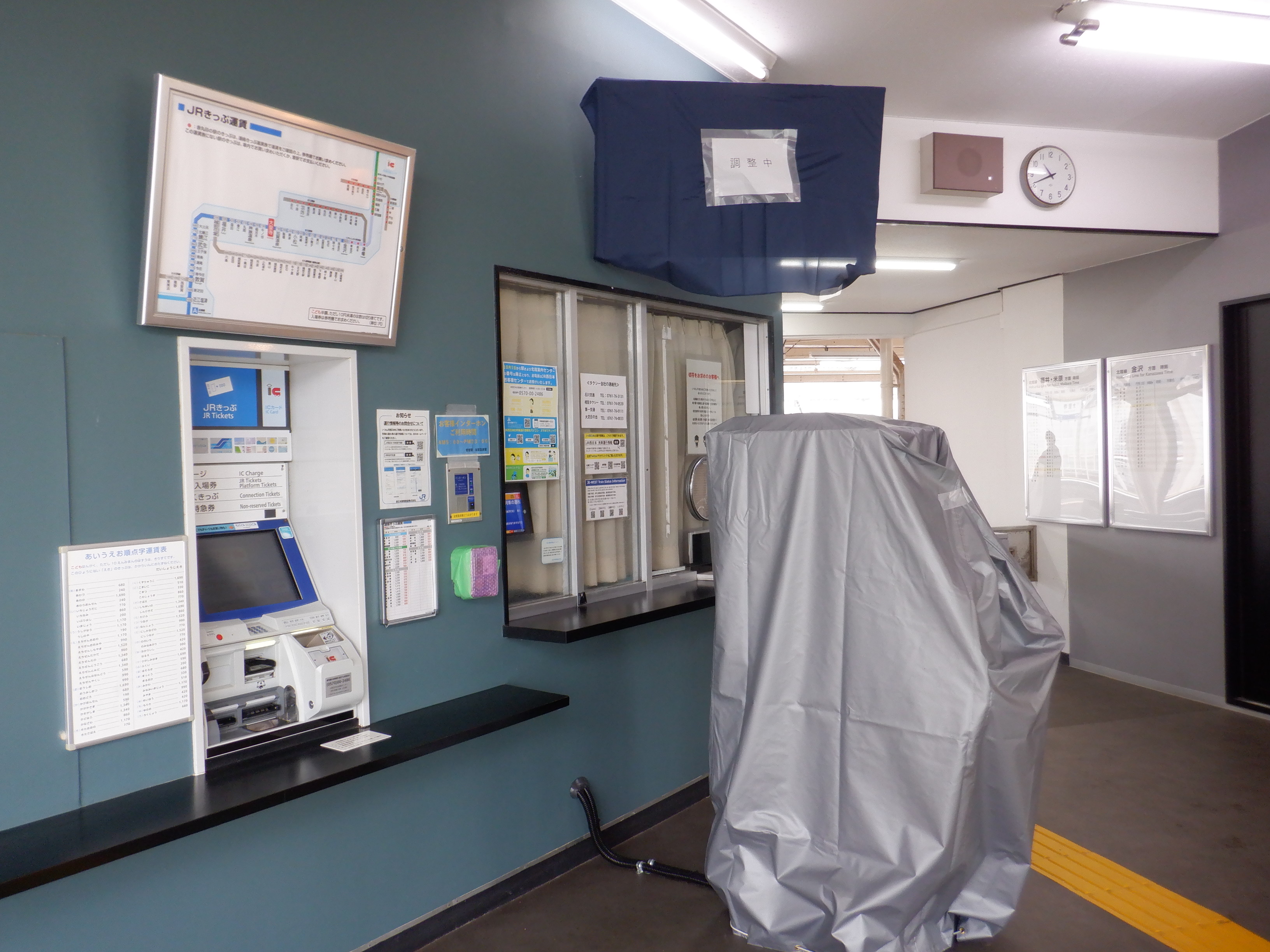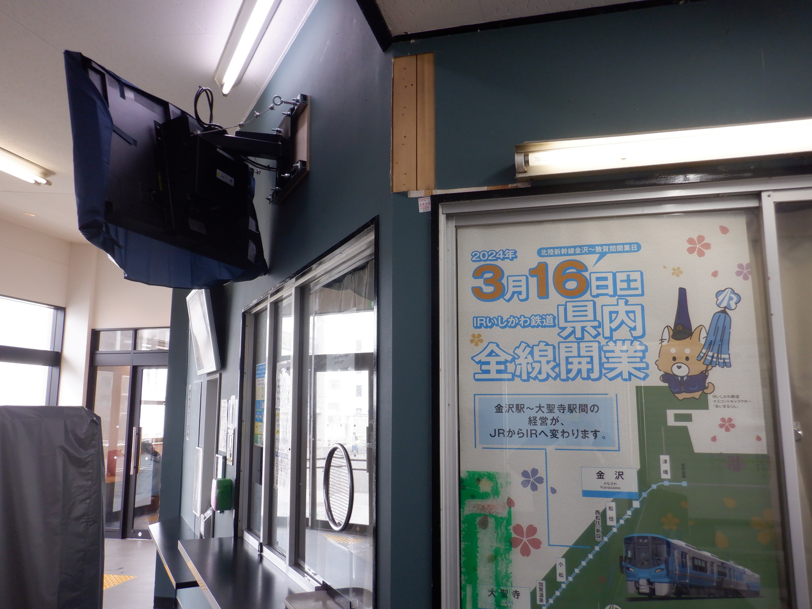 みどりの窓口看板跡とIRいしかわ鉄道県内全線開業ポスター。
