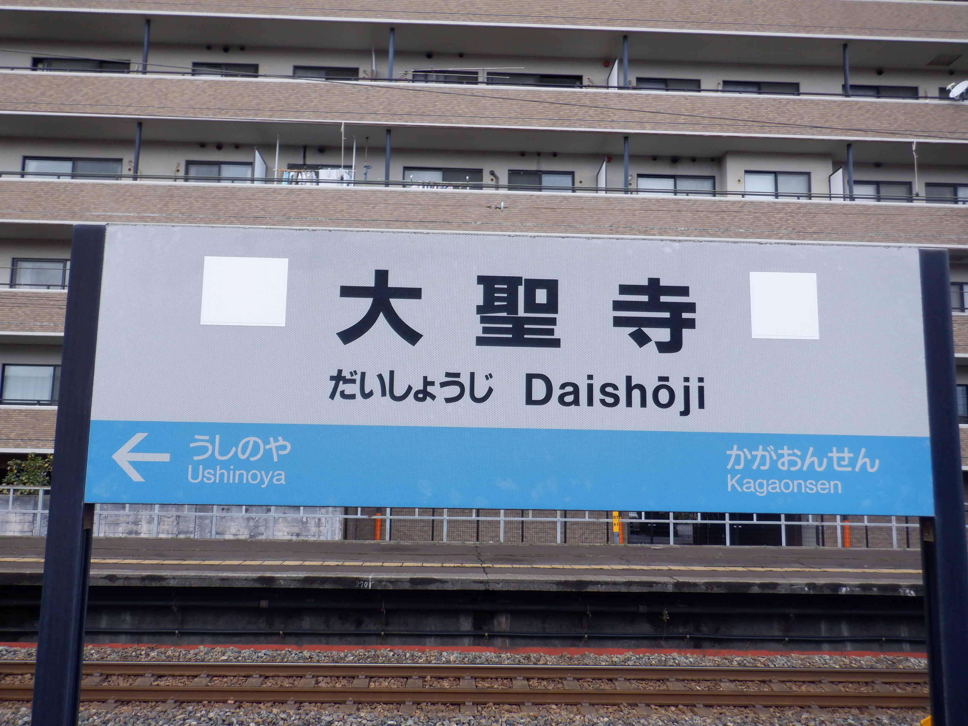 1番のりば牛ノ谷駅側の駅名標。こちらも2社のロゴが貼られて隠されています。