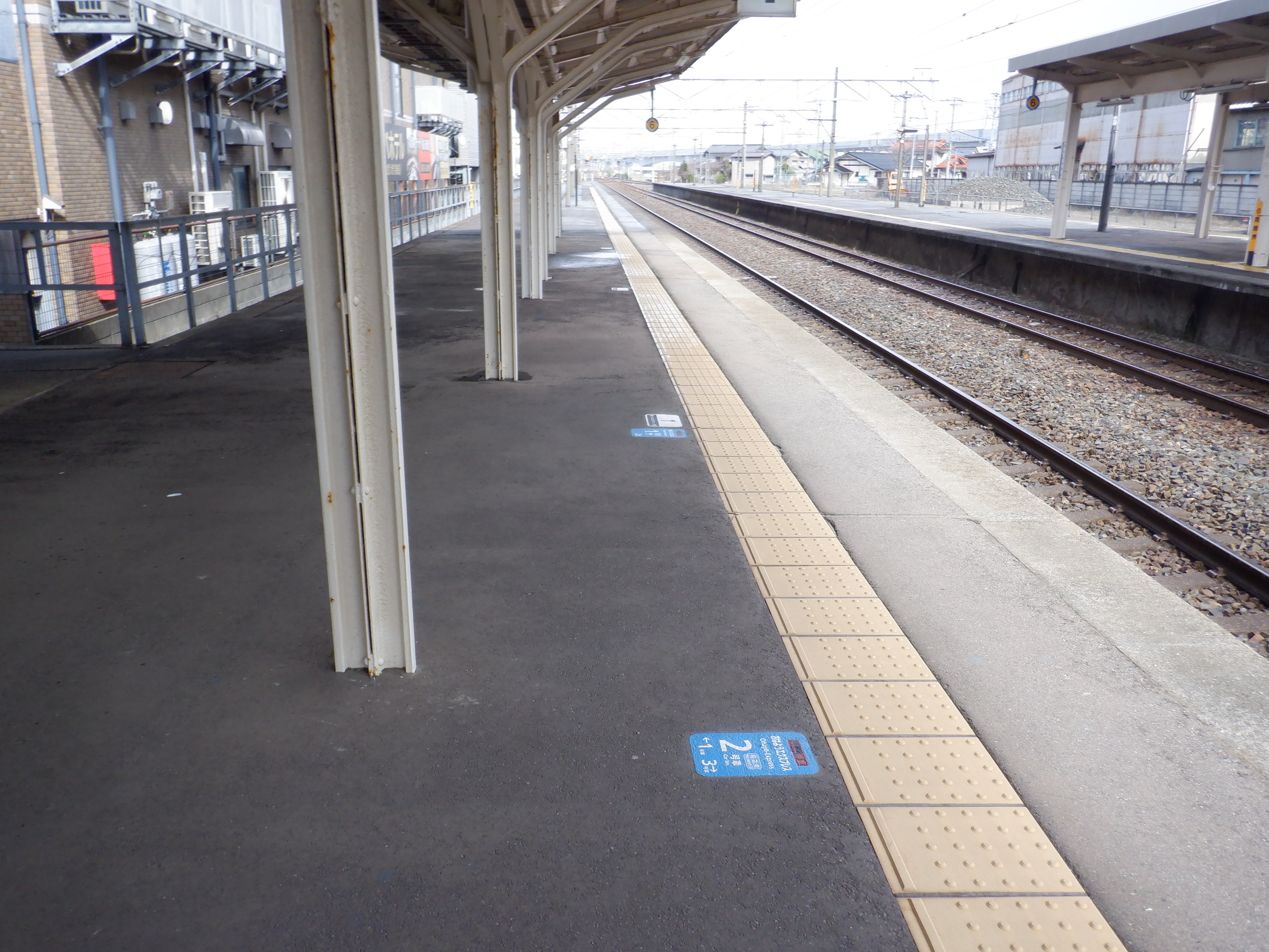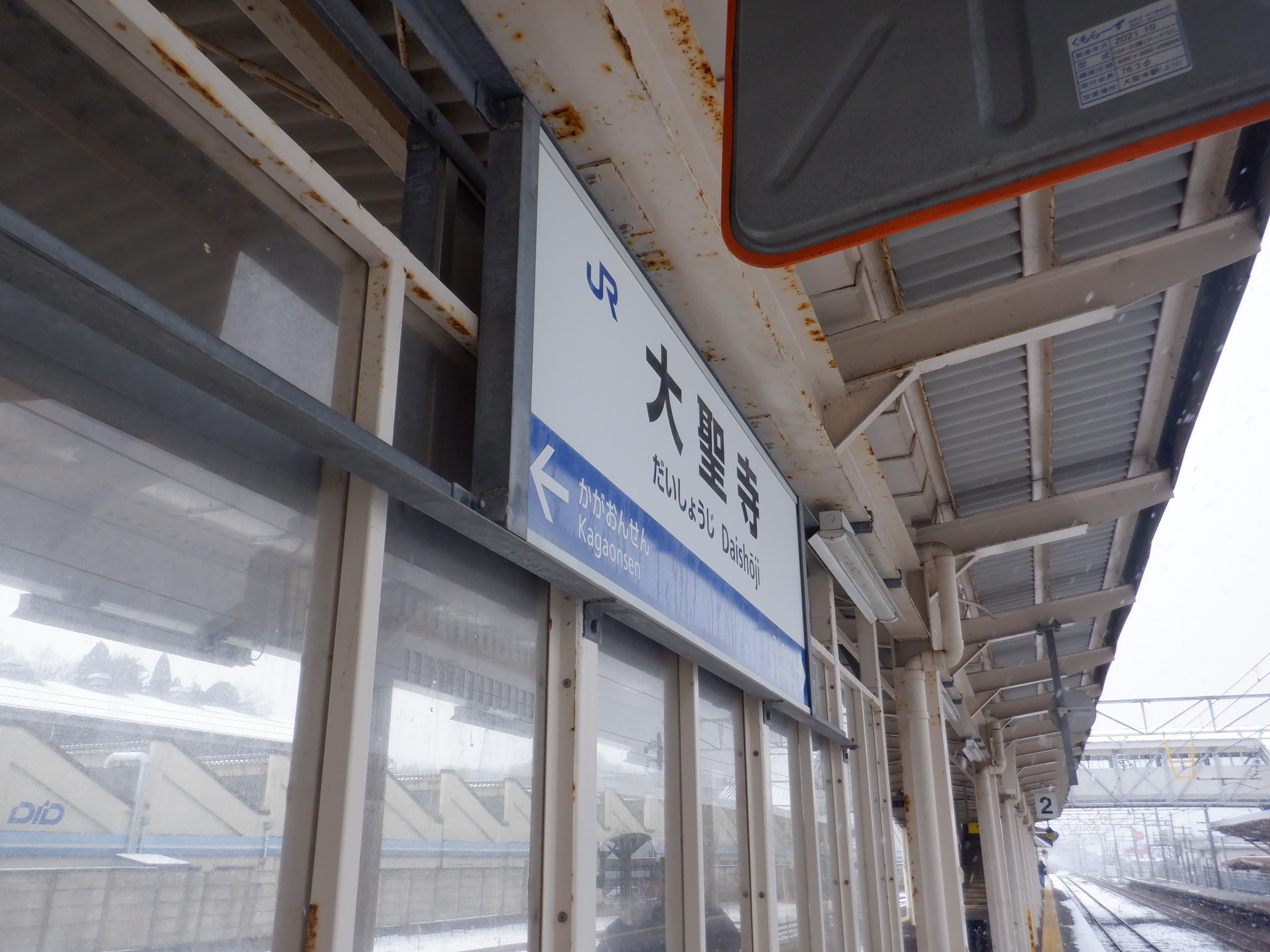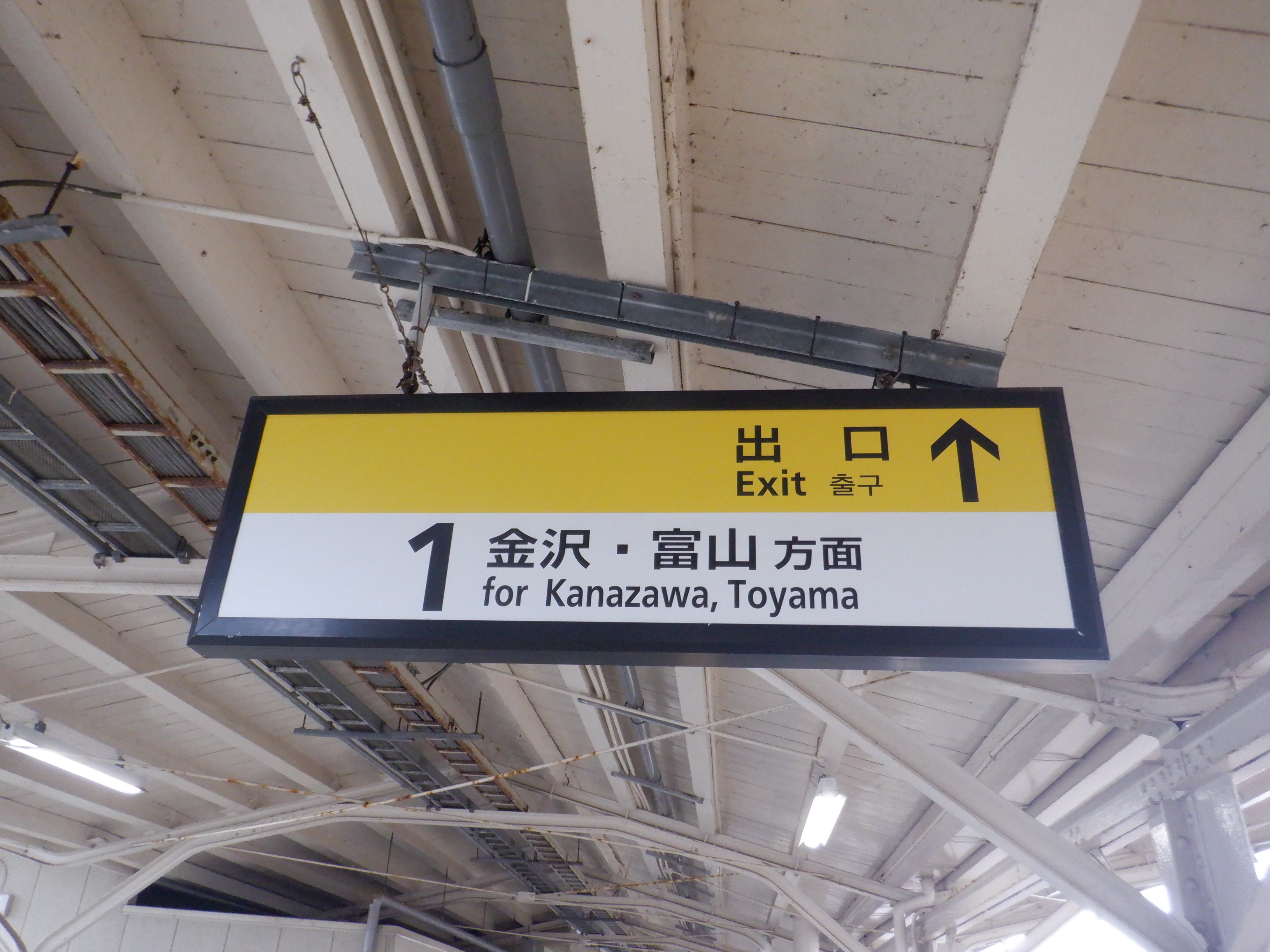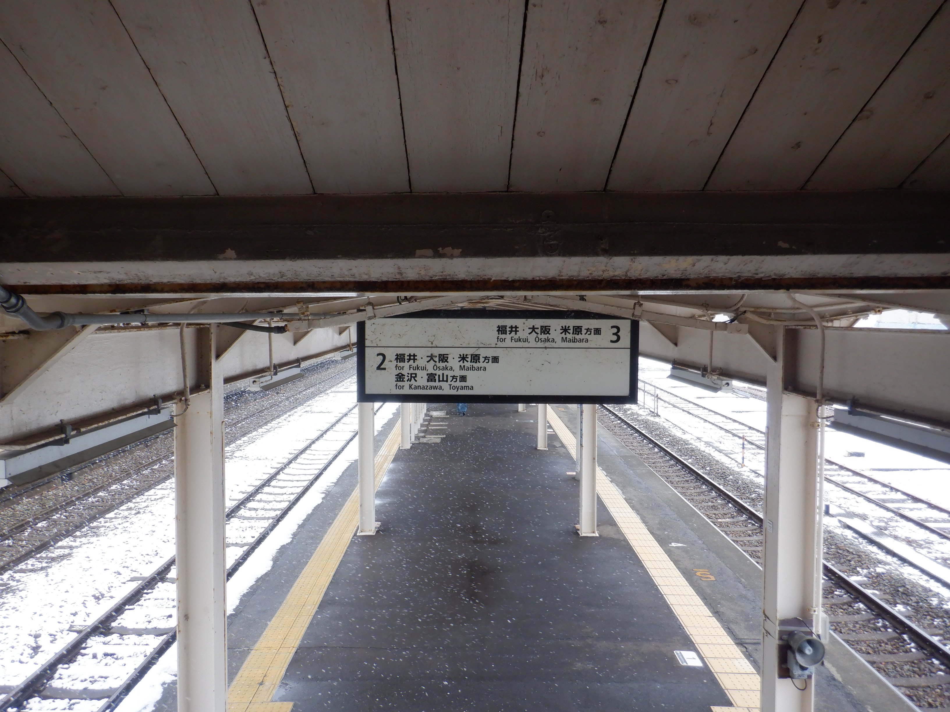 2・3番のりば上屋付近の駅名標。こちらはIRいしかわ鉄道仕様のものになって、ロゴが隠されています。
