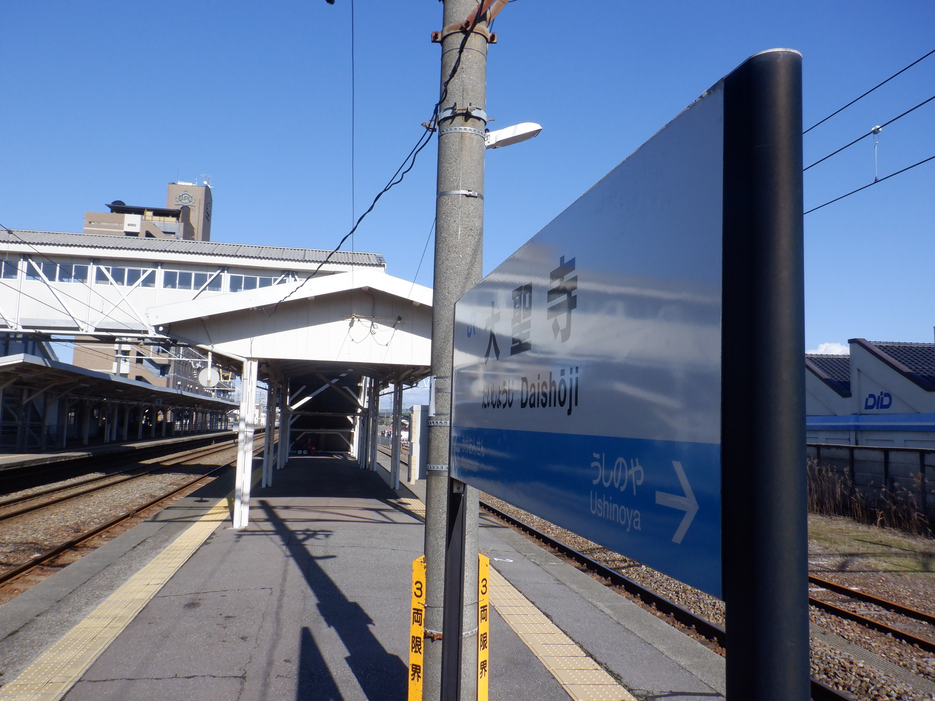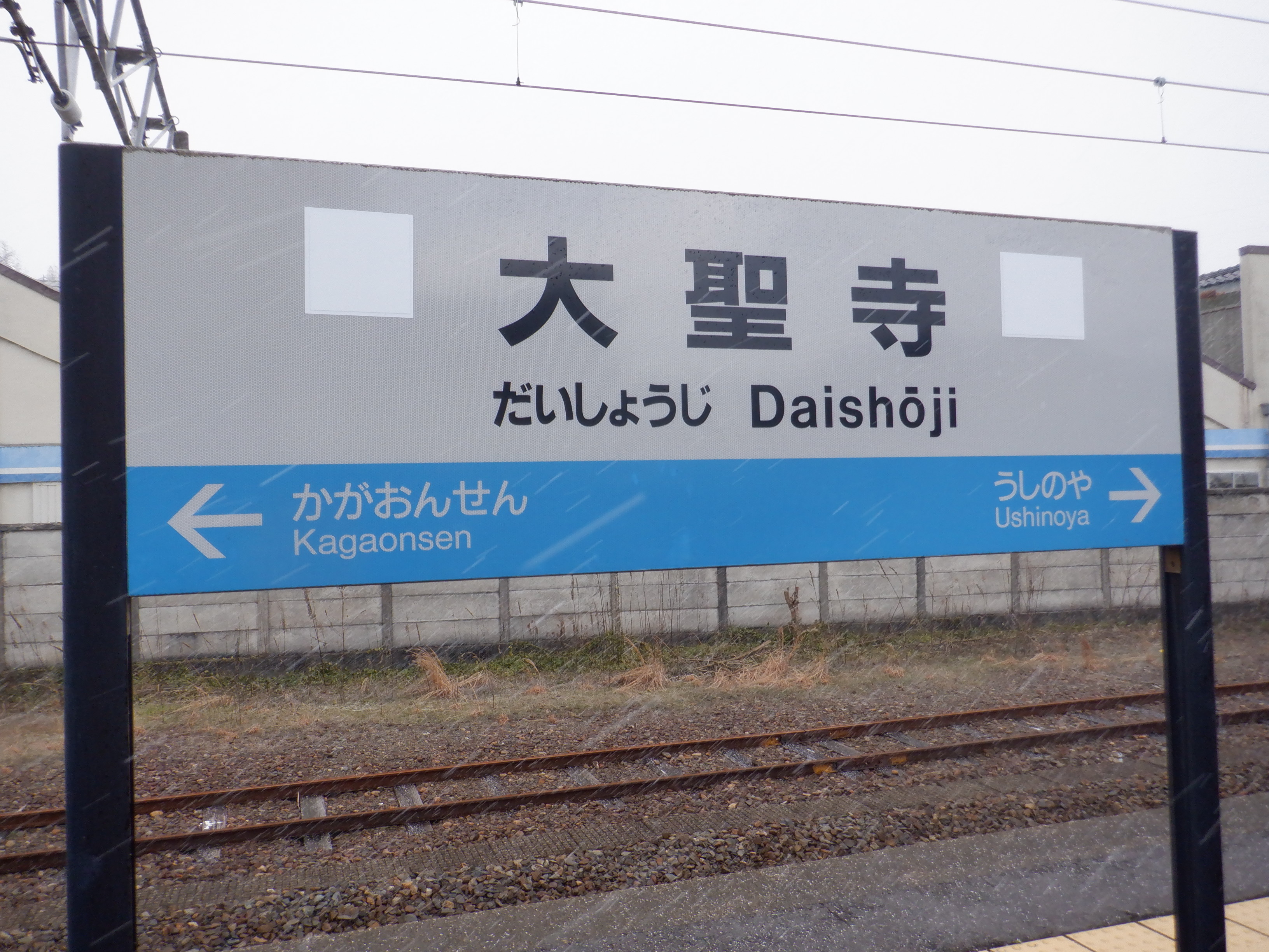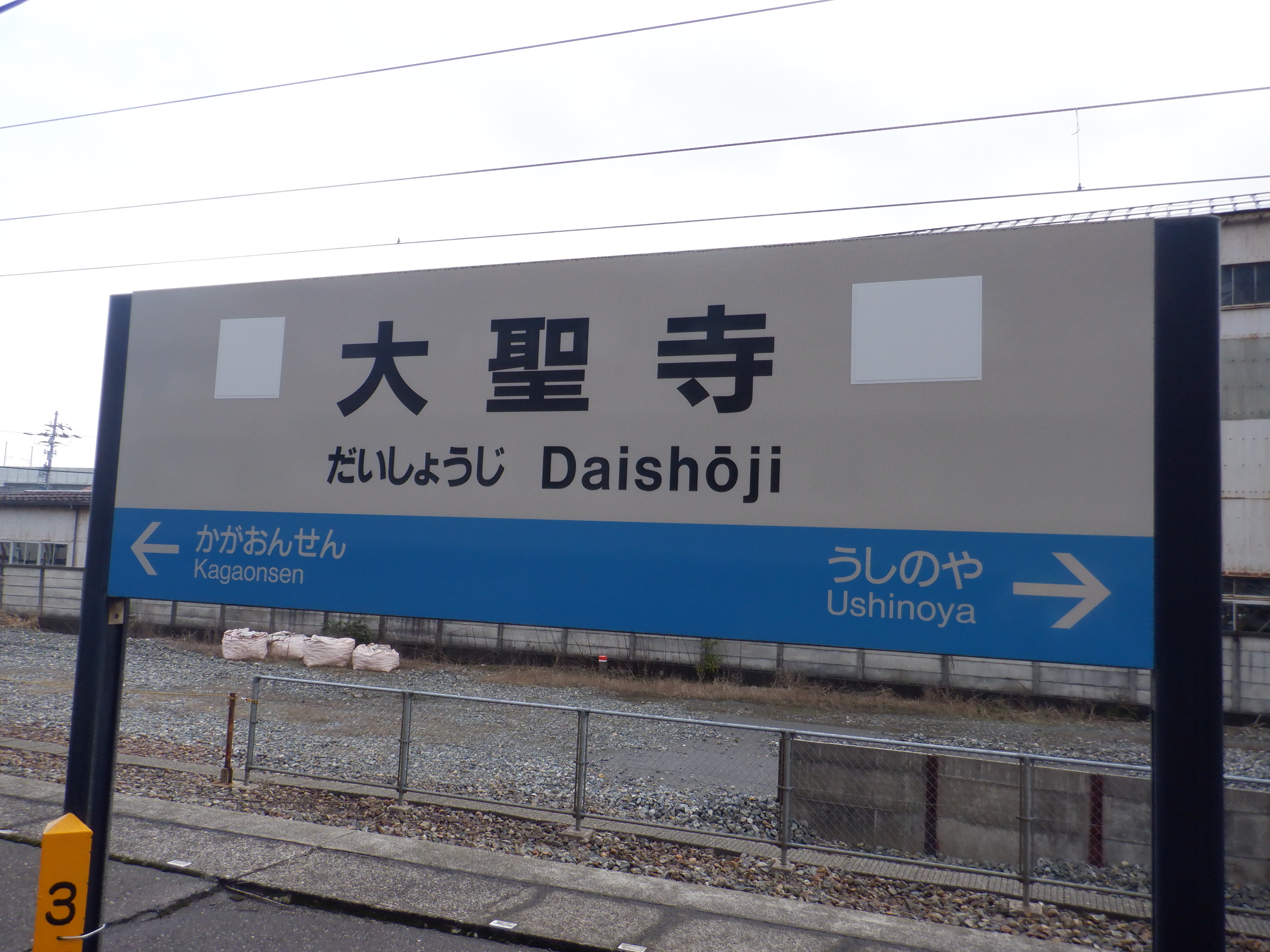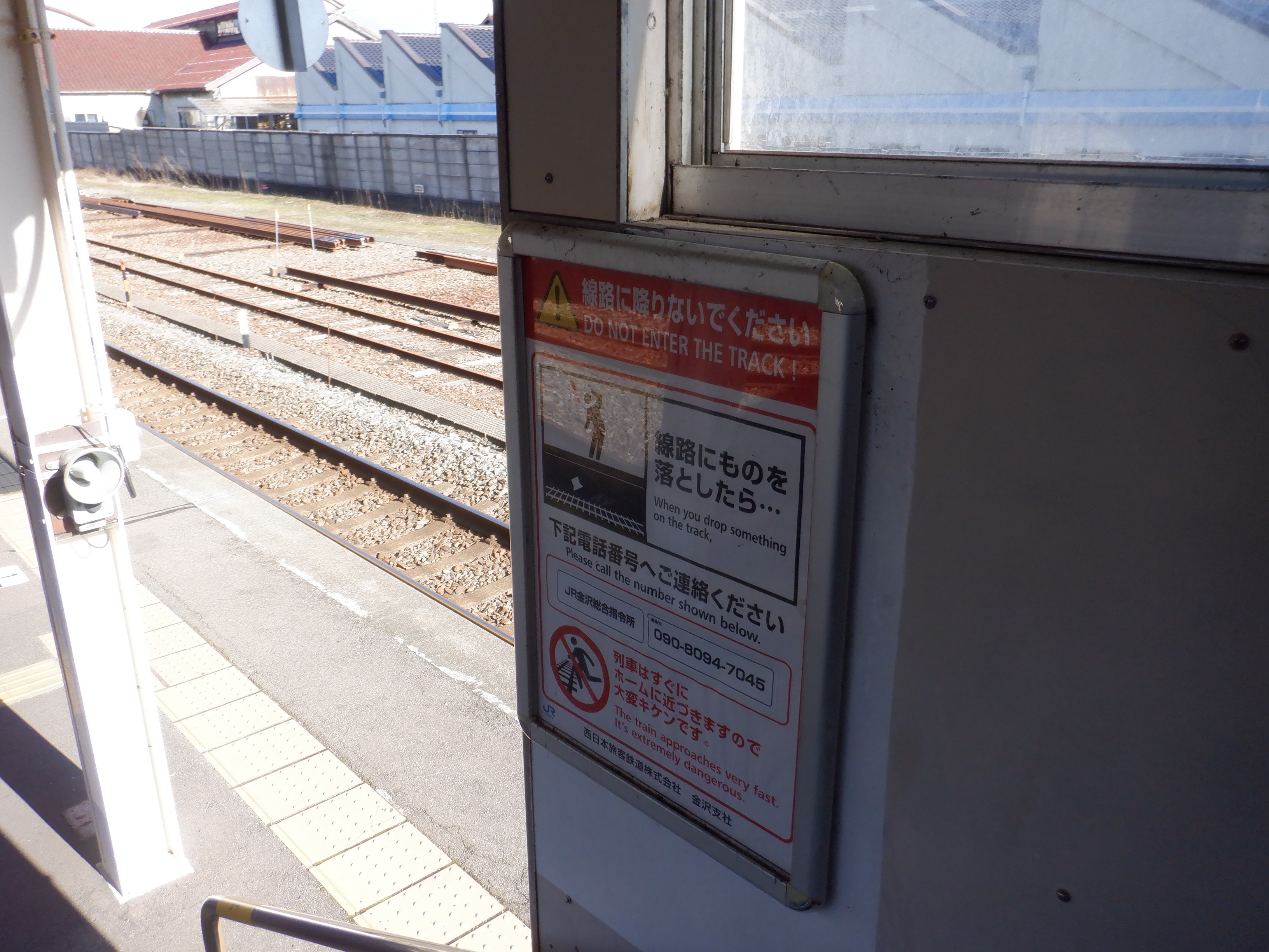 2・3番のりば上屋付近の駅名標。こちらはIRいしかわ鉄道仕様のものになって、ロゴが隠されています。