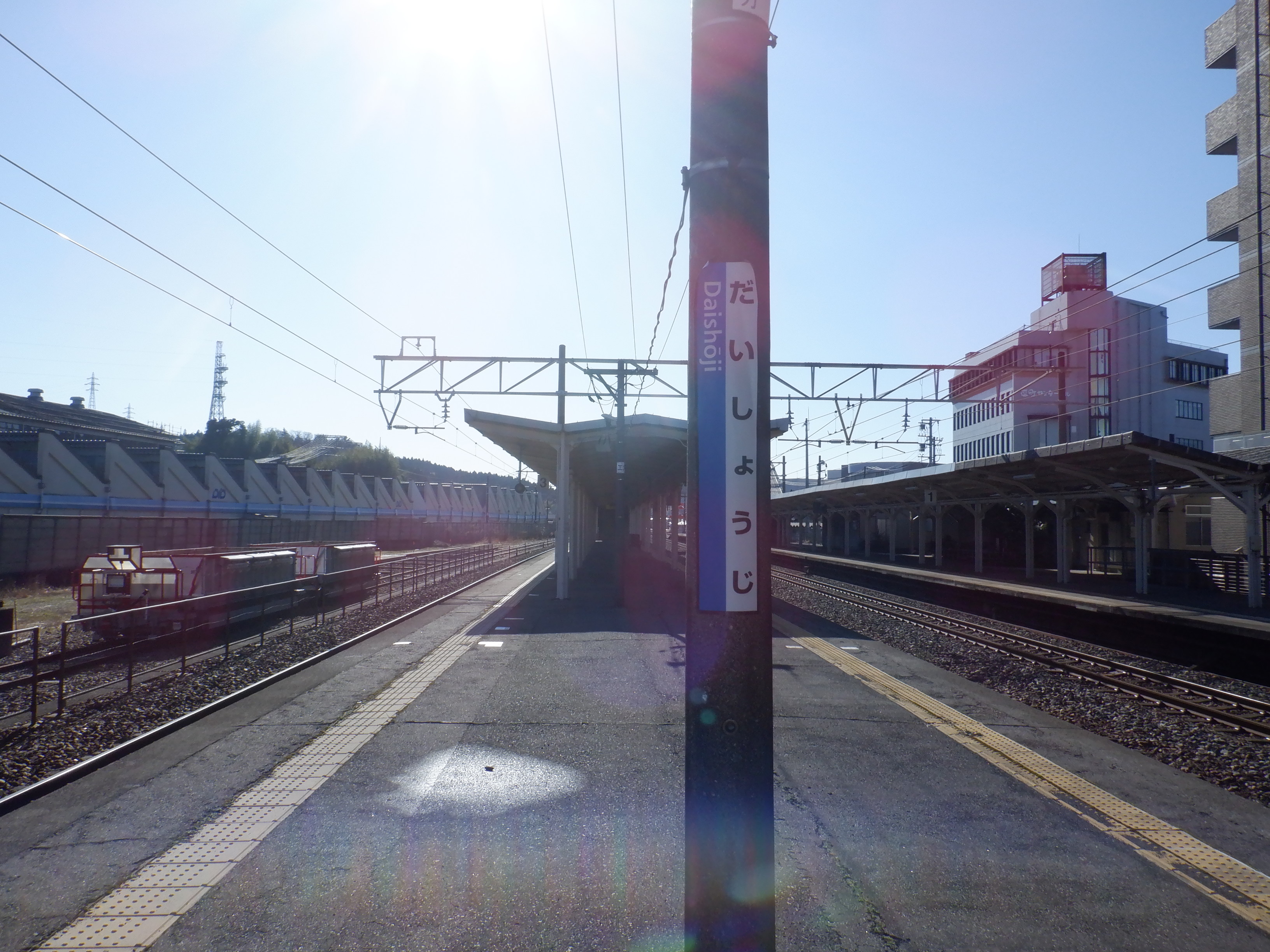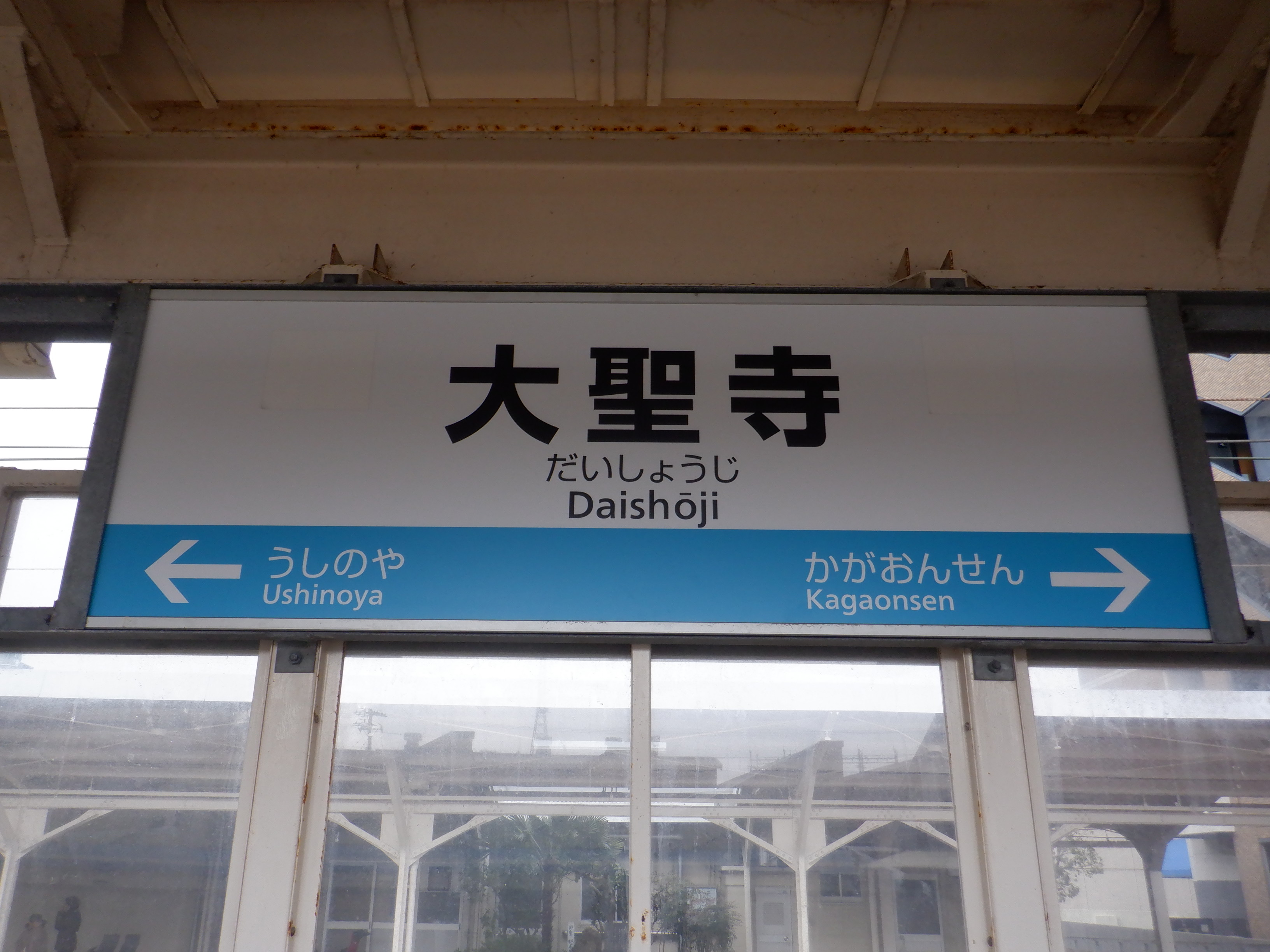 1番のりばから見た2・3番のりば上屋付近の駅名標。