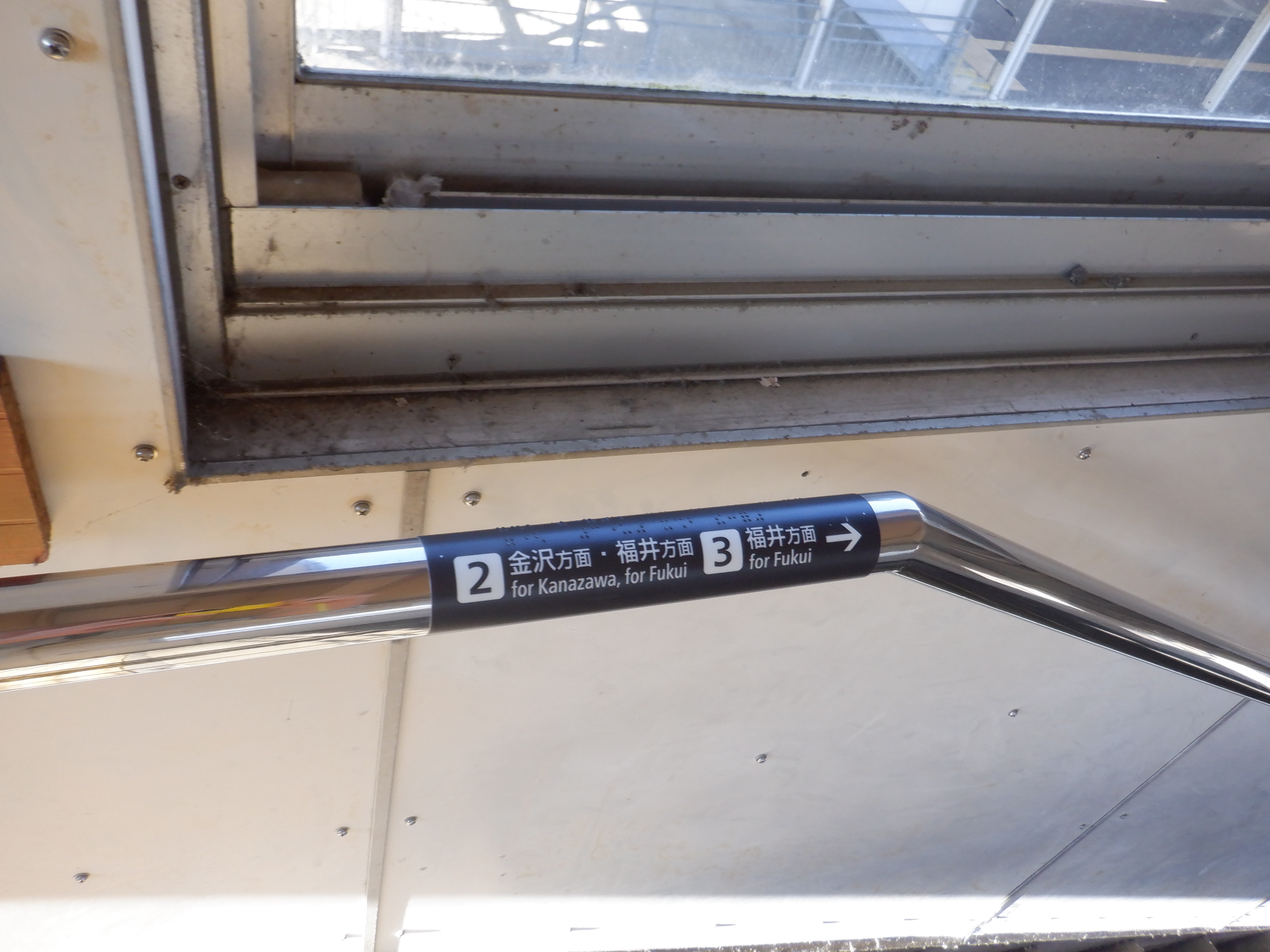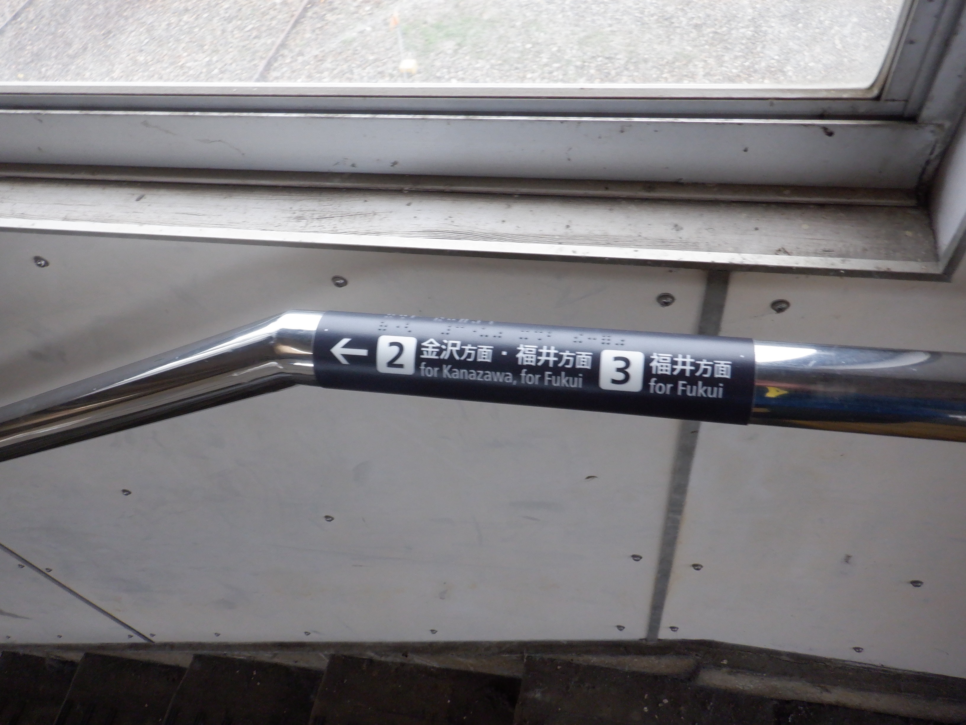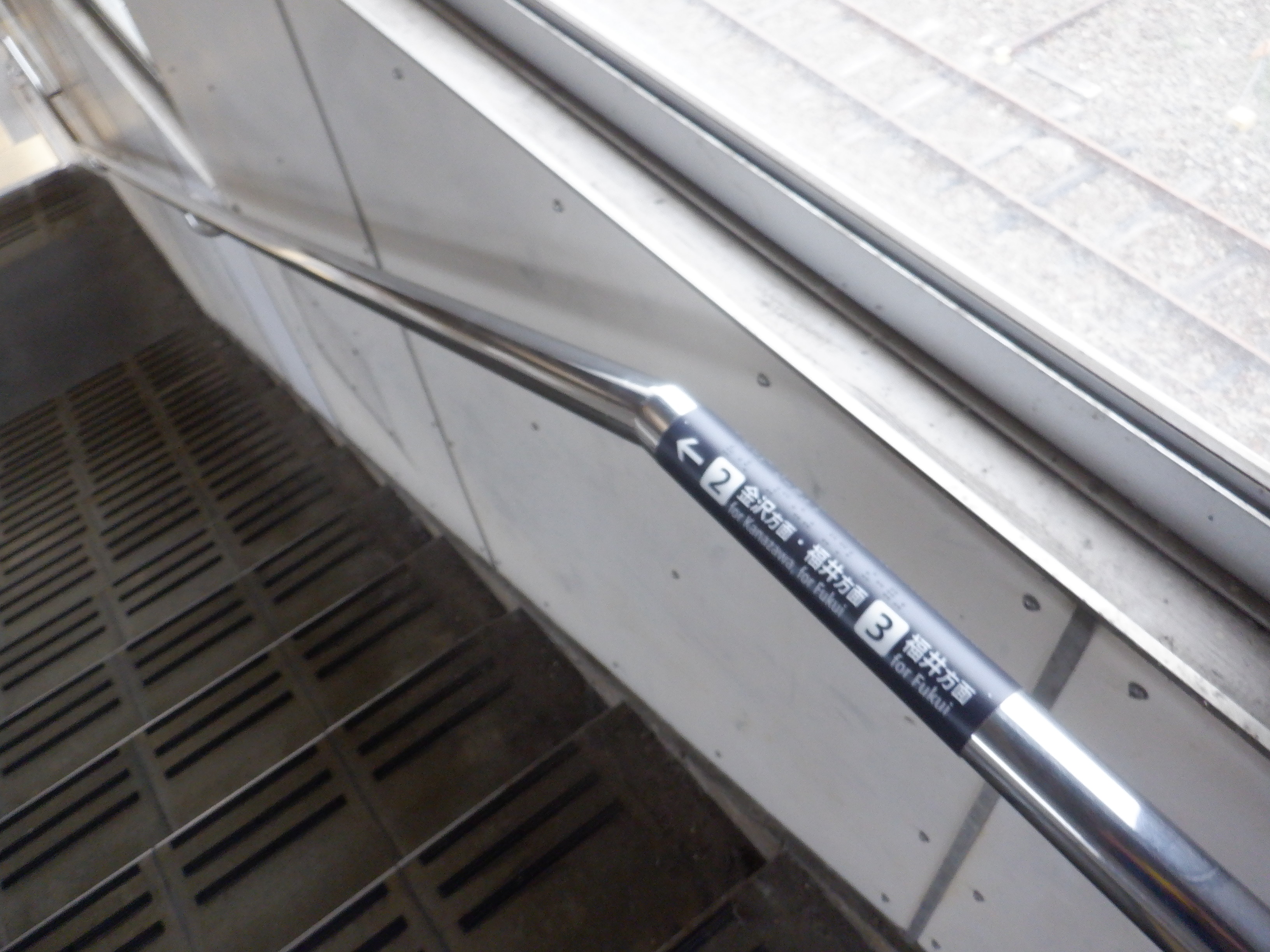 1番のりば階段の手すりの案内。