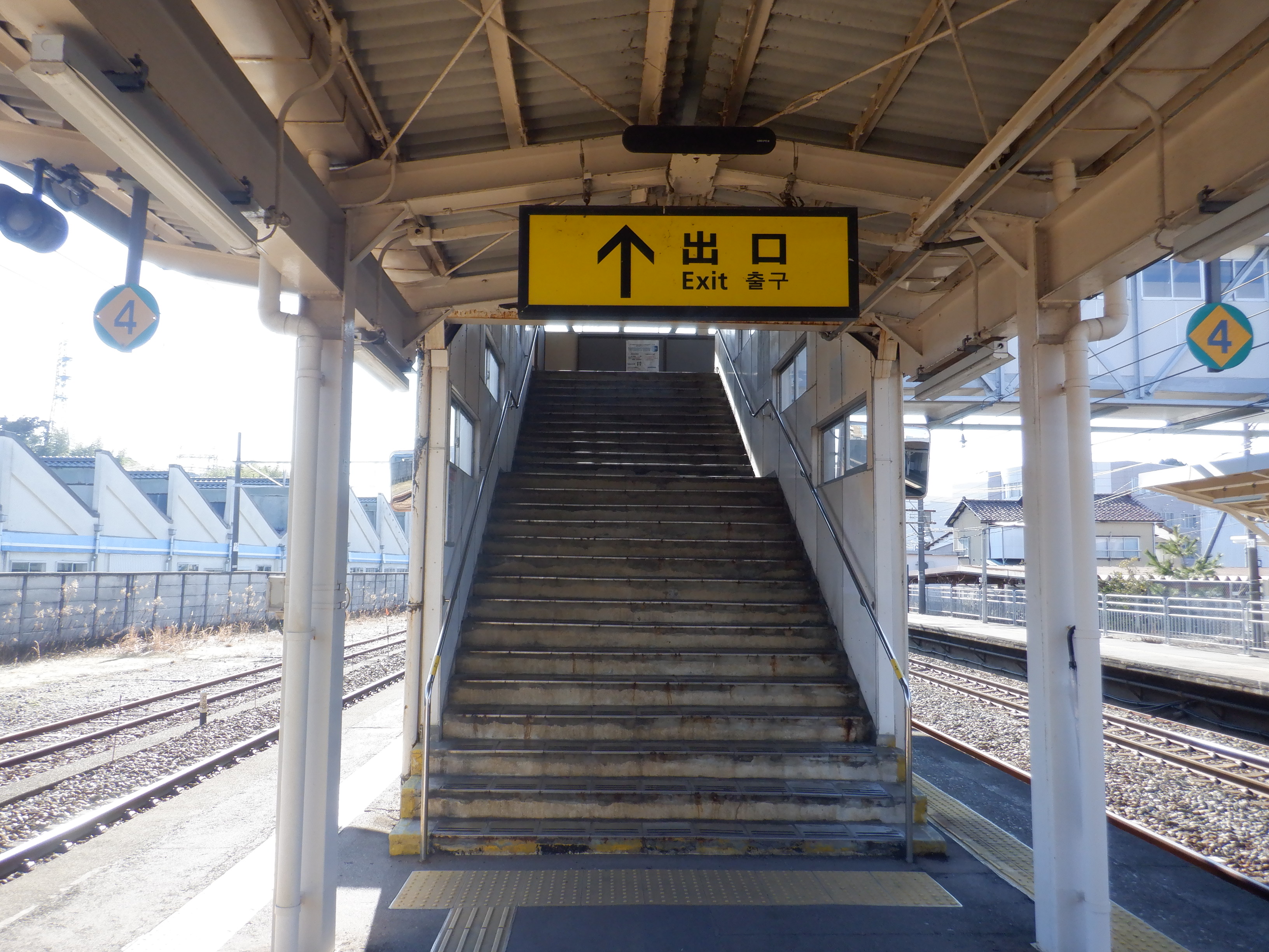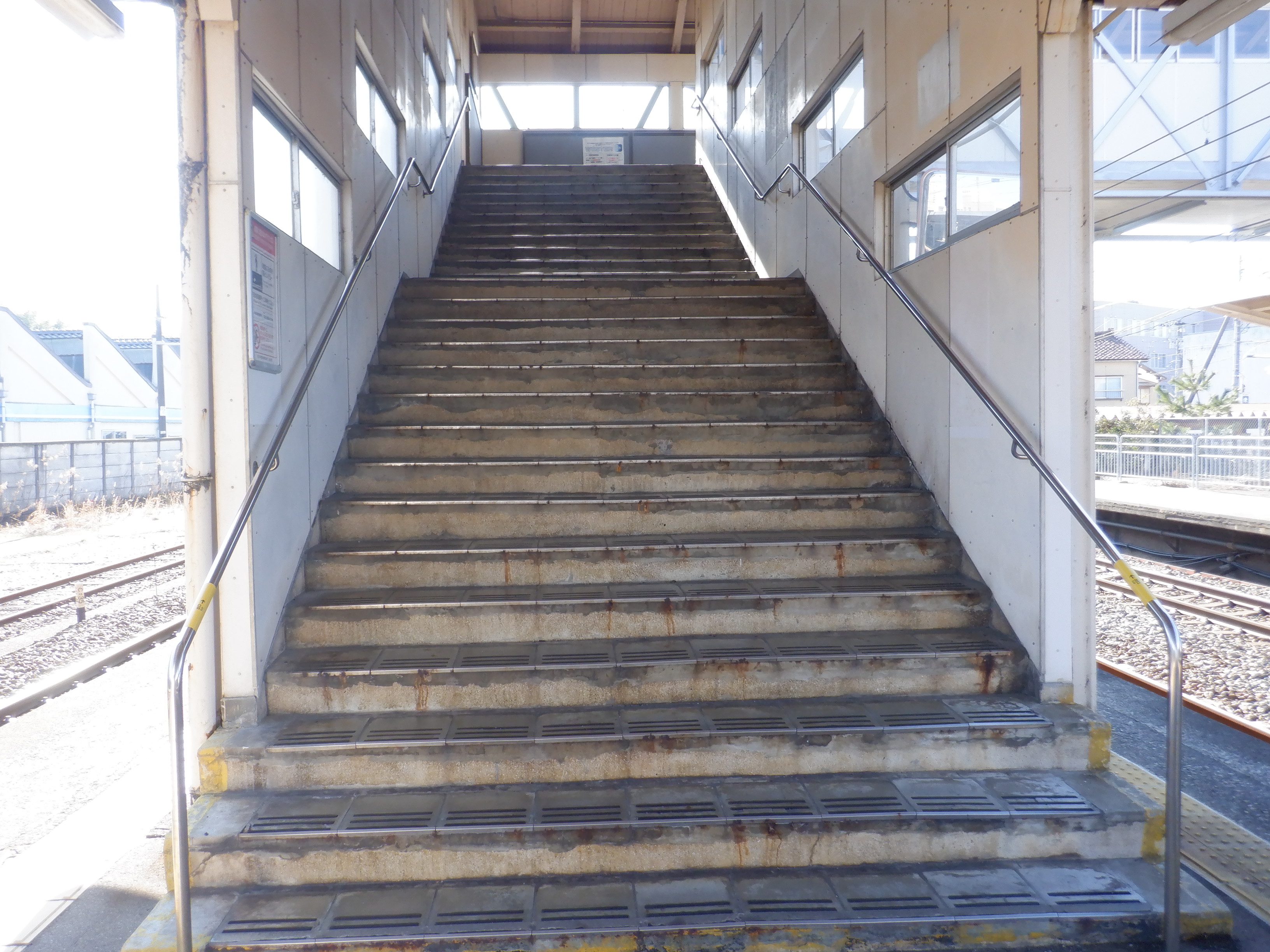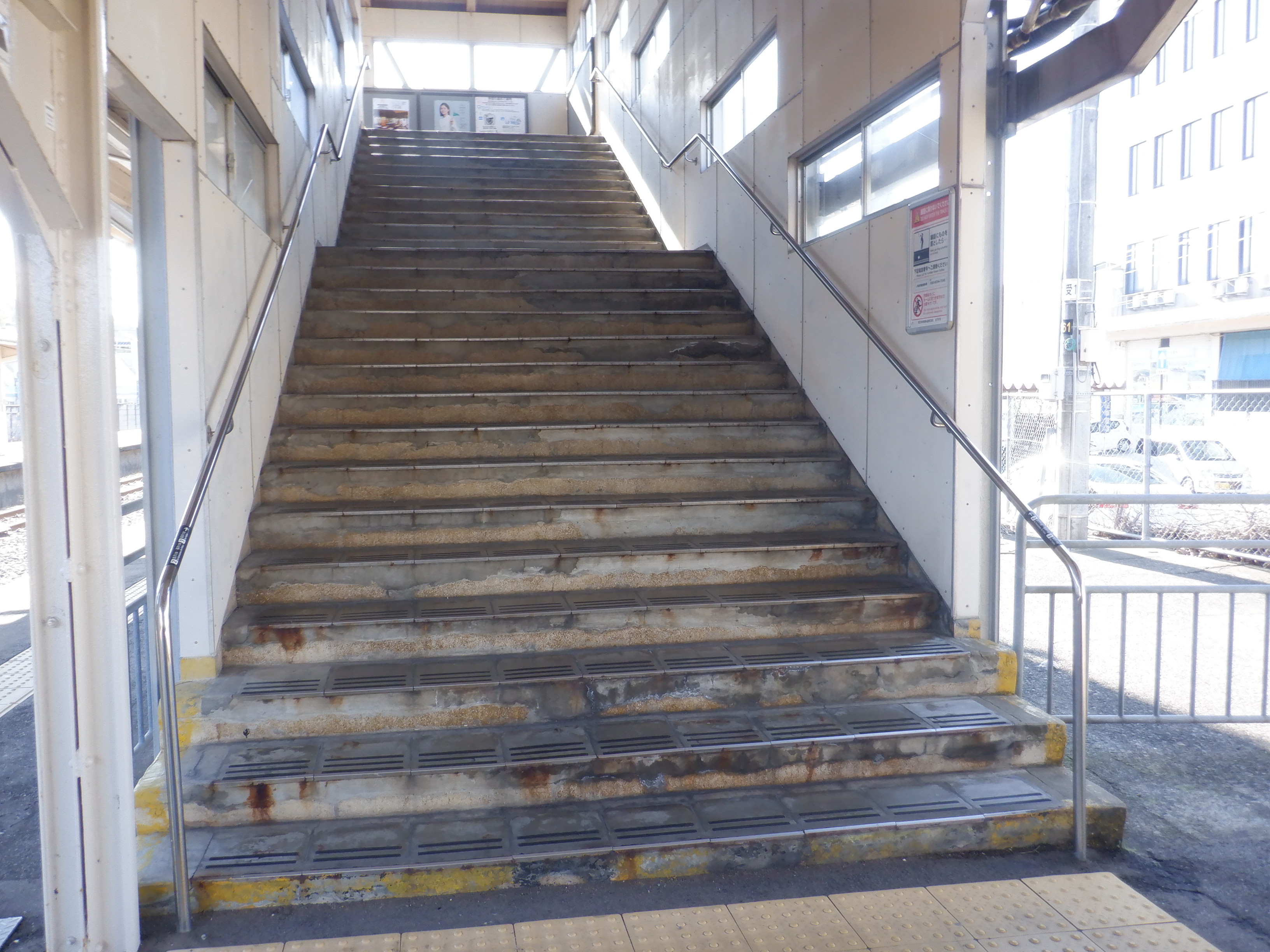 2・3番のりば側の跨線橋階段とそこから見た様子。